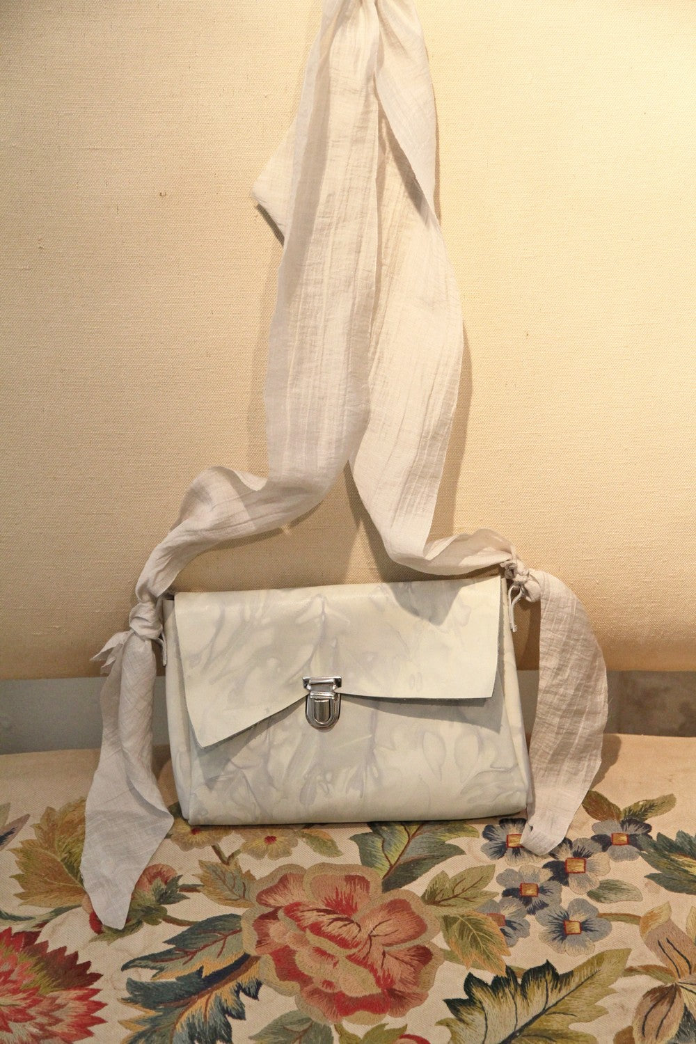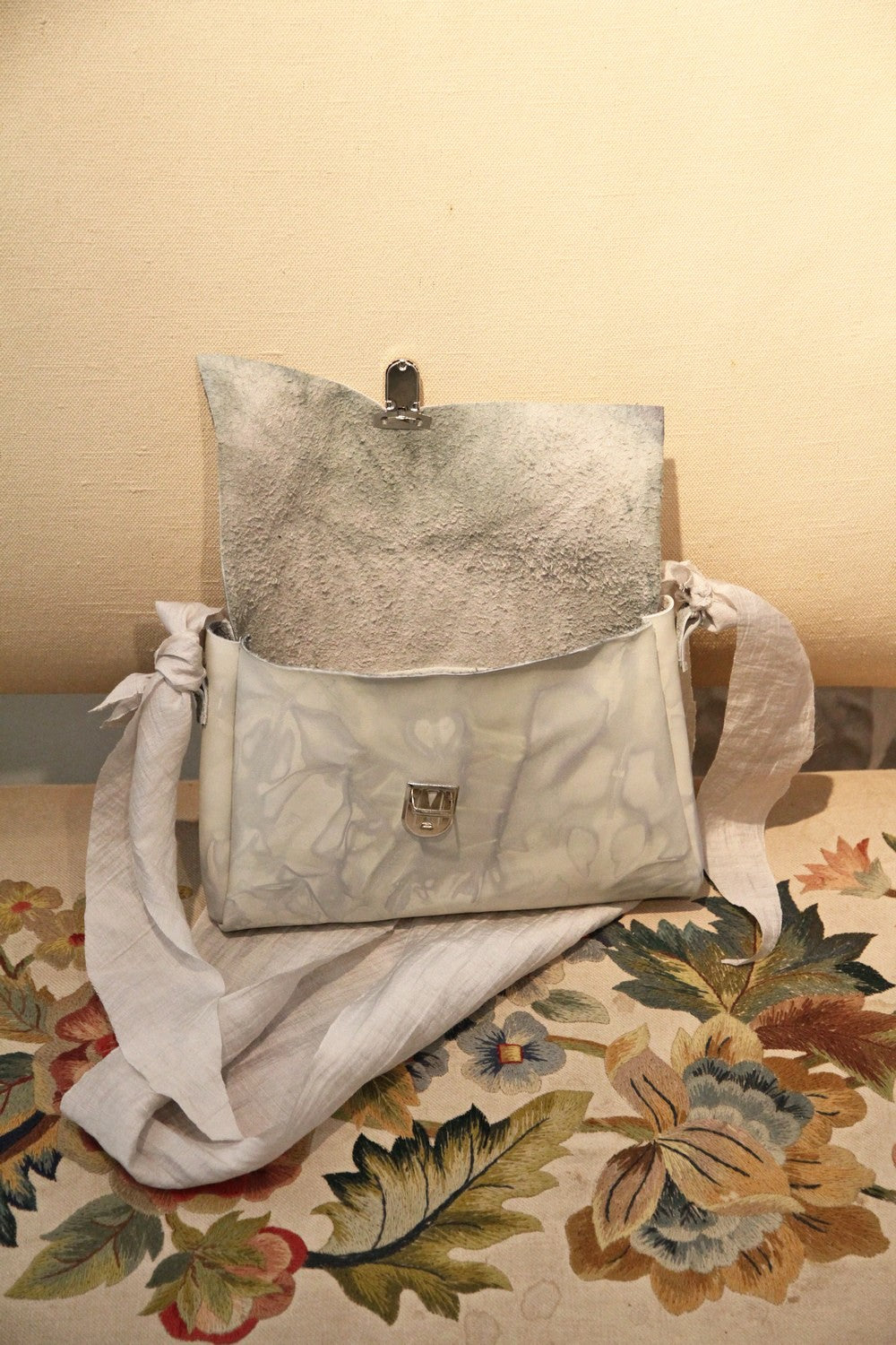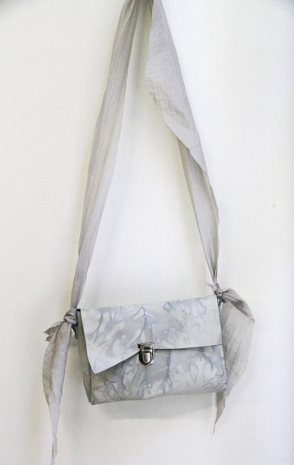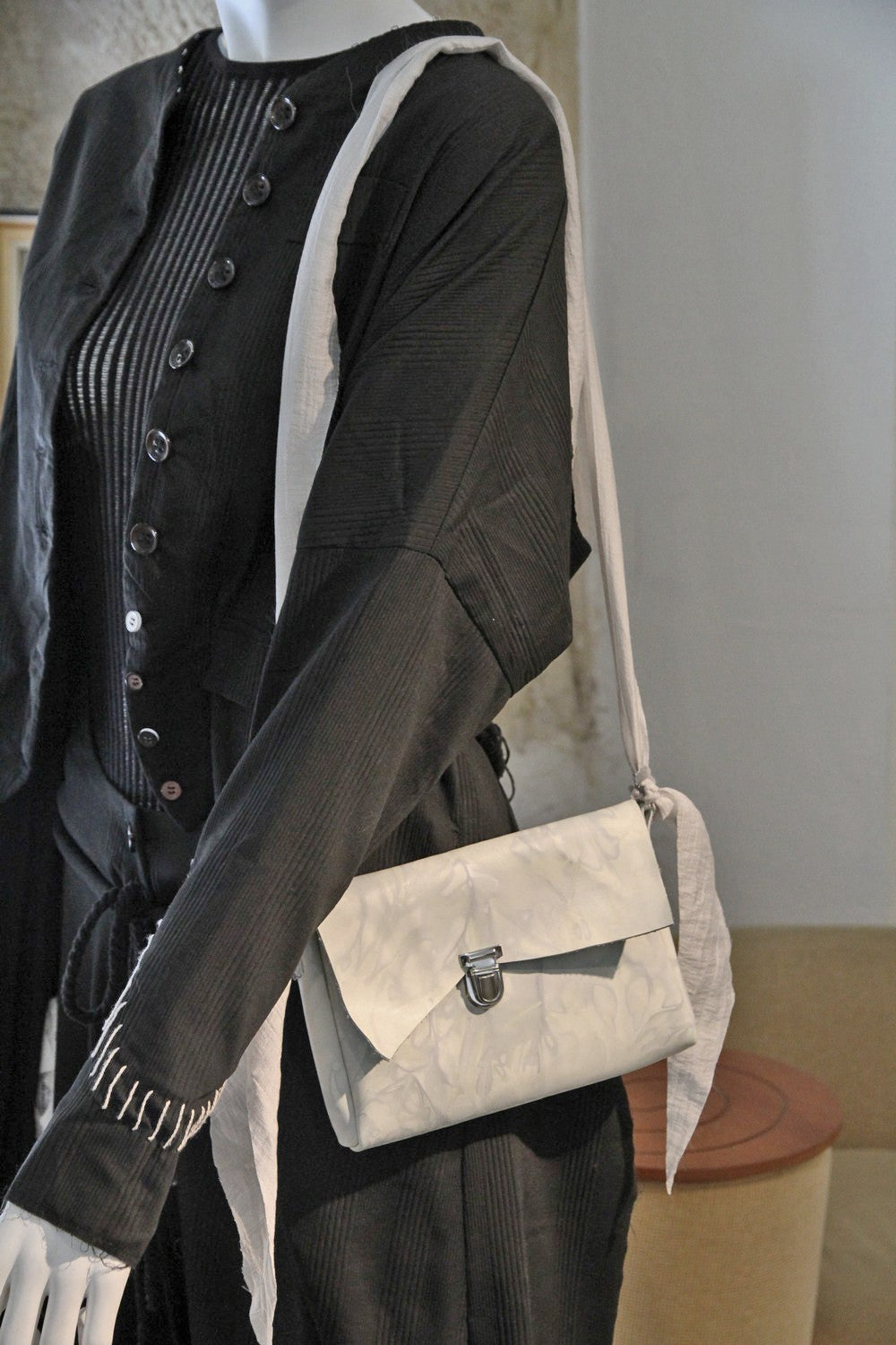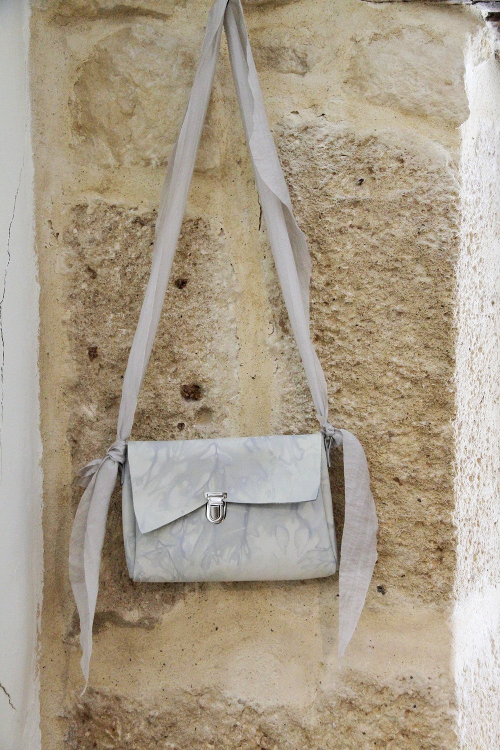 Bolso de piel sintética teñida de forma natural (vegana), con cierre metálico y cinta de viscosa.