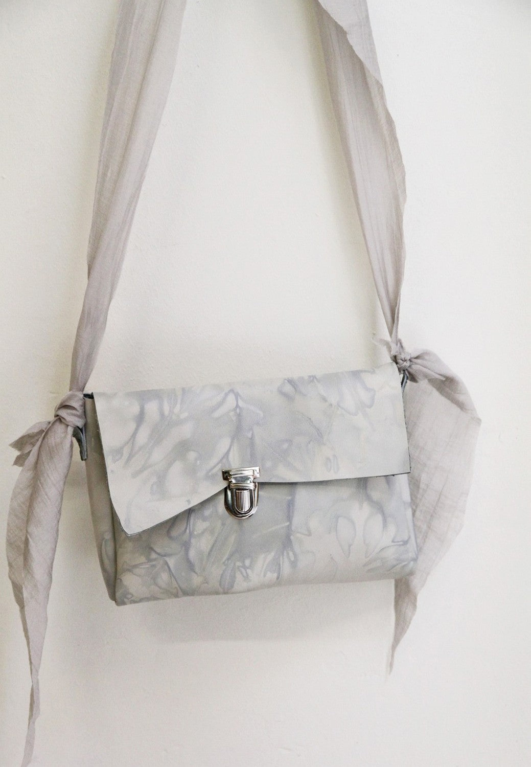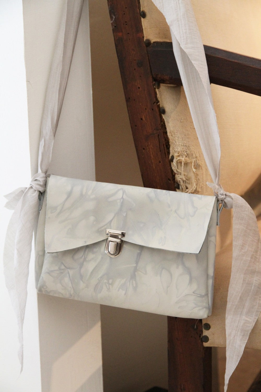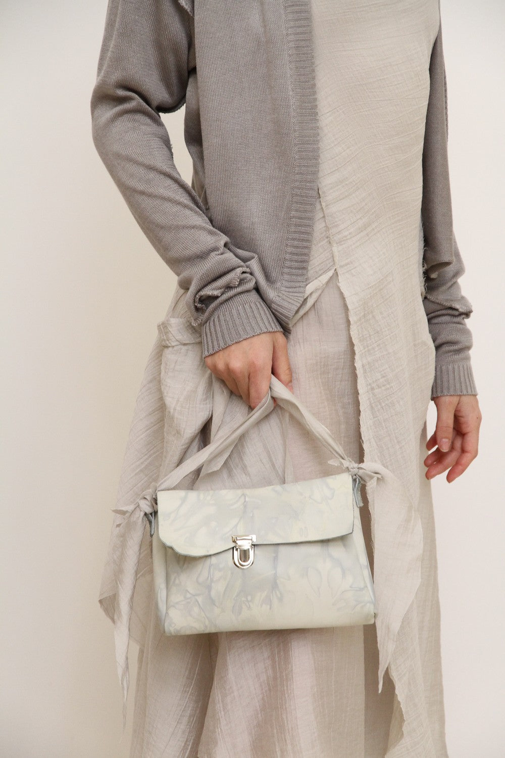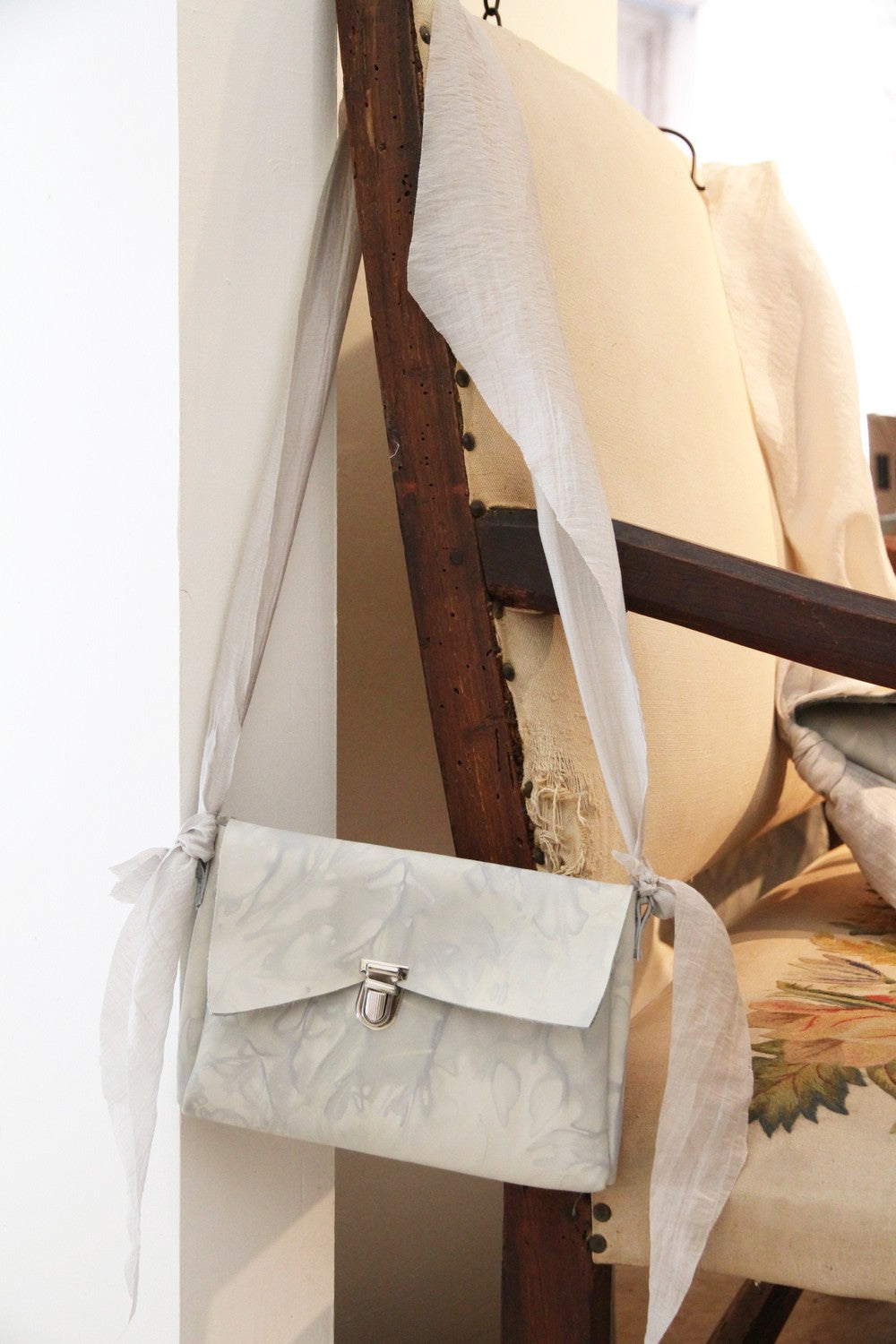 Bolso de piel sintética teñida de forma natural (vegana), con cierre metálico y cinta de viscosa.