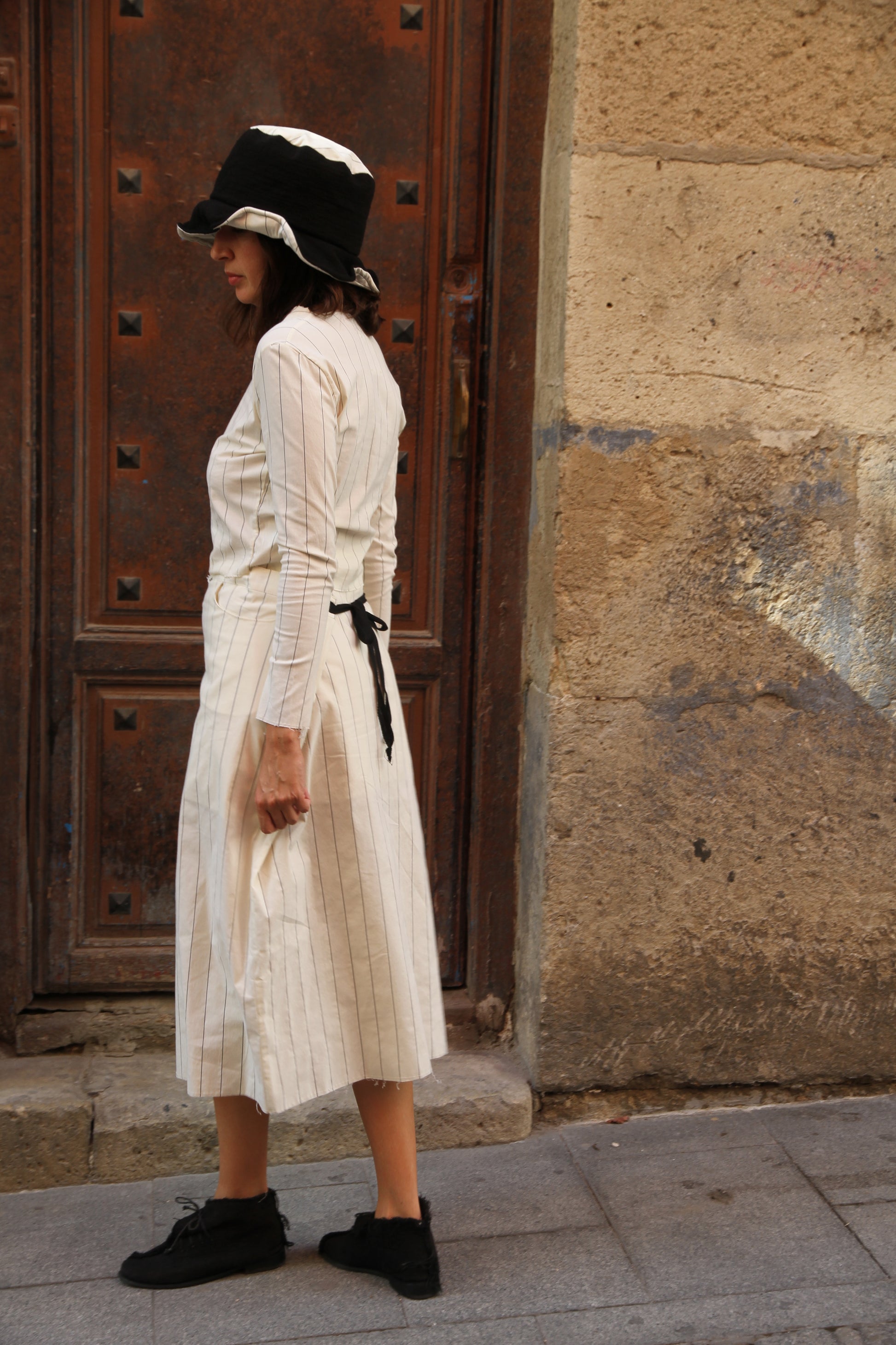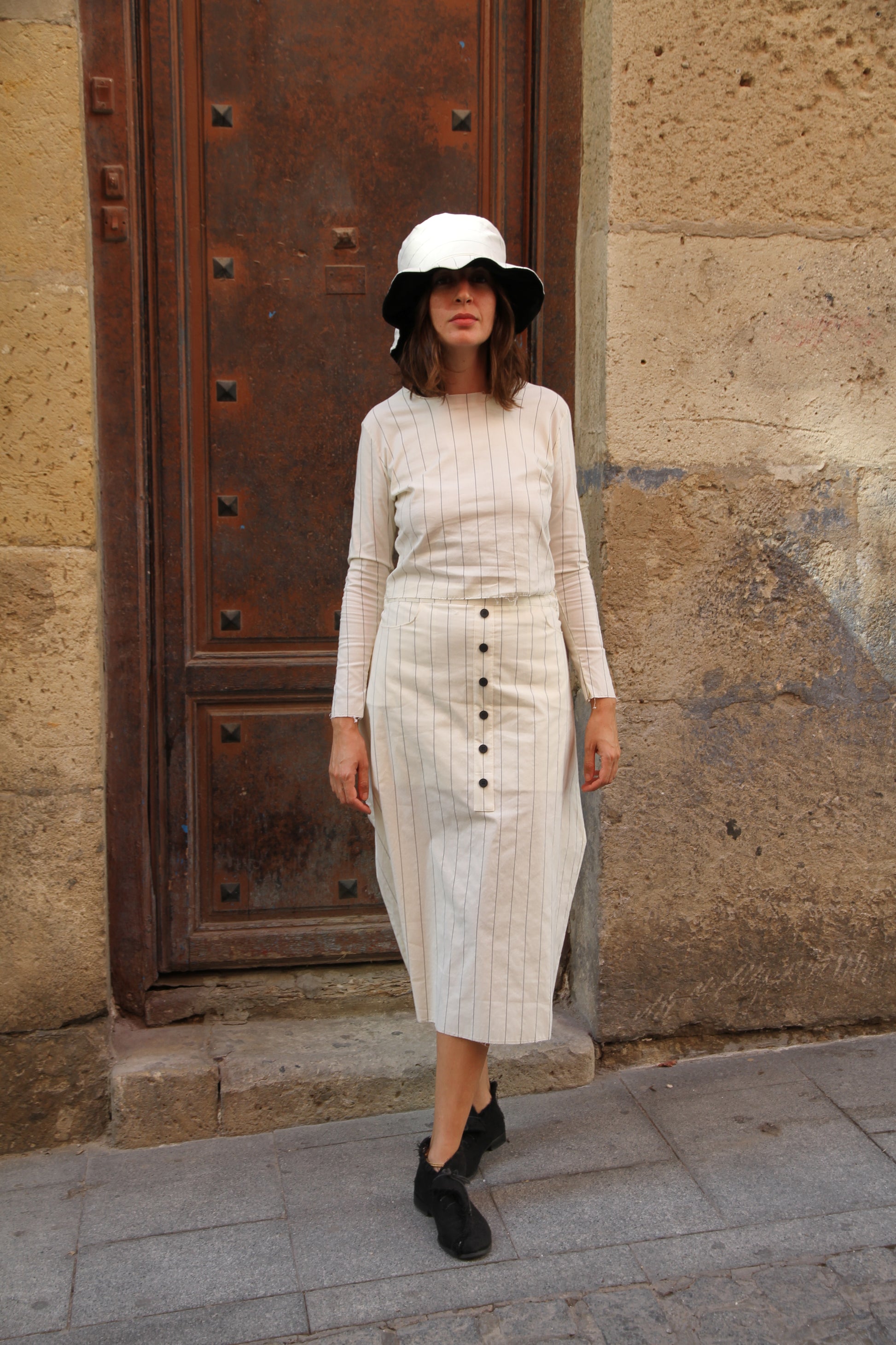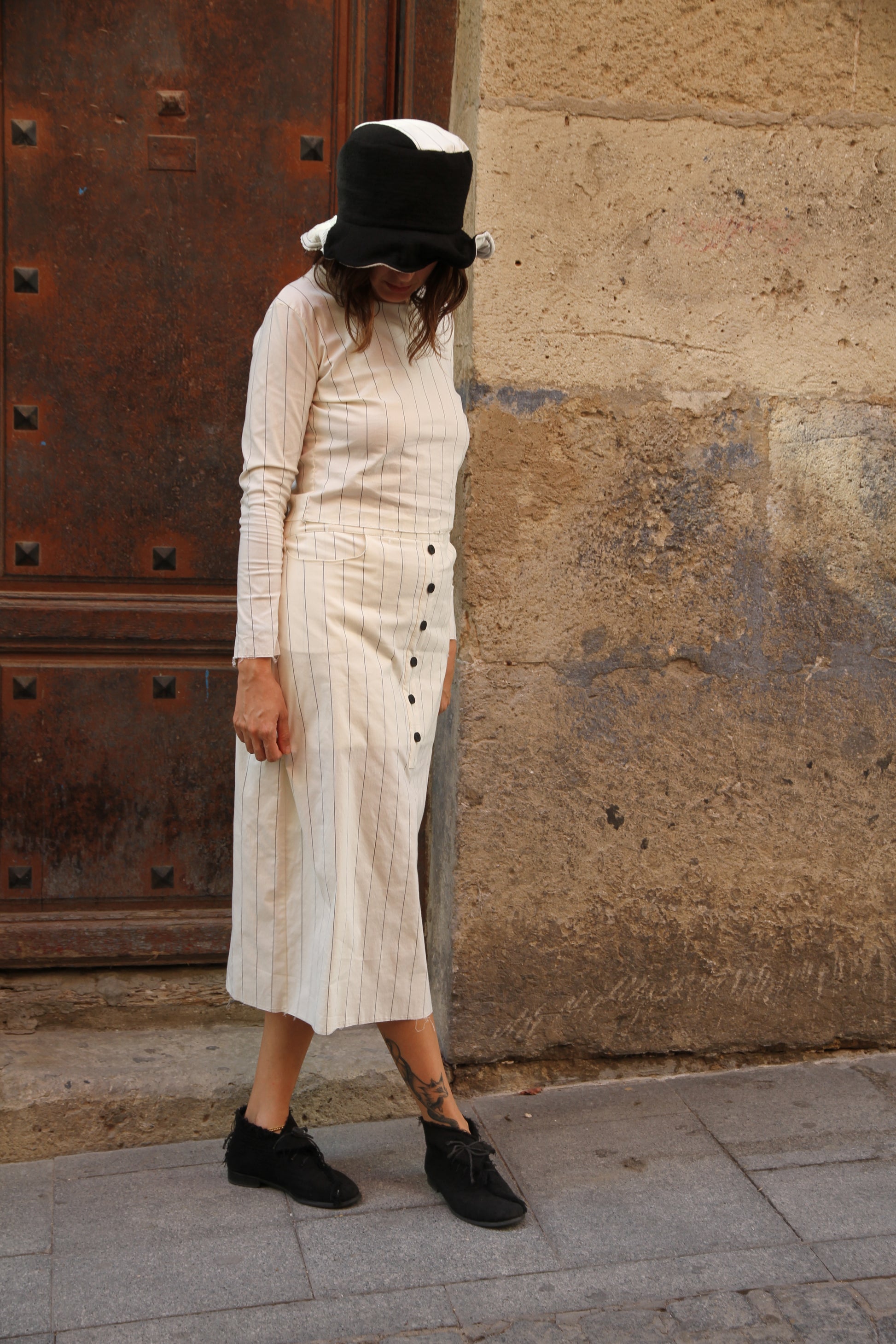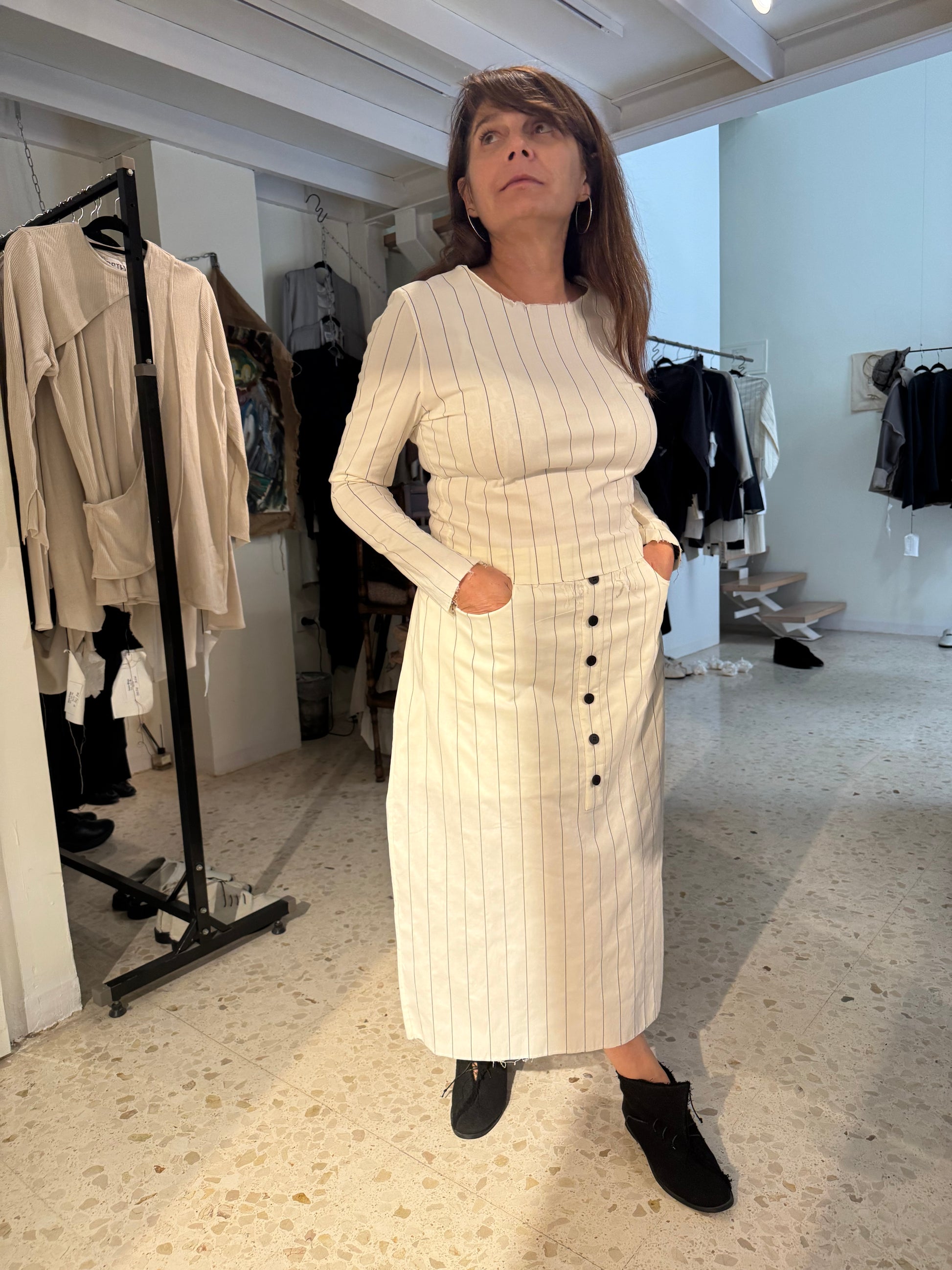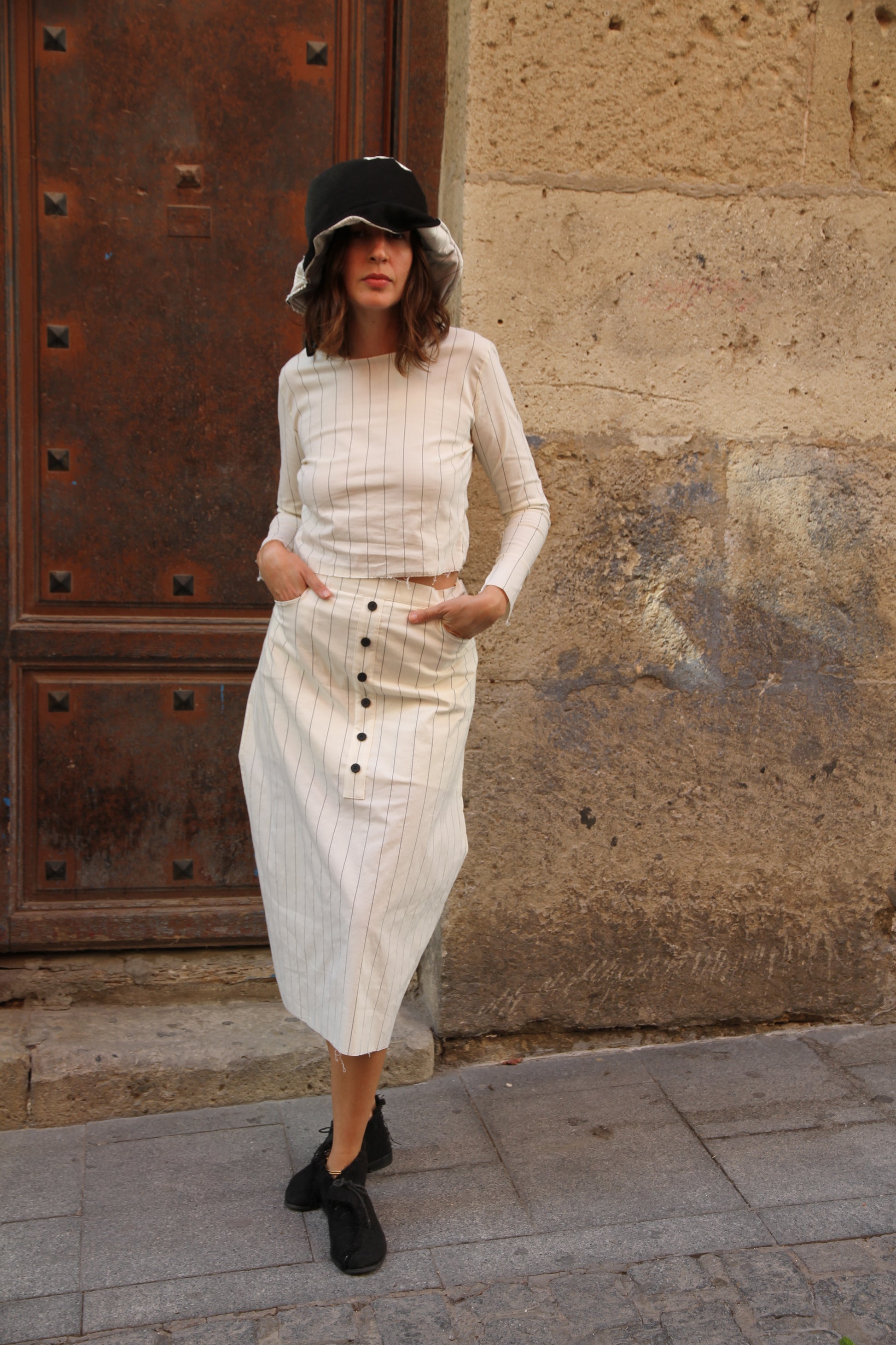 Top y falda midi con dos bolsillos. La falda es oversize y se ajusta con botones en la cinturilla y cintas en la espalda. El top es de punto y muy elástico.