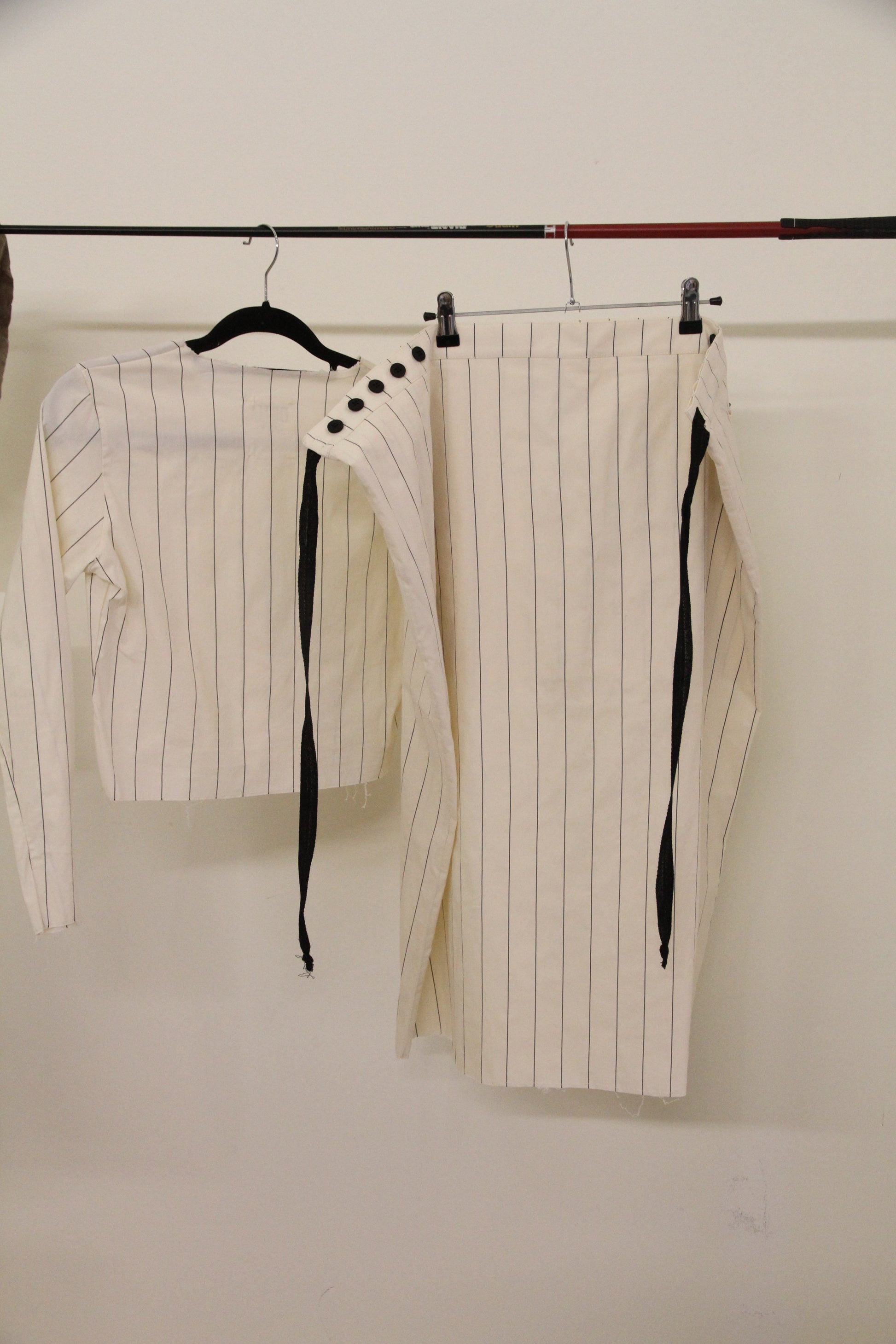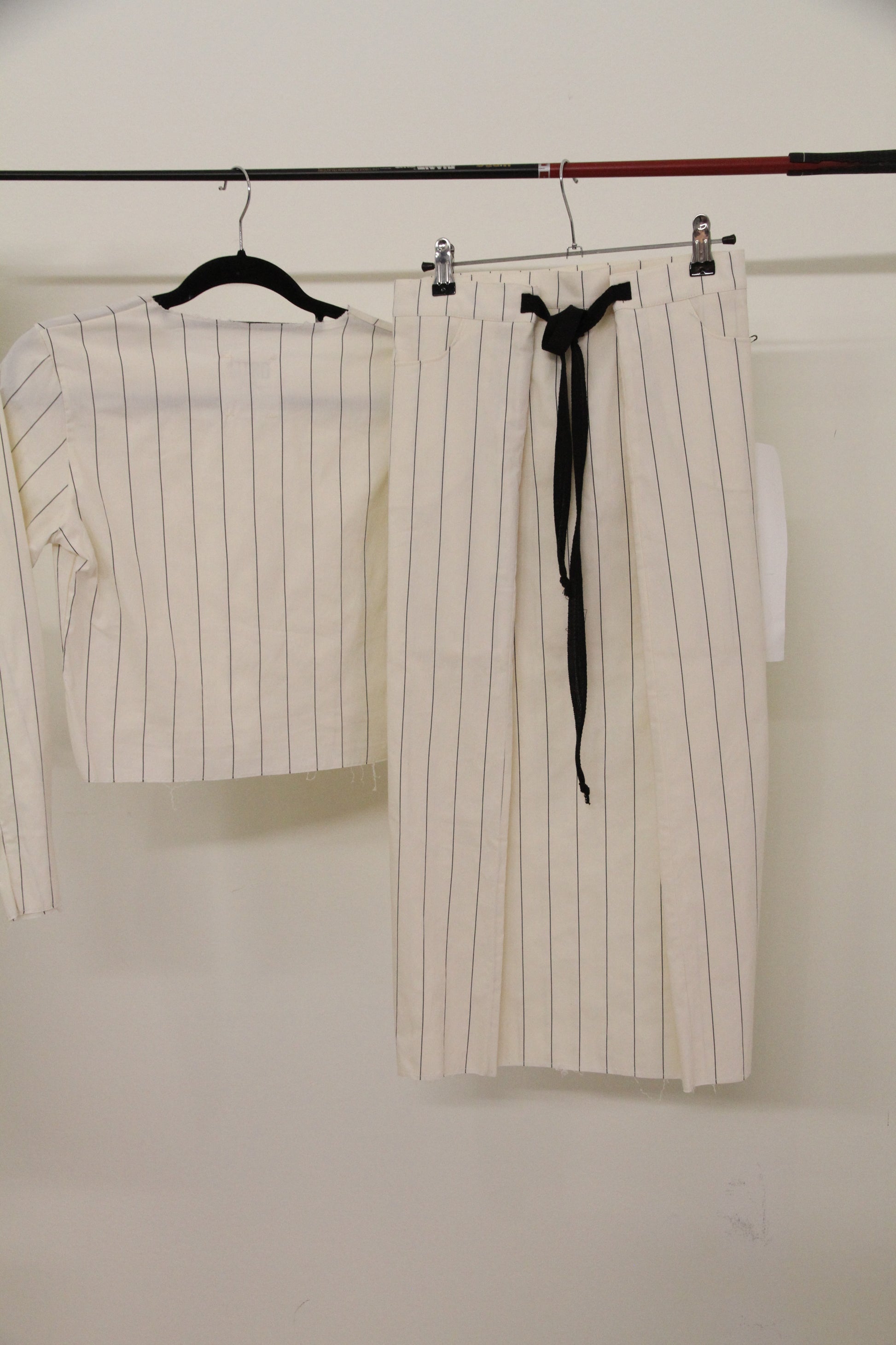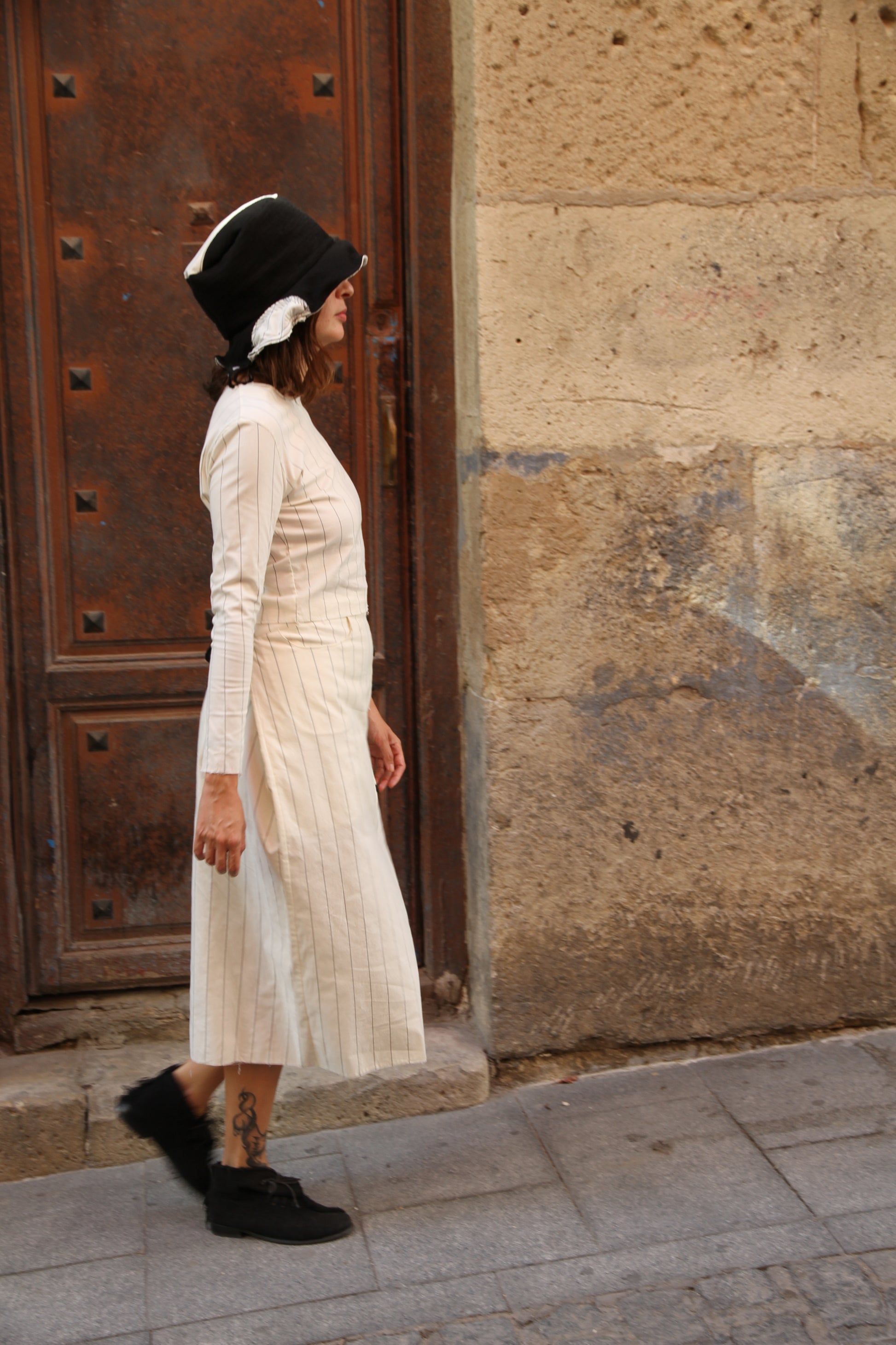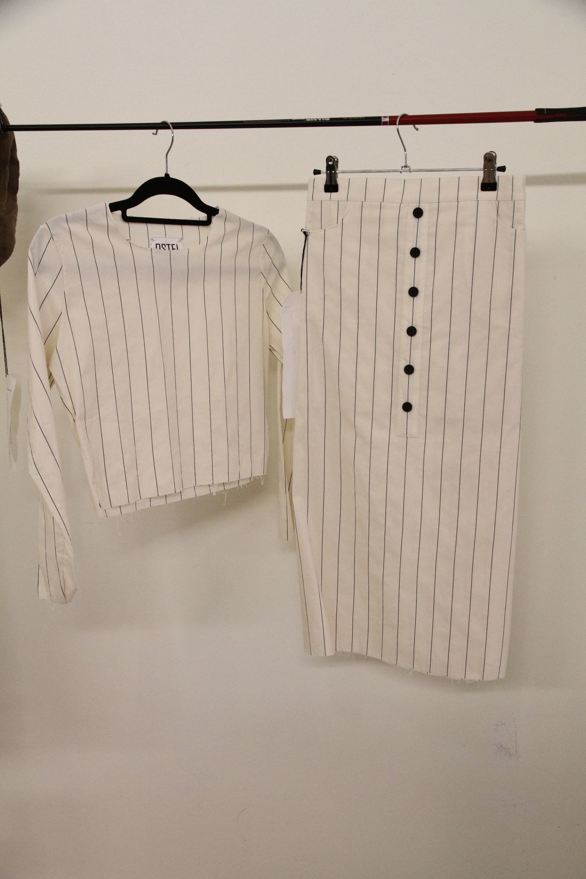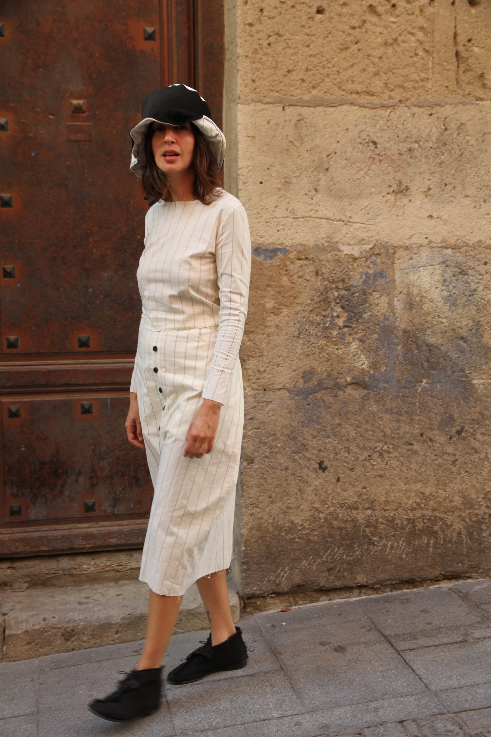 Top y falda midi con dos bolsillos. La falda es oversize y se ajusta con botones en la cinturilla y cintas en la espalda. El top es de punto y muy elástico.