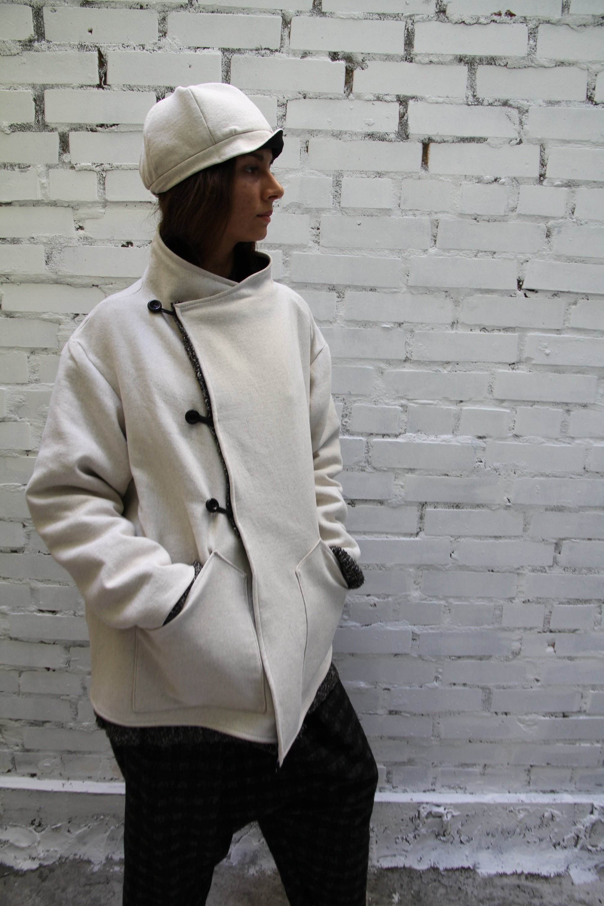Abrigo cruzado reversible con bolsillos grandes. Unisex. Un lado es de lana y el otro, de punto. Abrigo con cuello alto.