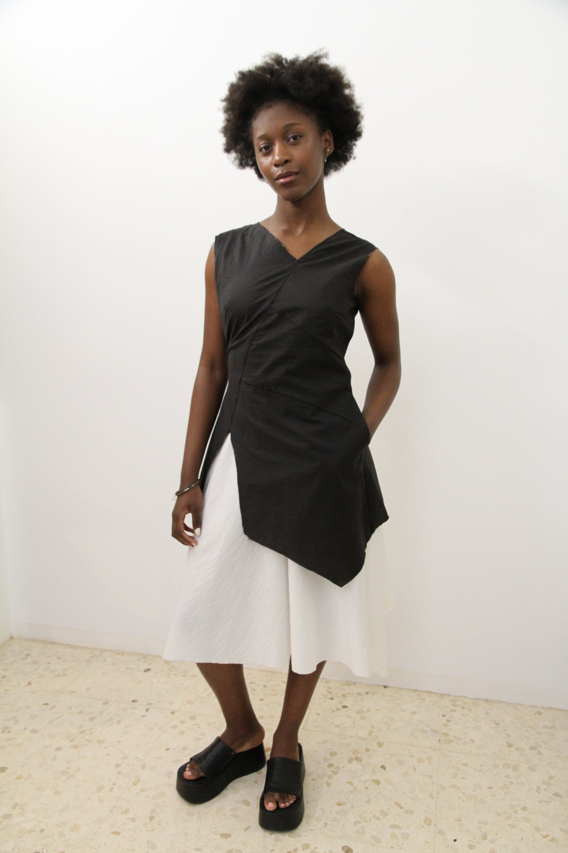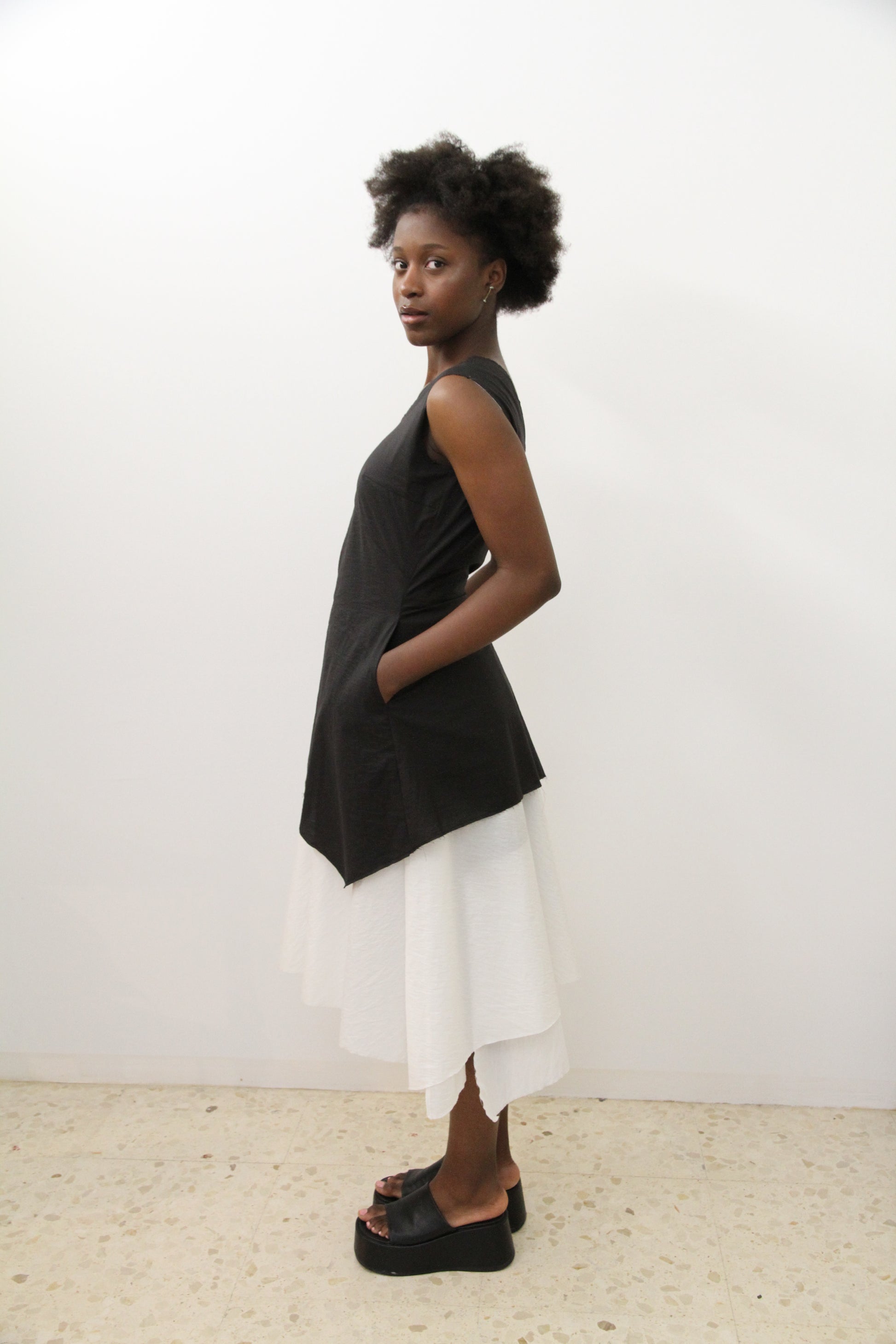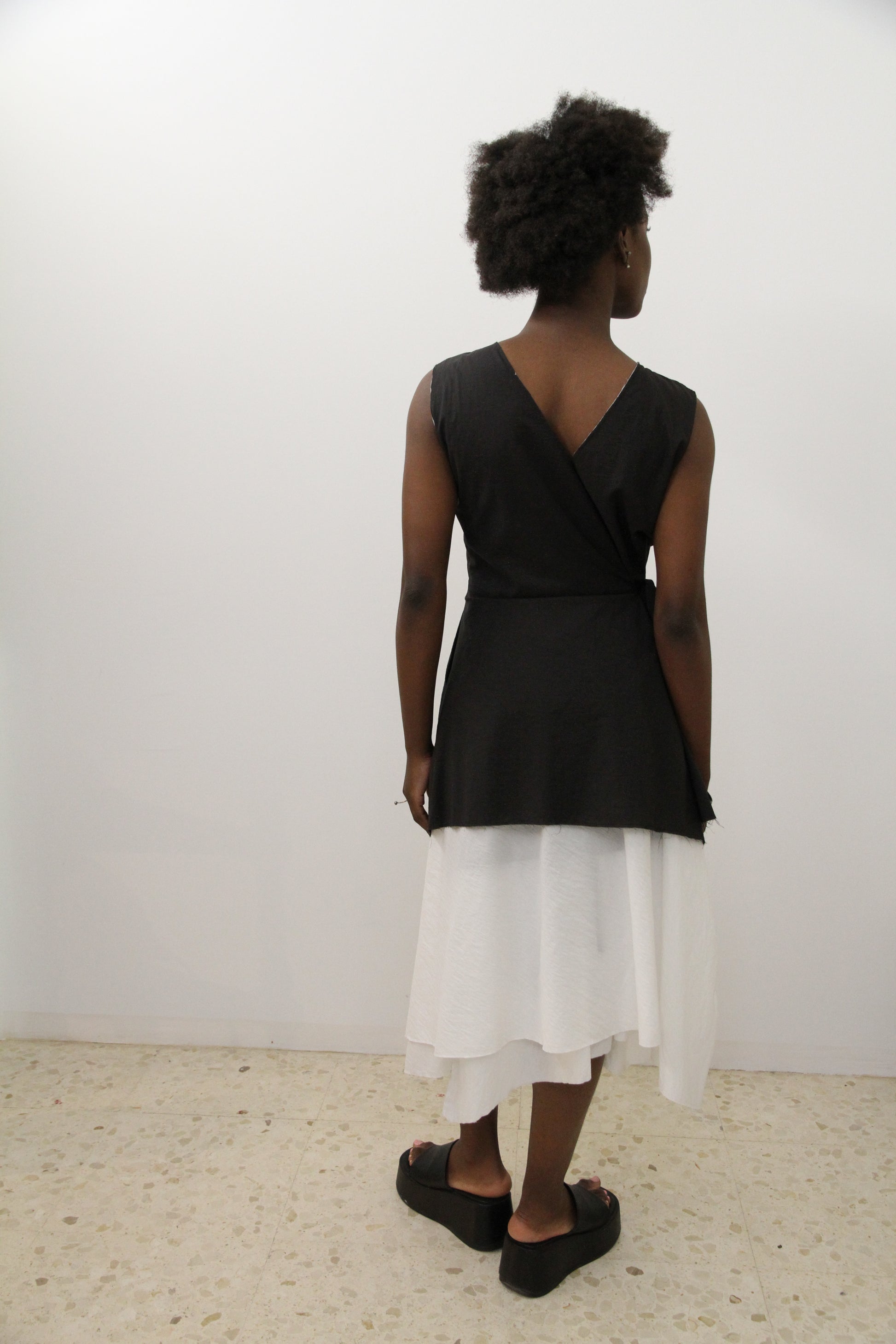 Vestido cruzado deconstructivo confeccionado con dos tejidos. Tiene lazos en la parte trasera para ajustar la cintura. Dos bolsillos laterales. Largo del vestido 115–118 cm. 100% algodón.