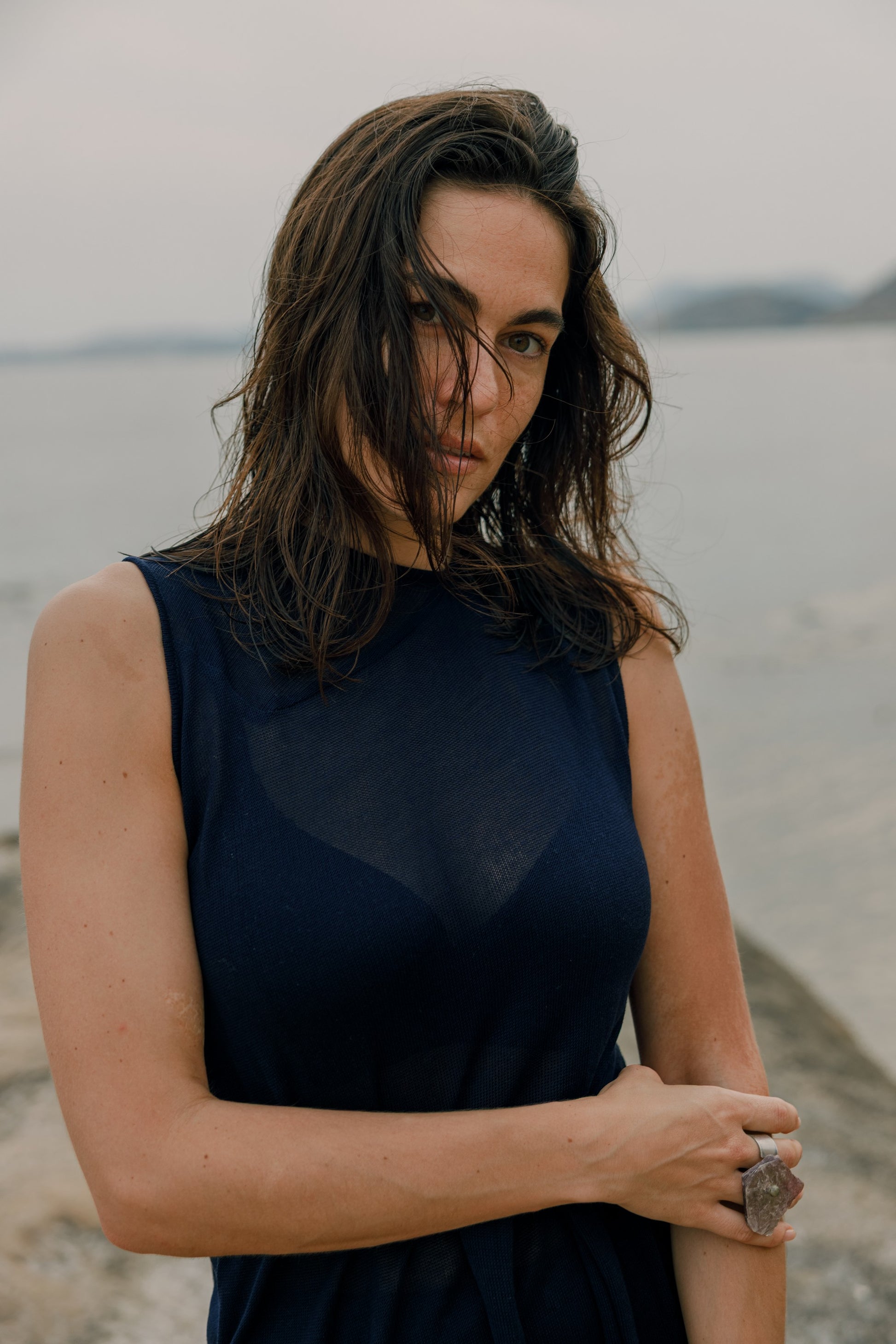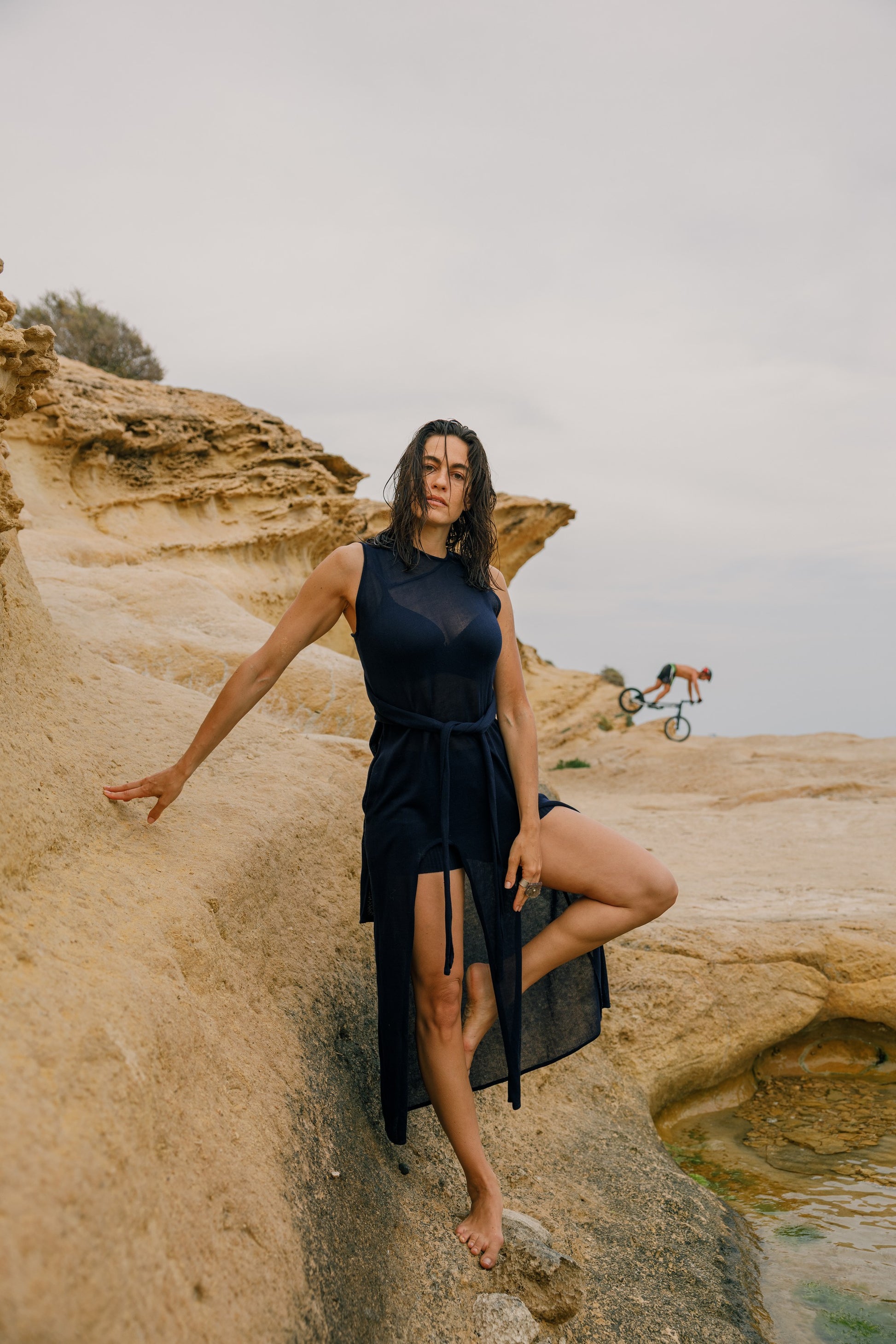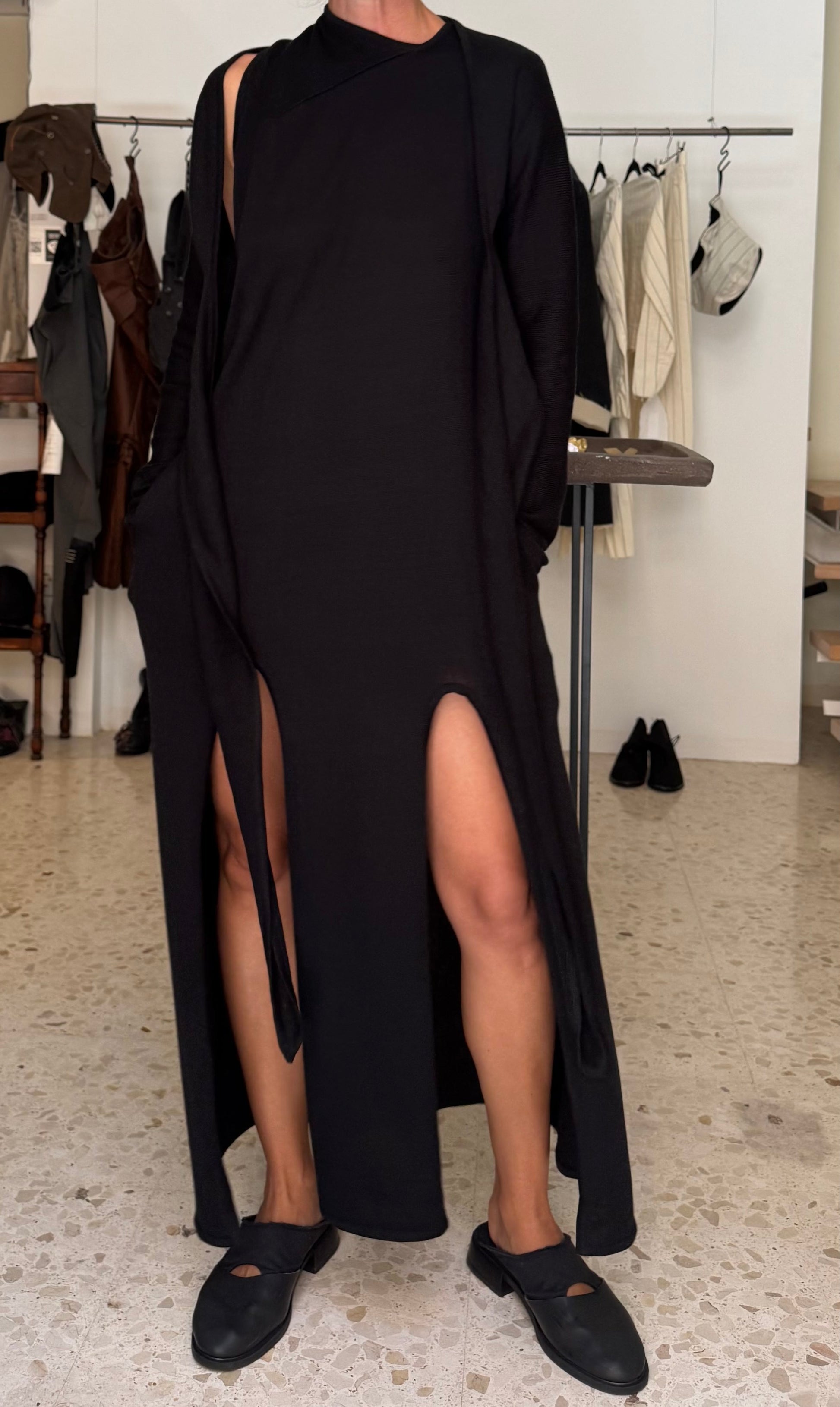 El vestido lleva pantalones cortos de punto y una blusa cosida con mangas. El cárdigan está unido a la espalda; se puede quitar por los hombros, pero está cosido al vestido.