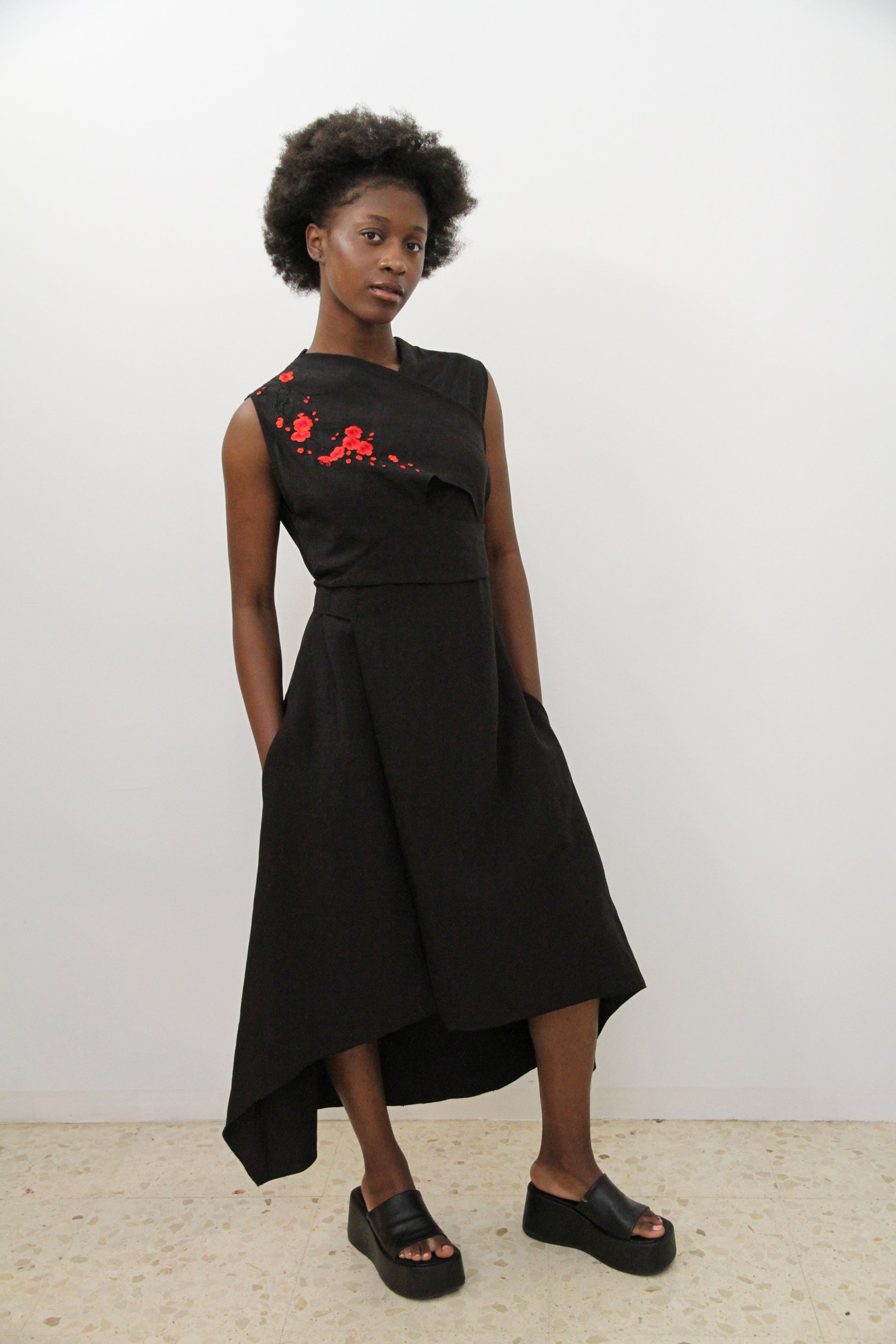 Vestido cruzado, largo midi, con dos bolsillos. Talla única, los lazos en la cintura permiten ajustar la talla. Medida máxima de pecho 105 cm, cintura 90 cm. 100% lino.