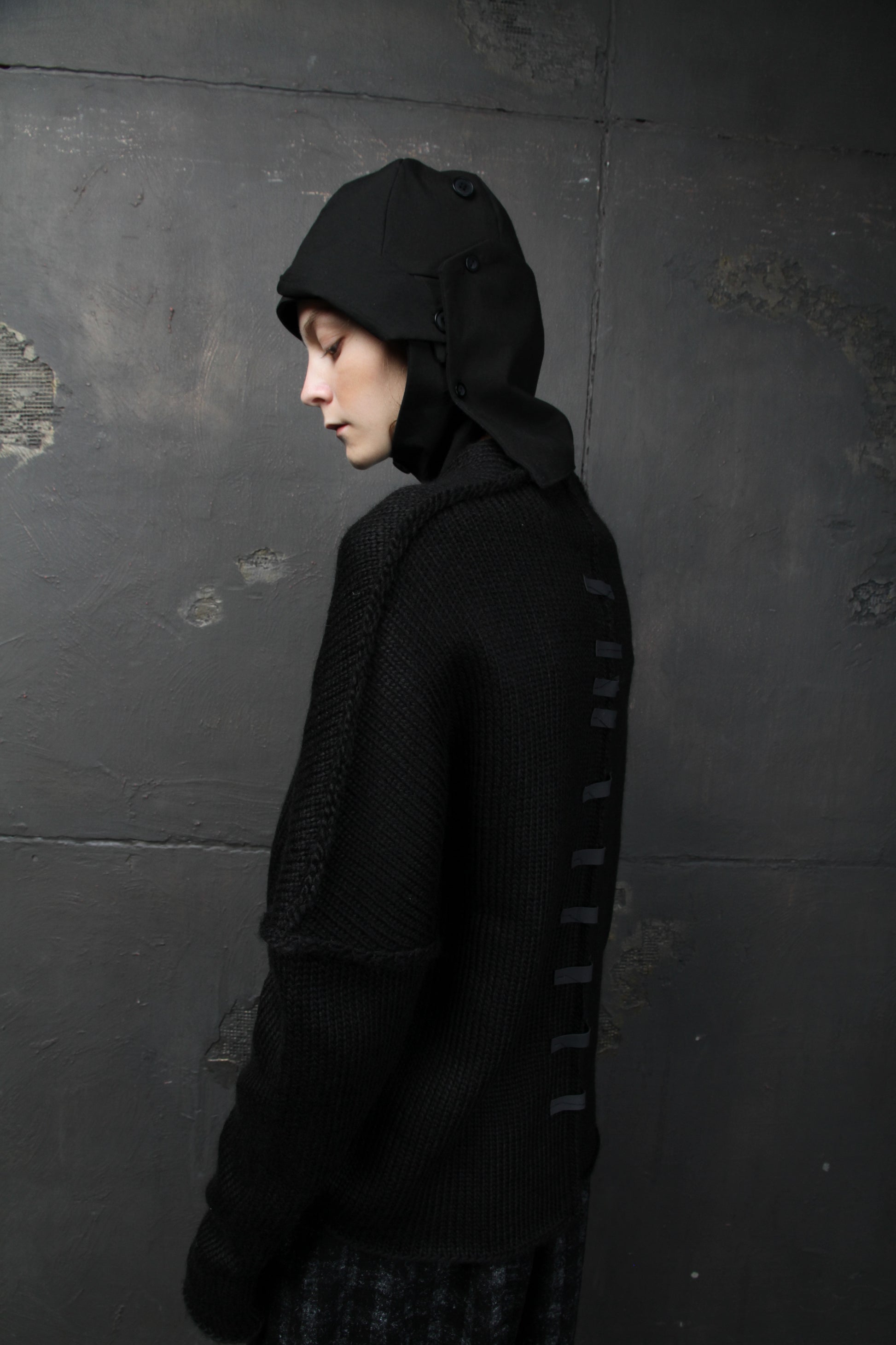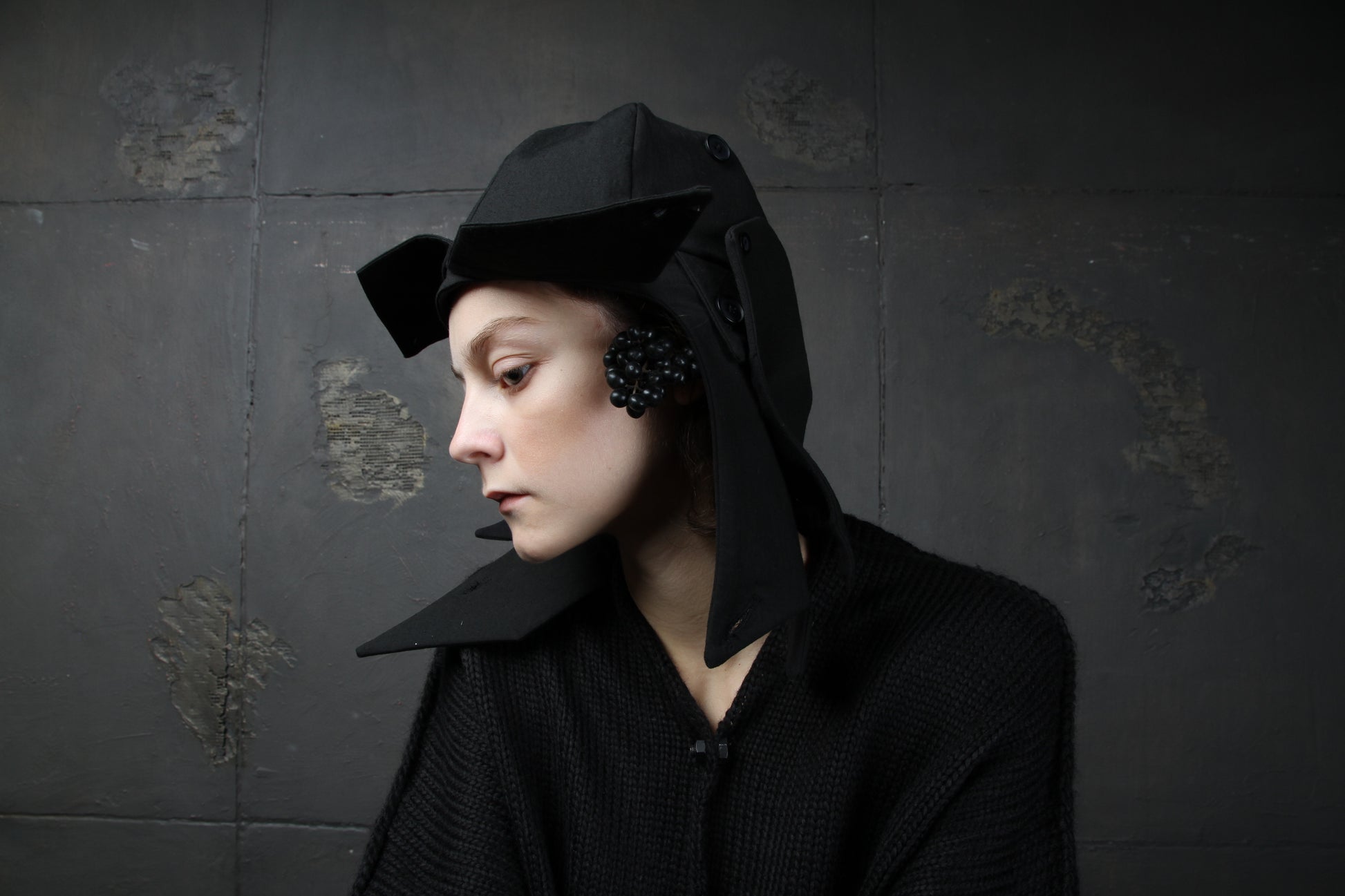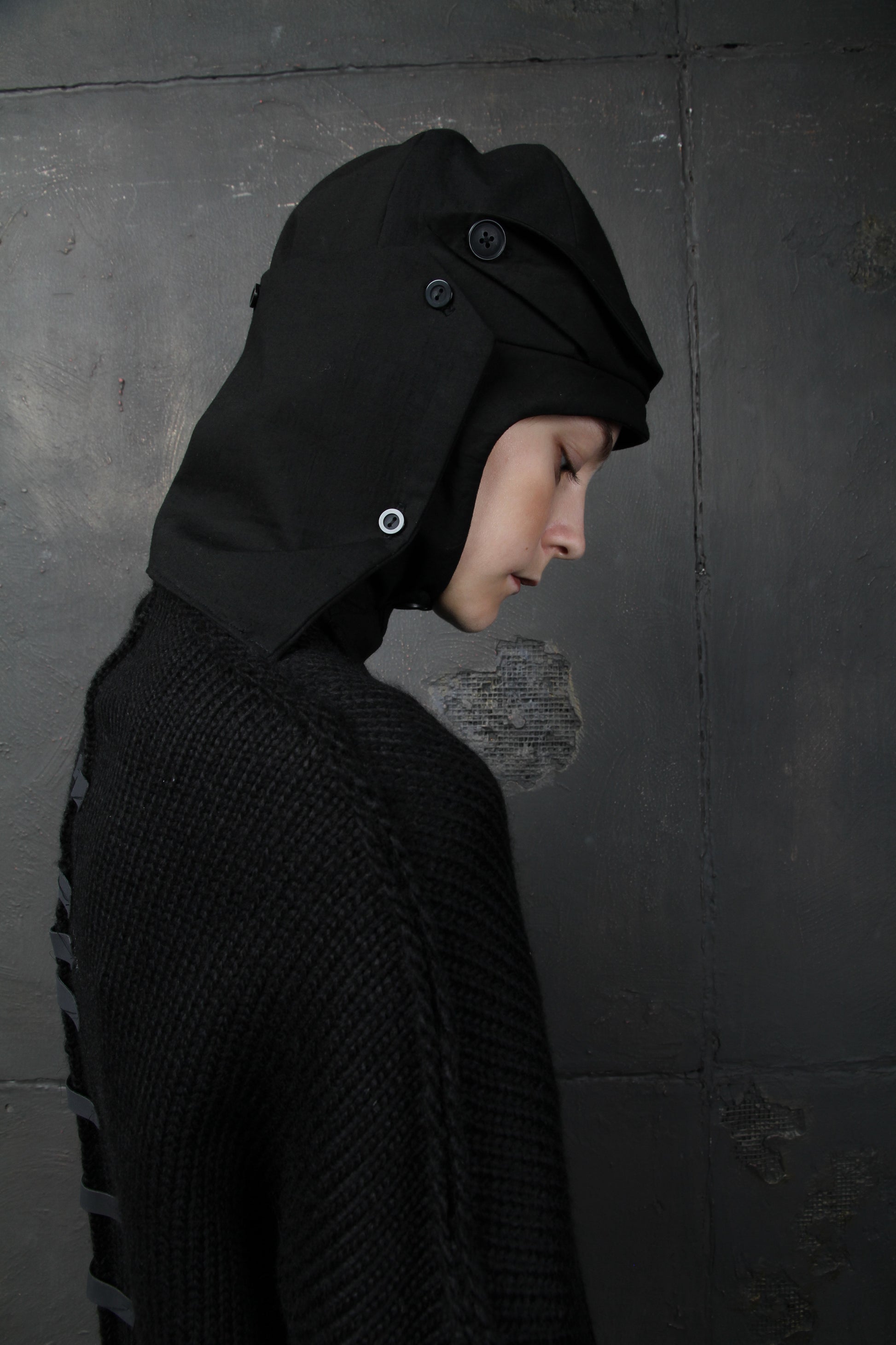 Gorro con capucha asimétrica. El elemento que cubre el cuello se puede desabrochar.