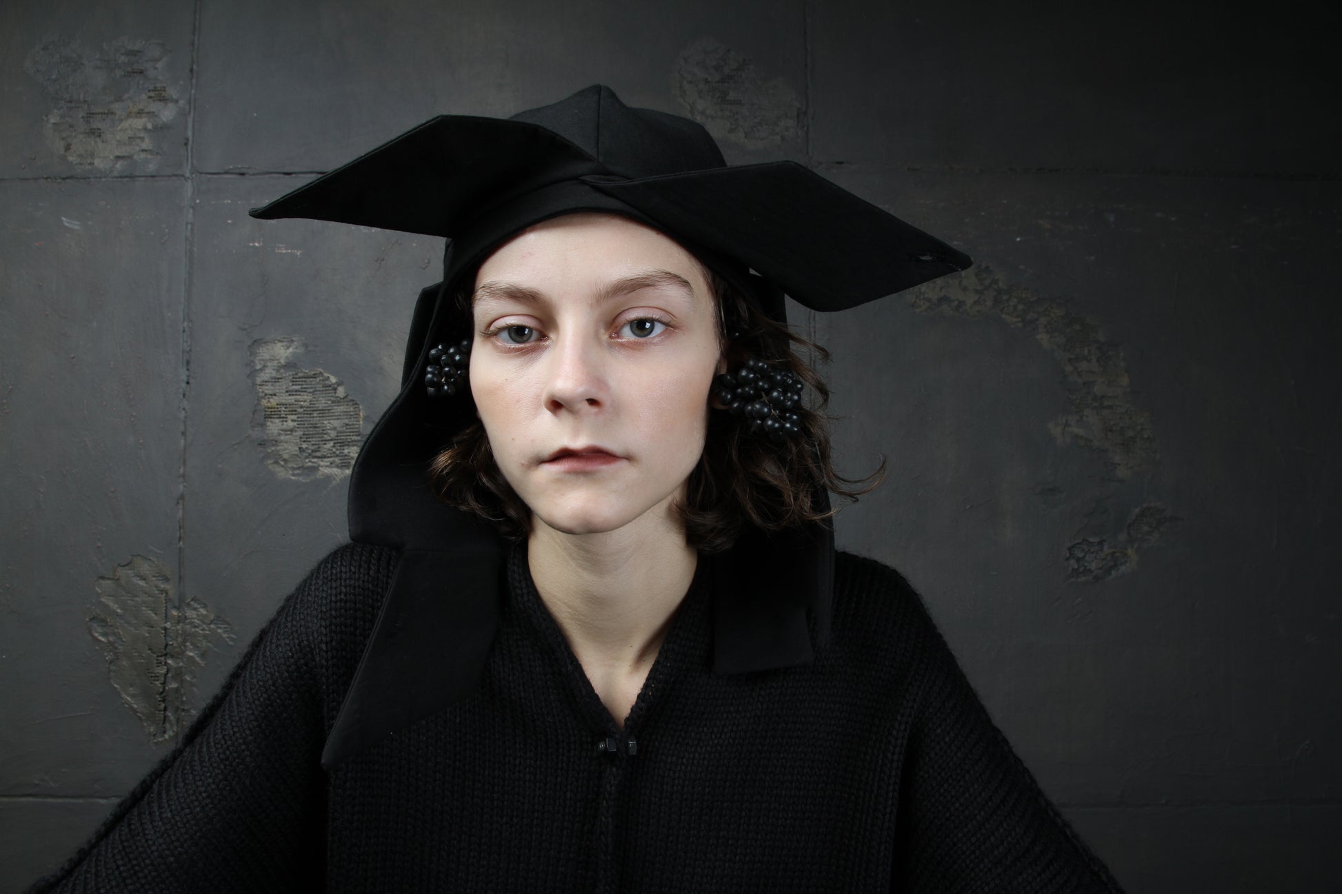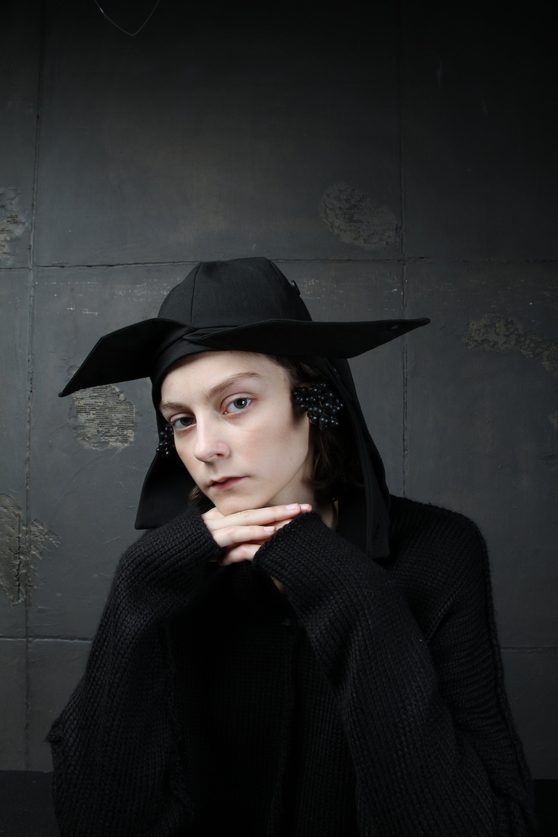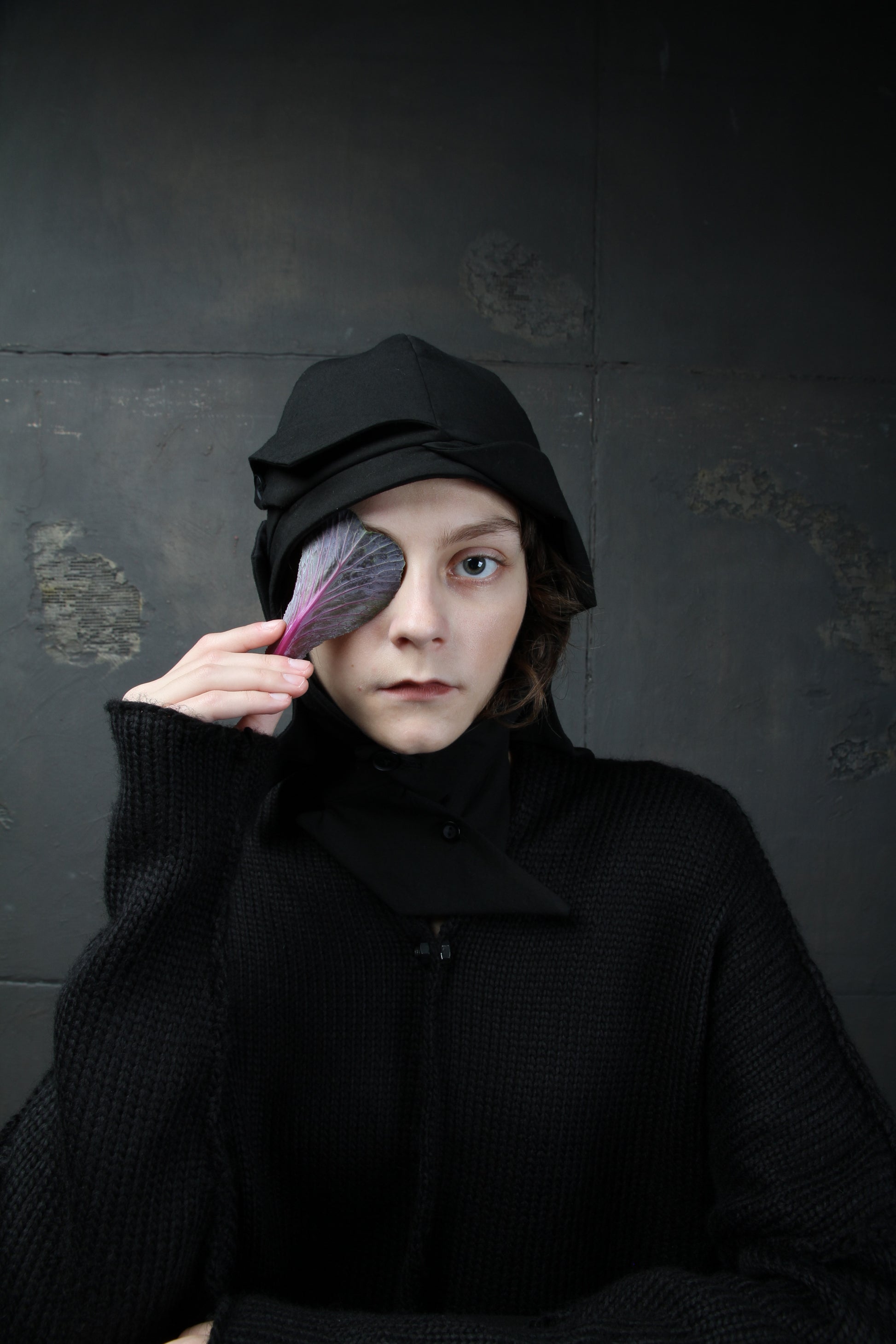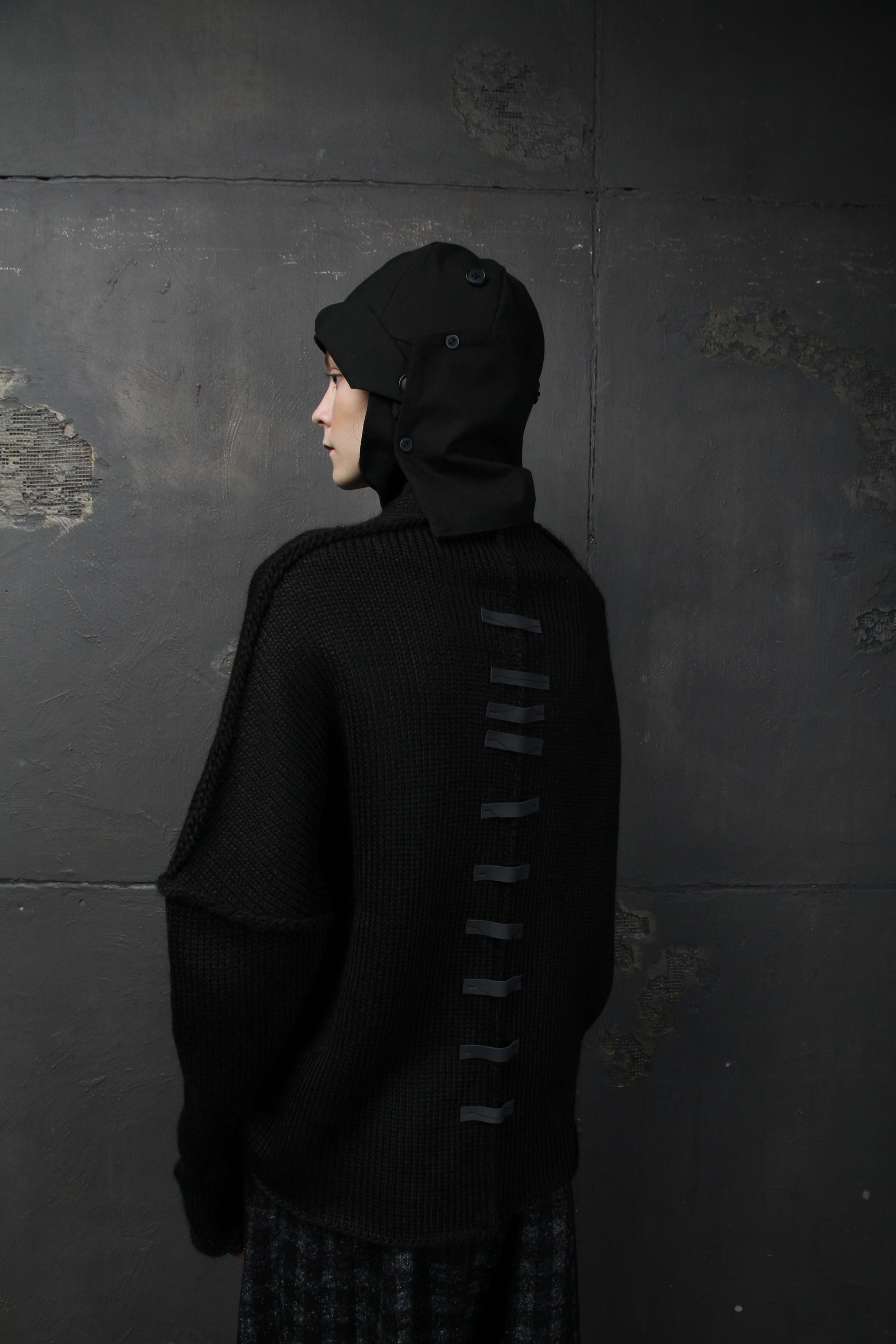 Gorro con capucha asimétrica. El elemento que cubre el cuello se puede desabrochar.