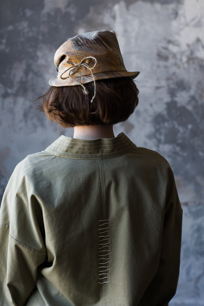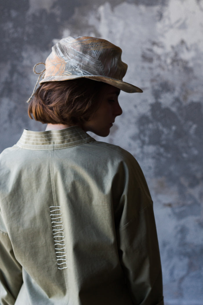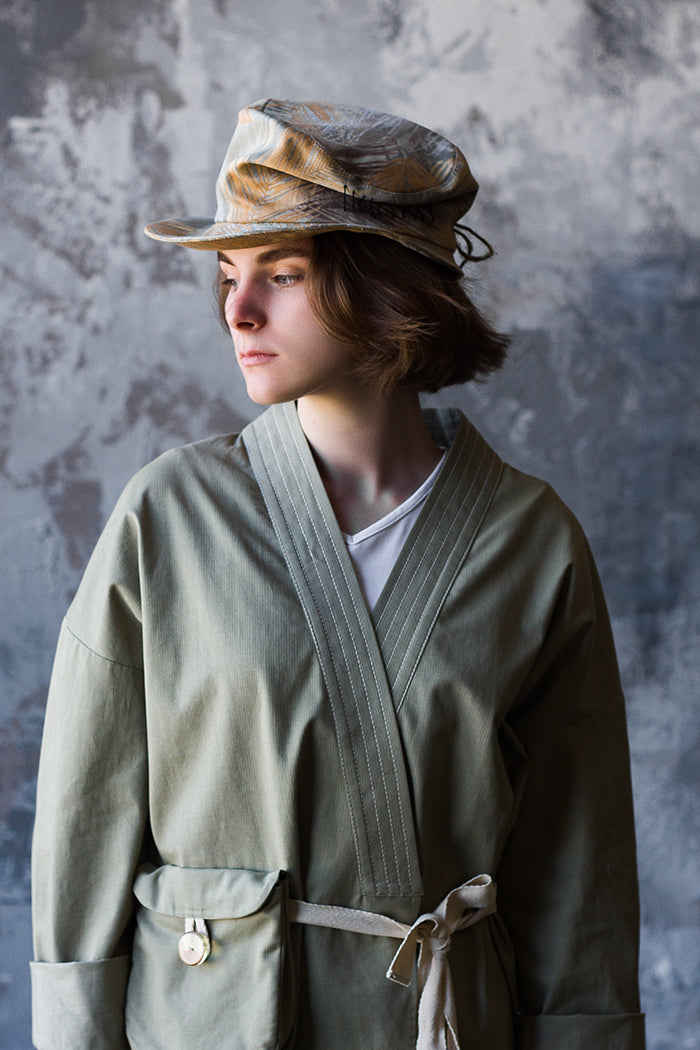Un sombrero con visera y drapeado, bordado con hilo denso en un lateral. Un cordón en la parte trasera permite ajustar la circunferencia de la cabeza. El sombrero combina a la perfección con el traje de Moniko.