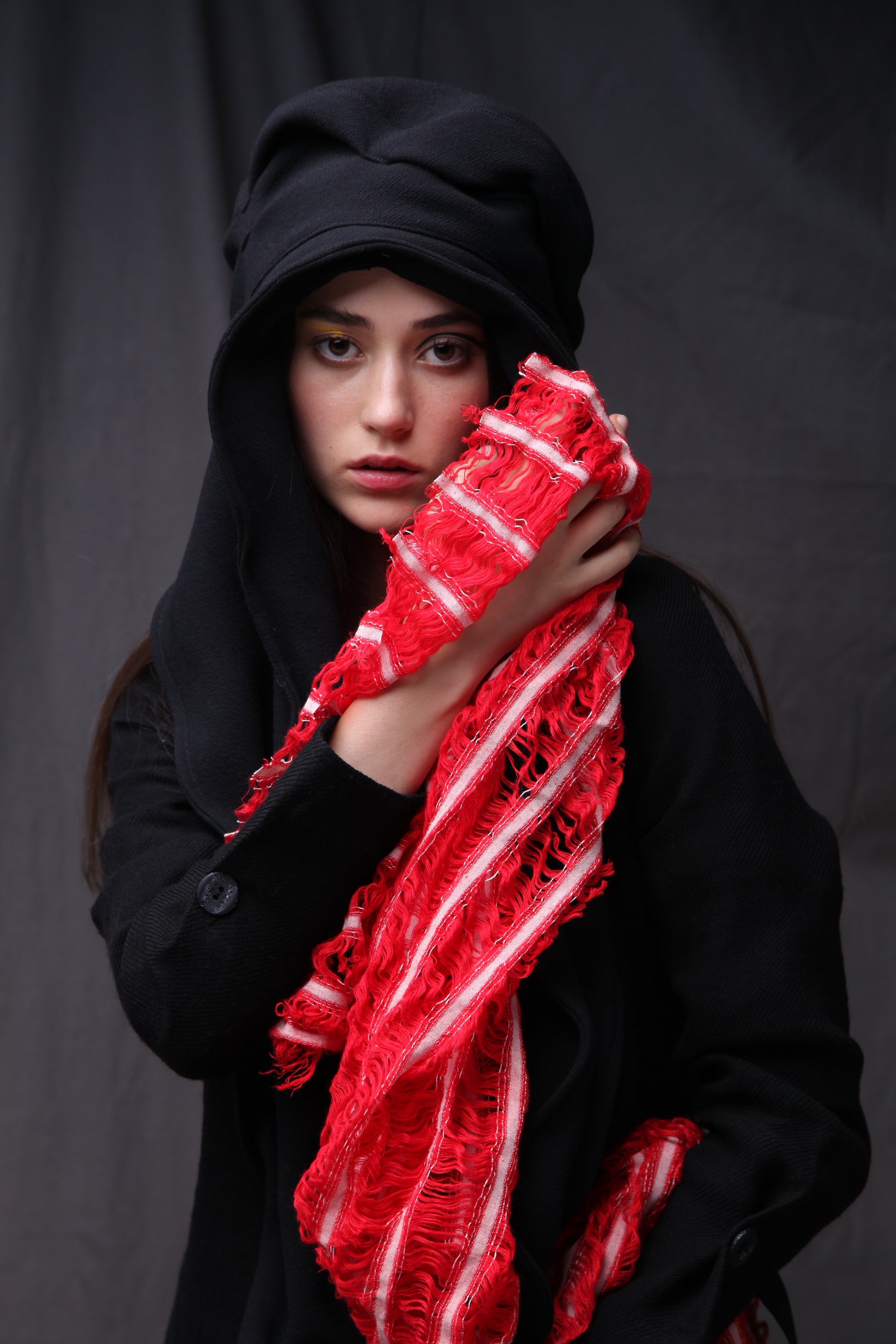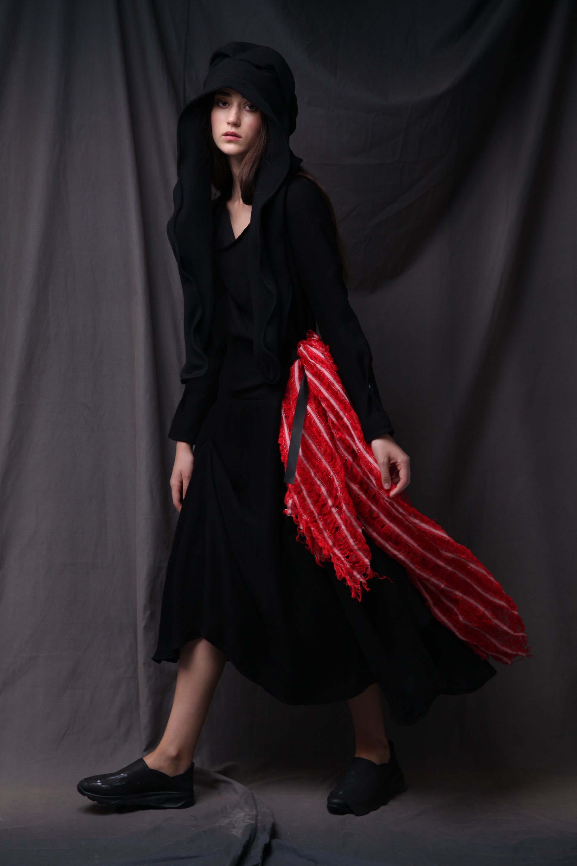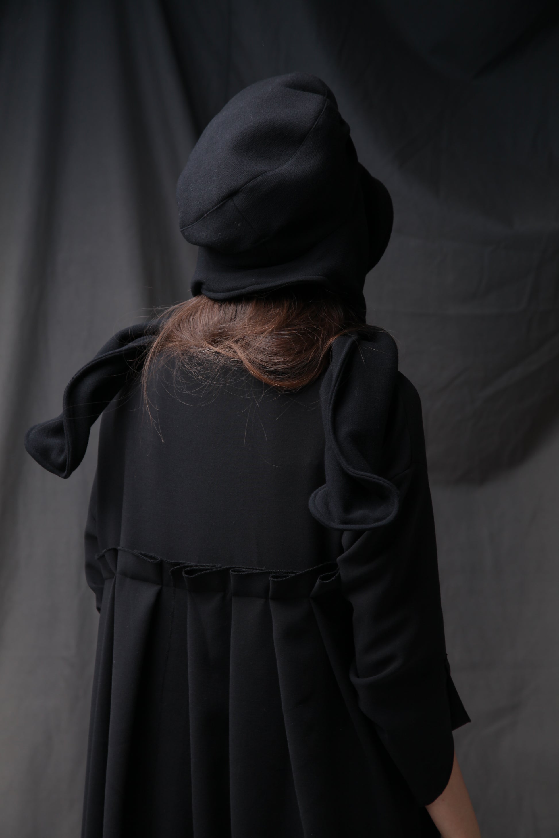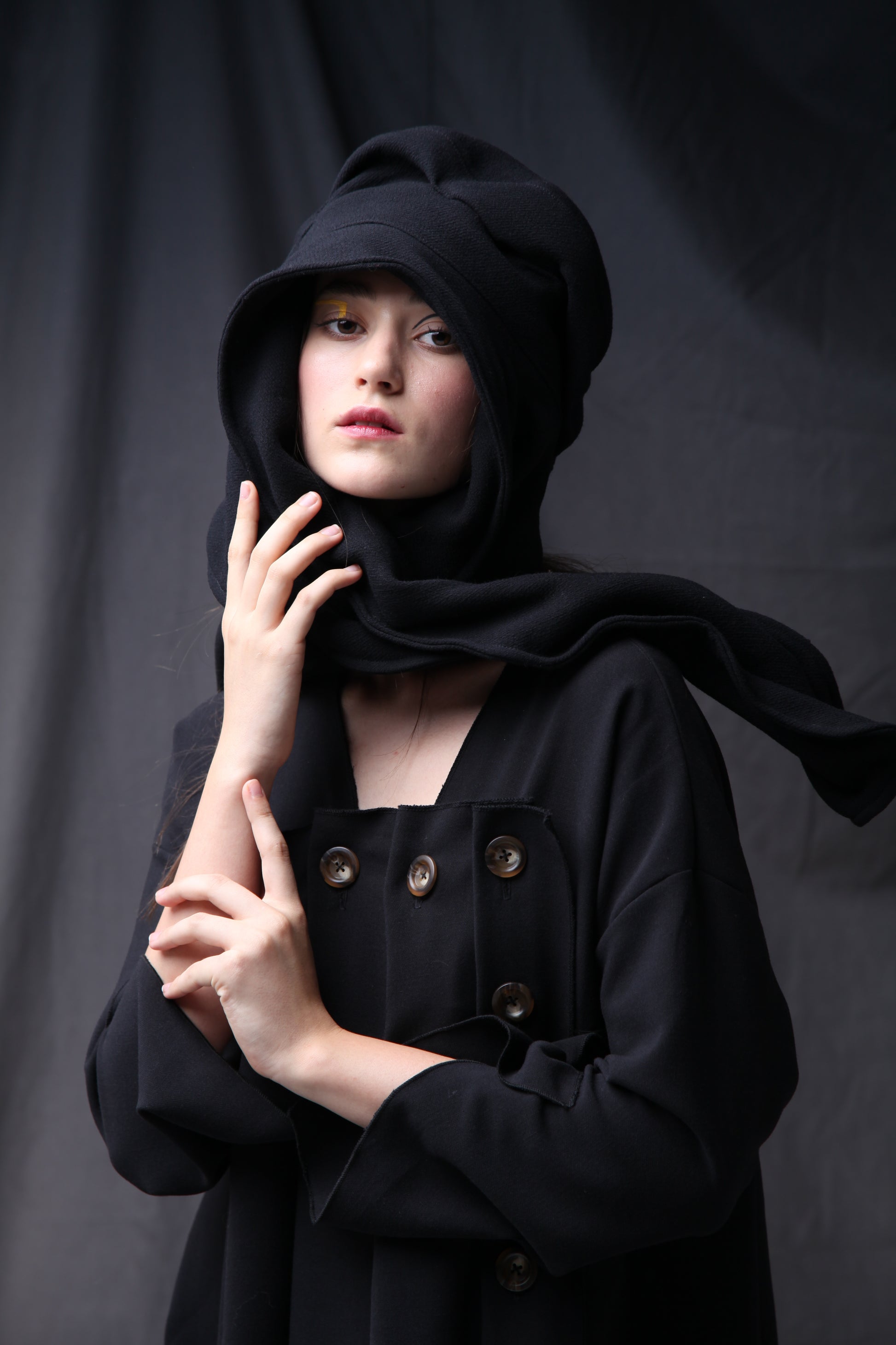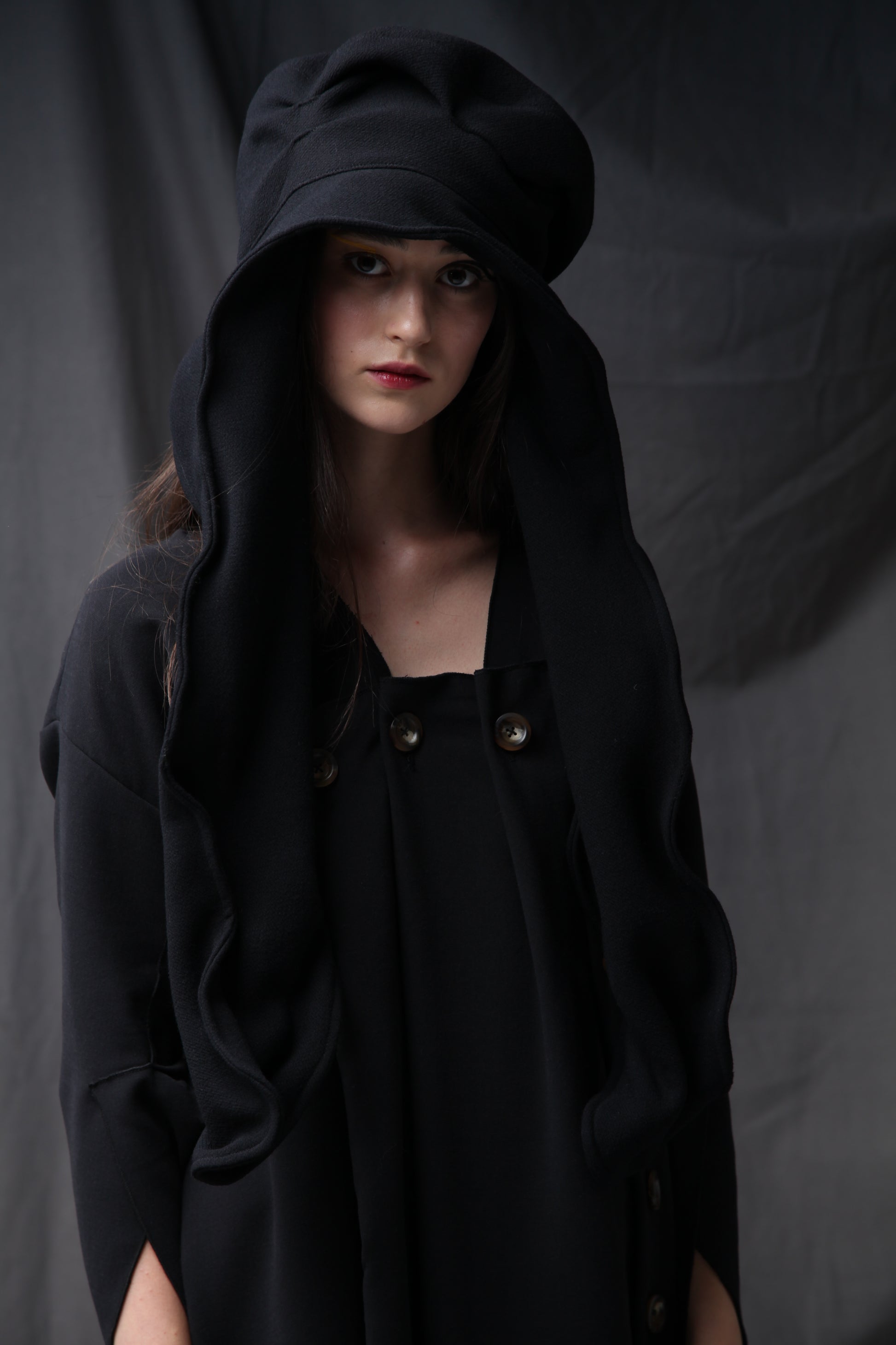 Sombrero negro con ala larga que se puede usar como bufanda. Alambre en el interior que permite cambiar la forma del sombrero. Talla universal. Sombrero con forro.