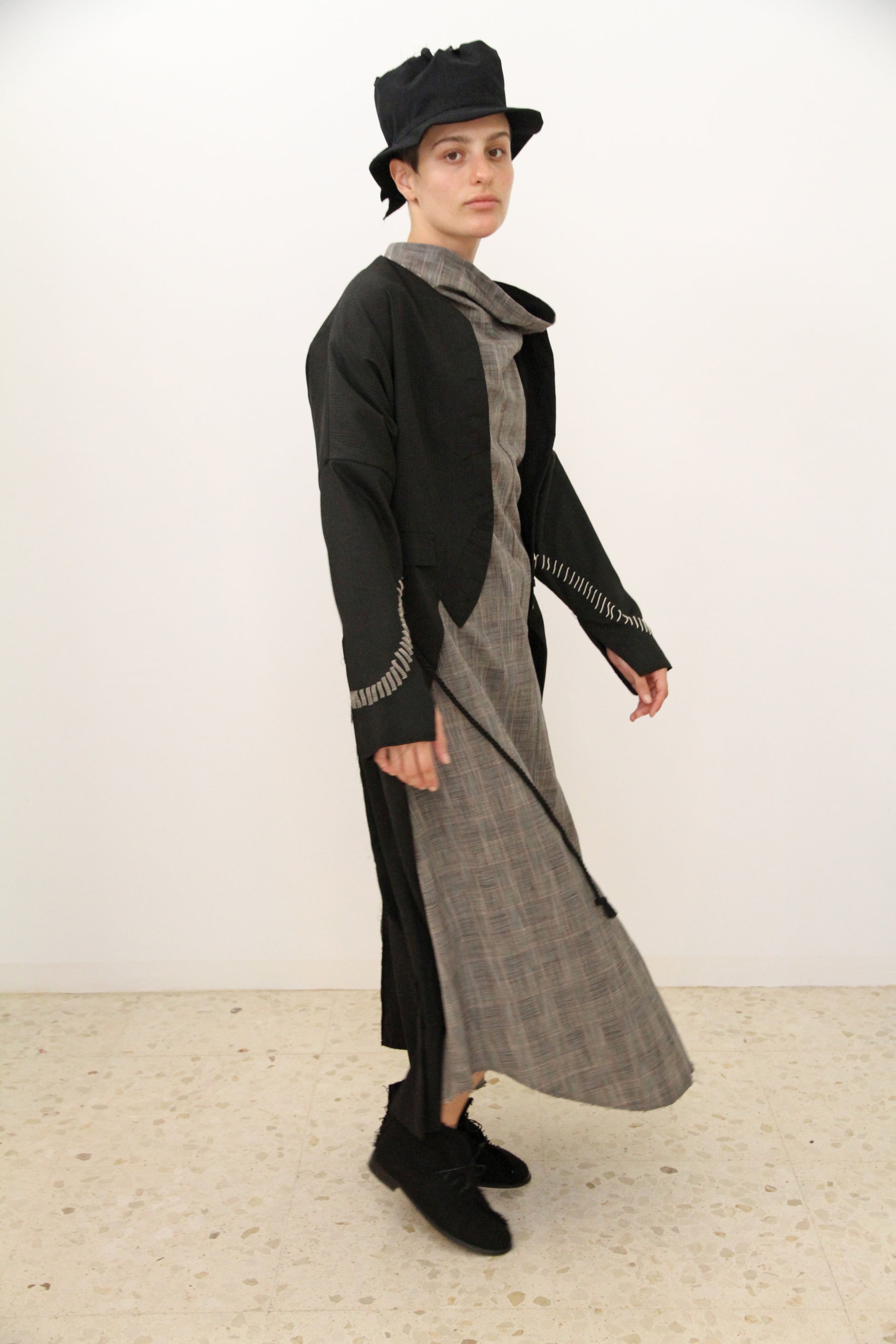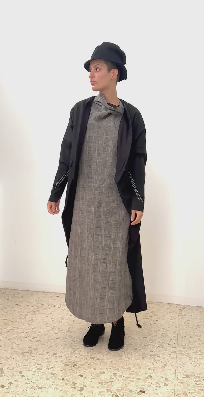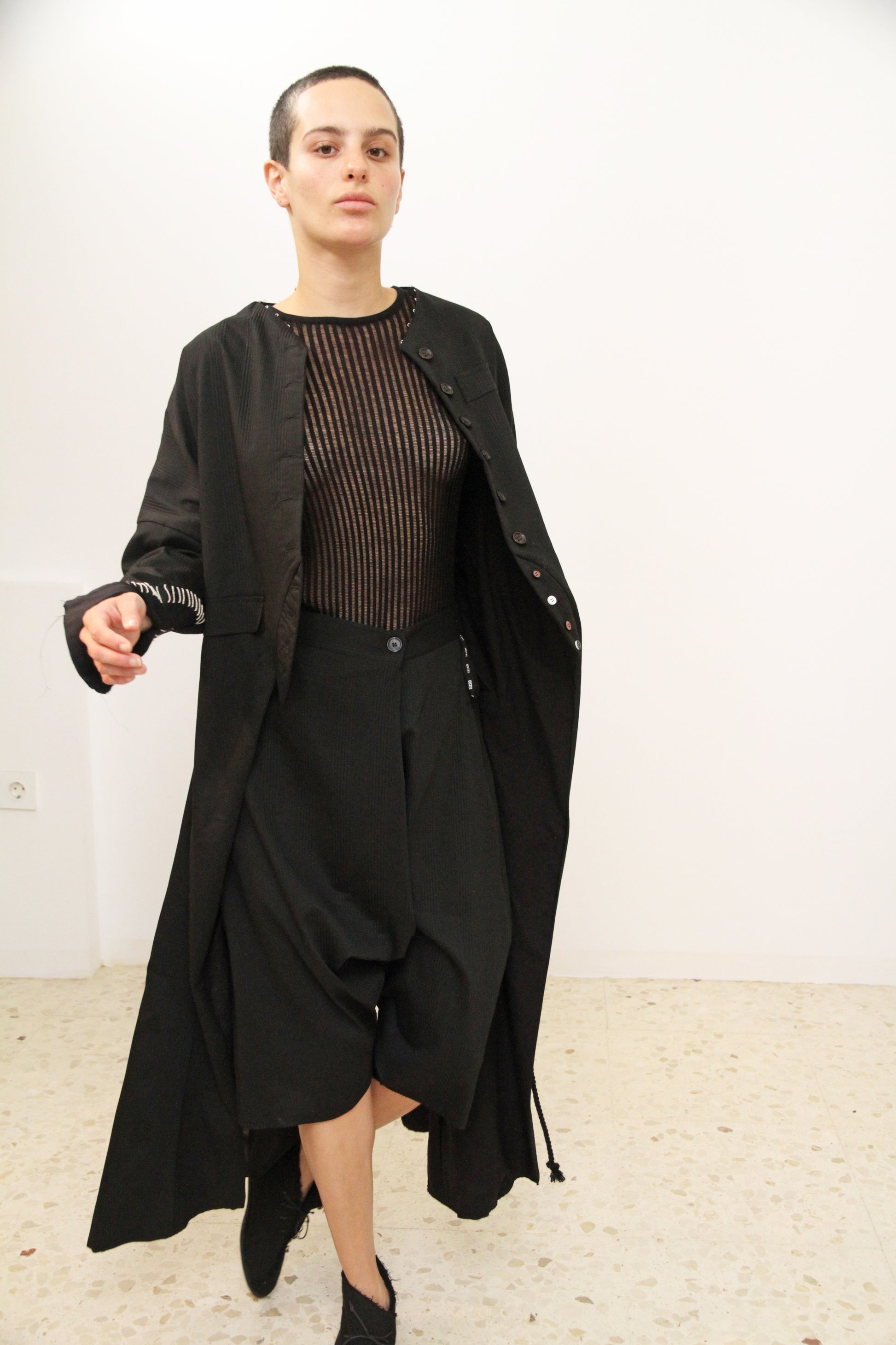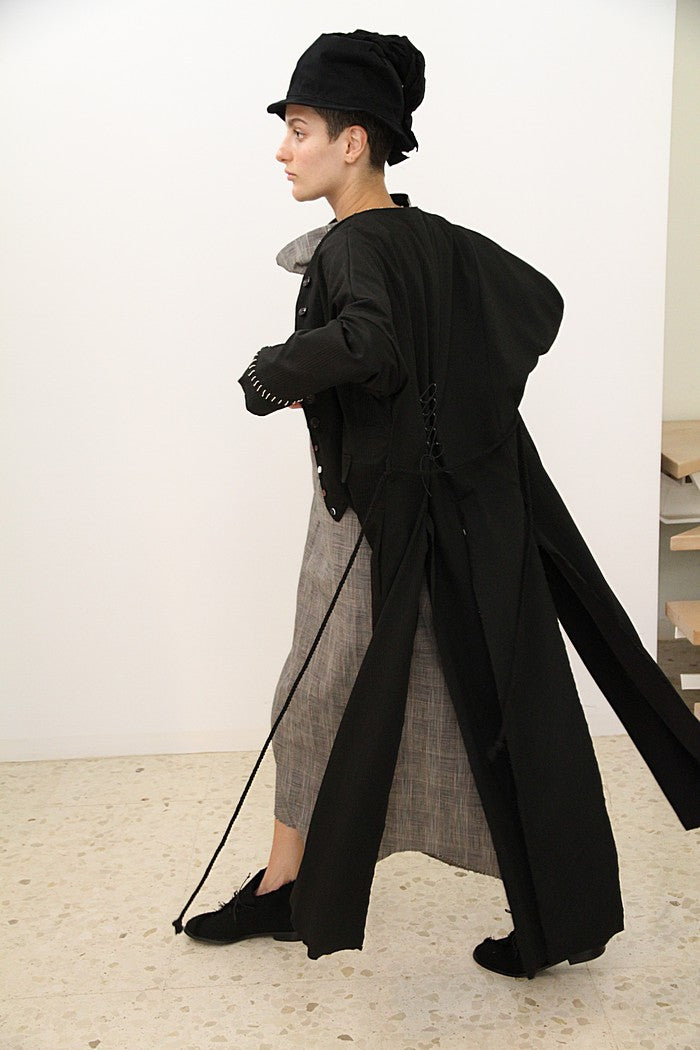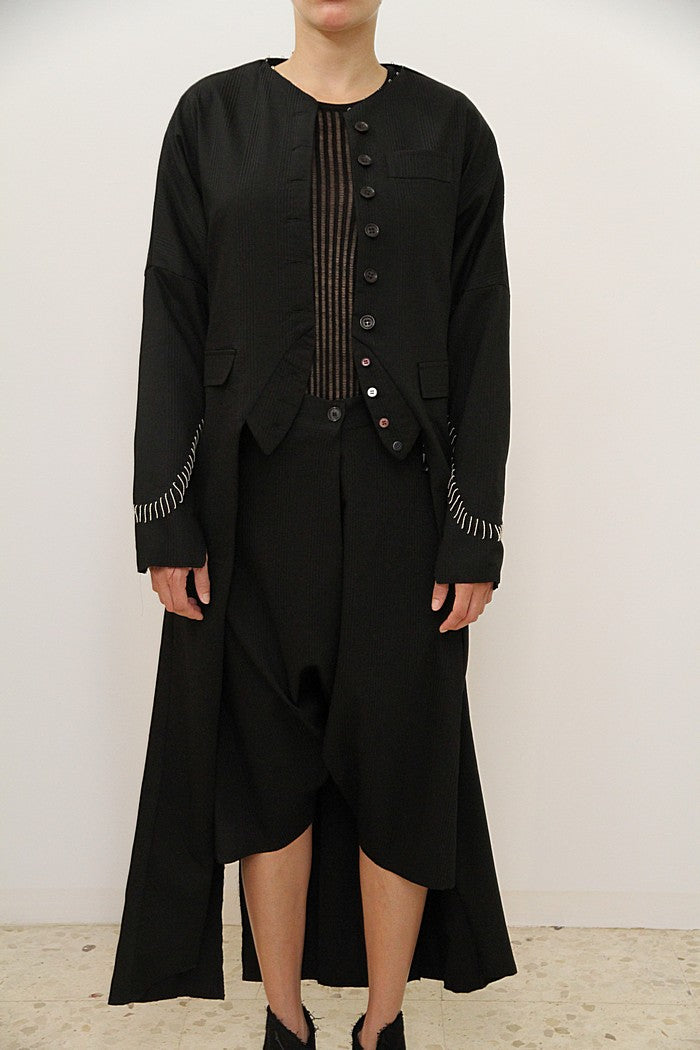 Chaqueta larga con detalles en cuello, mangas y espalda. Chaqueta de corte holgado y aspecto frac. Dos bolsillos.