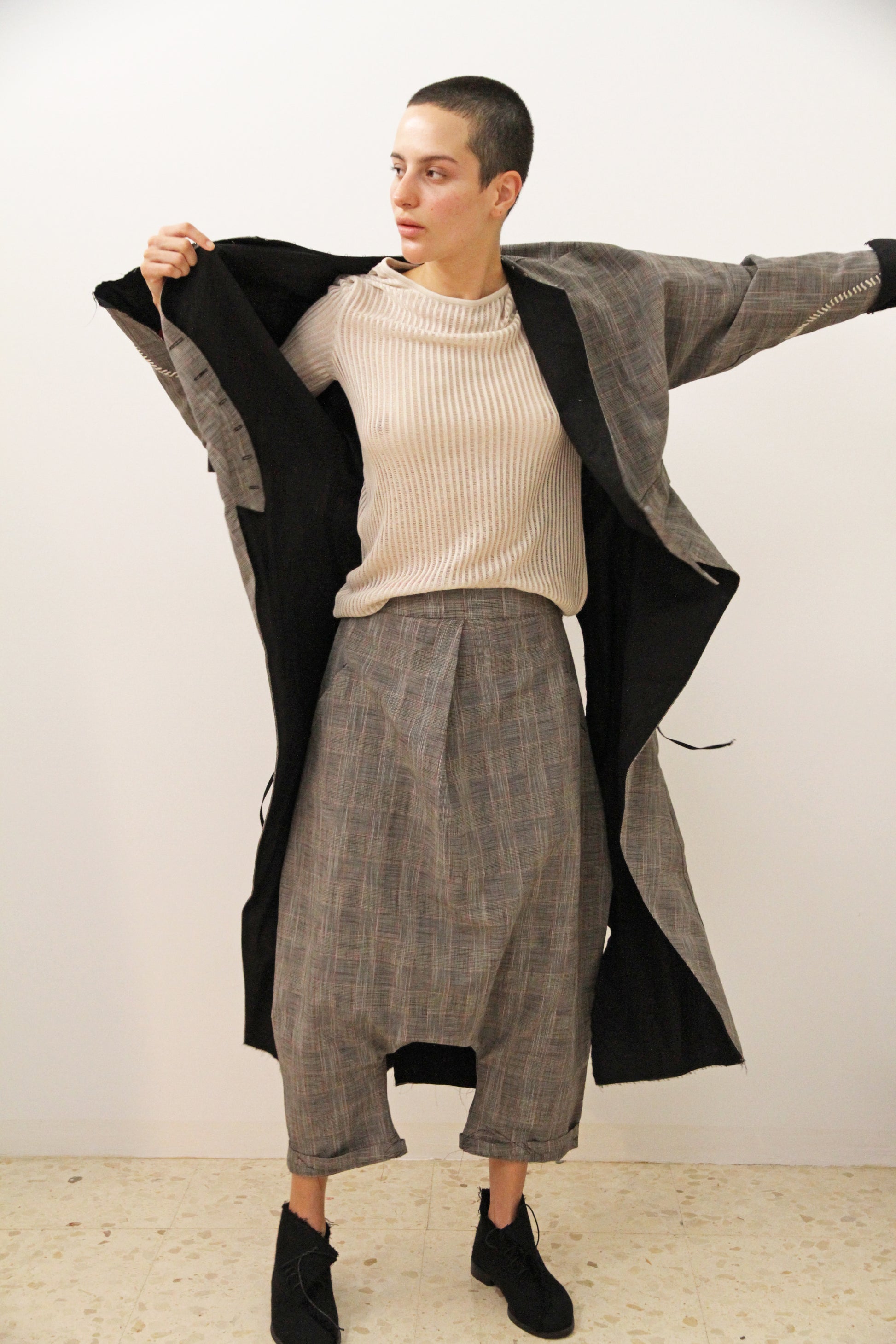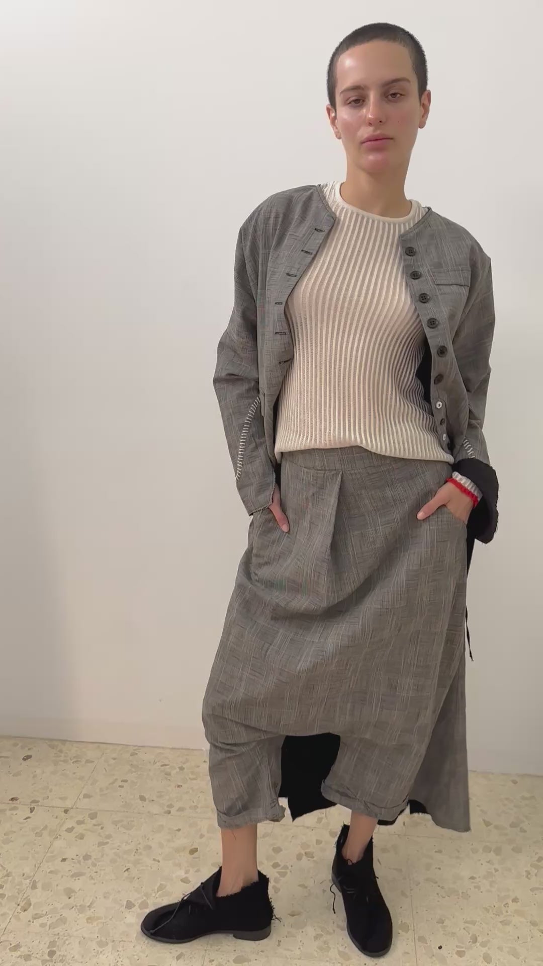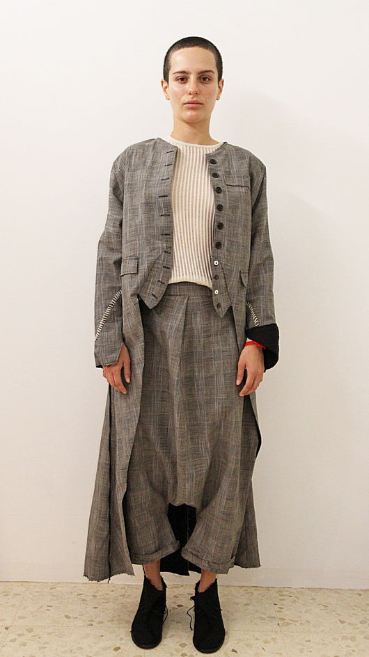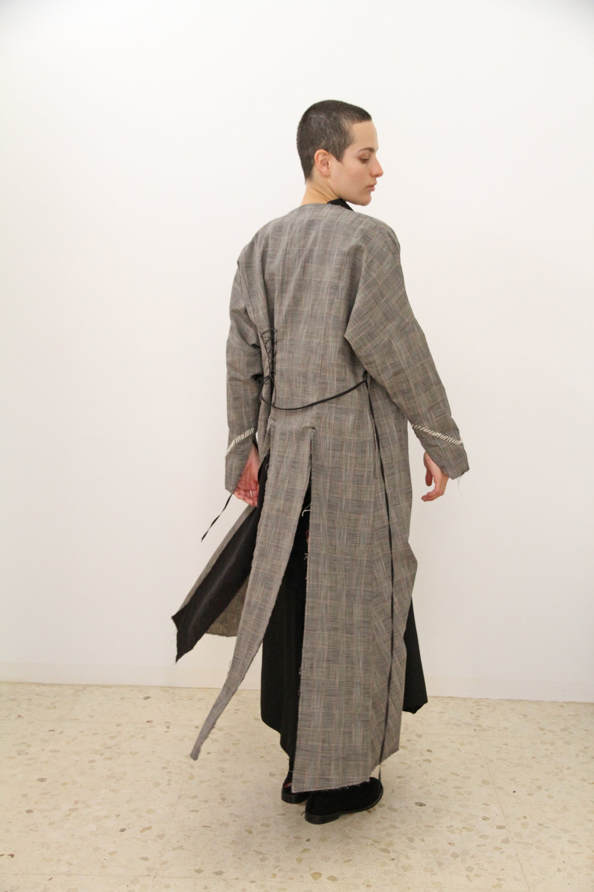Chaqueta larga con detalles en cuello, mangas y espalda. Chaqueta de corte holgado y aspecto frac. Dos bolsillos.