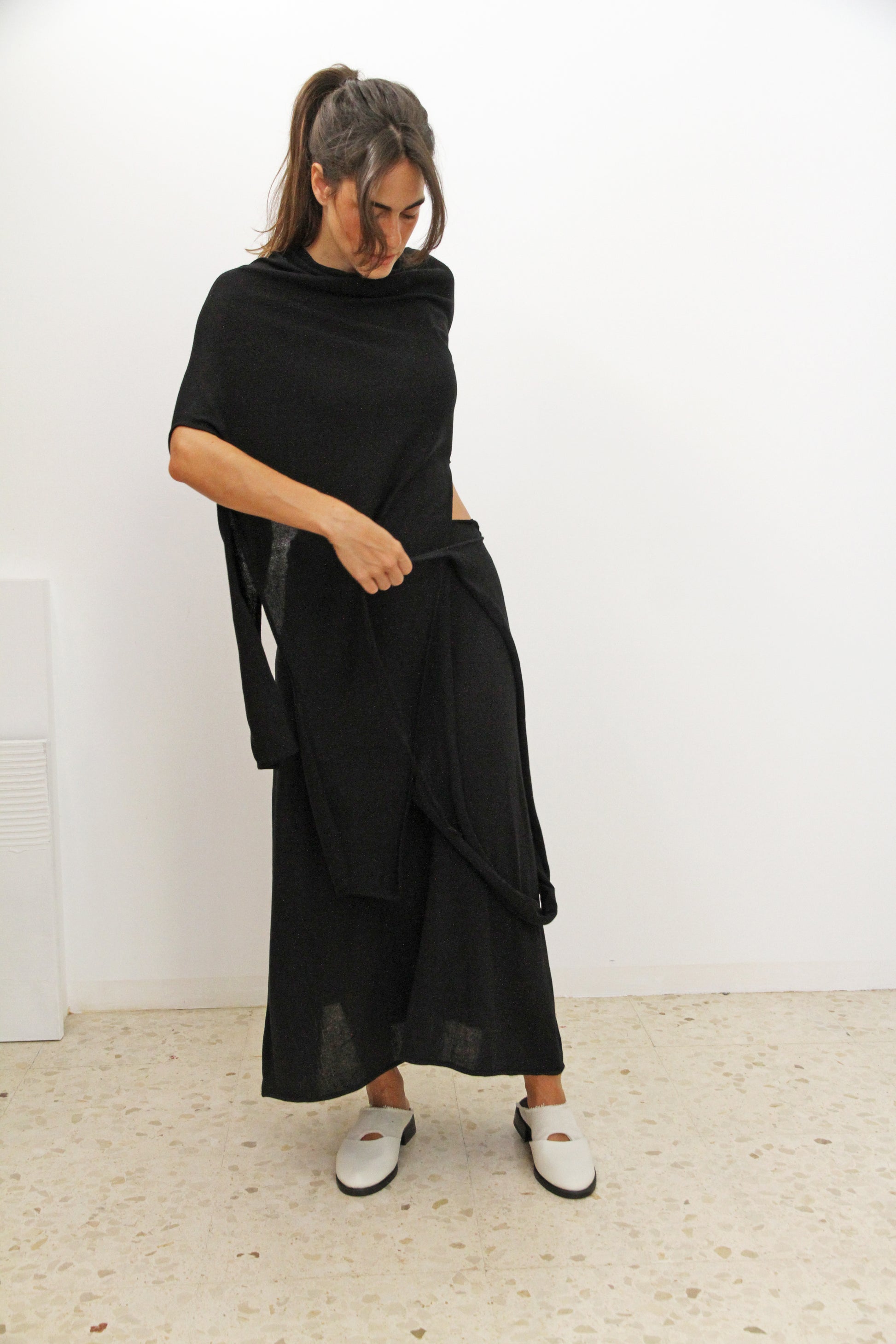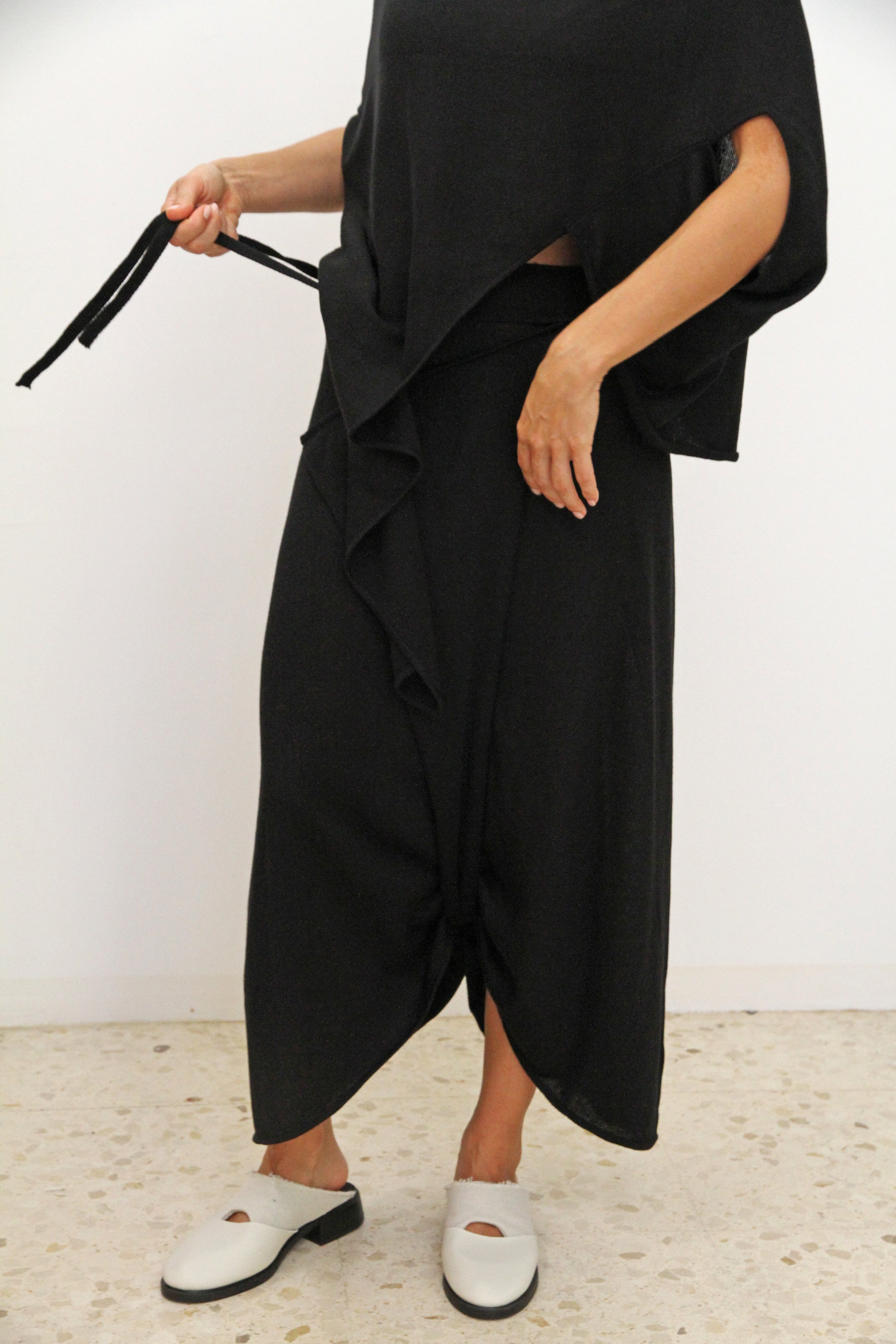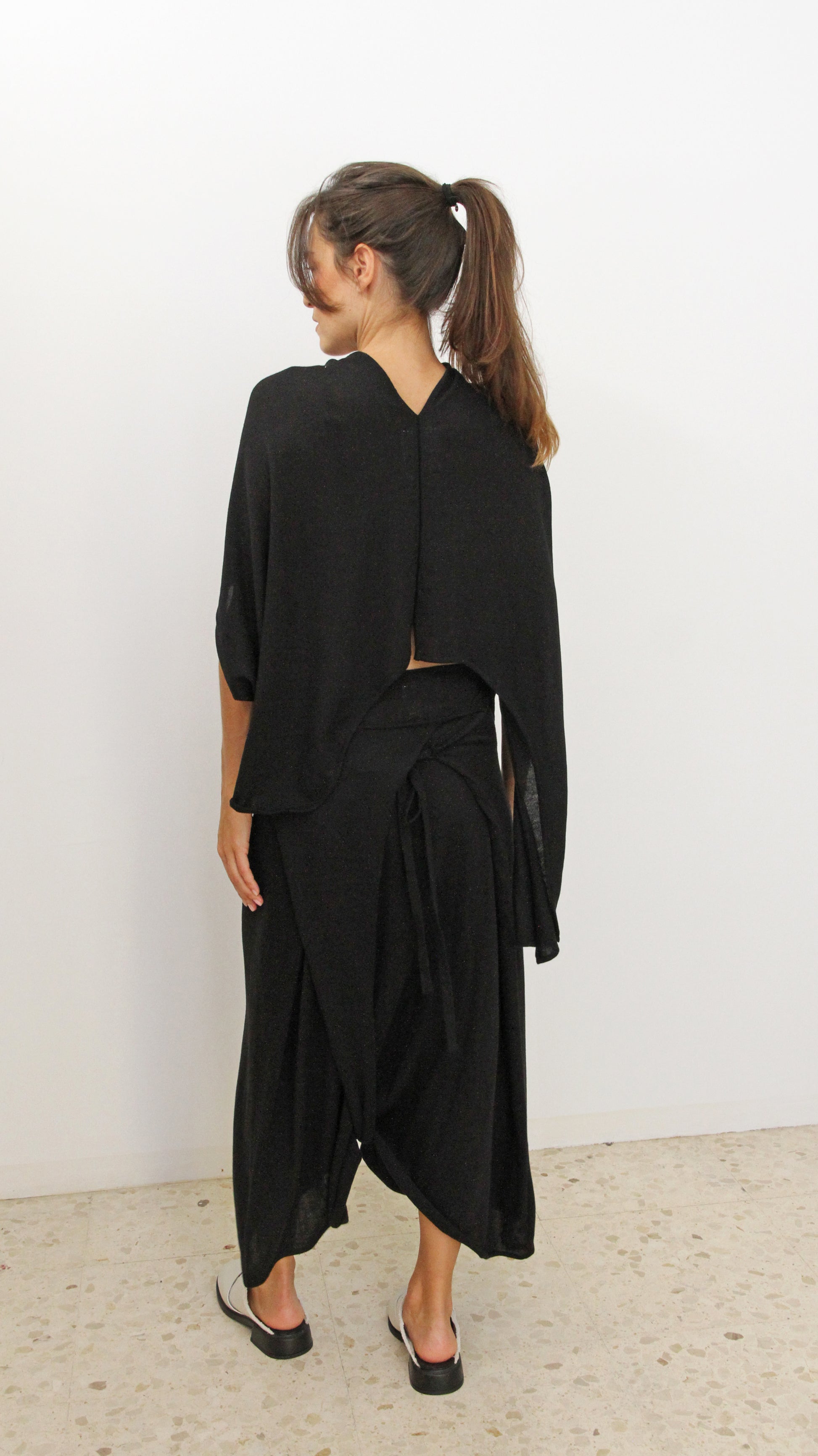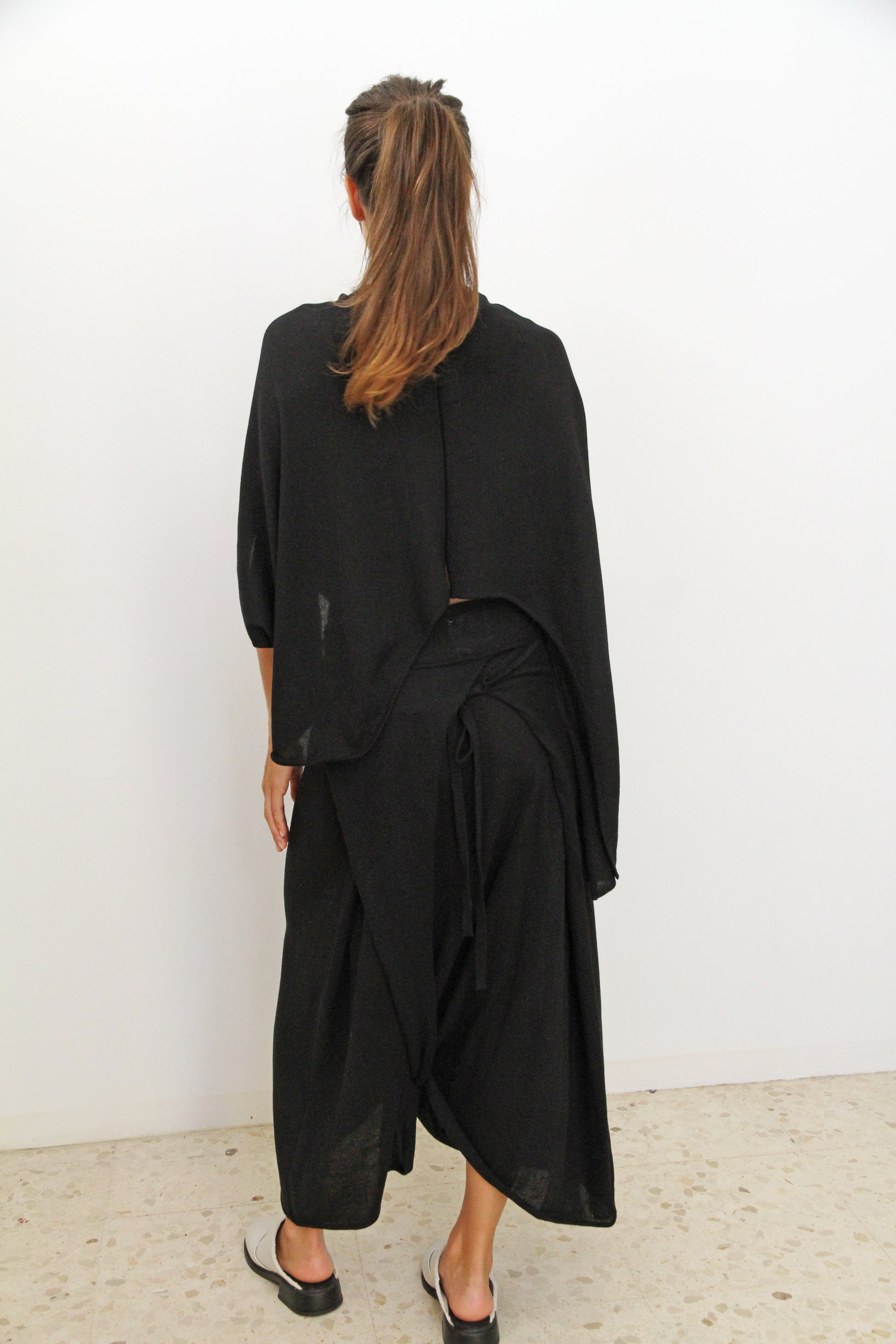 Traje oversize de punto. Pantalón-falda (puedes arreglarlo tú mismo) y top asimétrico.