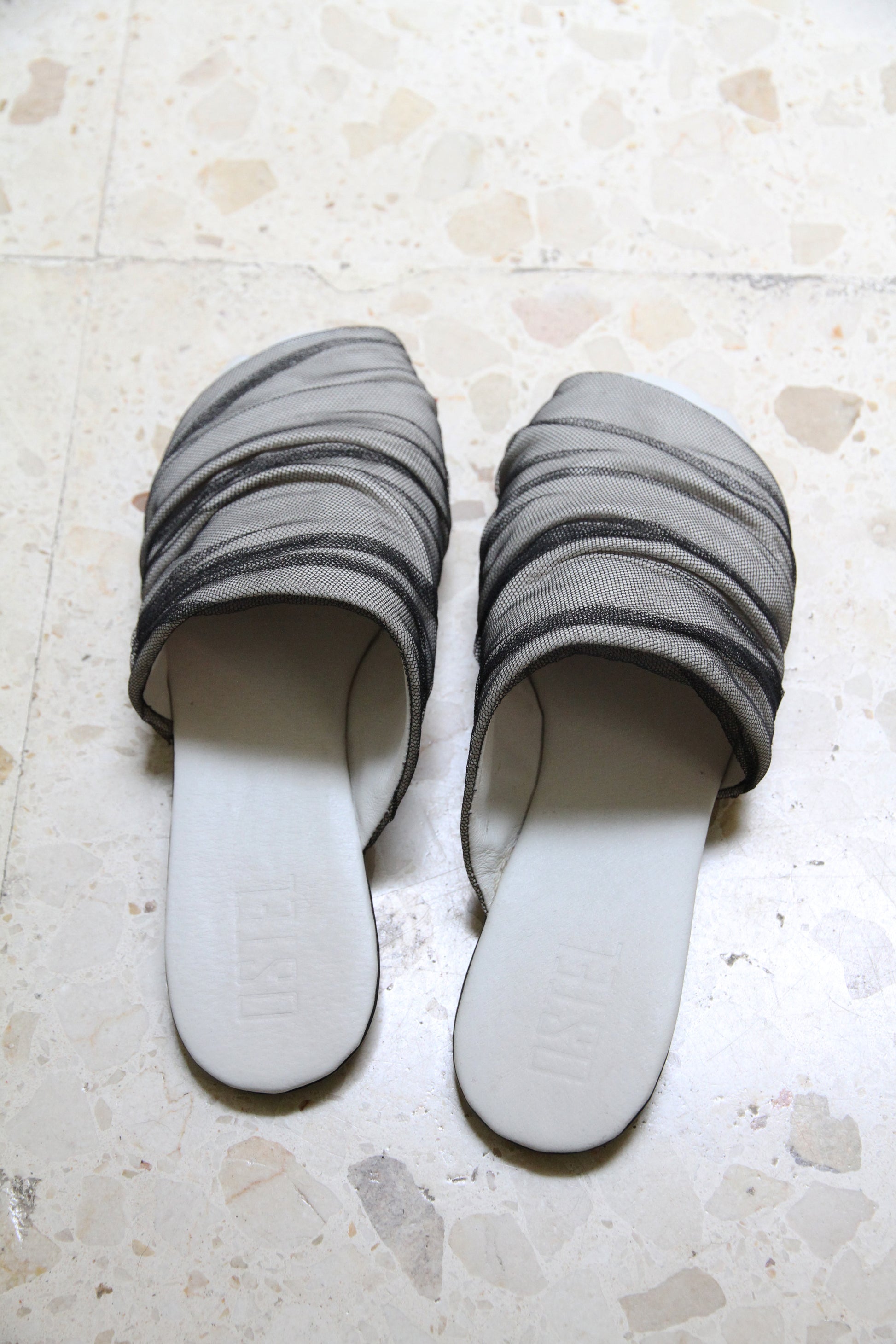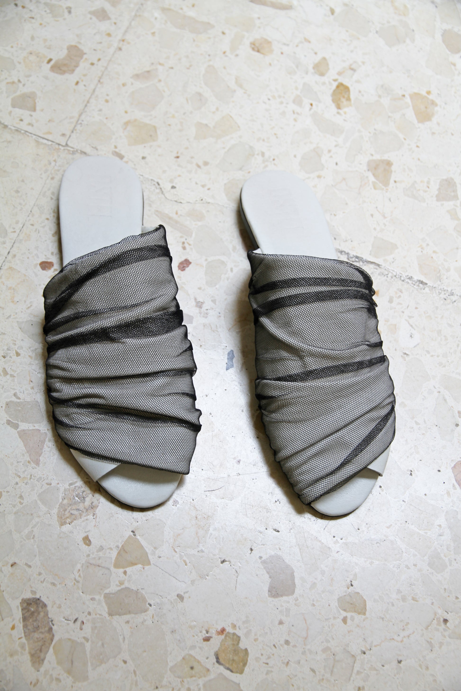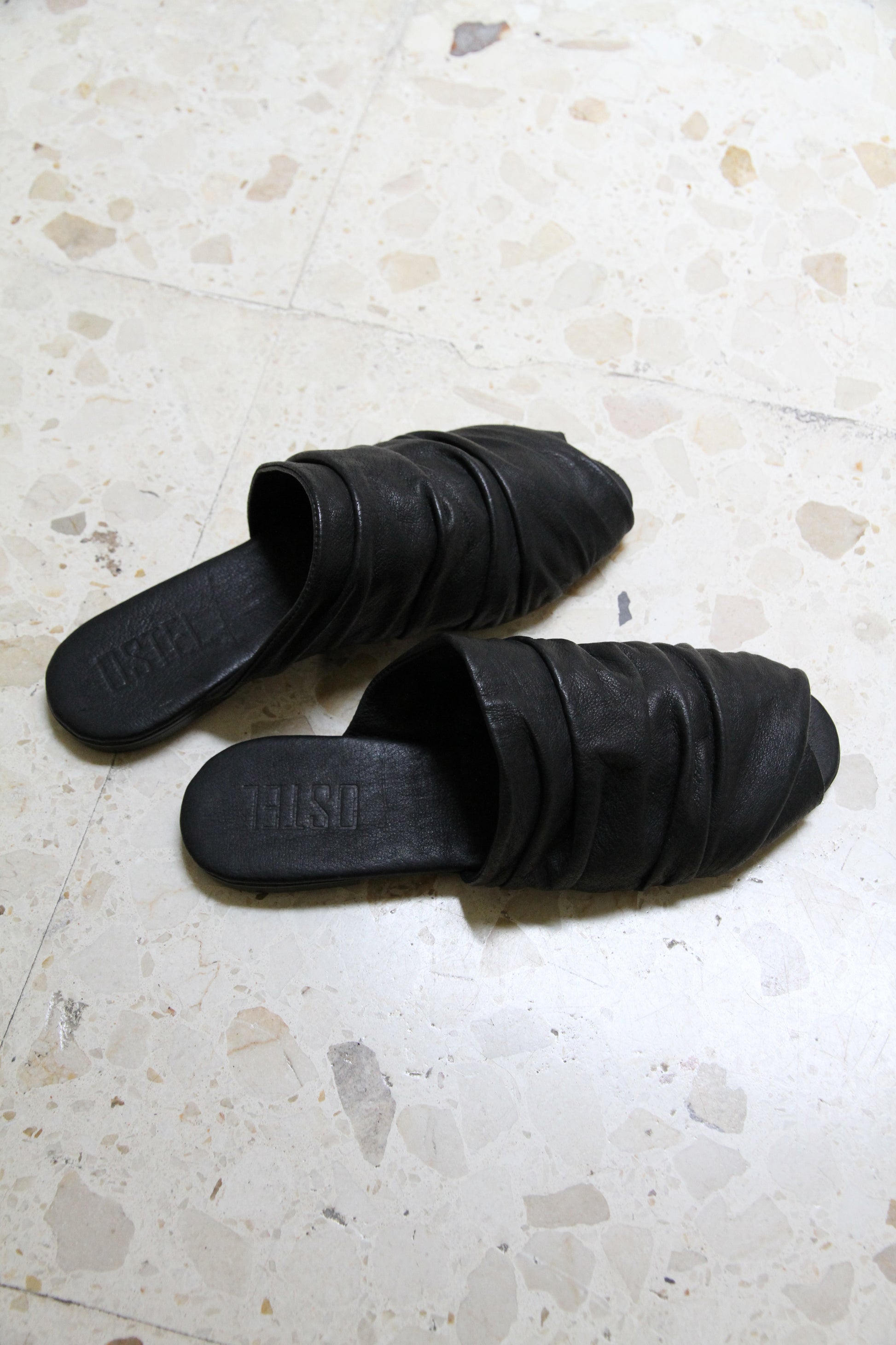 Mules de piel suaves y cómodos con detalle drapeado y puntera abierta.