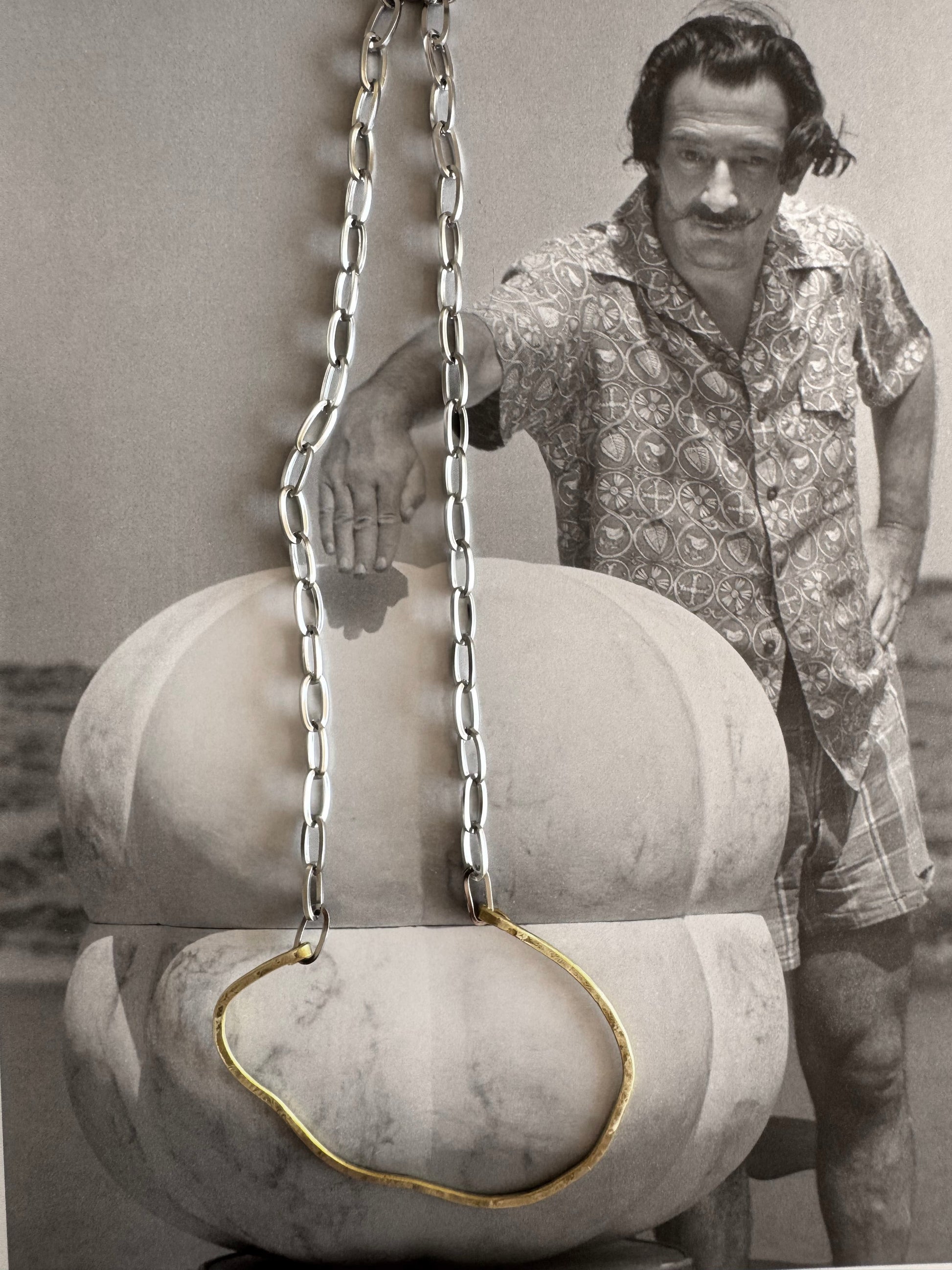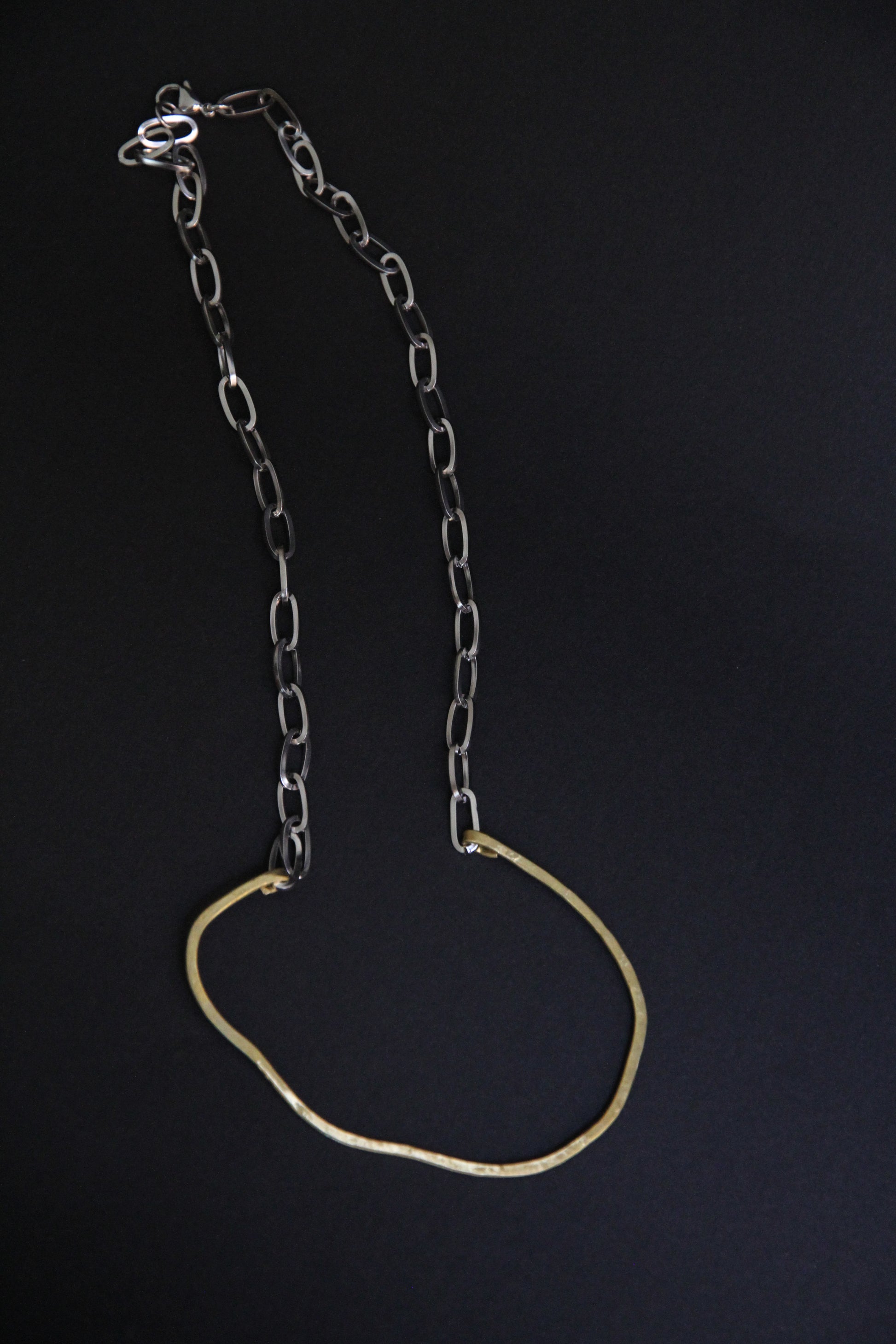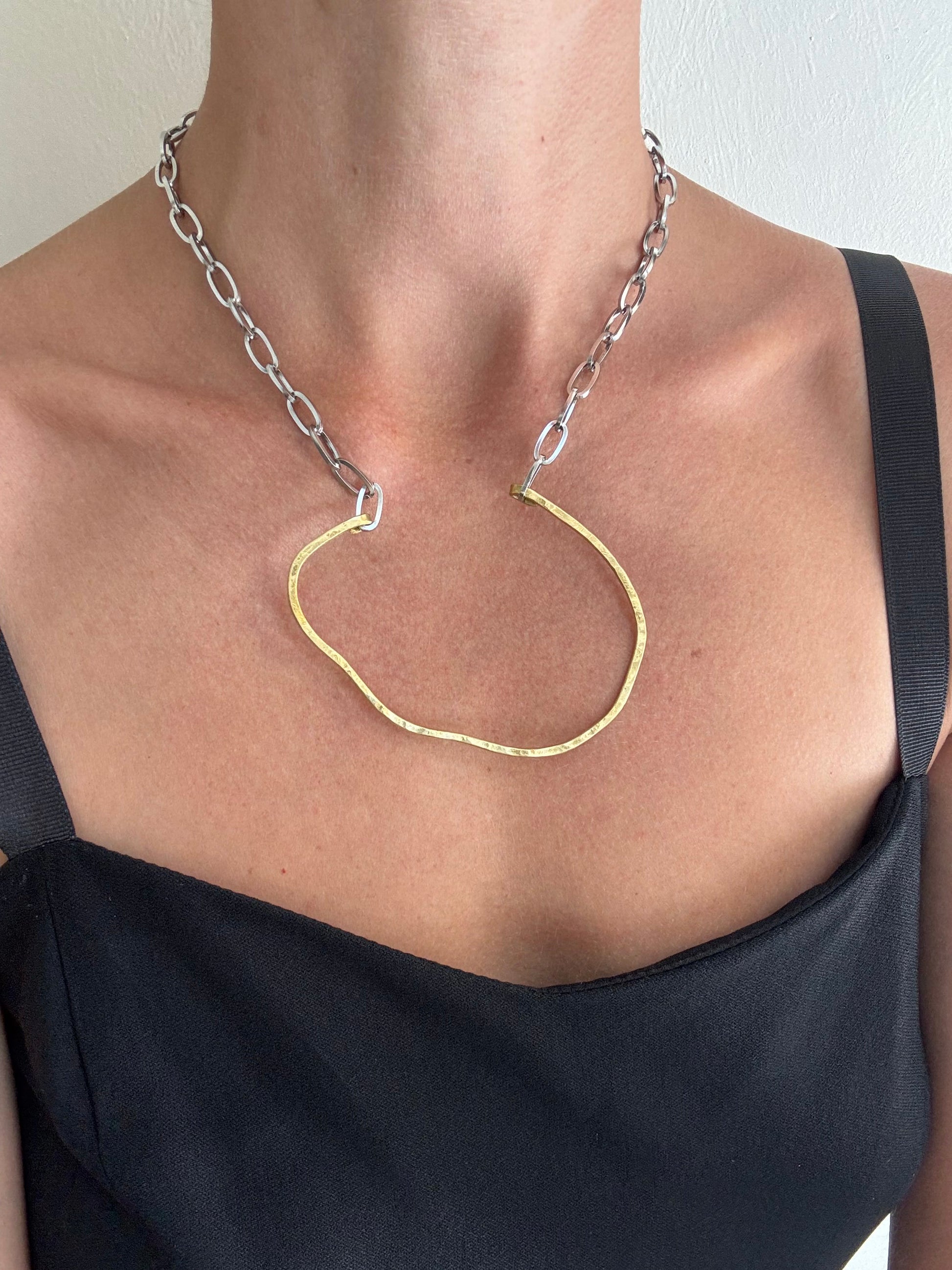 Collar de materiales en contraste: una robusta cadena de acero inoxidable combinada con un contorno curvado de latón. El elemento dorado asimétrico recuerda a una línea trazada de un solo gesto, creando el efecto de una escultura contemporánea sobre el cuerpo. Esta pieza fusiona la fuerza bruta del acero con la calidez del latón, equilibrando el minimalismo con la expresión artística.