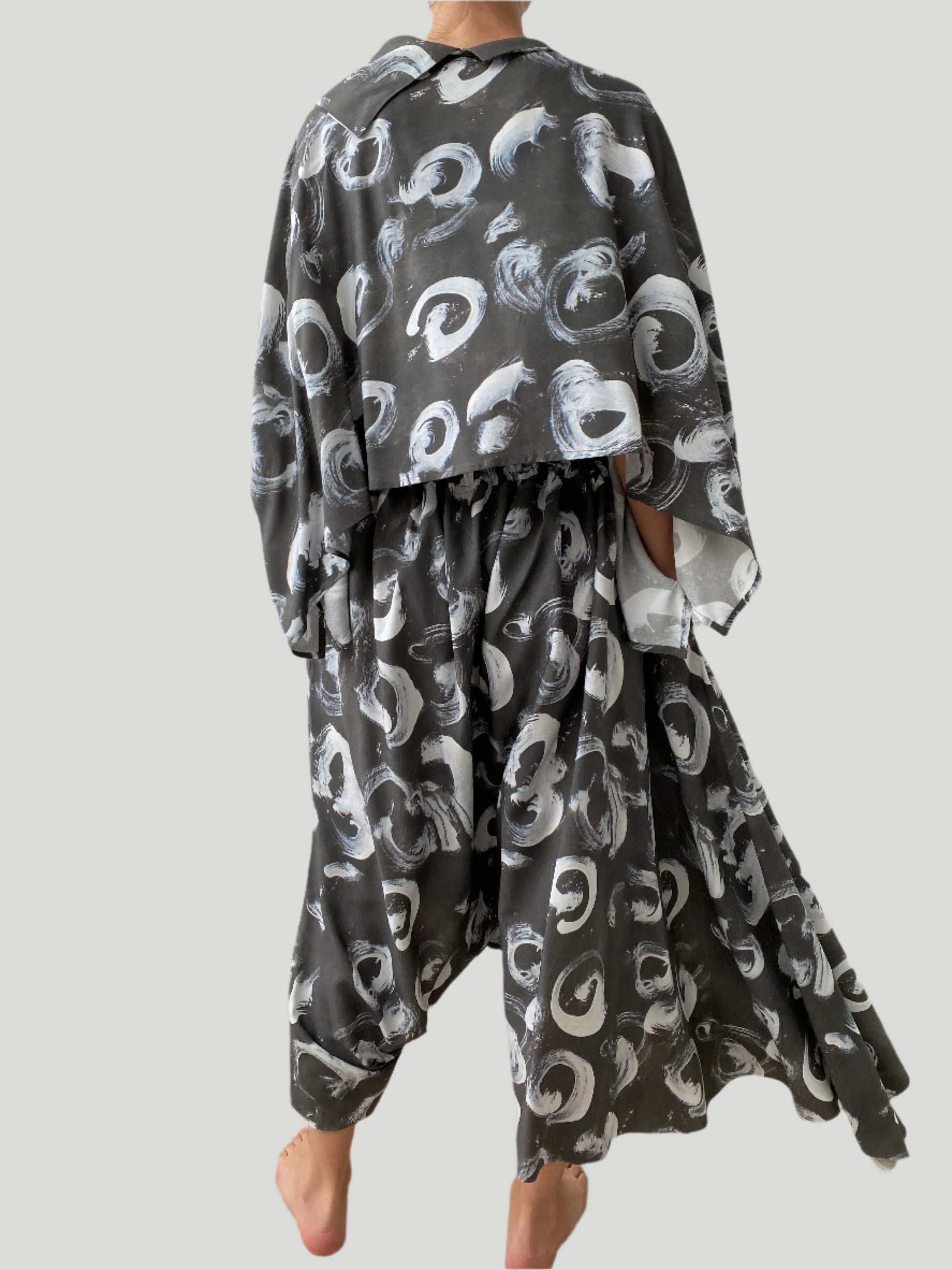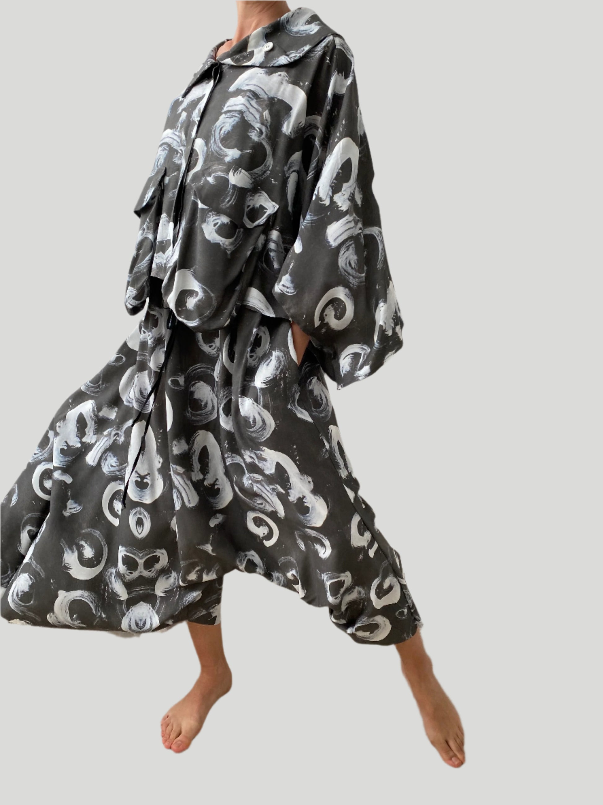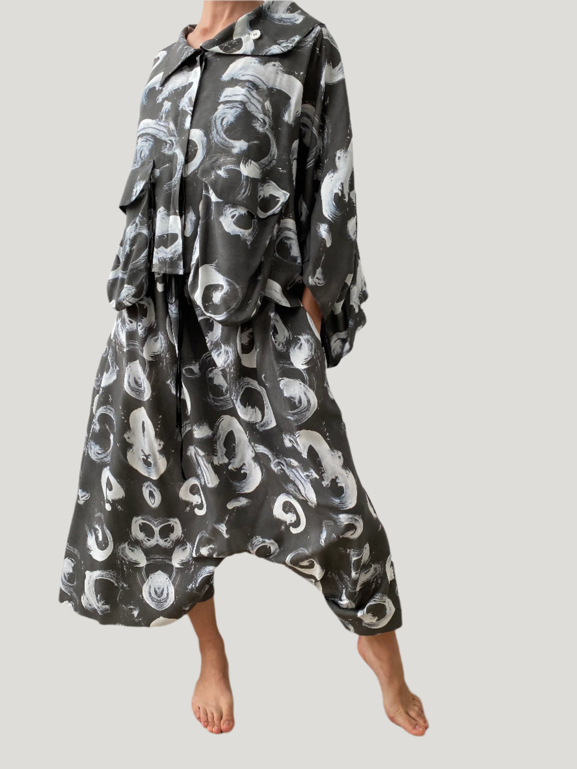 Pantalón asimétrico oversize con bolsillos y estampado especial de ilustración artística del diseñador. El pantalón se ajusta mediante una tira en el cinturón.
