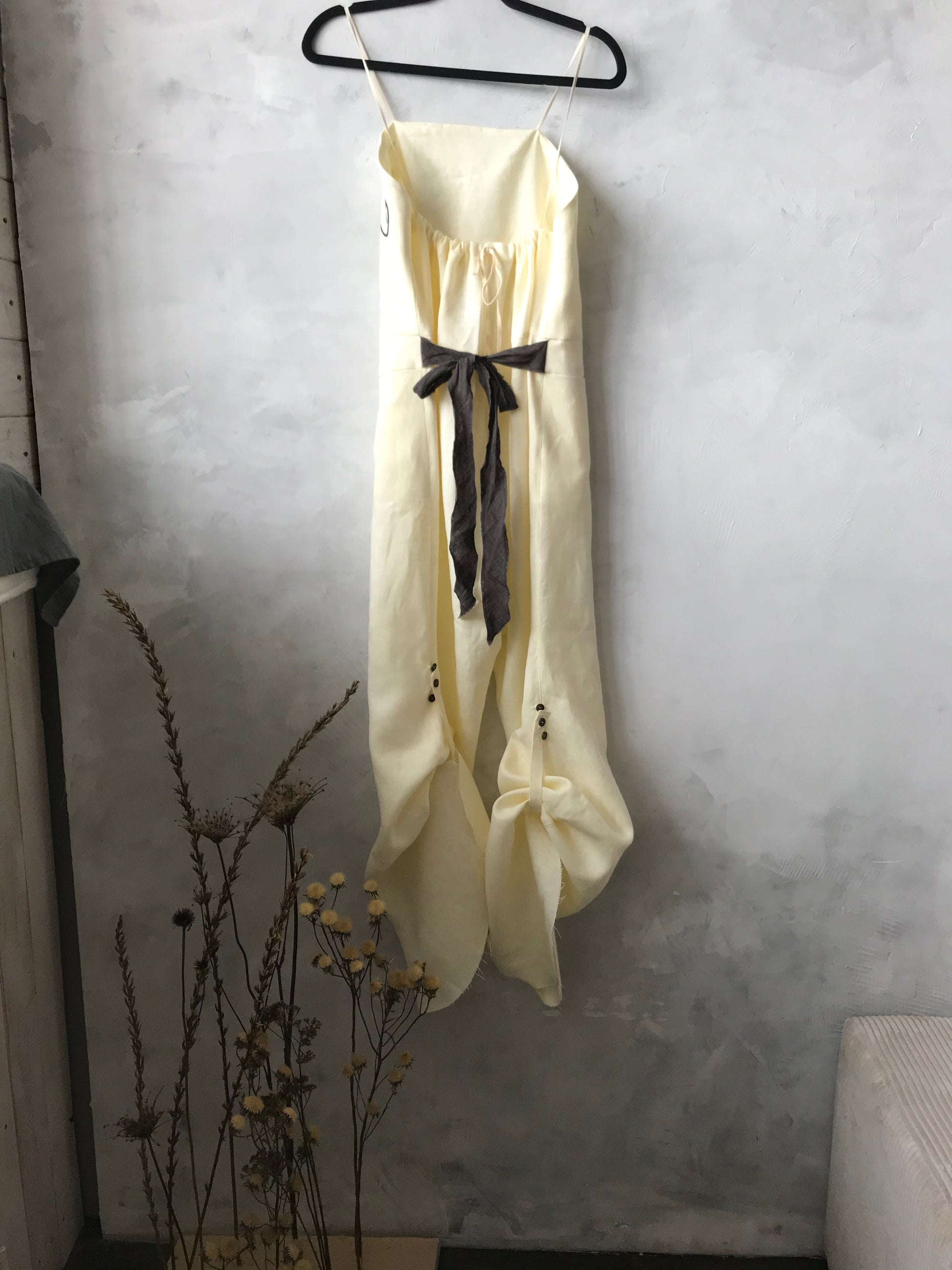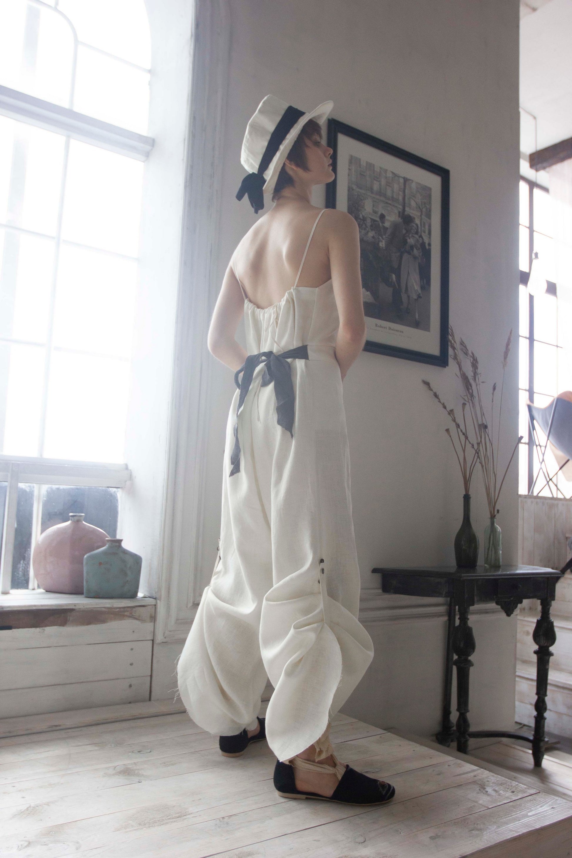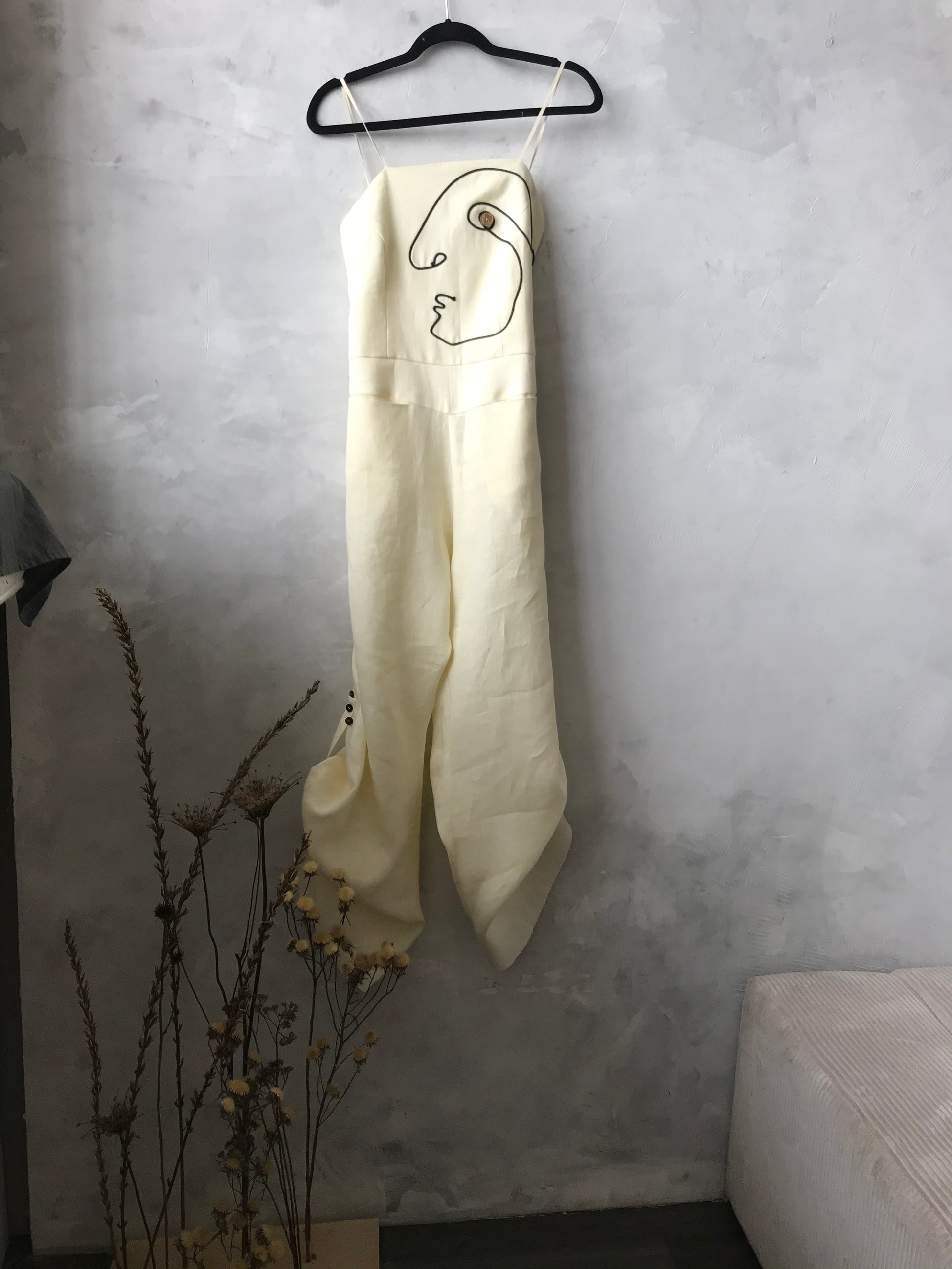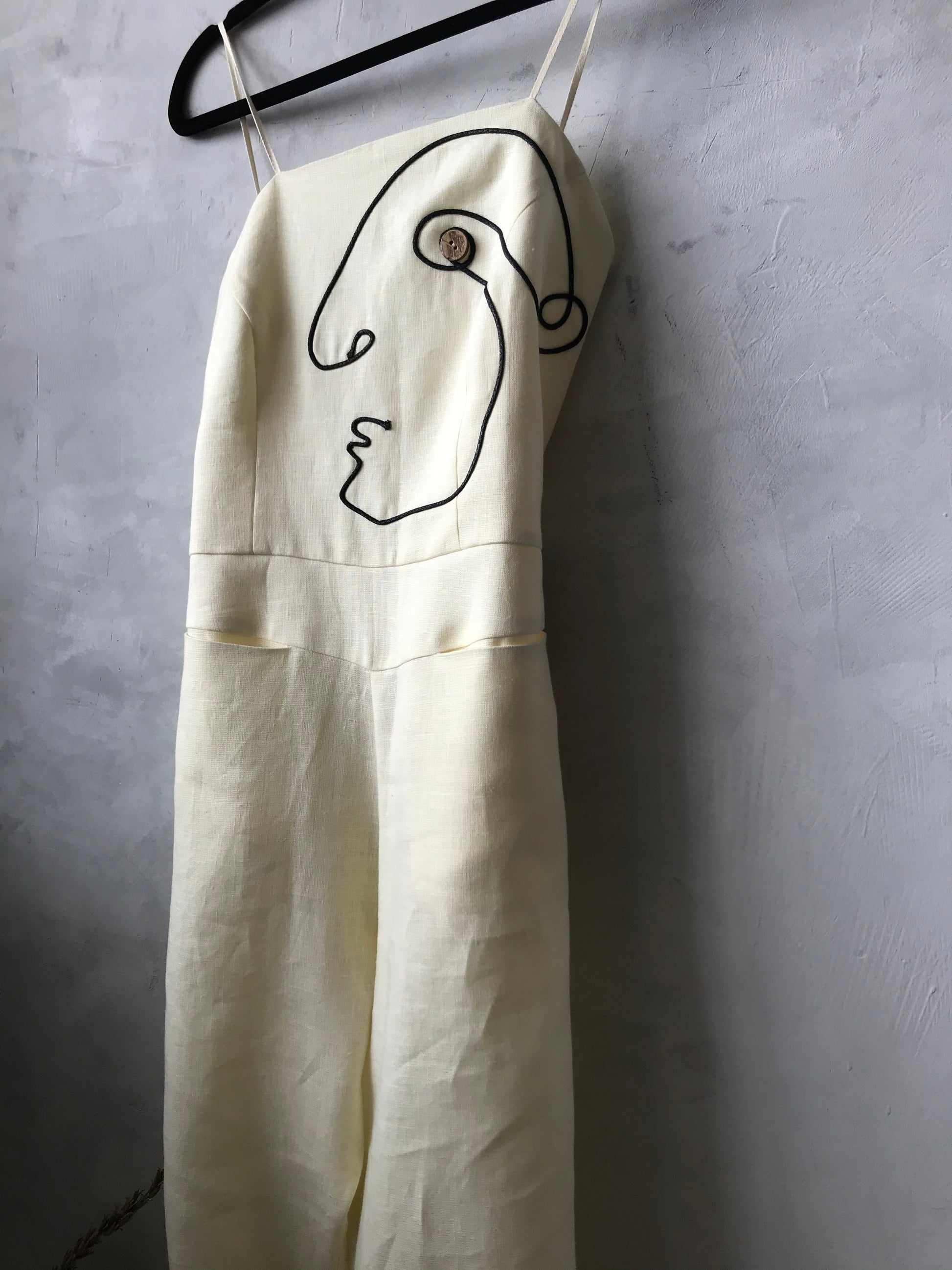 Mono de lino con pana negra. El largo del pantalón se regula con botones. Dos bolsillos grandes en la parte delantera.