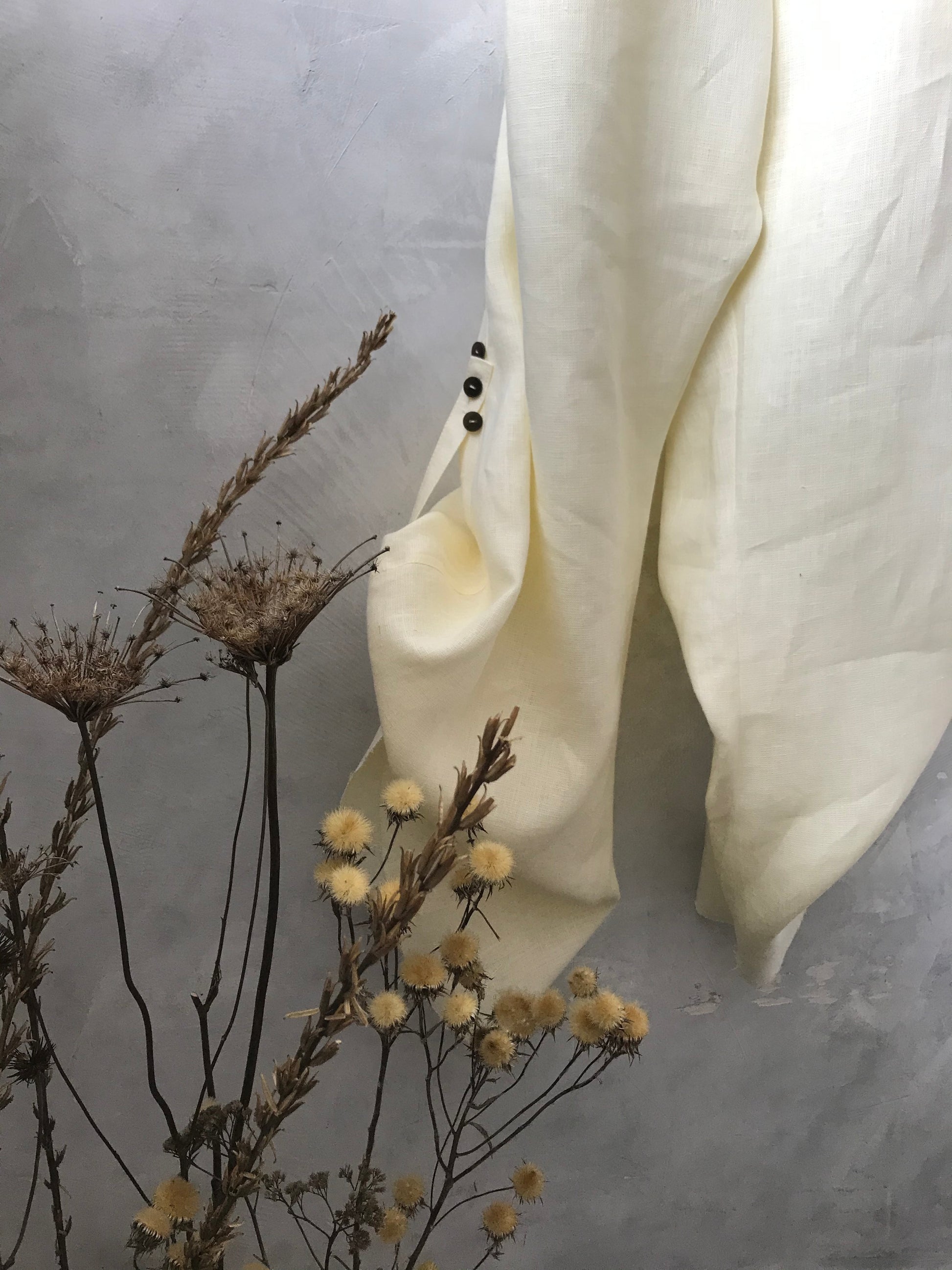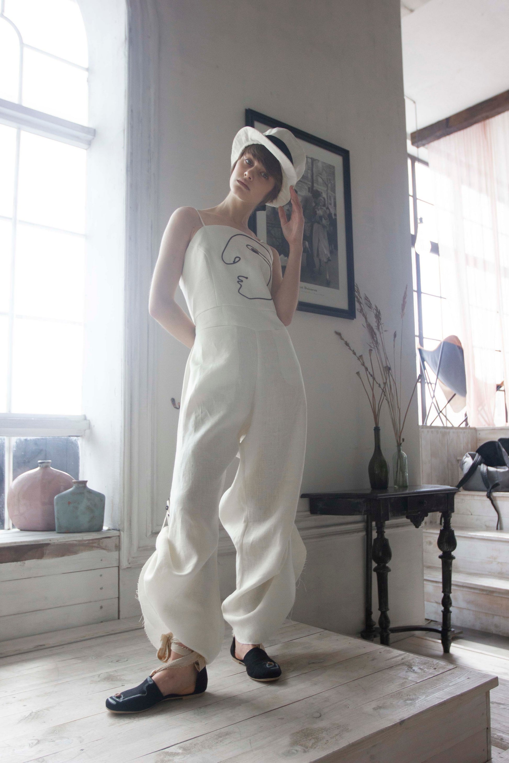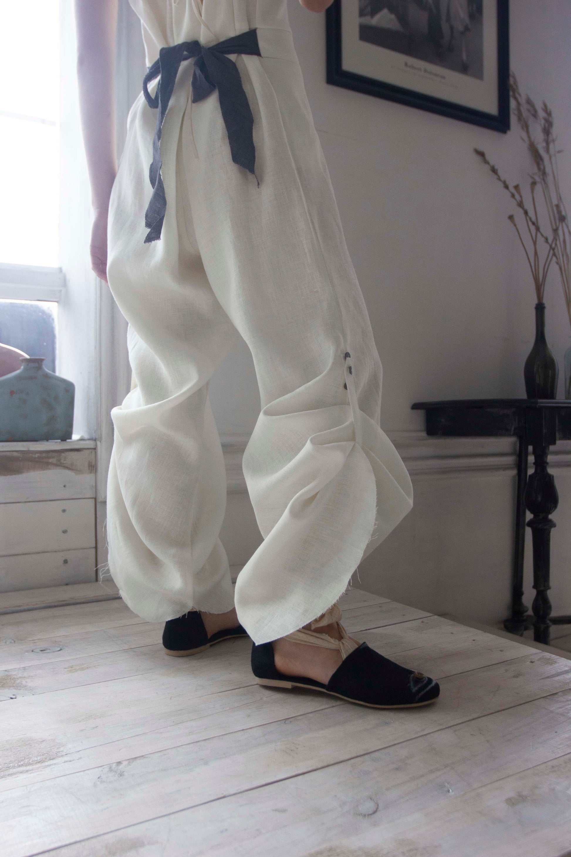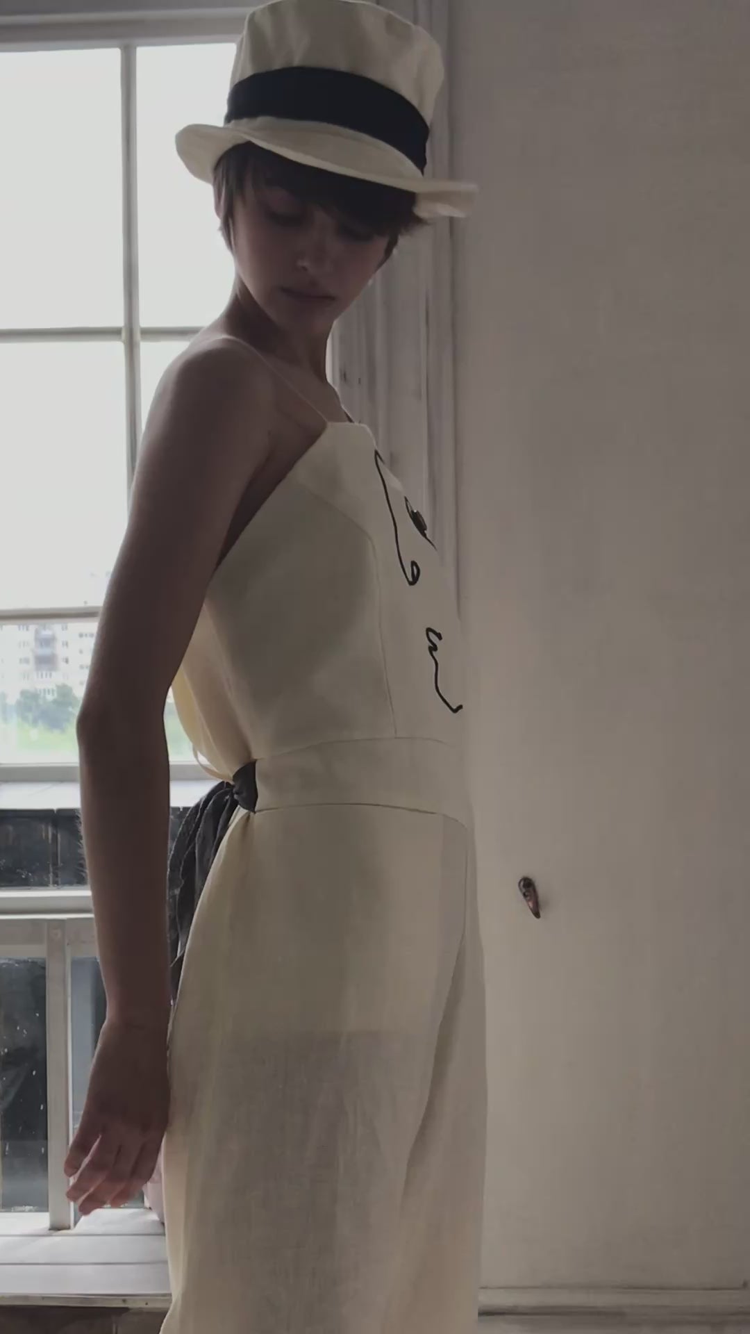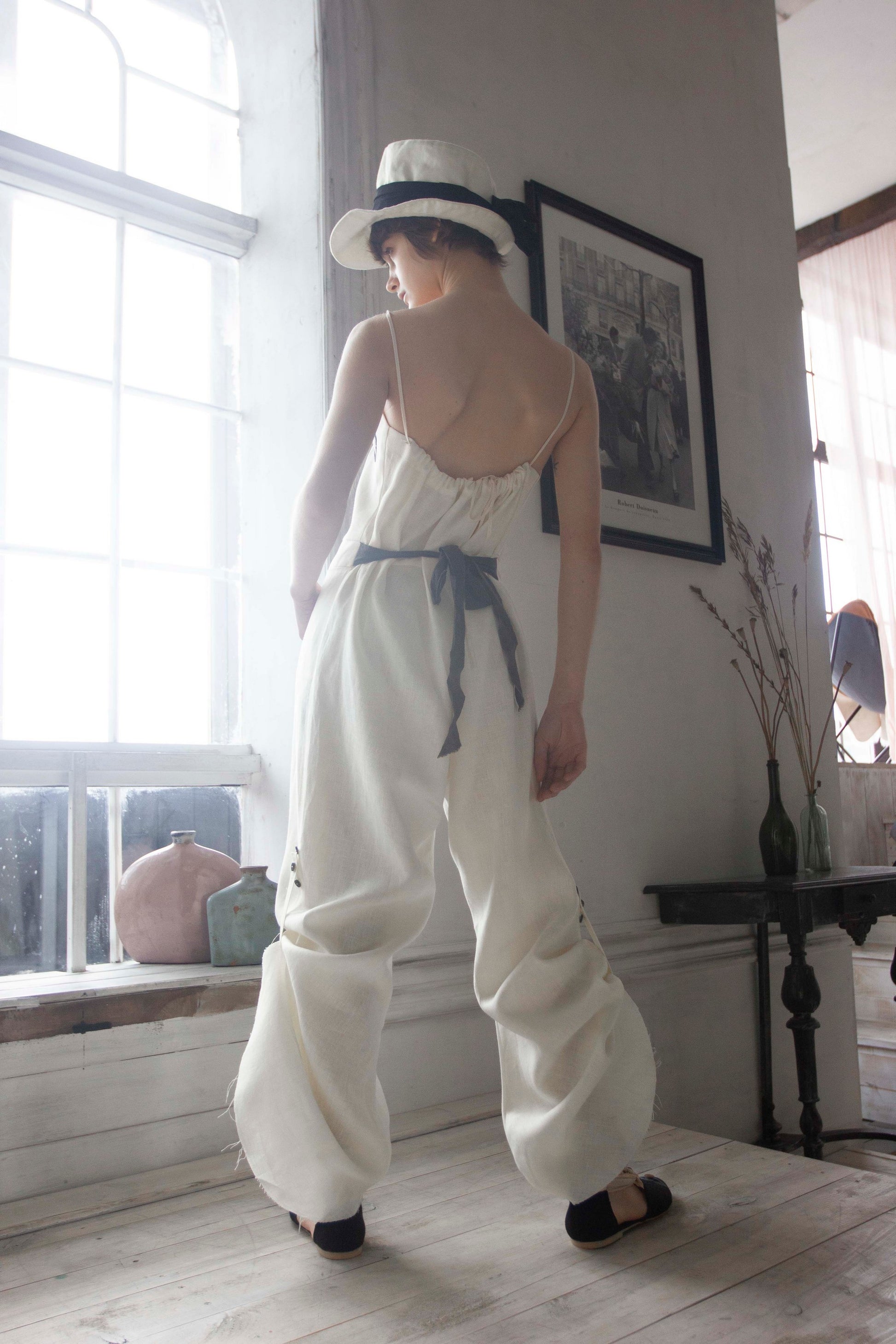 Mono de lino con pana negra. El largo del pantalón se regula con botones. Dos bolsillos grandes en la parte delantera.