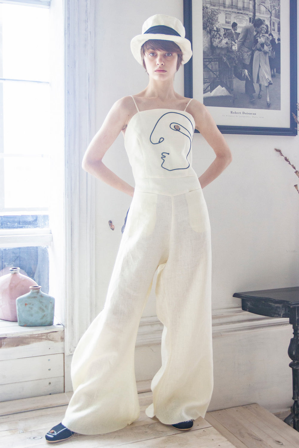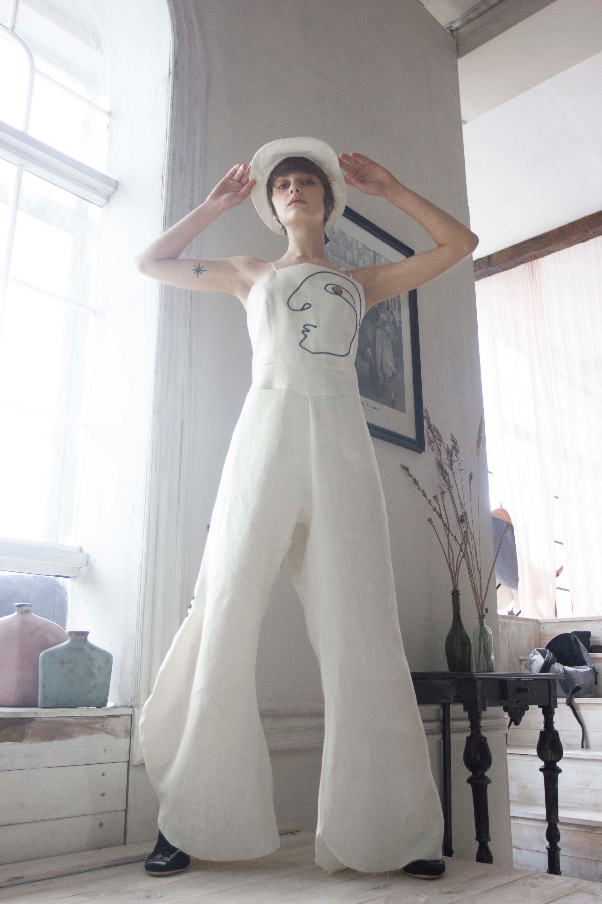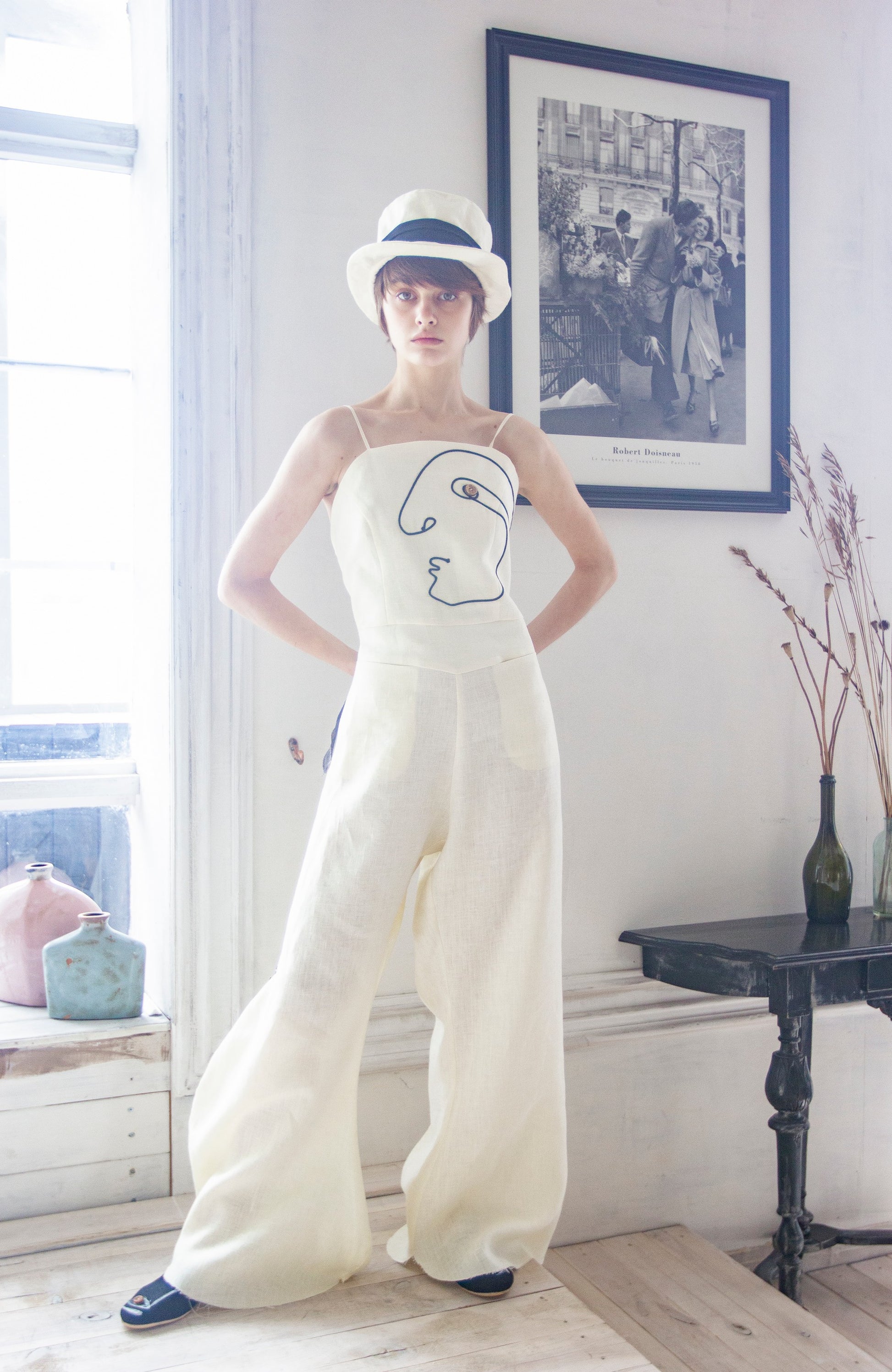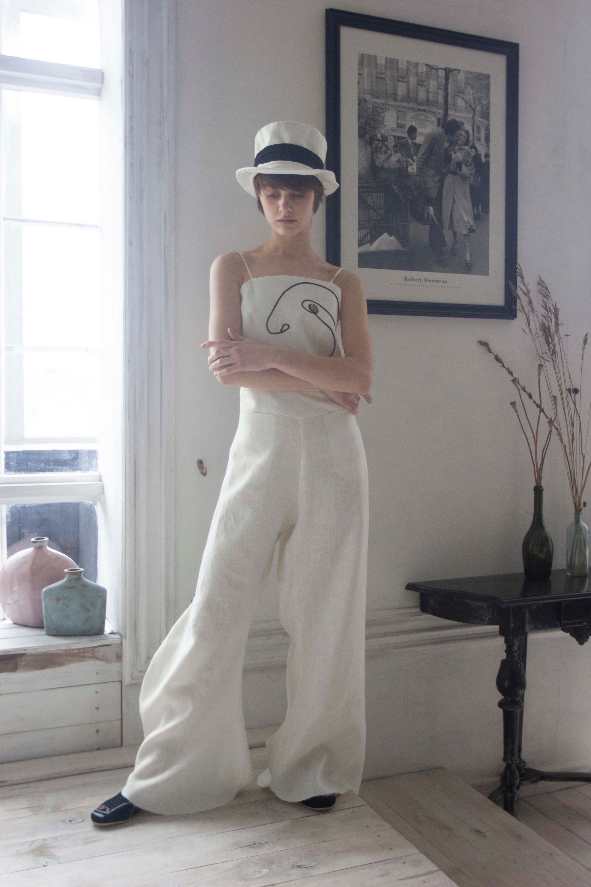 Mono de lino con pana negra. El largo del pantalón se regula con botones. Dos bolsillos grandes en la parte delantera.
