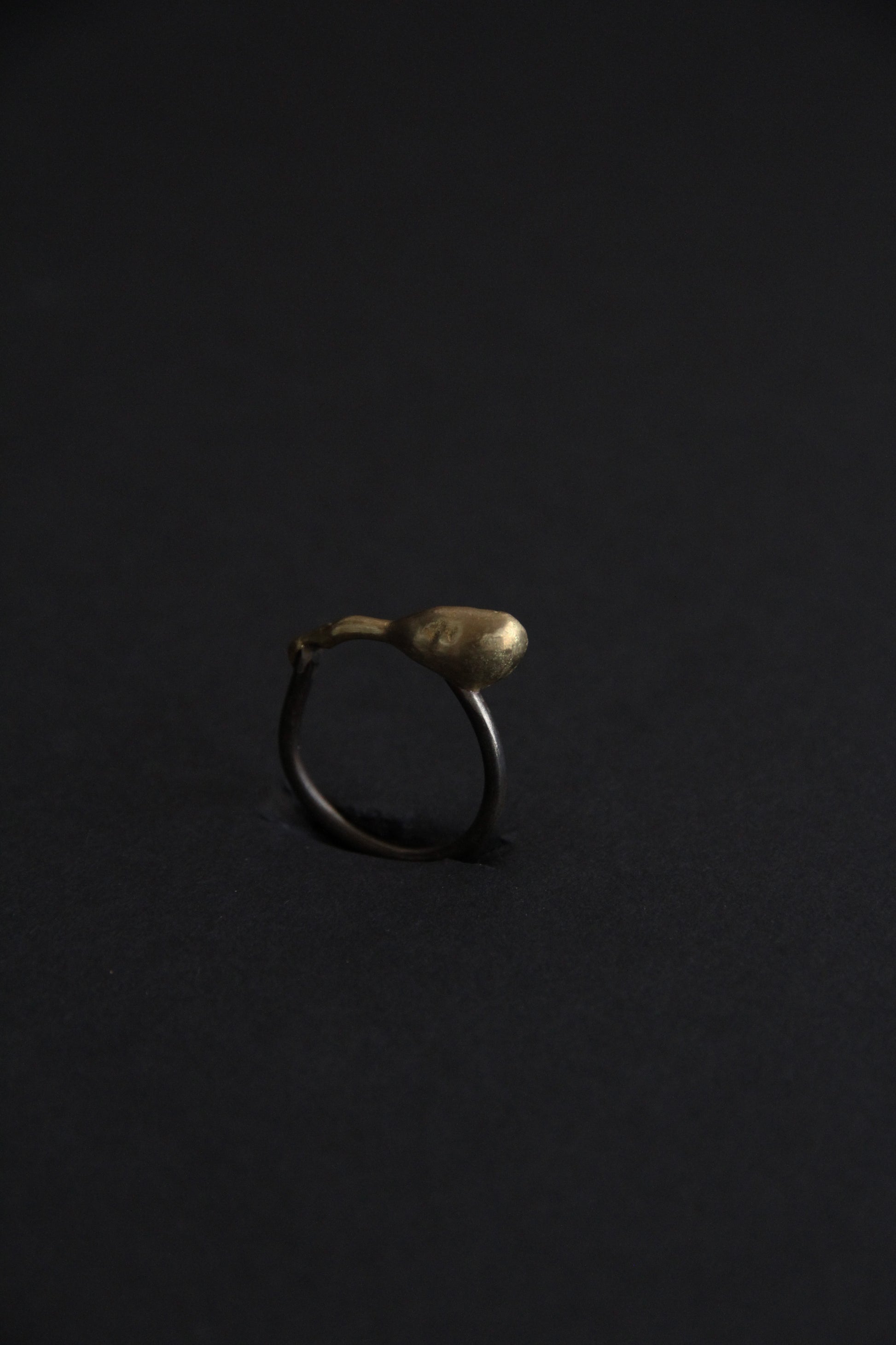 Un anillo minimalista de alpaca y plata, acentuado con una única gota escultural de latón, moldeada con textura fundida en bruto. Su asimetría y fluidez orgánica le otorgan una presencia discreta y artística: una sutil declaración wabi-sabi para el día a día.