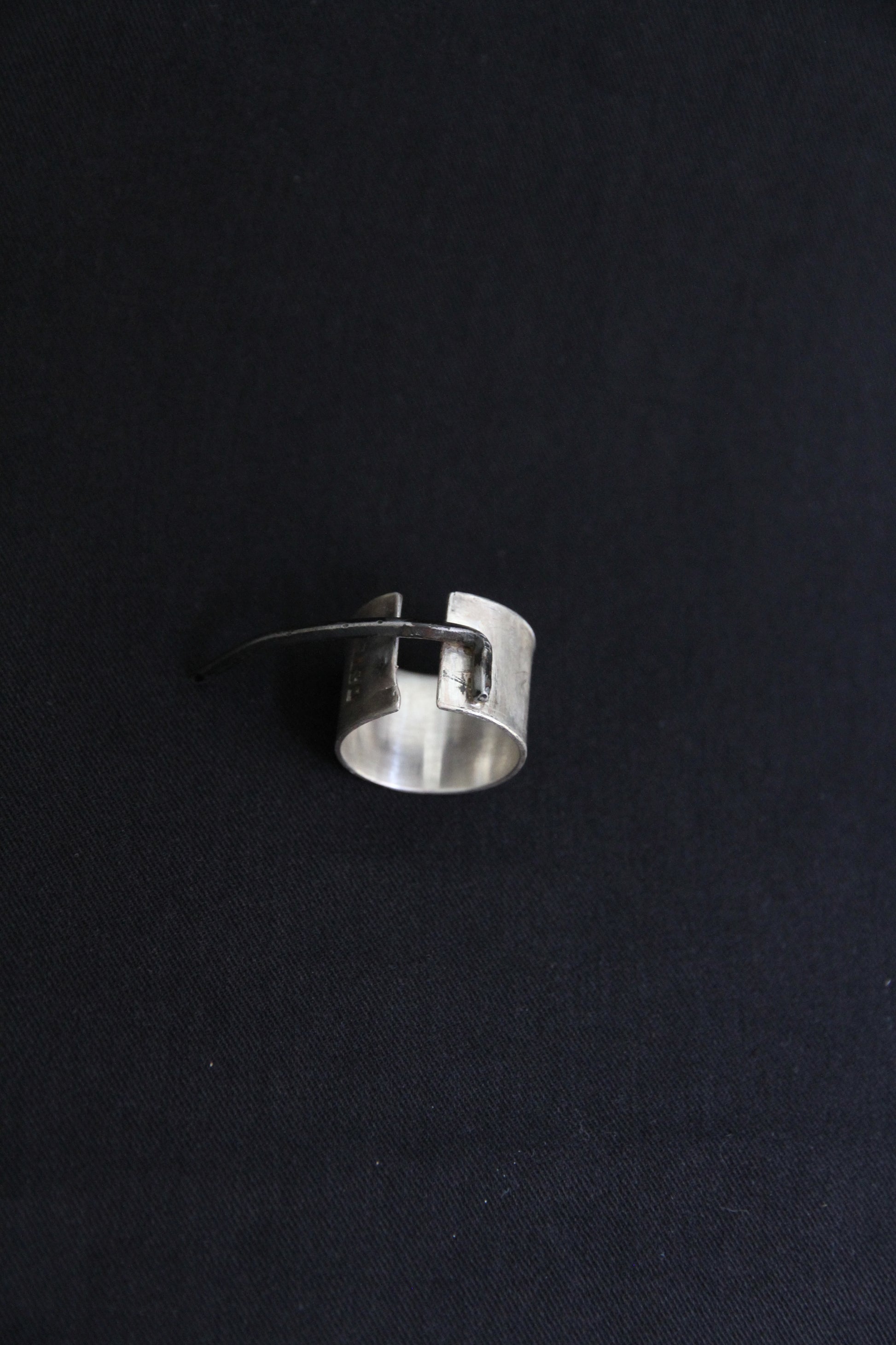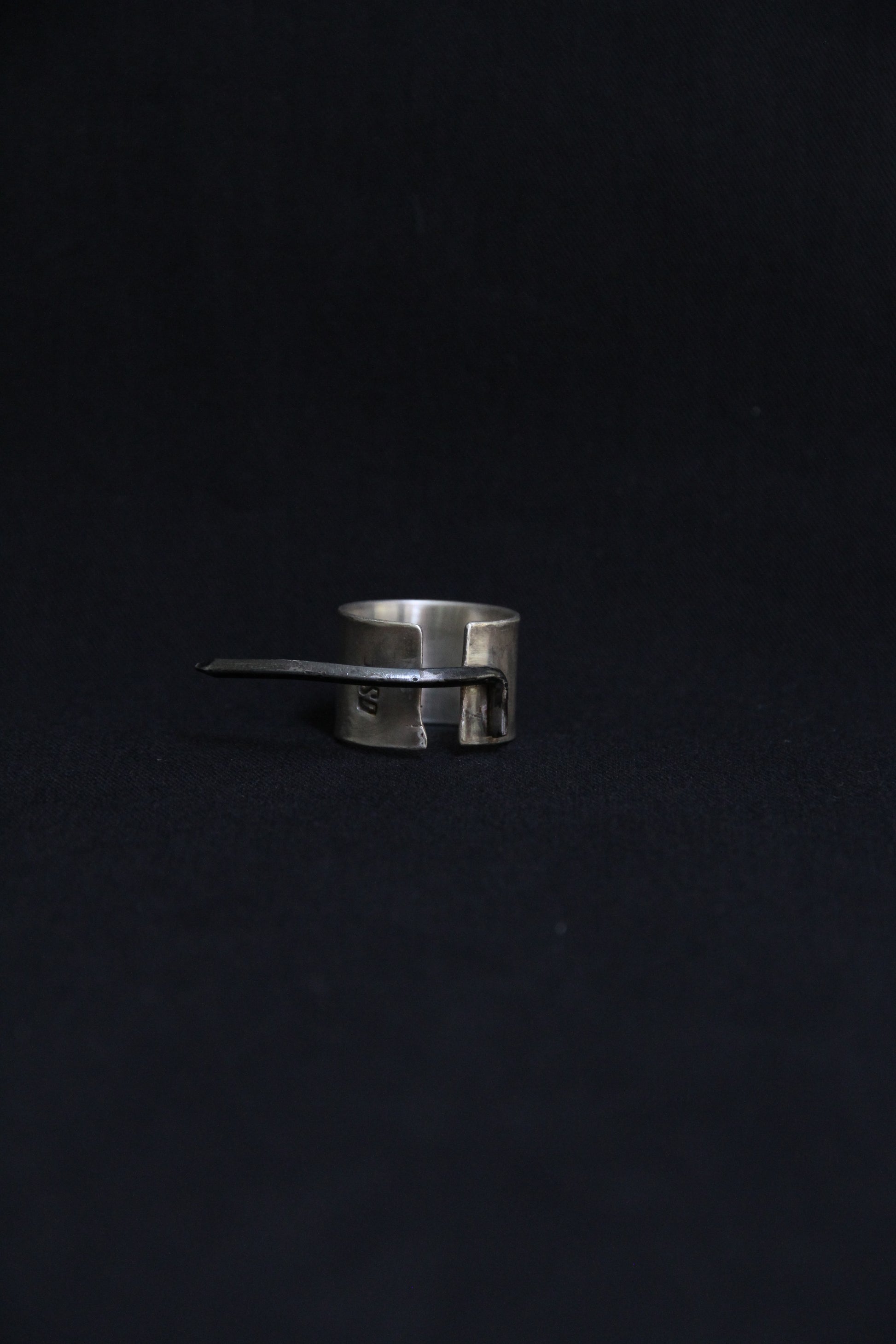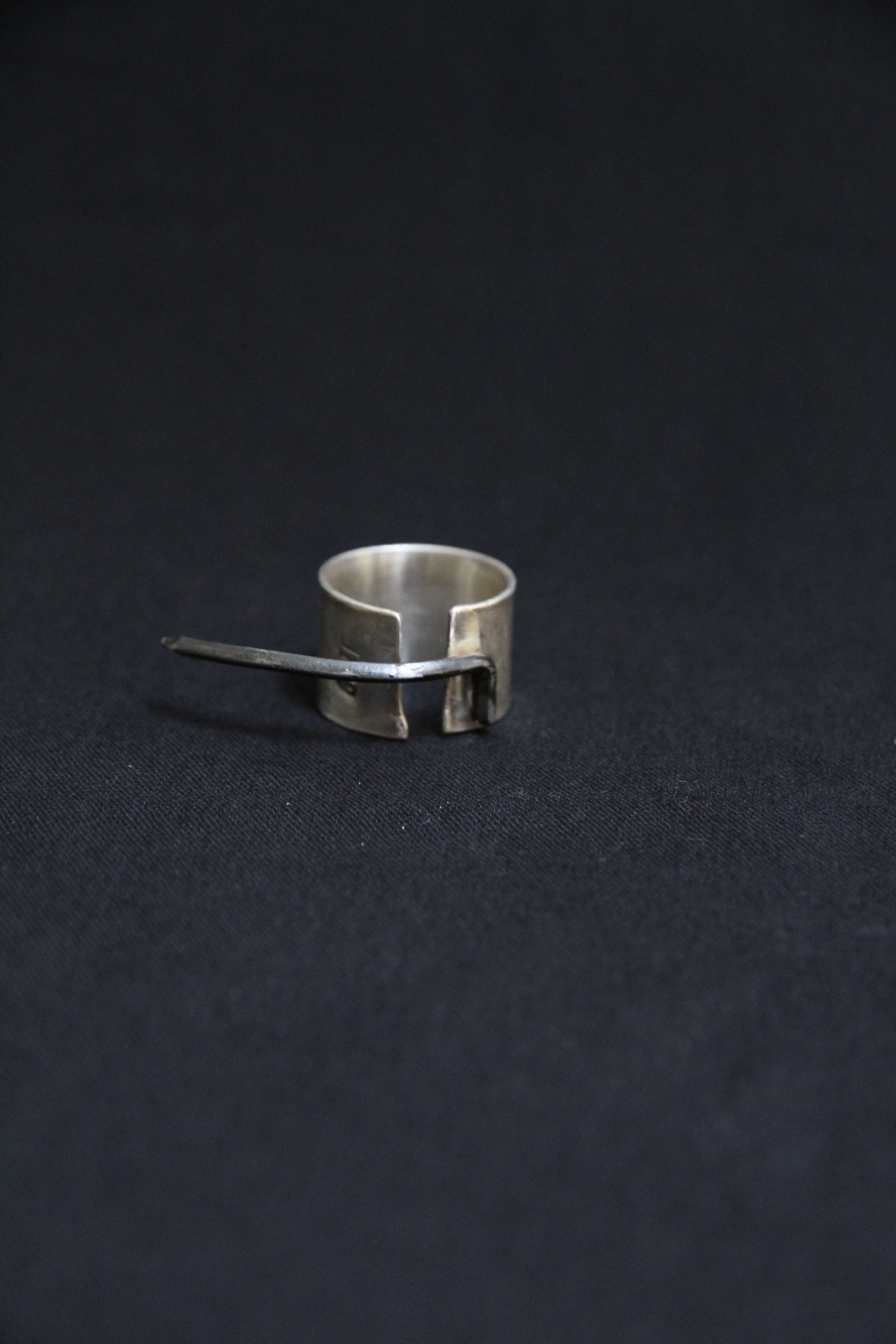 Esta pieza explora la frontera entre la construcción y la disrupción. Una banda de plata maciza está atravesada nítidamente por una barra de acero: cruda, lineal y sin complejos. El contraste de materiales y geometría evoca una sensación de tensión industrial, como un mecanismo expuesto o una cicatriz transformada en estructura.