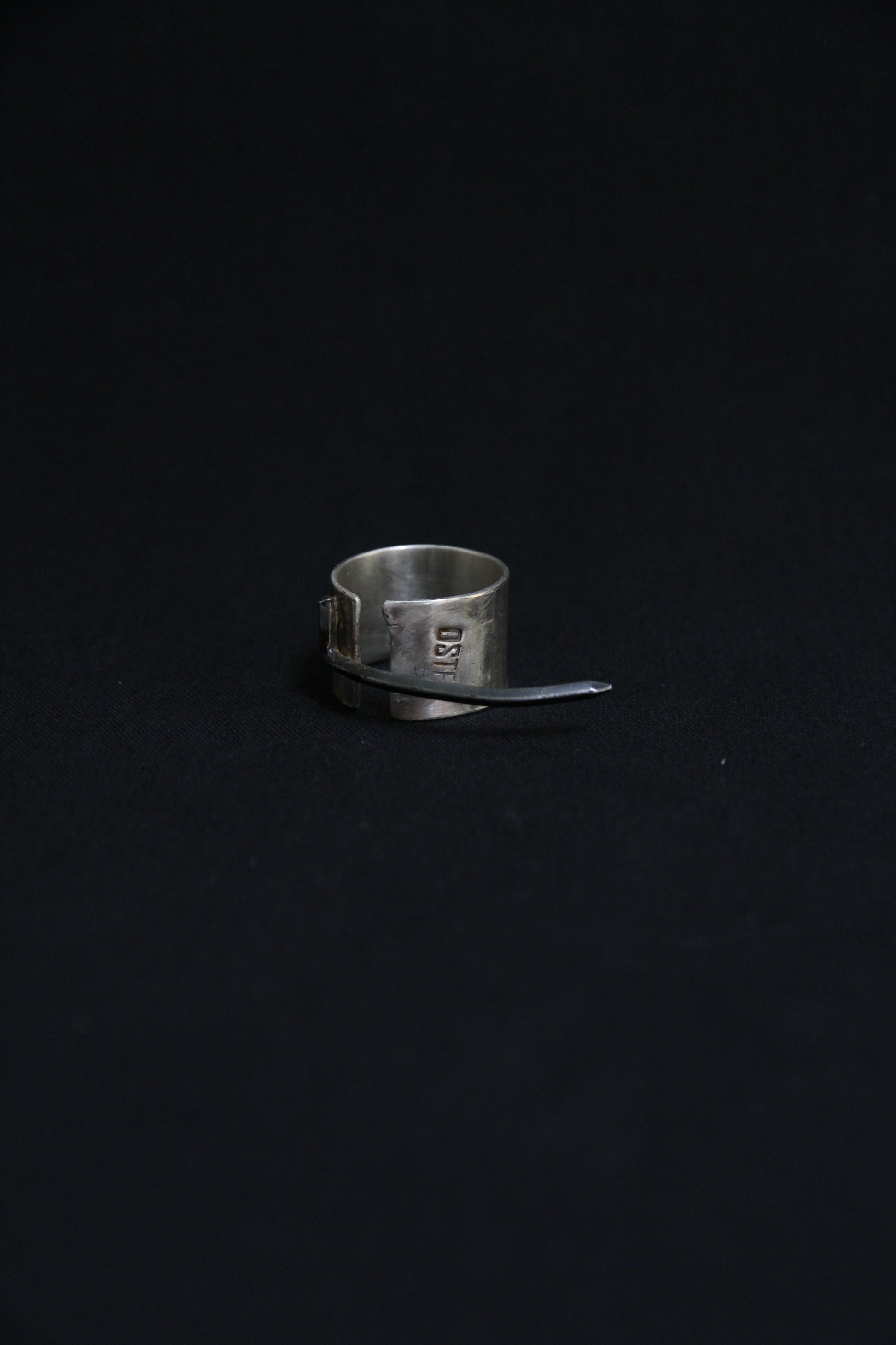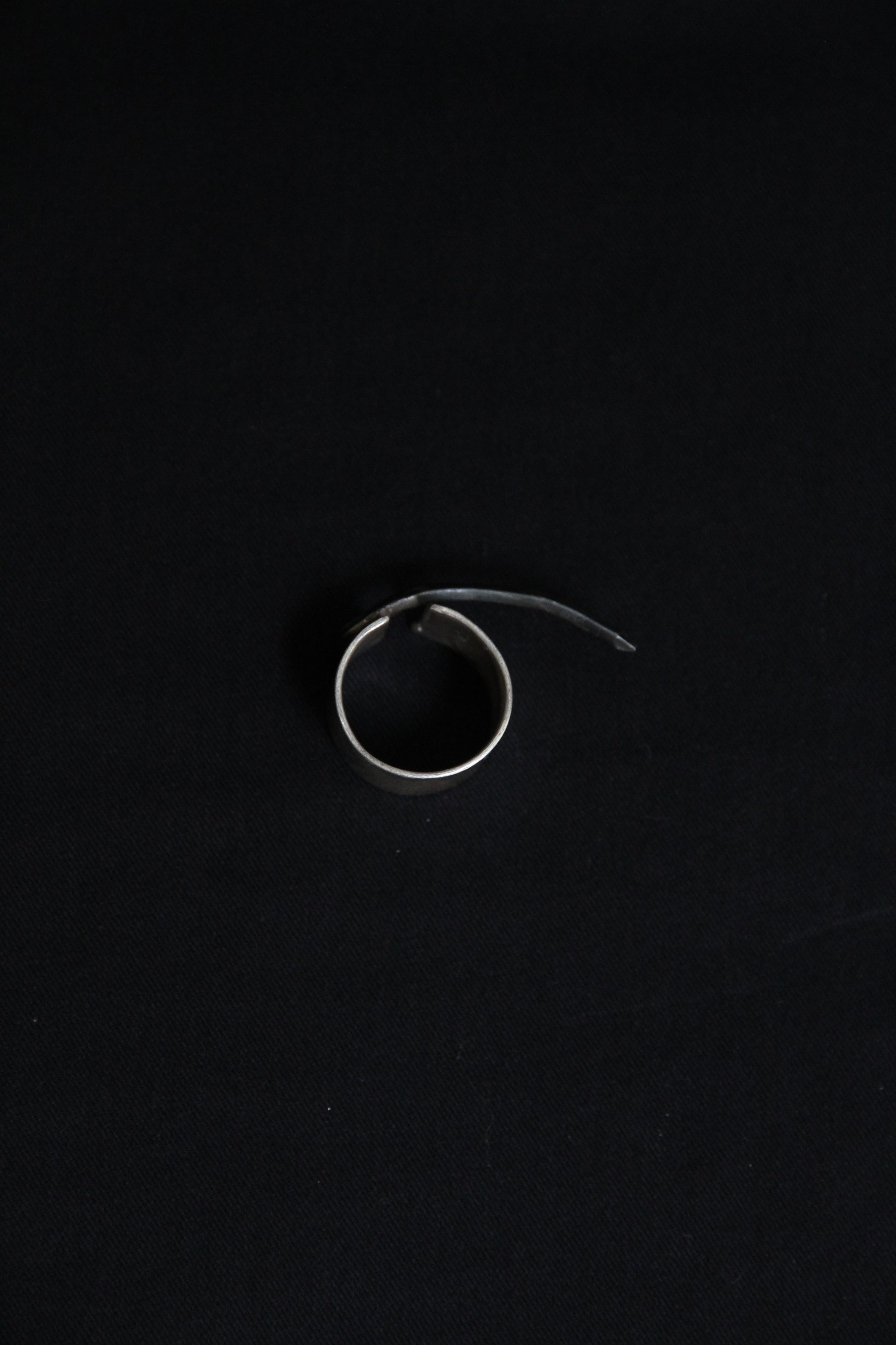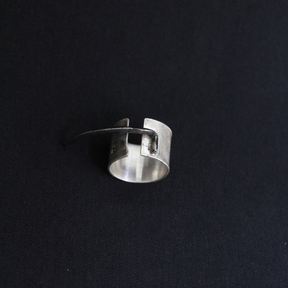 Esta pieza explora la frontera entre la construcción y la disrupción. Una banda de plata maciza está atravesada nítidamente por una barra de acero: cruda, lineal y sin complejos. El contraste de materiales y geometría evoca una sensación de tensión industrial, como un mecanismo expuesto o una cicatriz transformada en estructura.