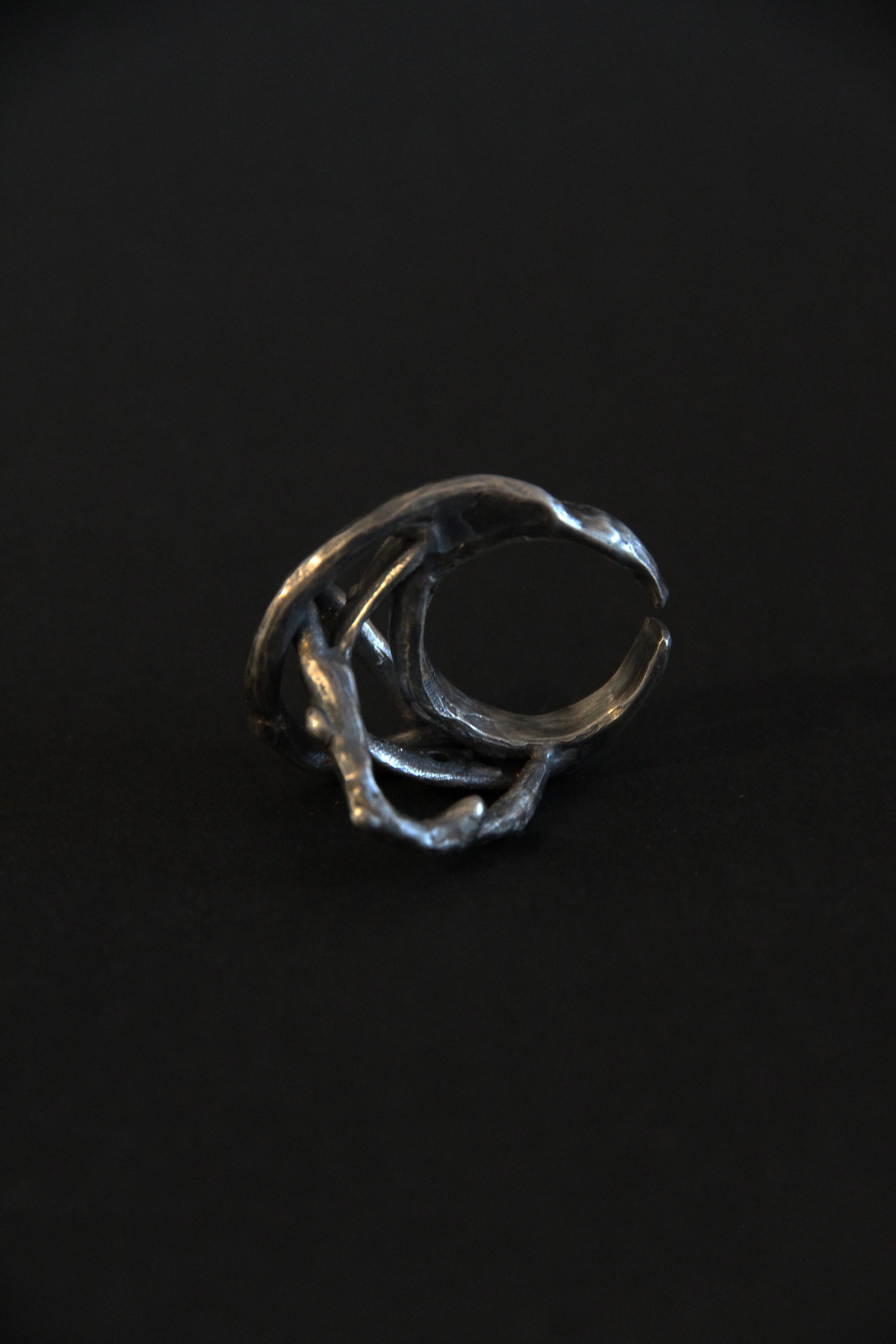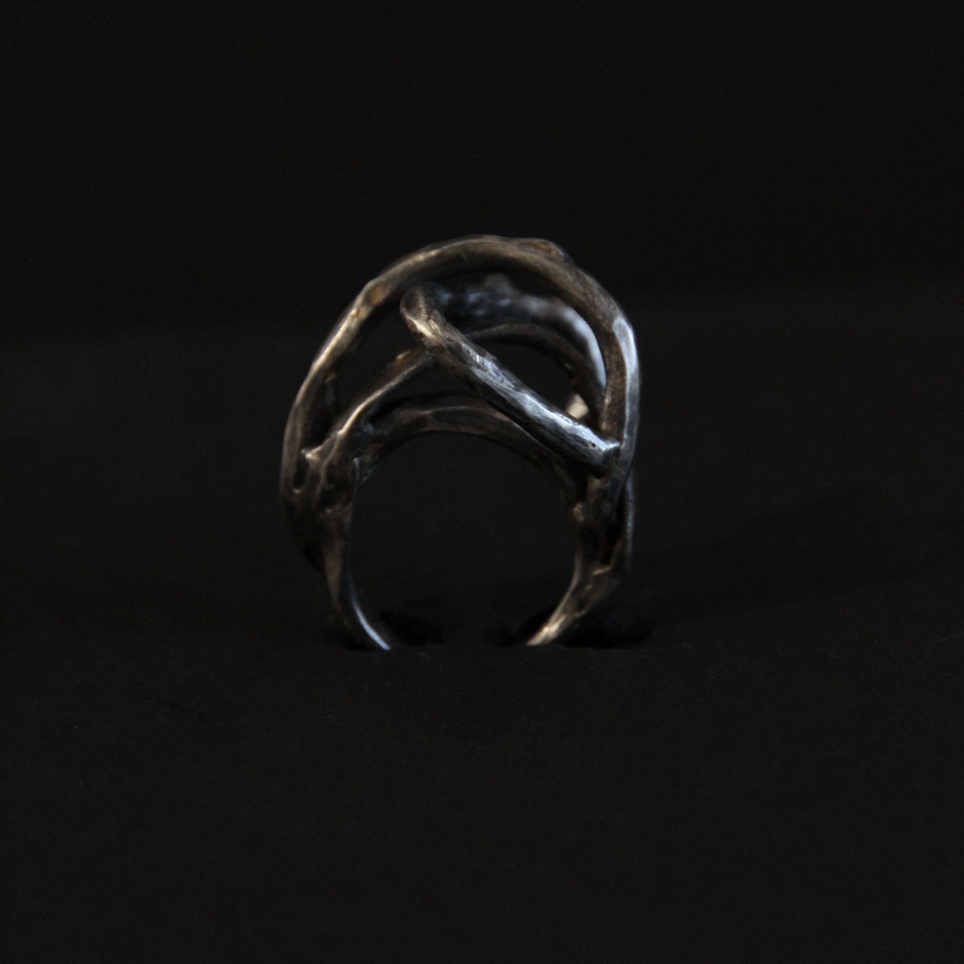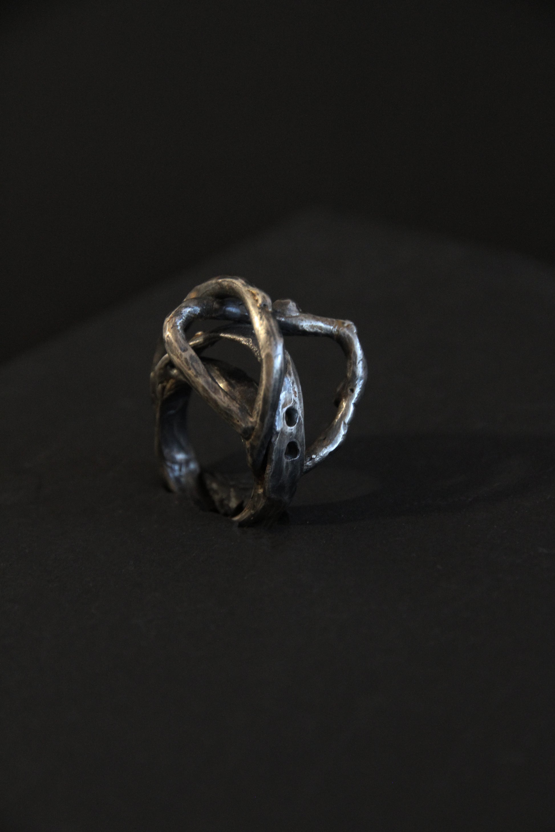 Anillo de plata oxidada compuesto por bandas fundidas entrecruzadas.