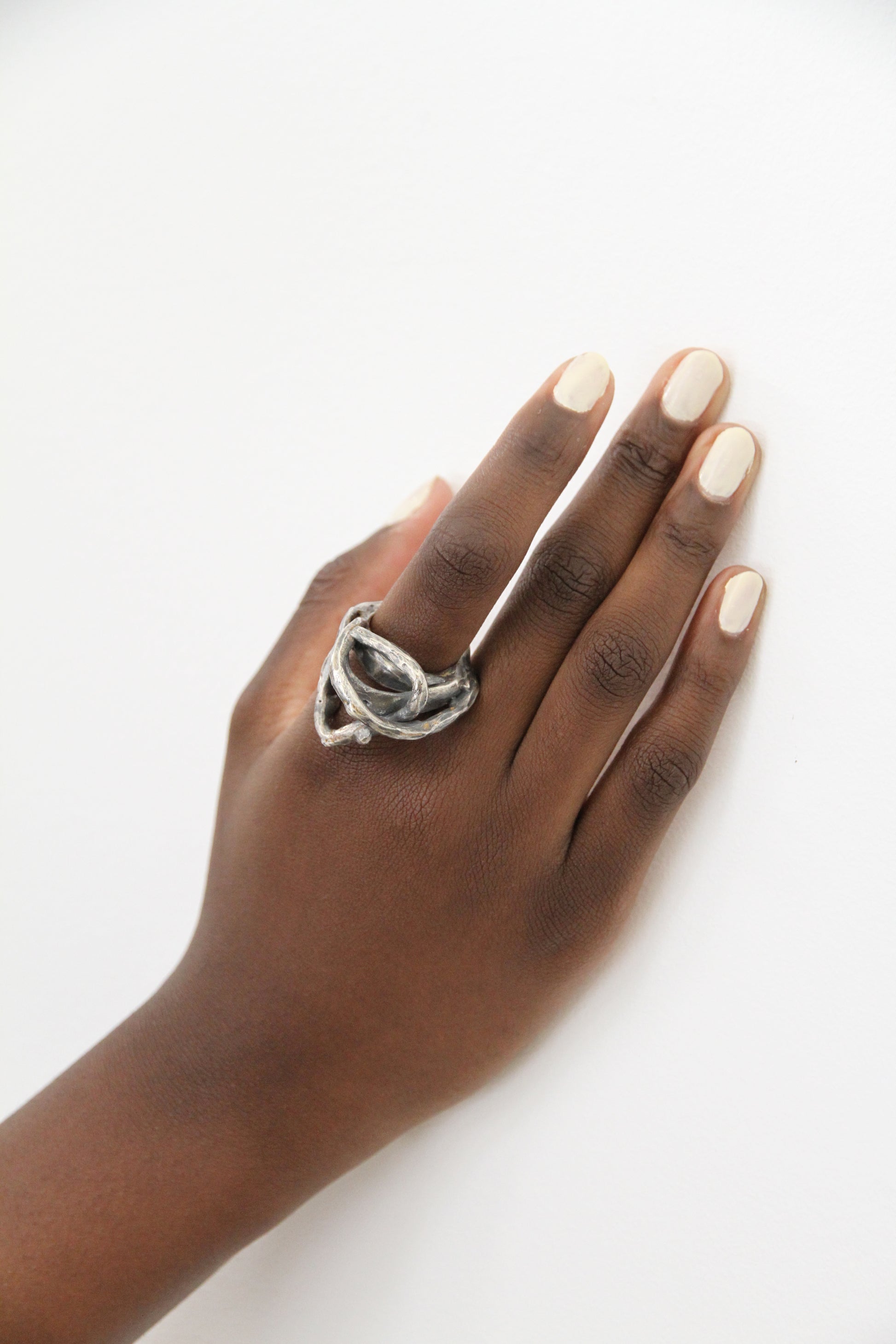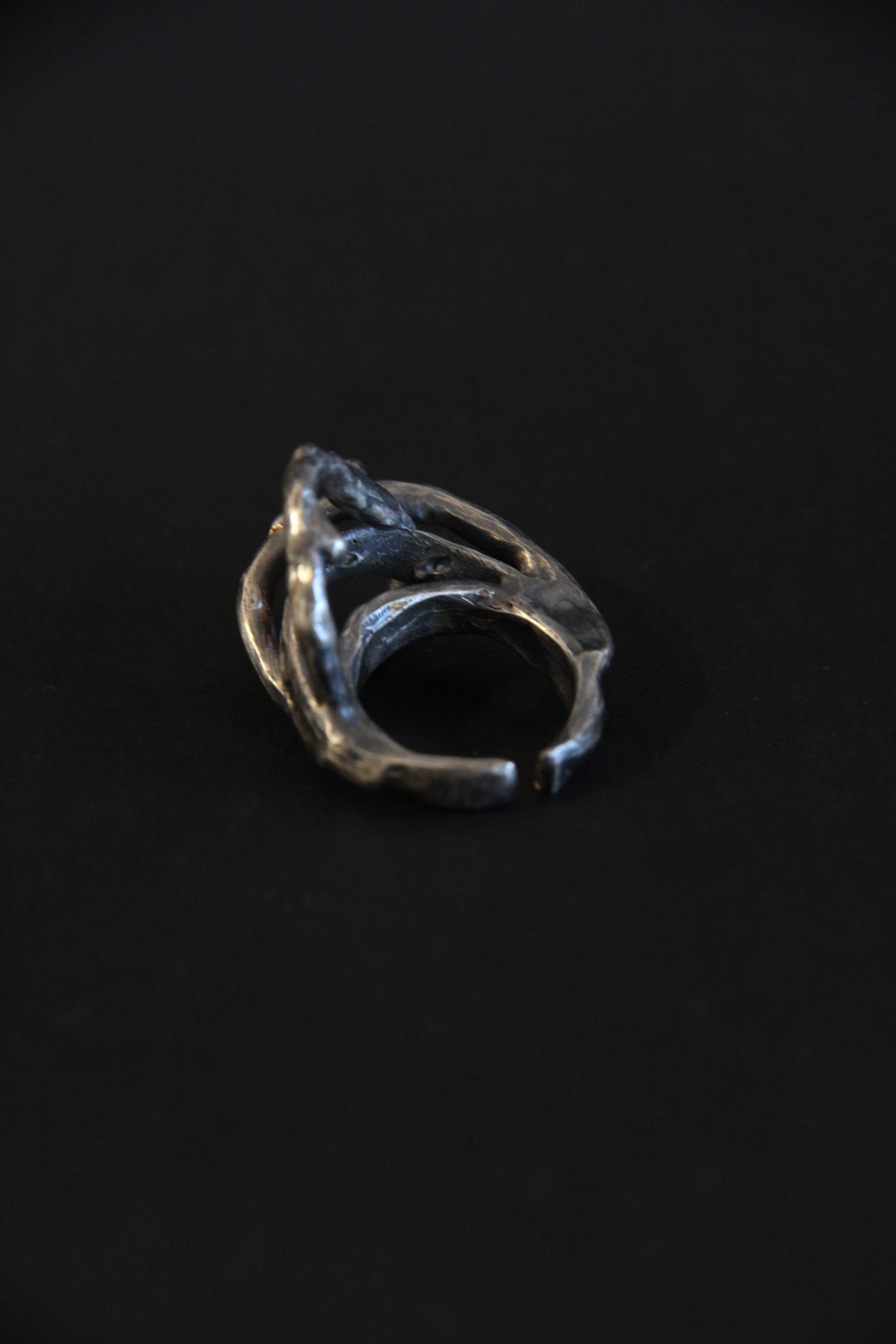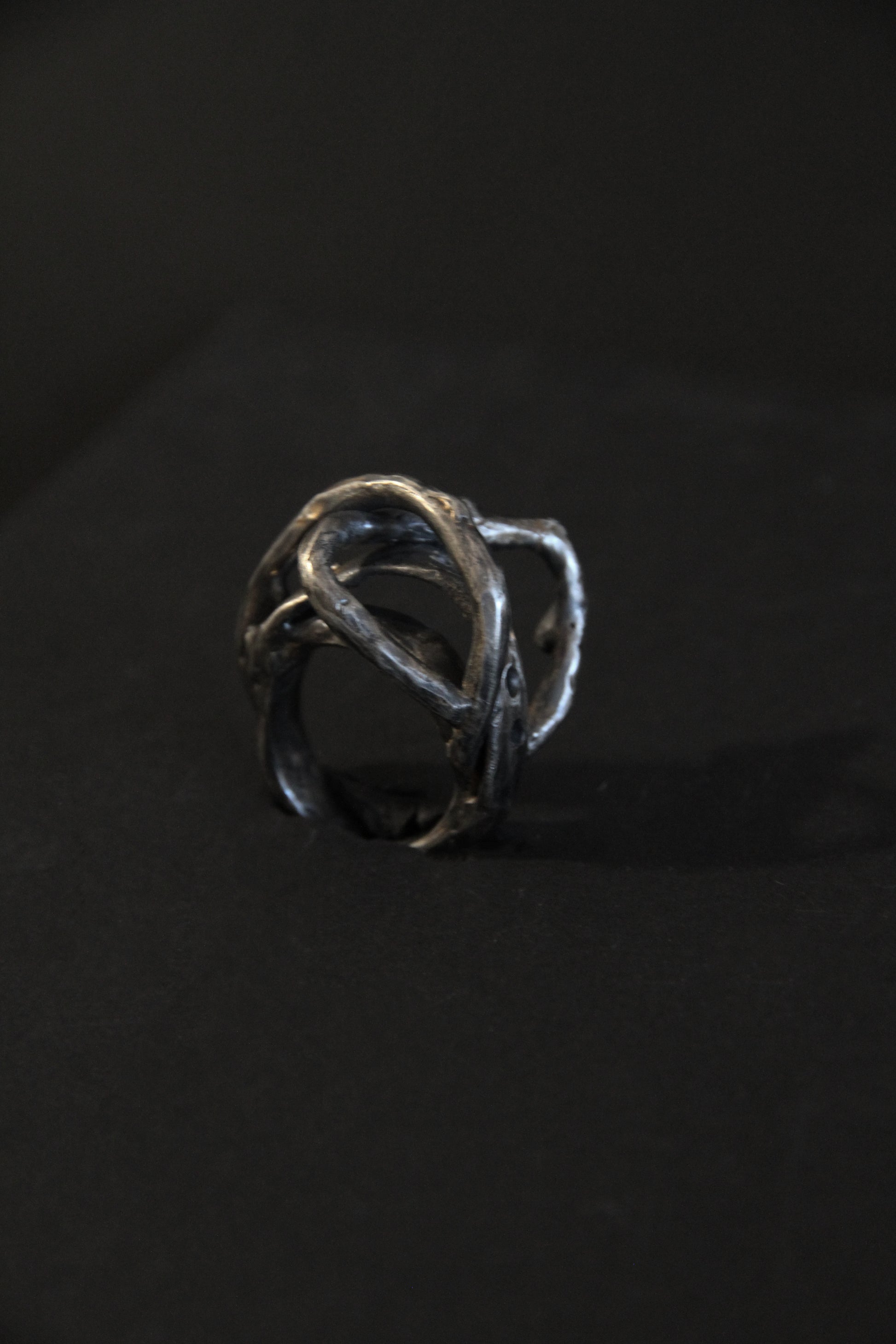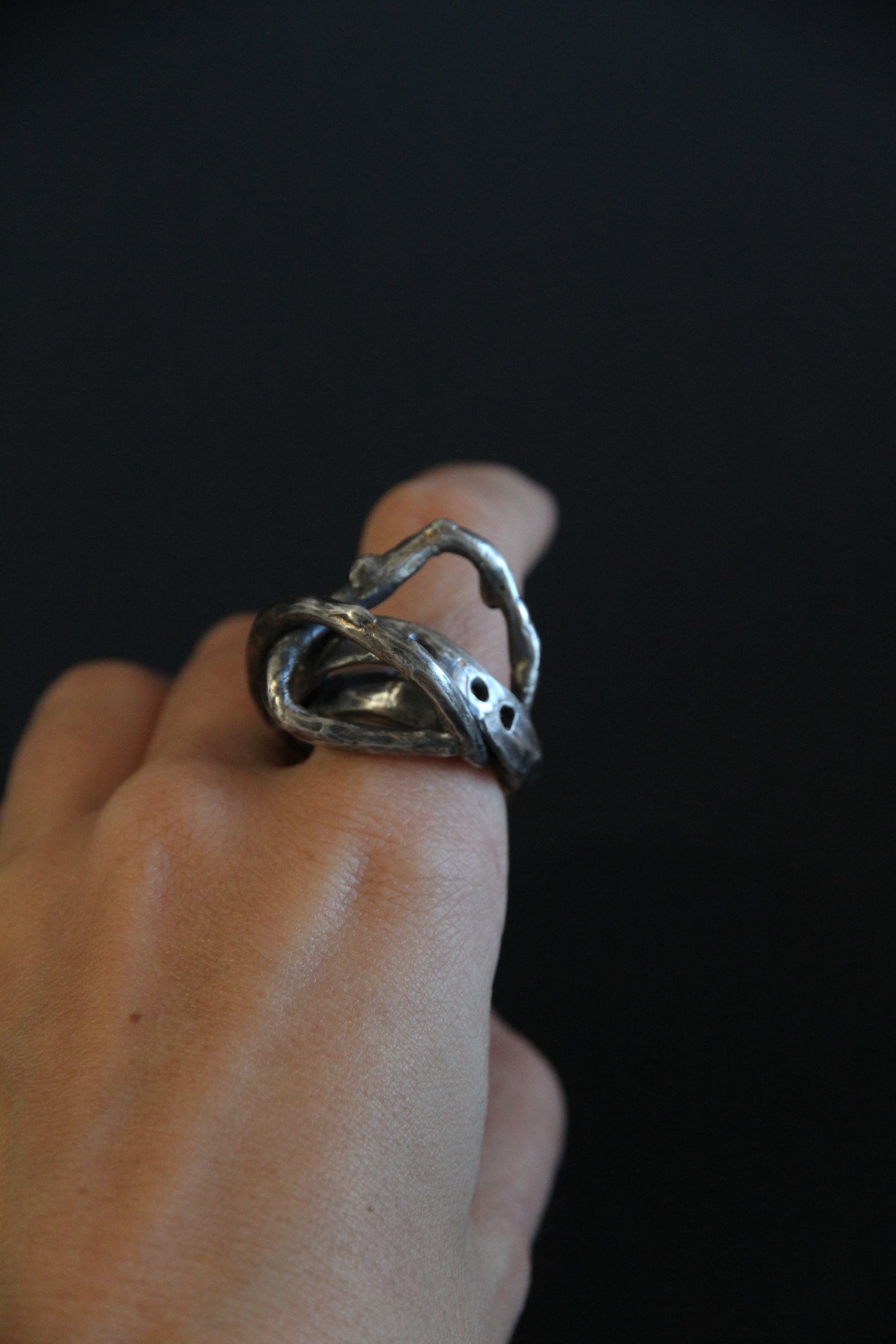 Anillo de plata oxidada compuesto por bandas fundidas entrecruzadas.