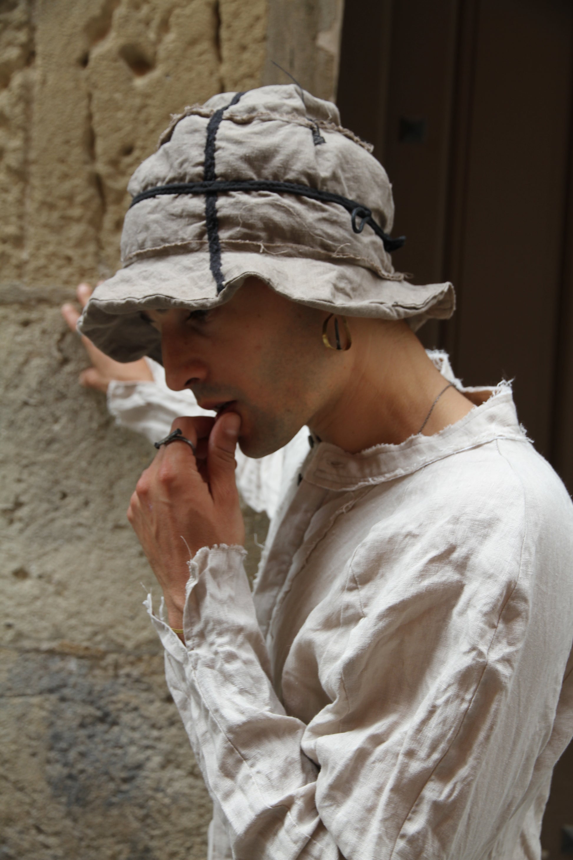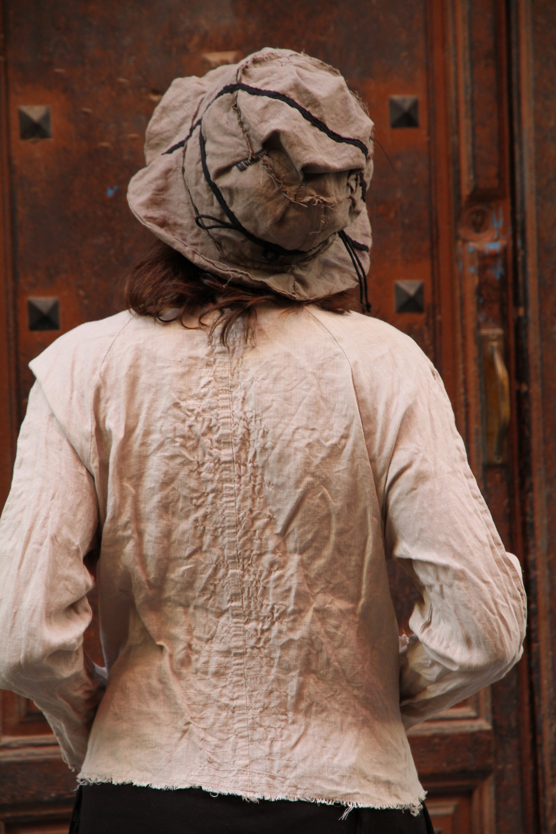 Camisa de lino con dos bolsillos. Presenta detalles de costuras decorativas. Disponible en dos tallas: M y L.