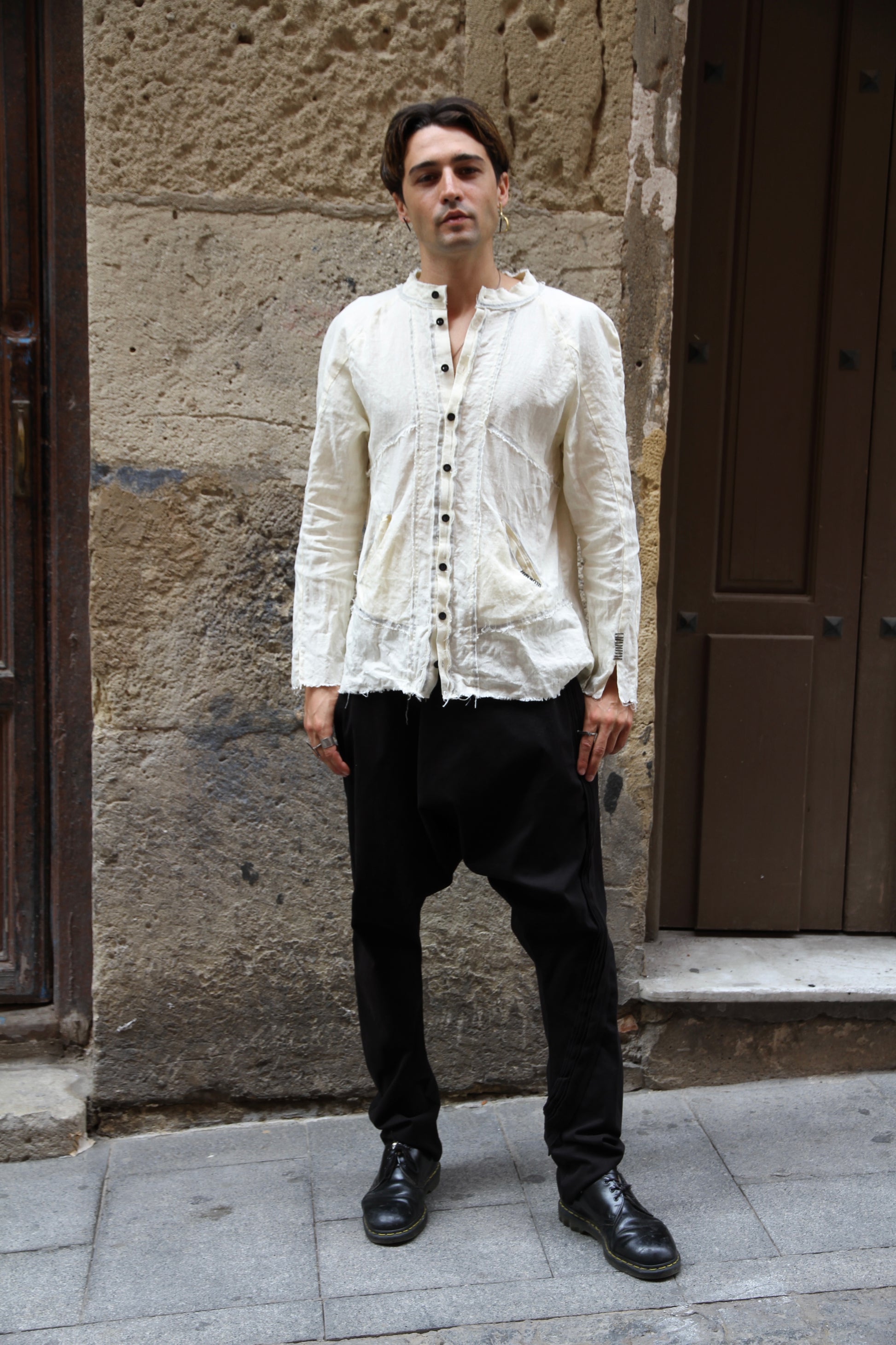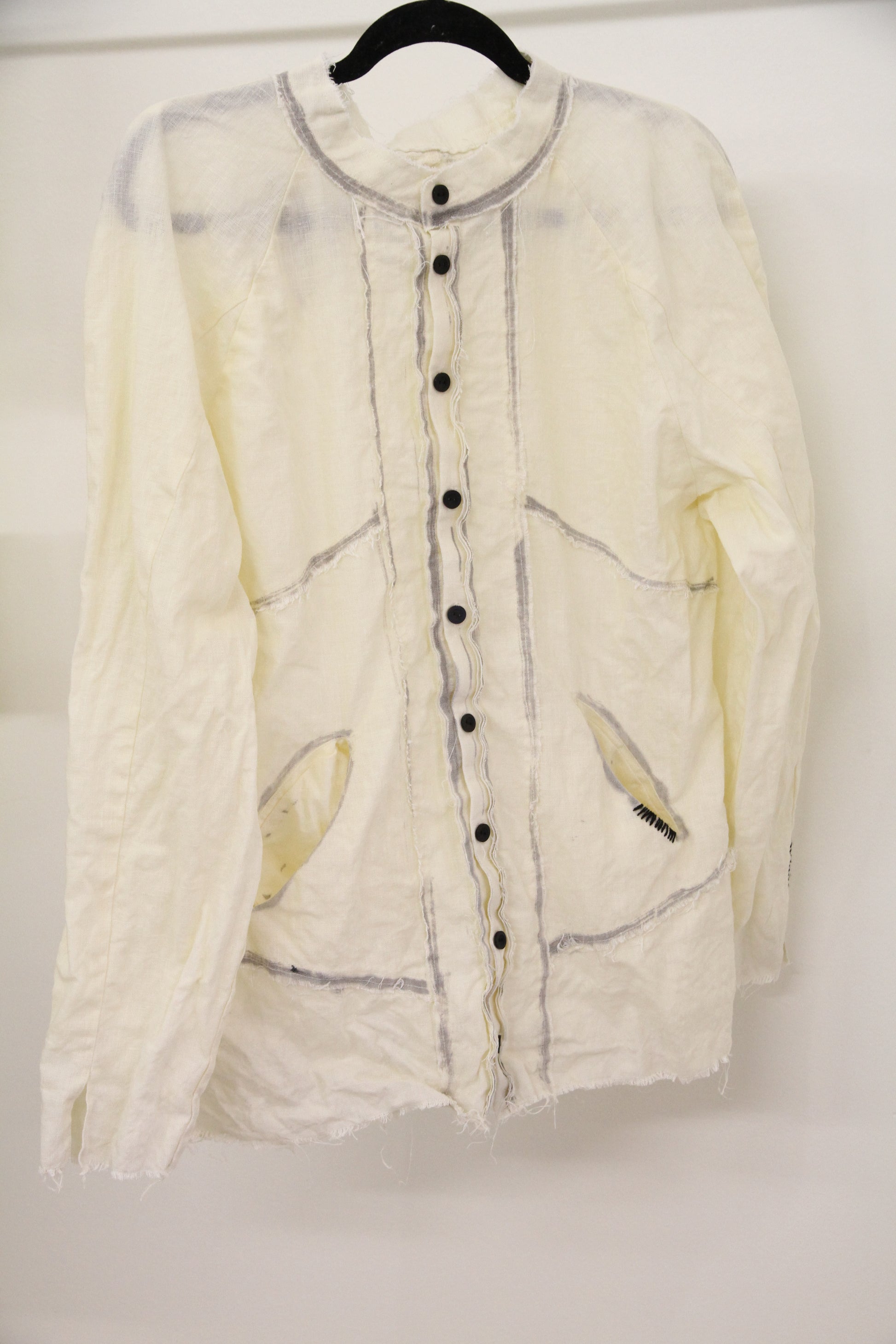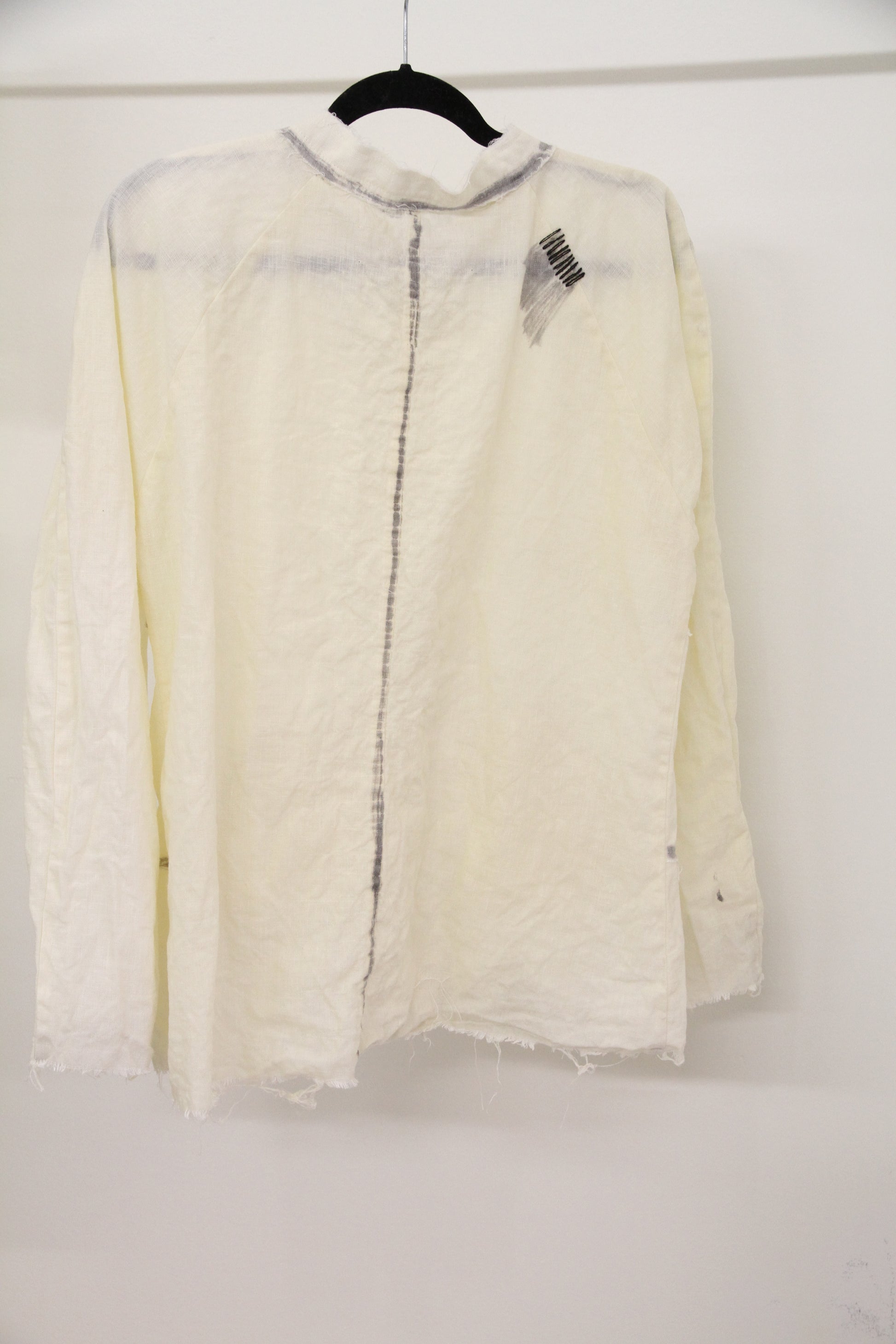 Camisa de lino con dos bolsillos. Presenta detalles de puntadas decorativas y un cordón negro.