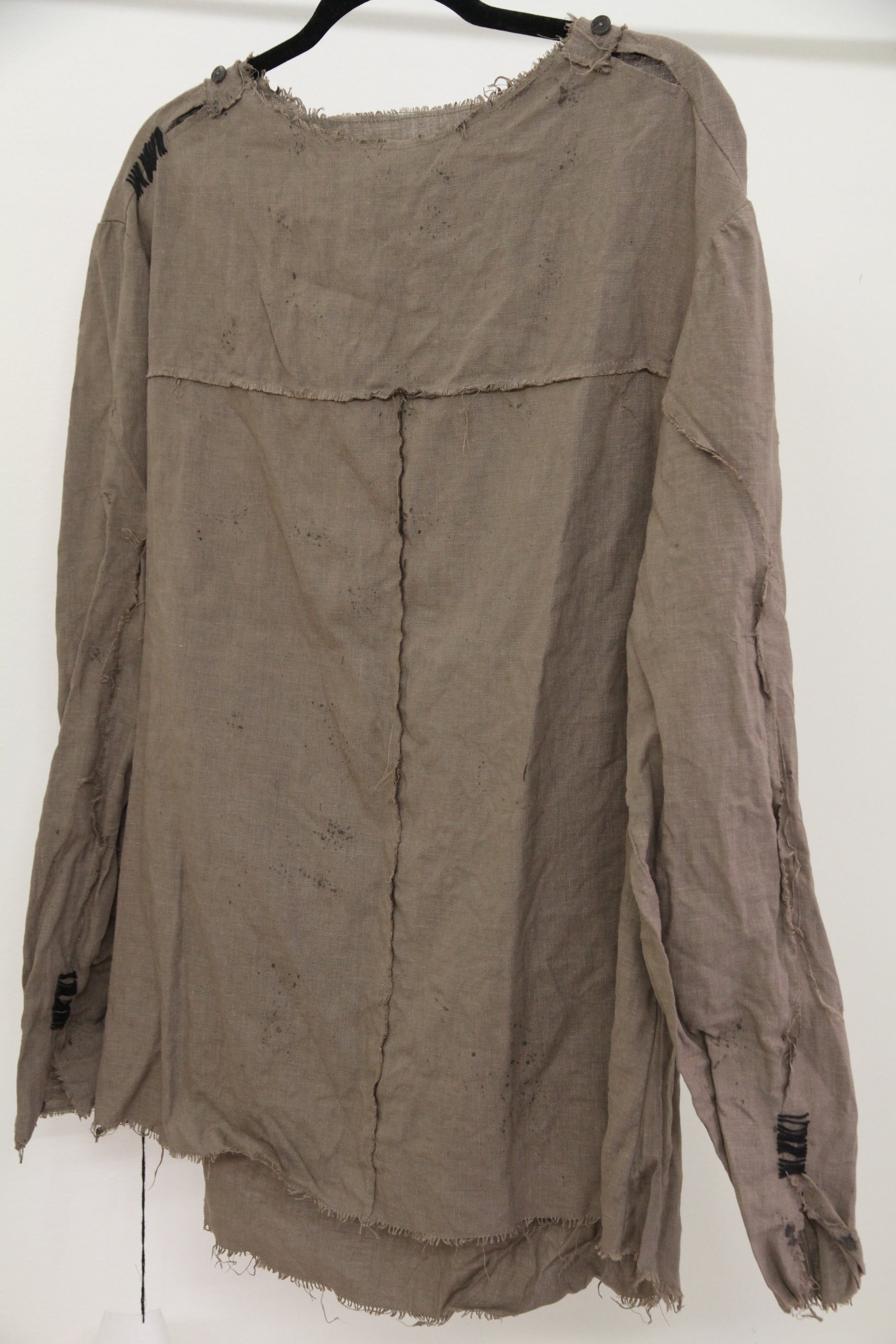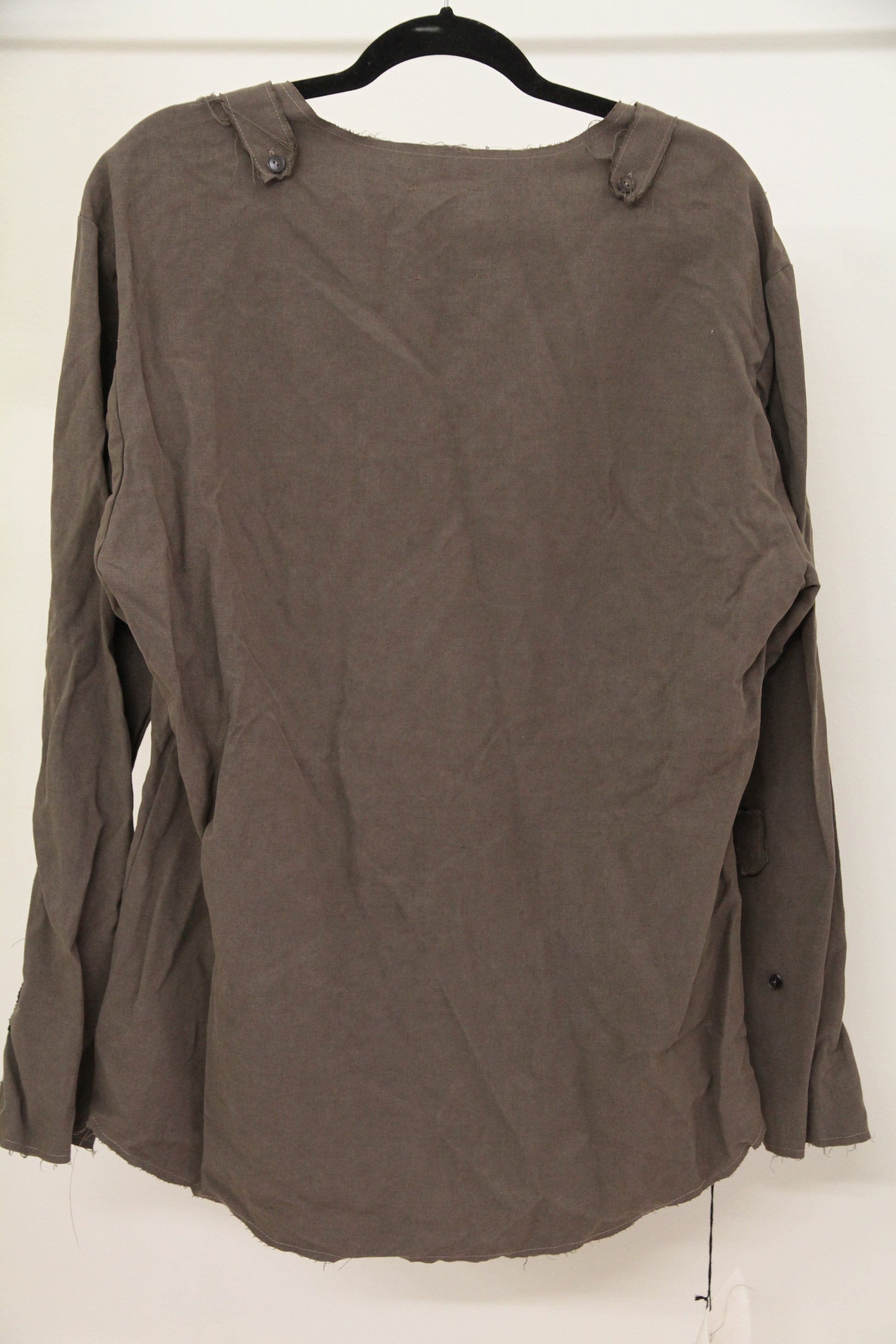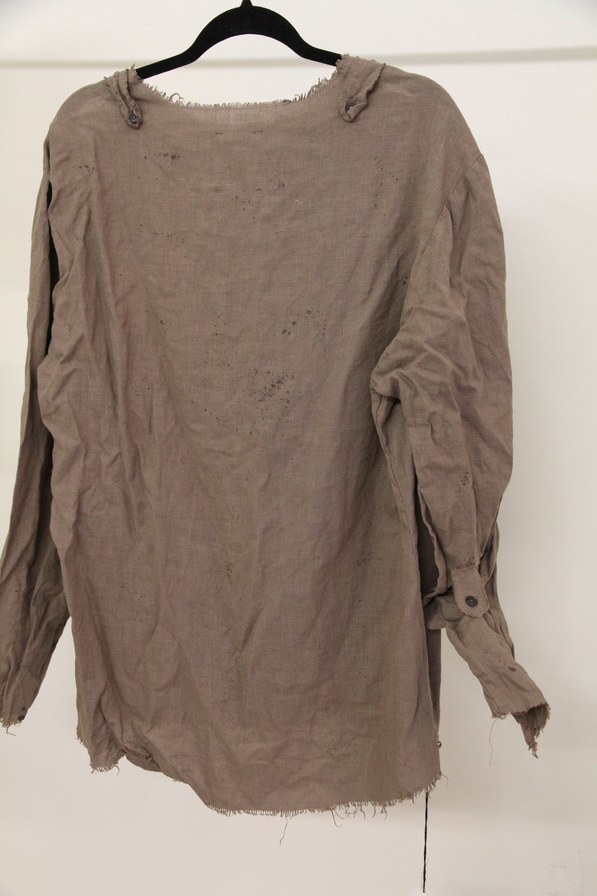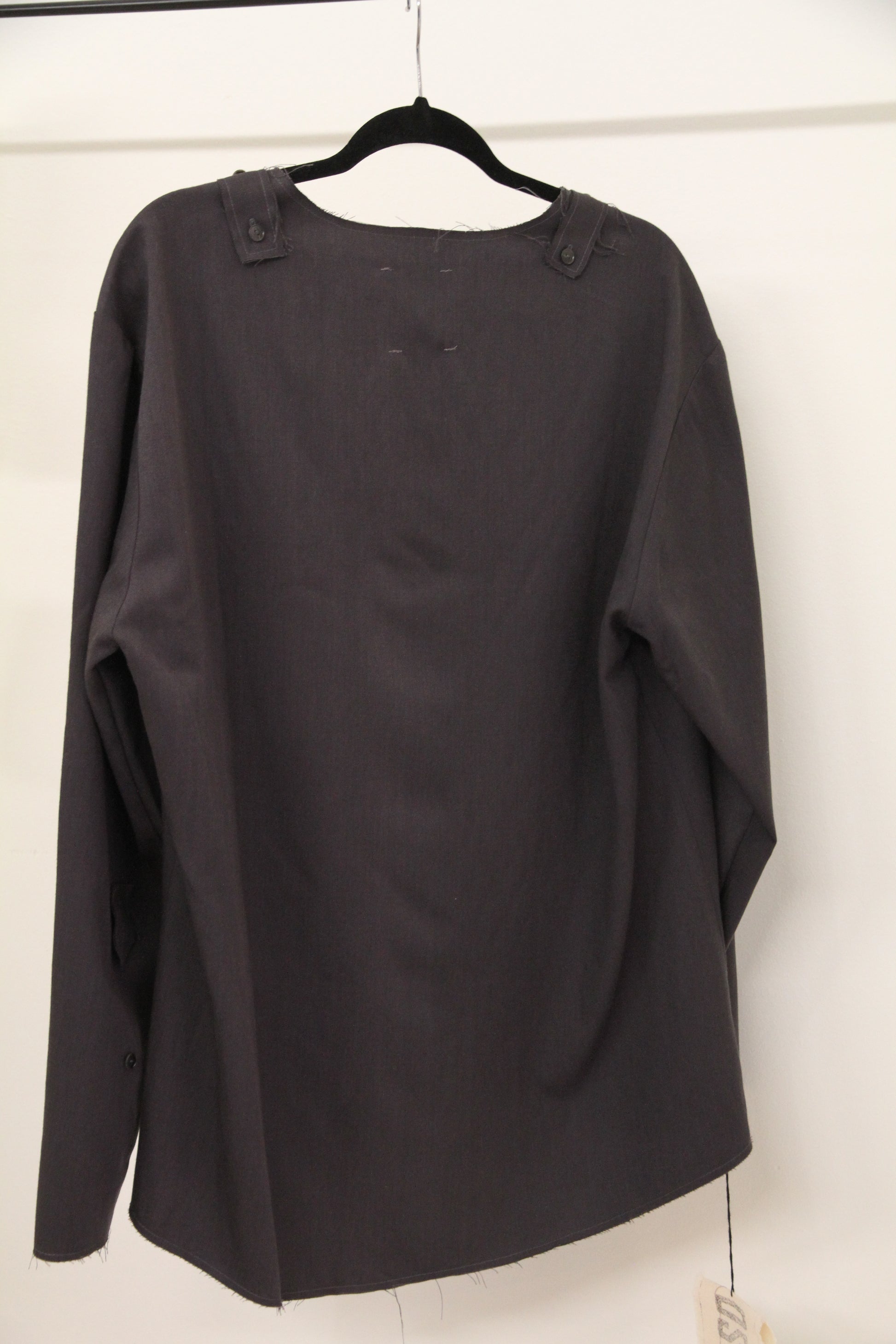 Camisa larga y holgada. Unisex. Cuello abotonado y mangas con costuras negras.