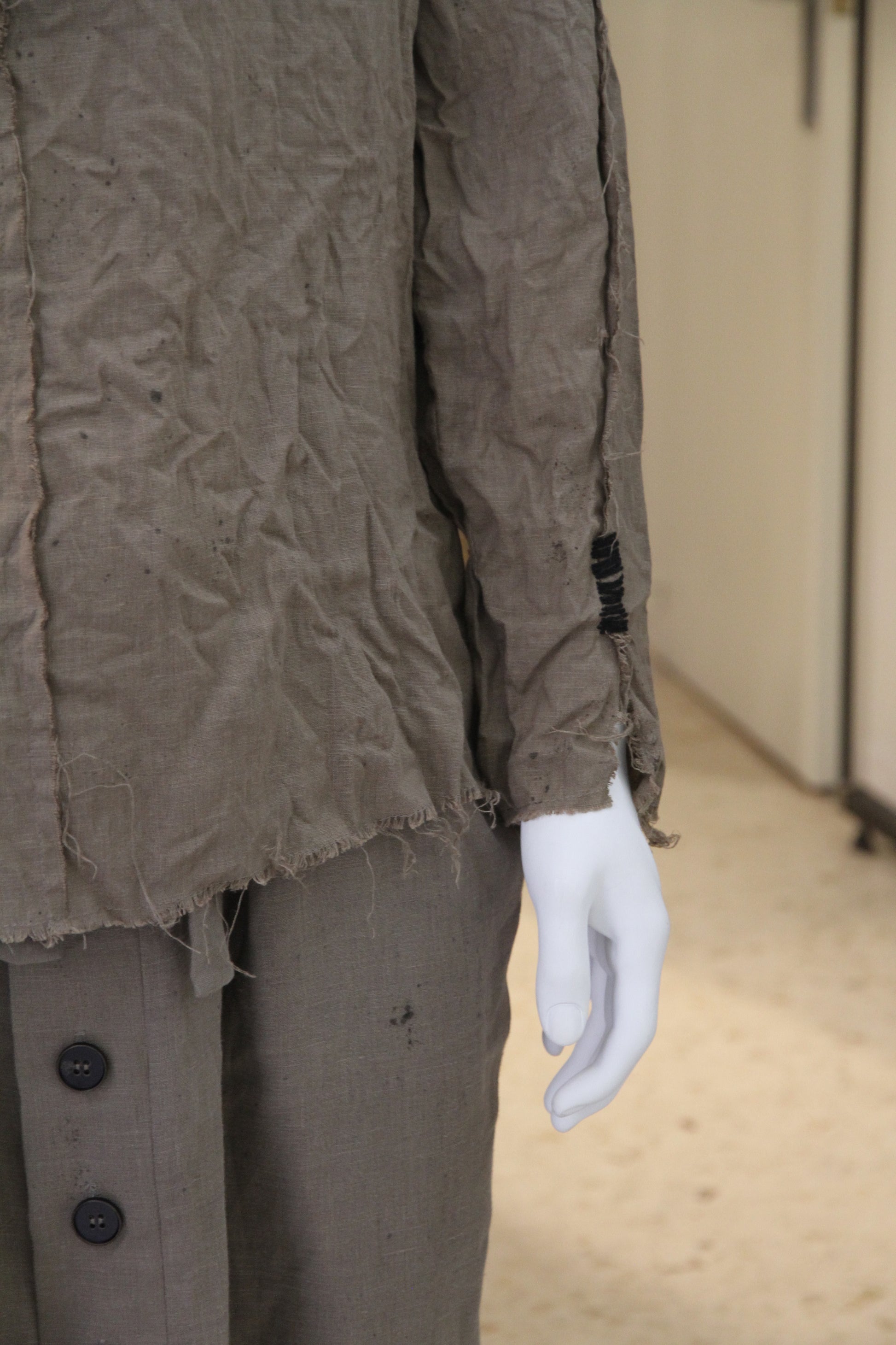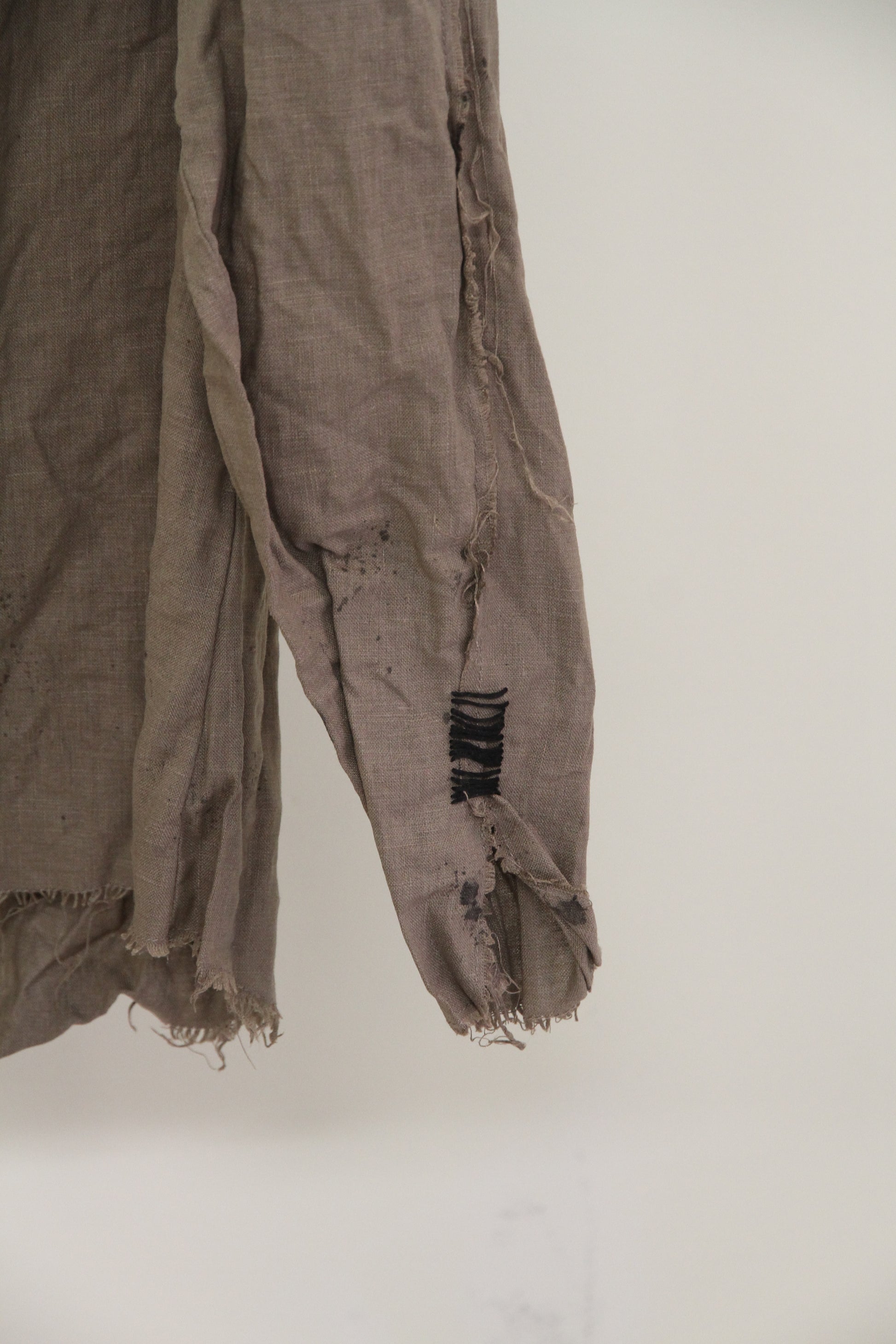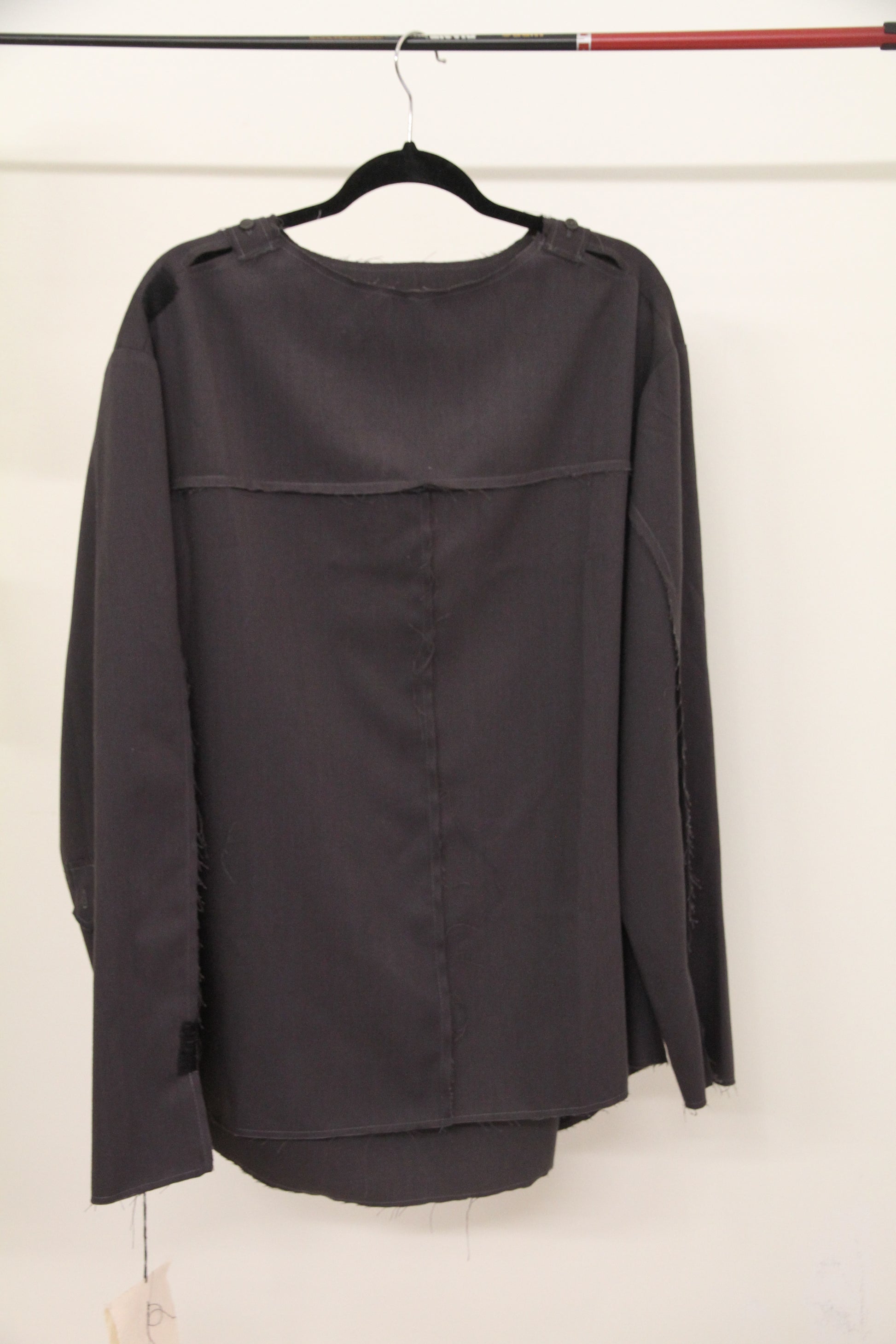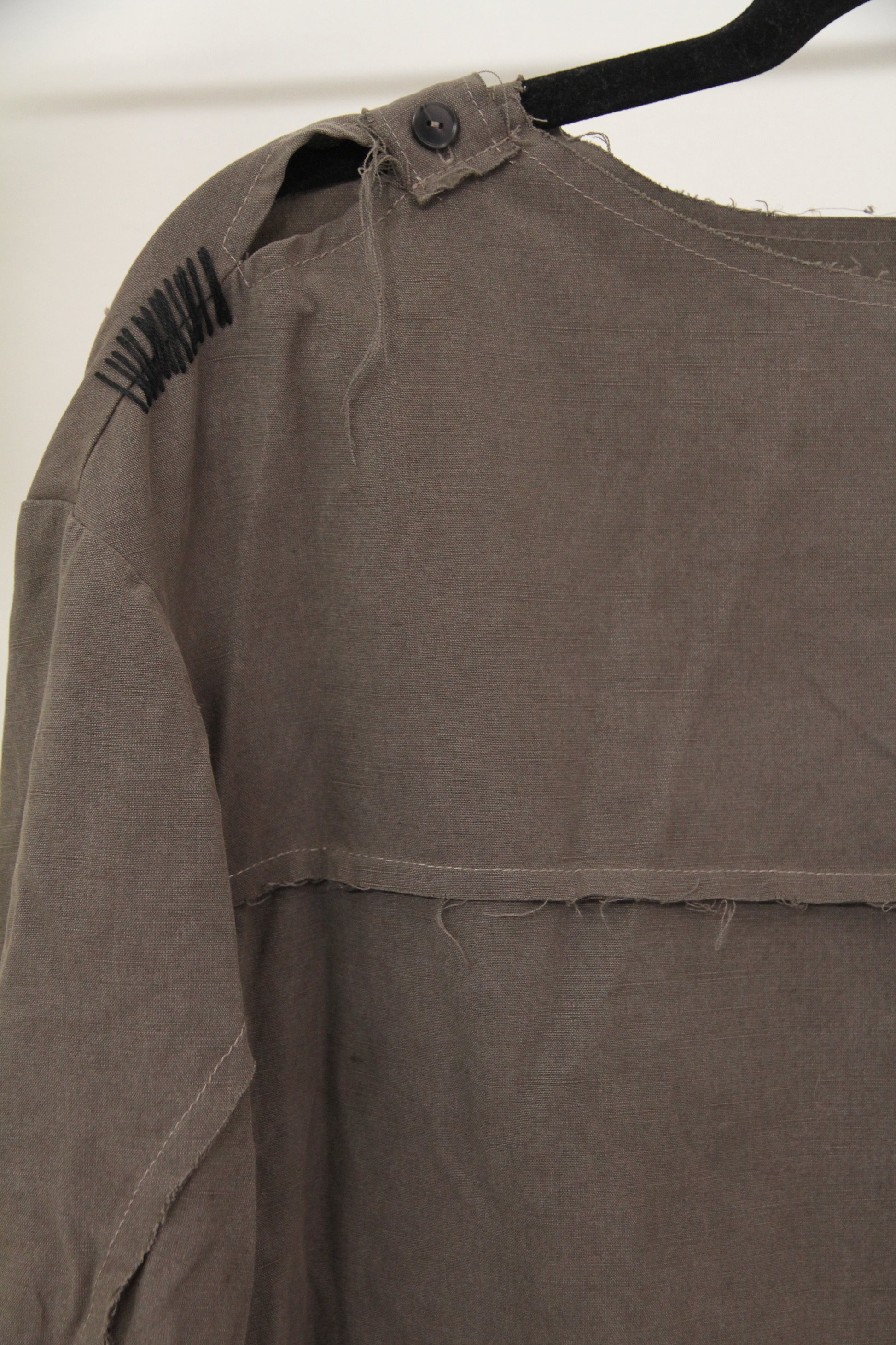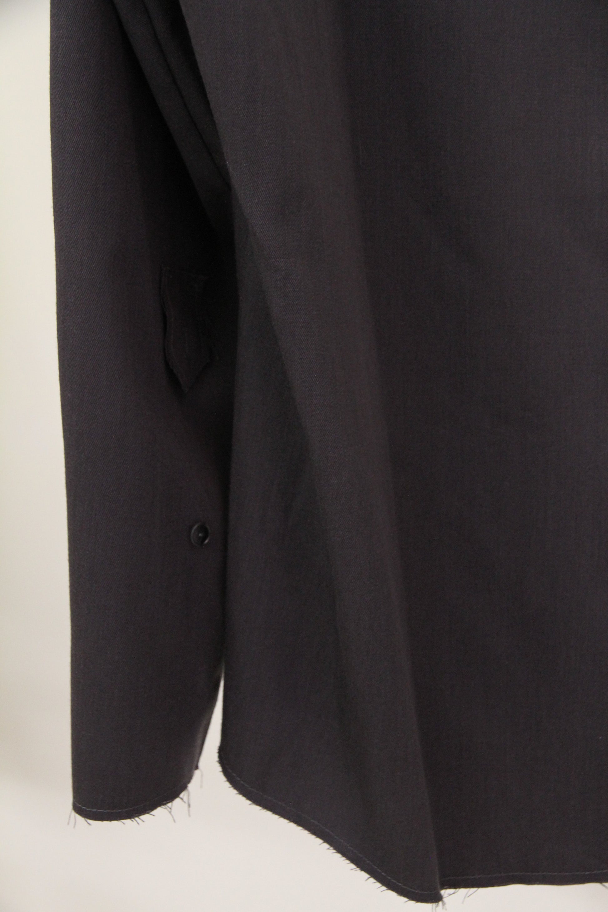 Camisa larga y holgada. Unisex. Cuello abotonado y mangas con costuras negras.