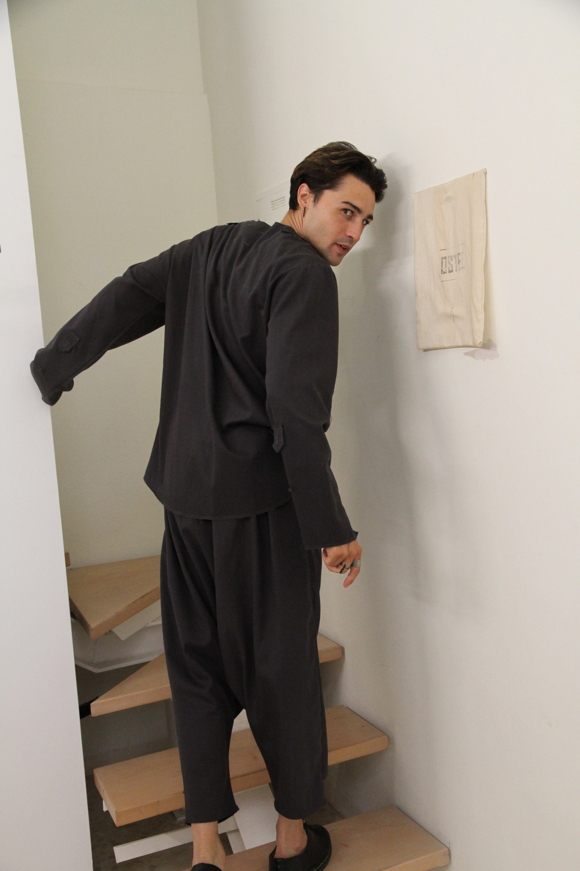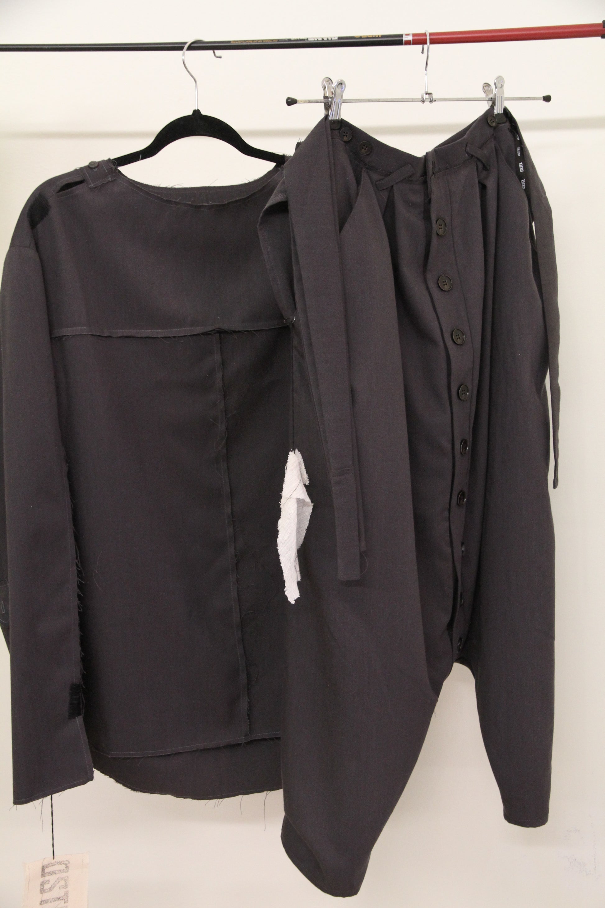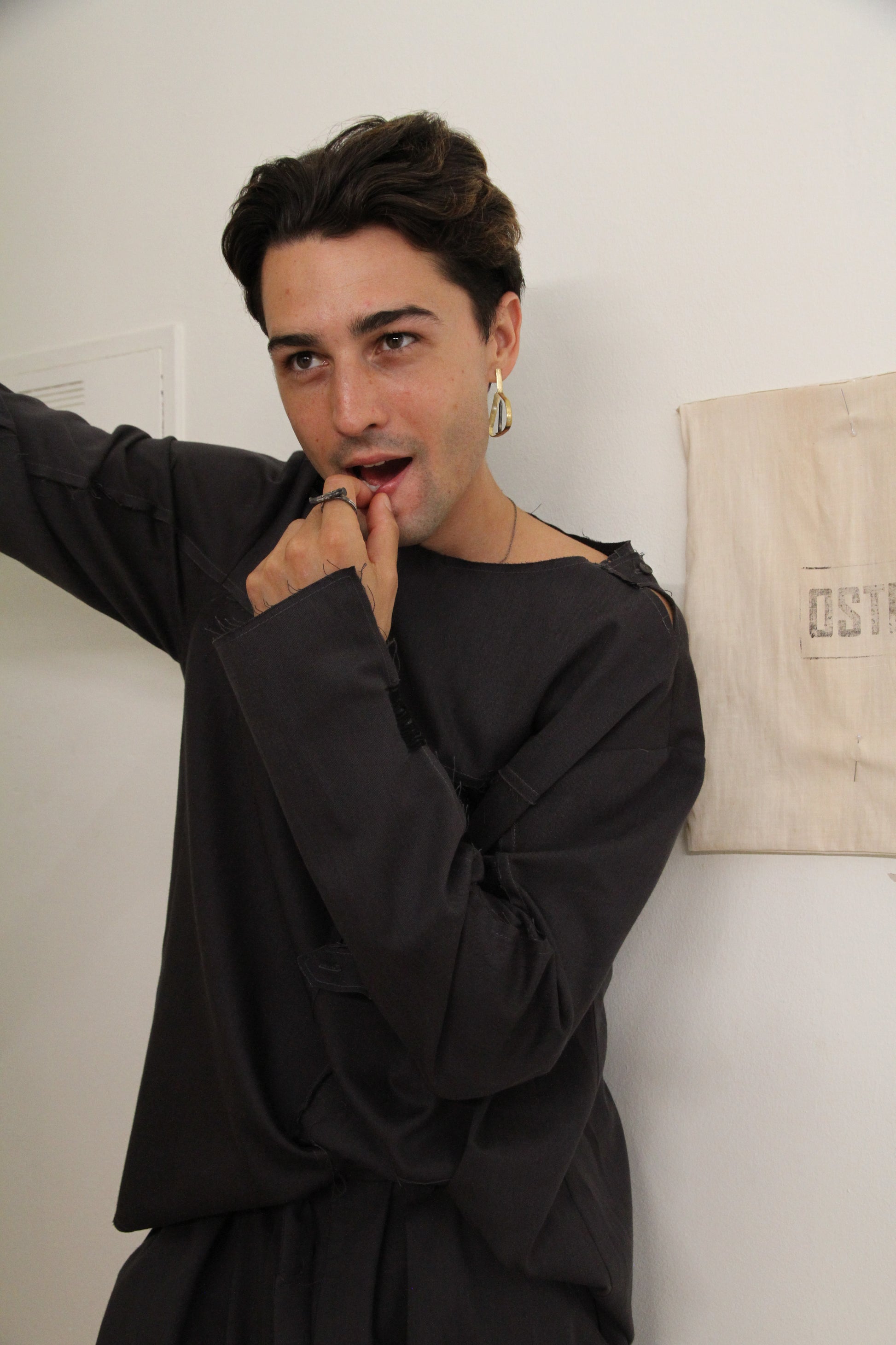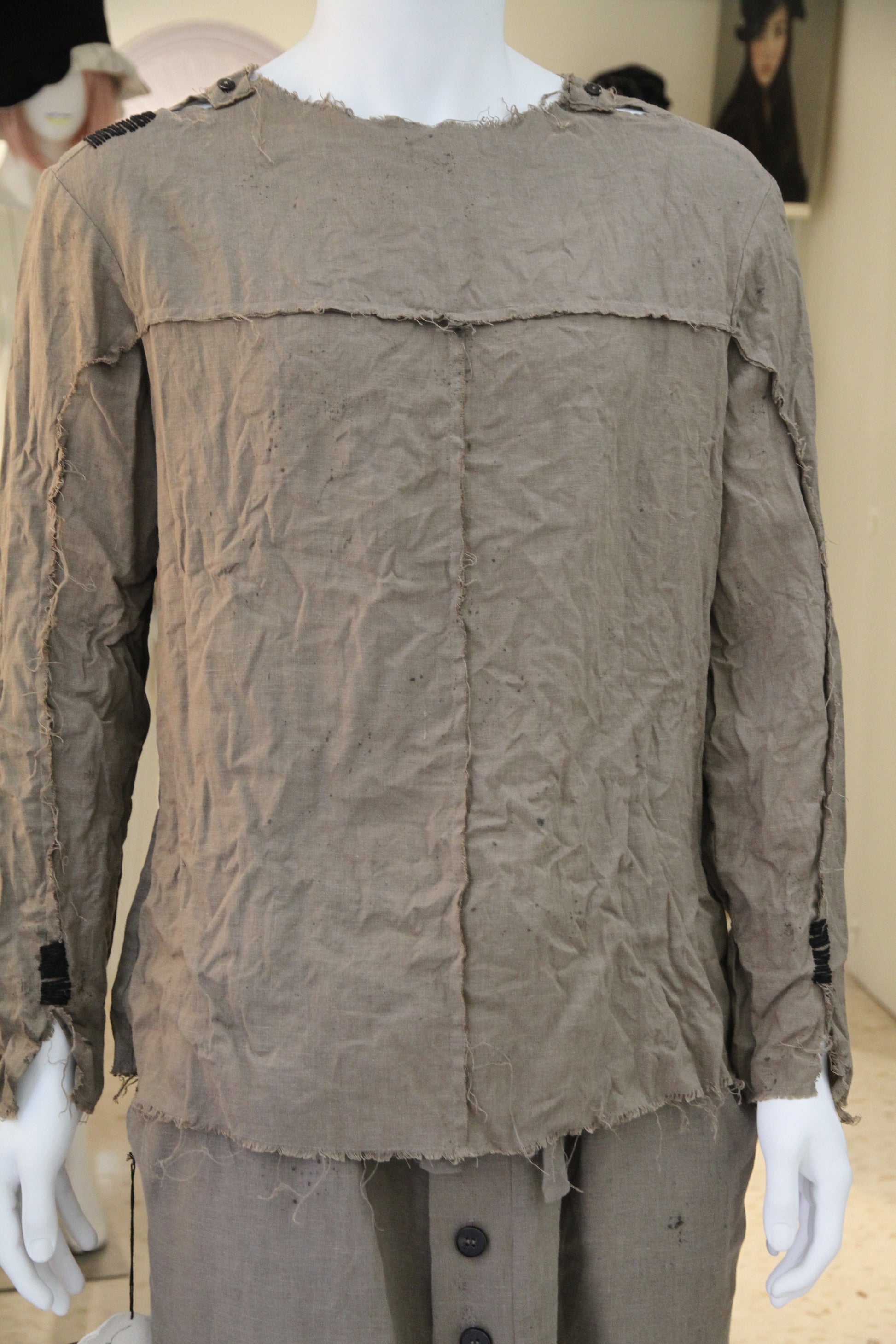 Camisa larga y holgada. Unisex. Cuello abotonado y mangas con costuras negras.