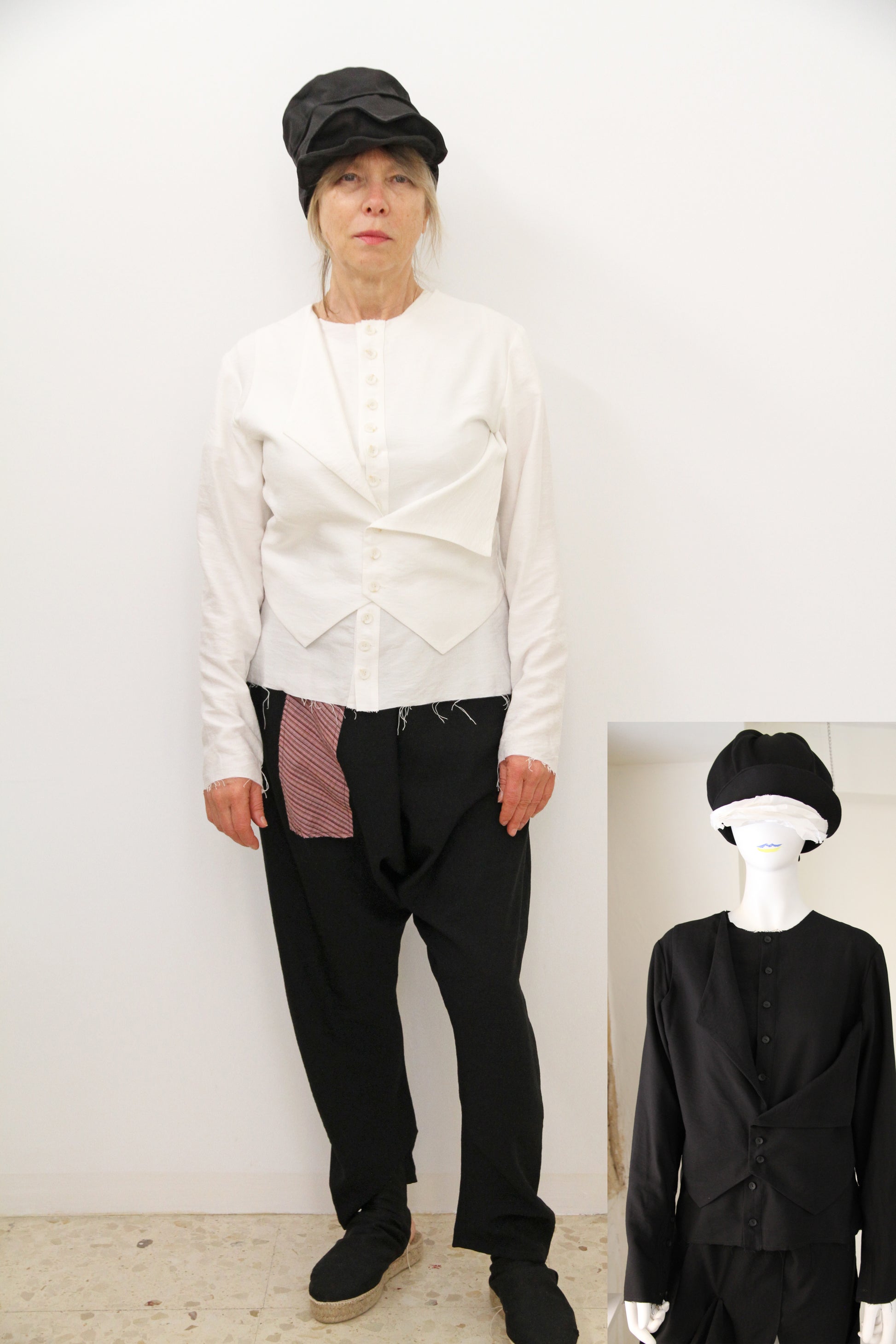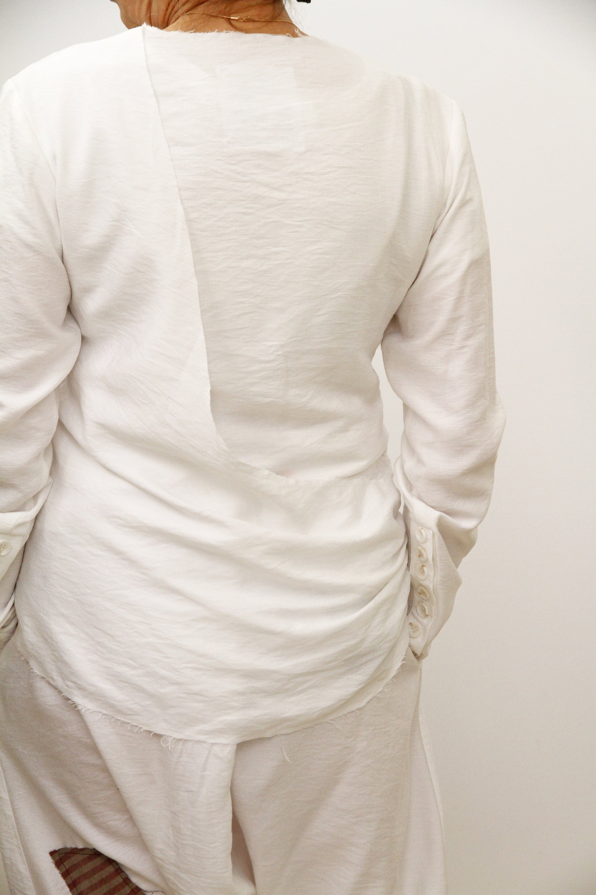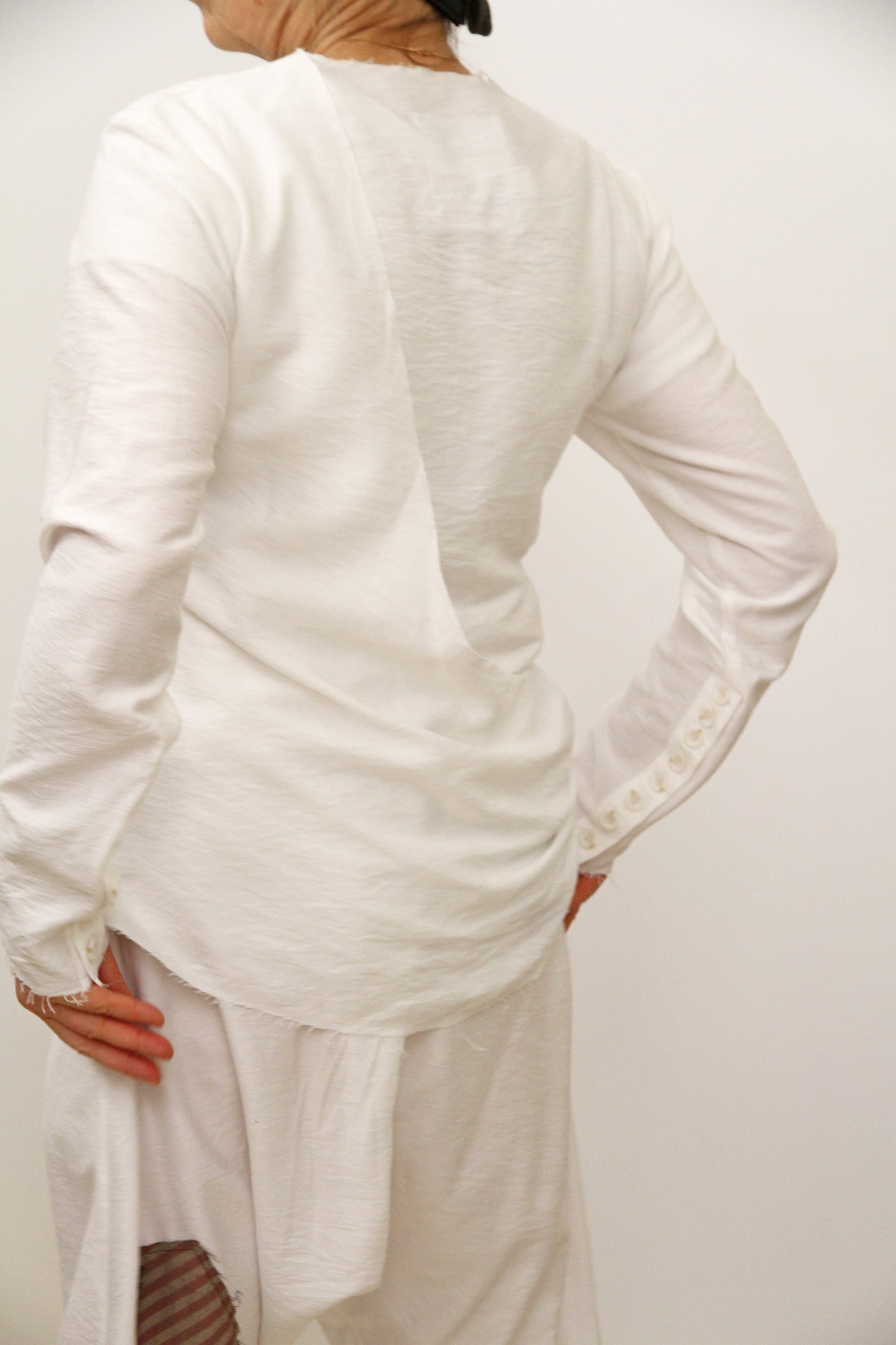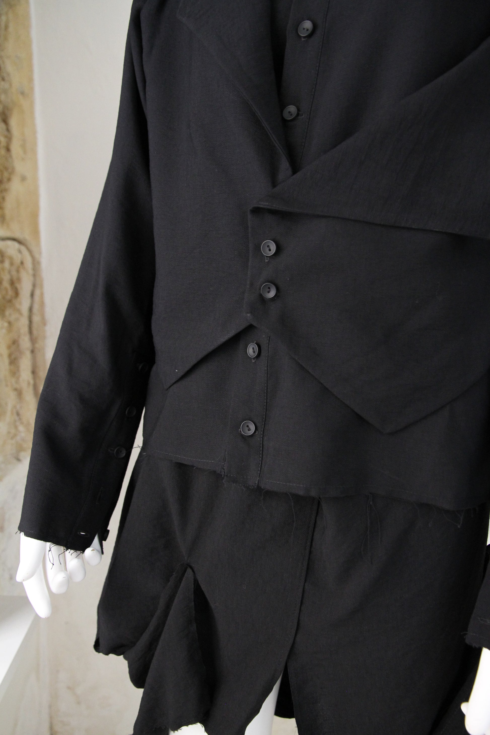 Camisa unisex oversize con chaleco asimétrico cosido y numerosos botones delante y en las mangas. Tiene drapeado en la espalda.