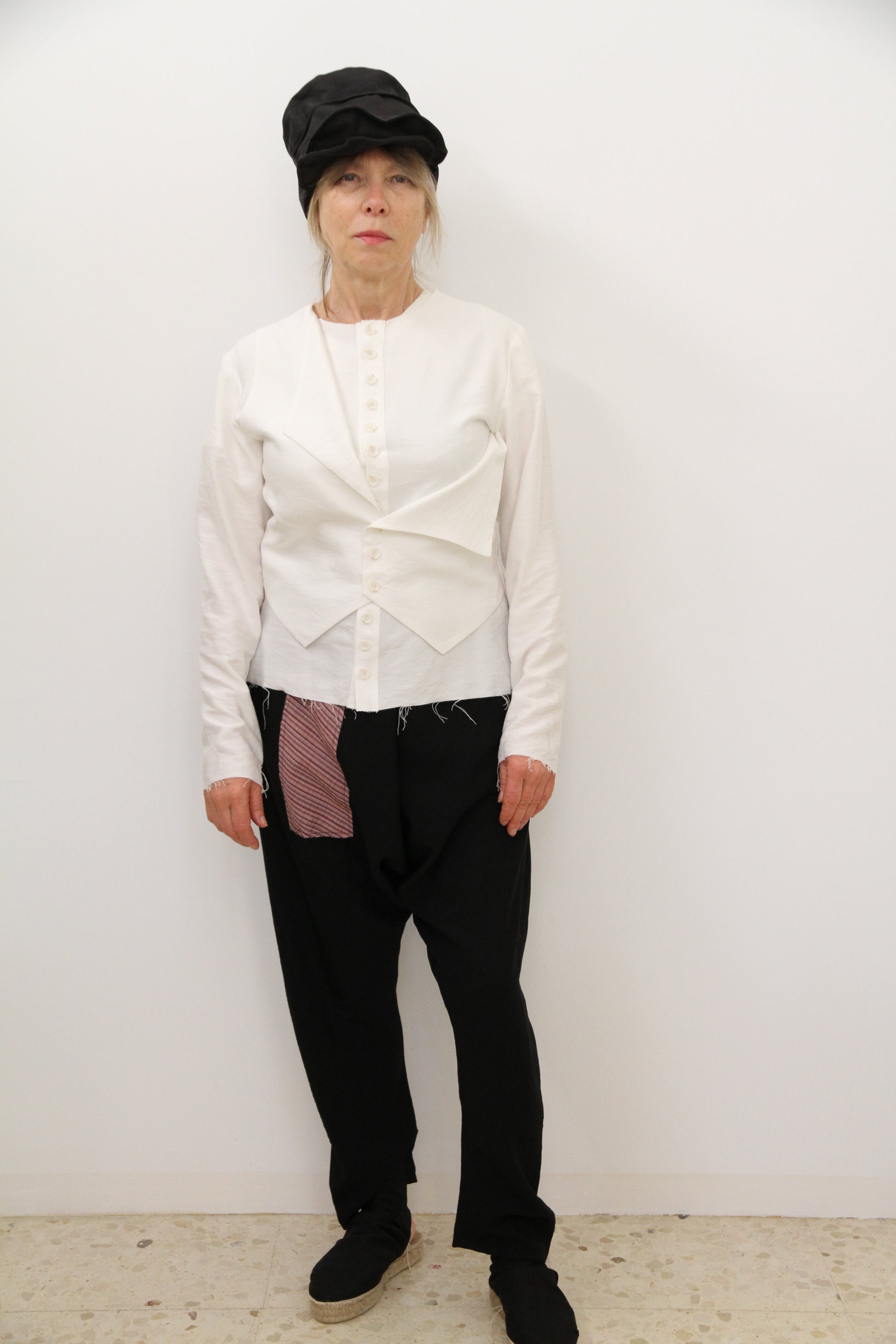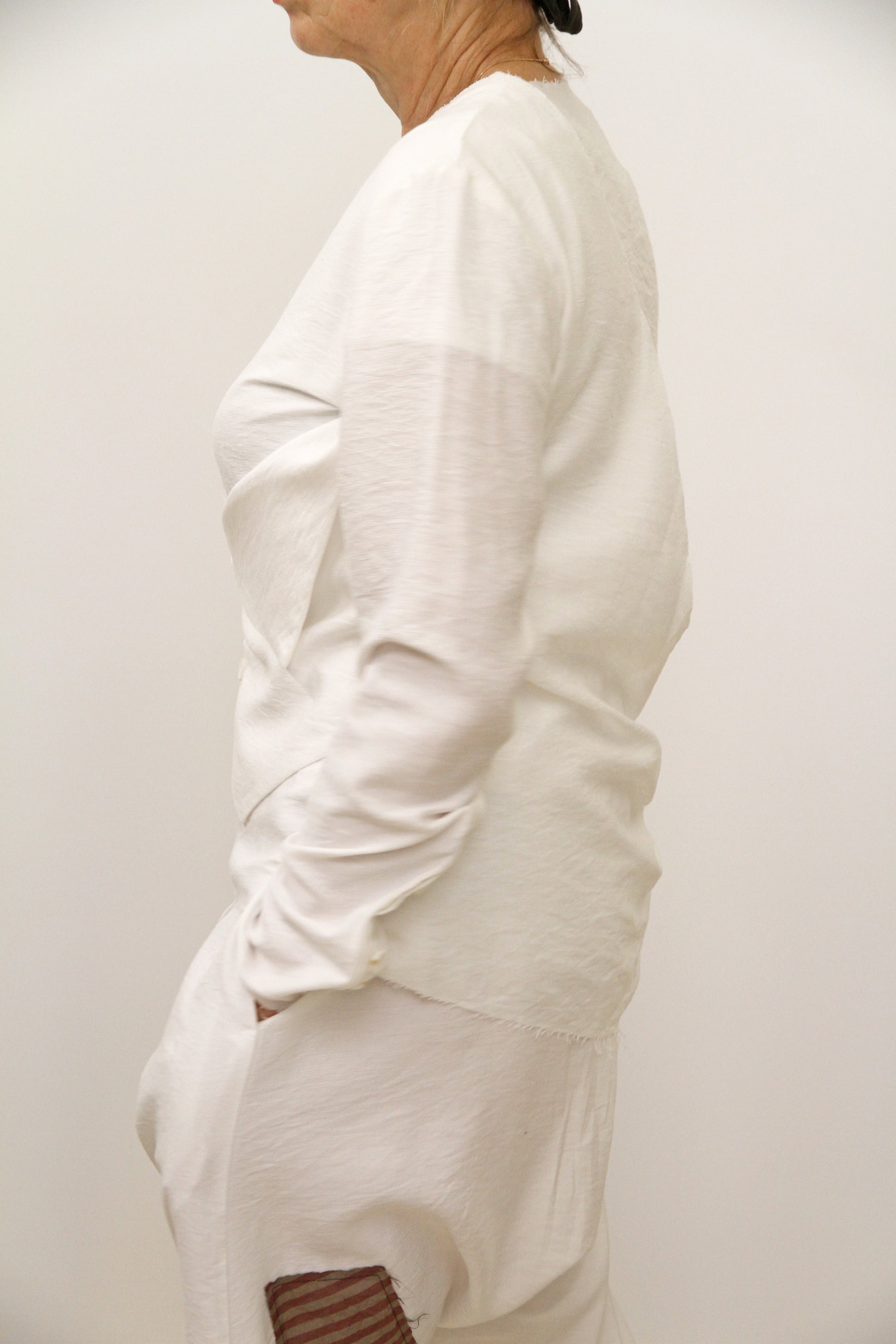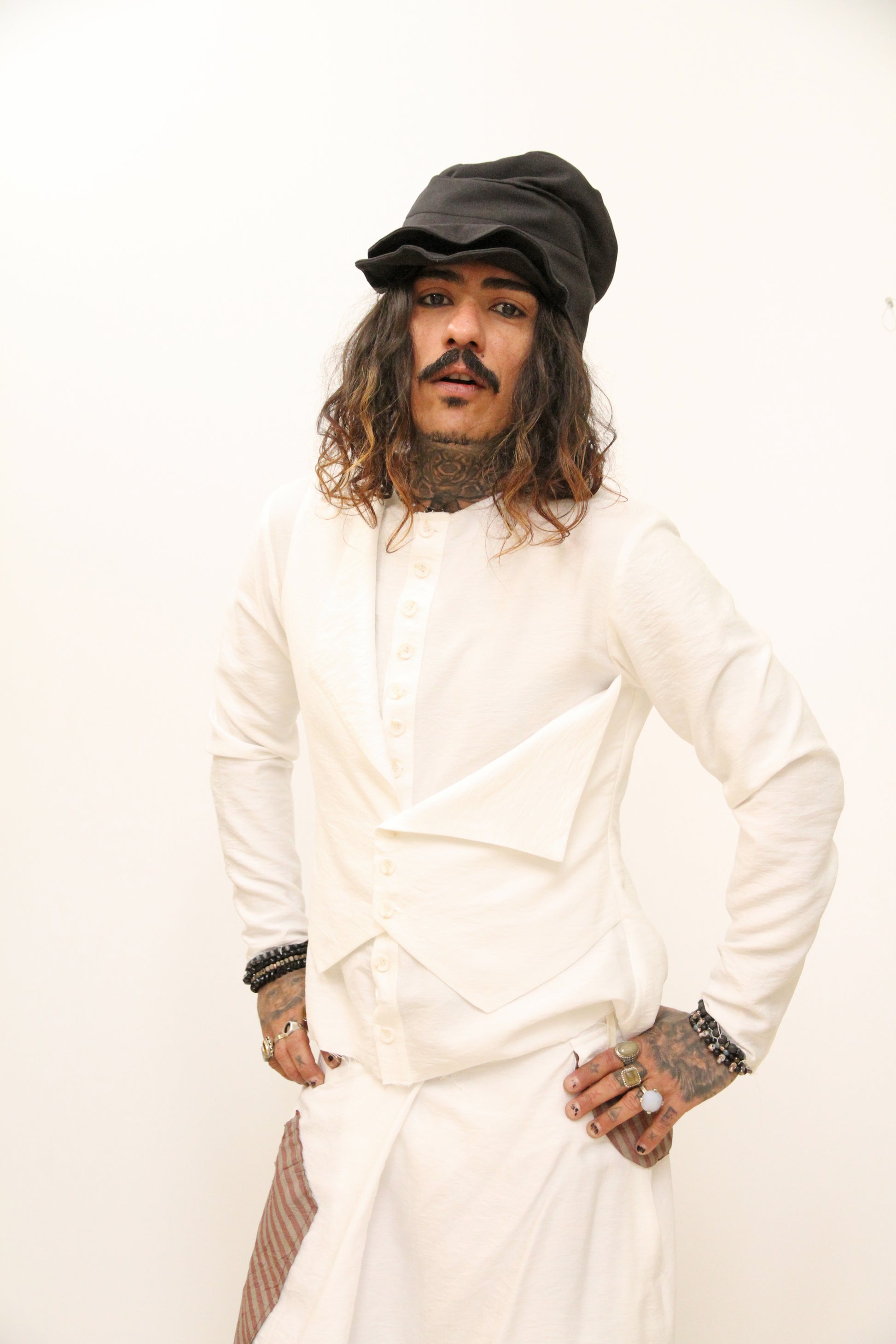 Camisa unisex oversize con chaleco asimétrico cosido y numerosos botones delante y en las mangas. Tiene drapeado en la espalda.
