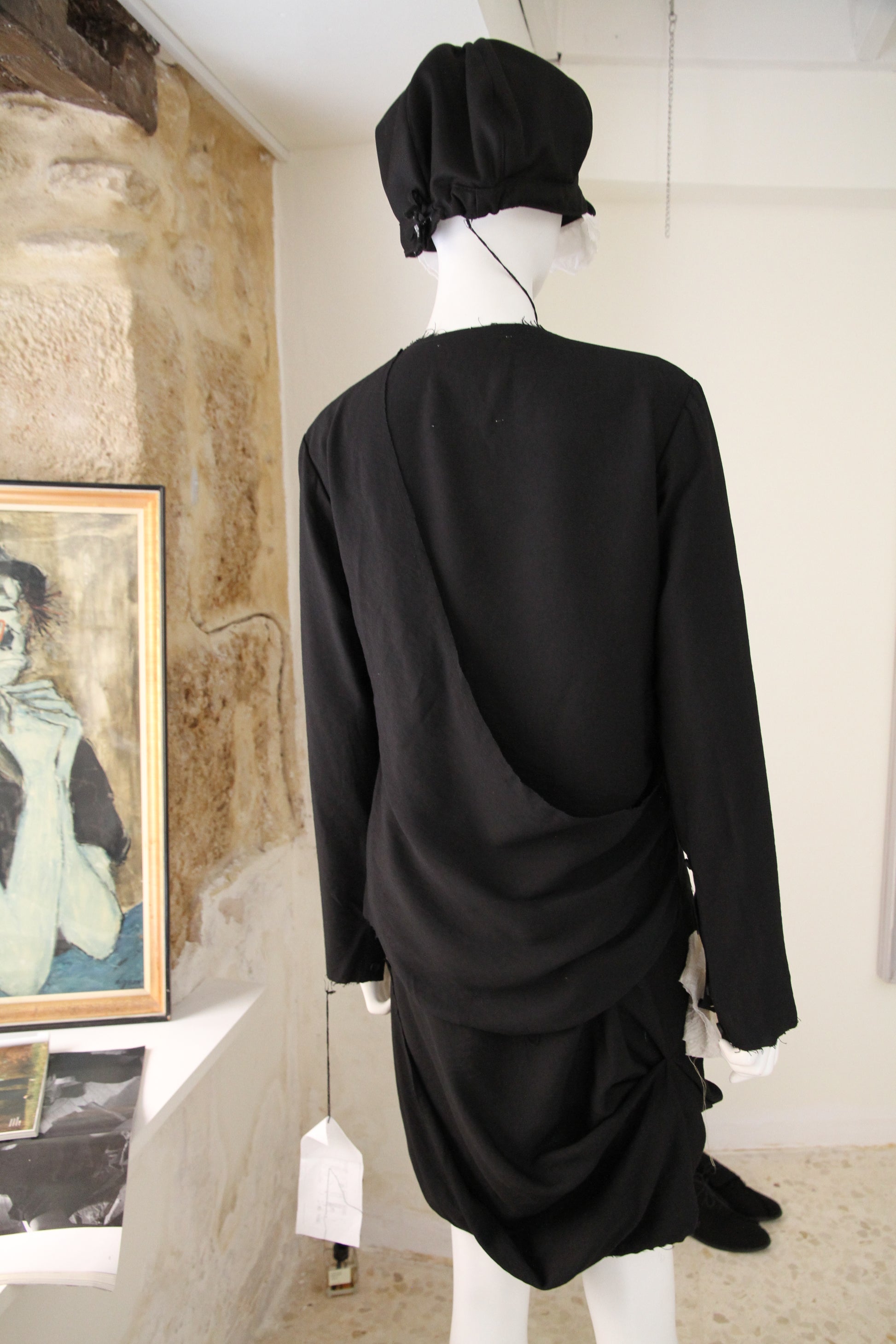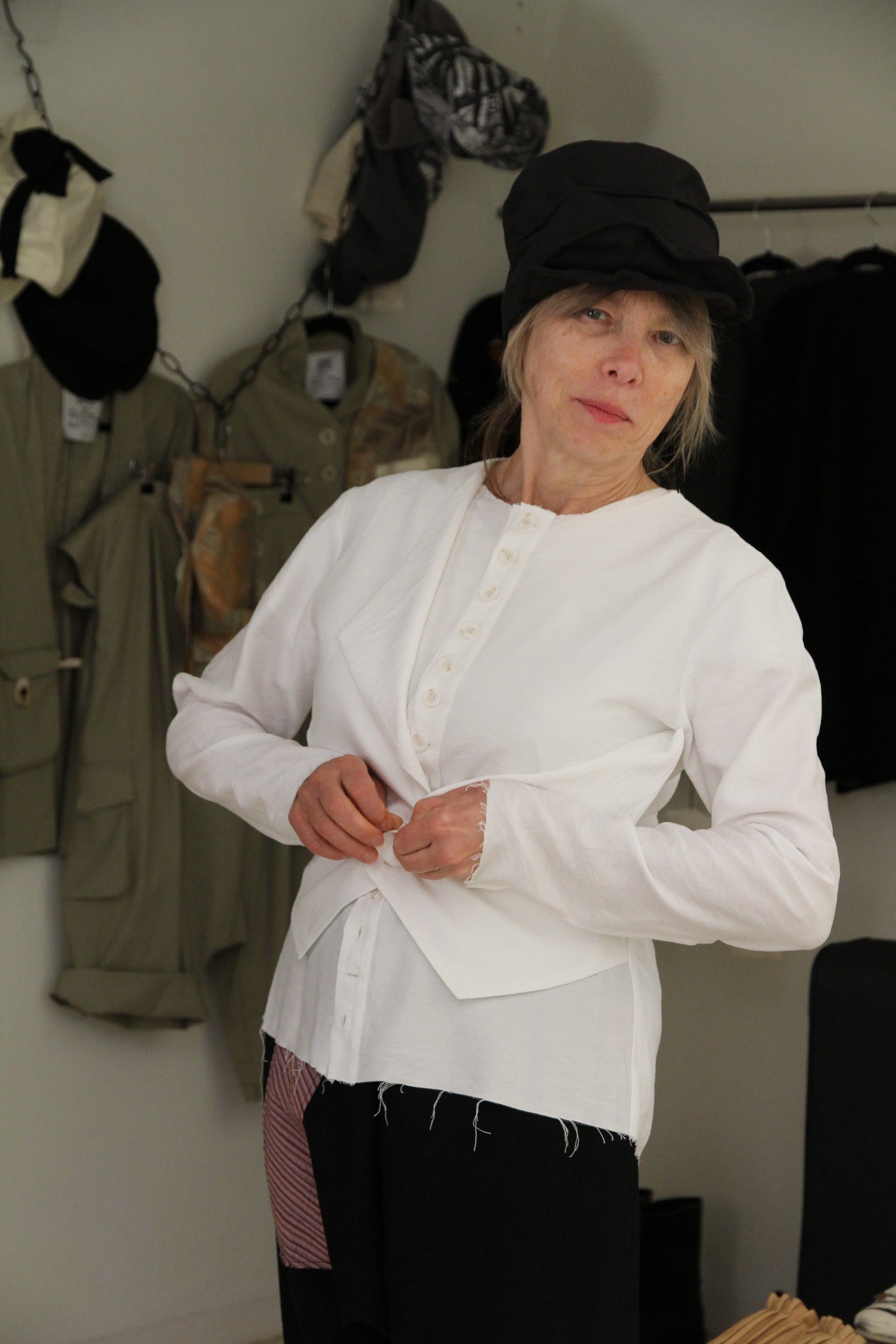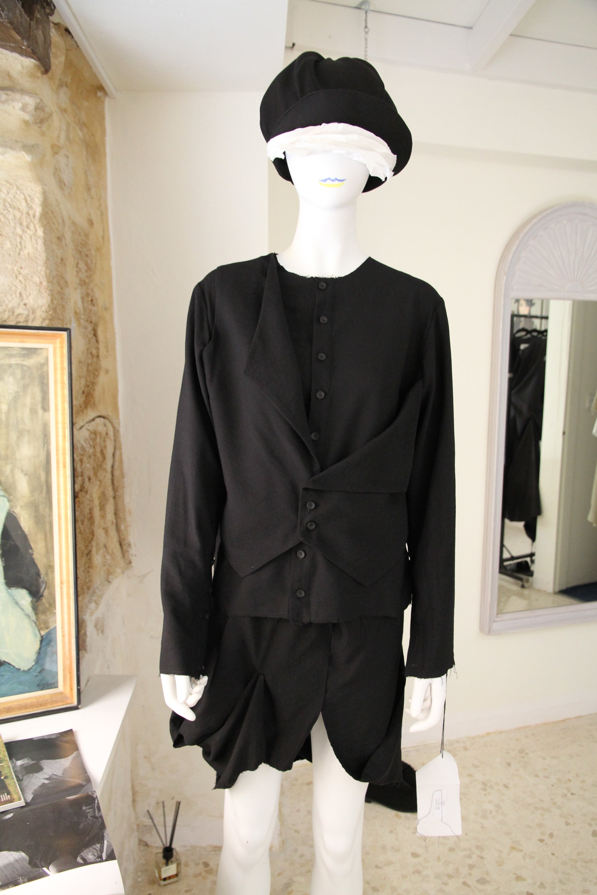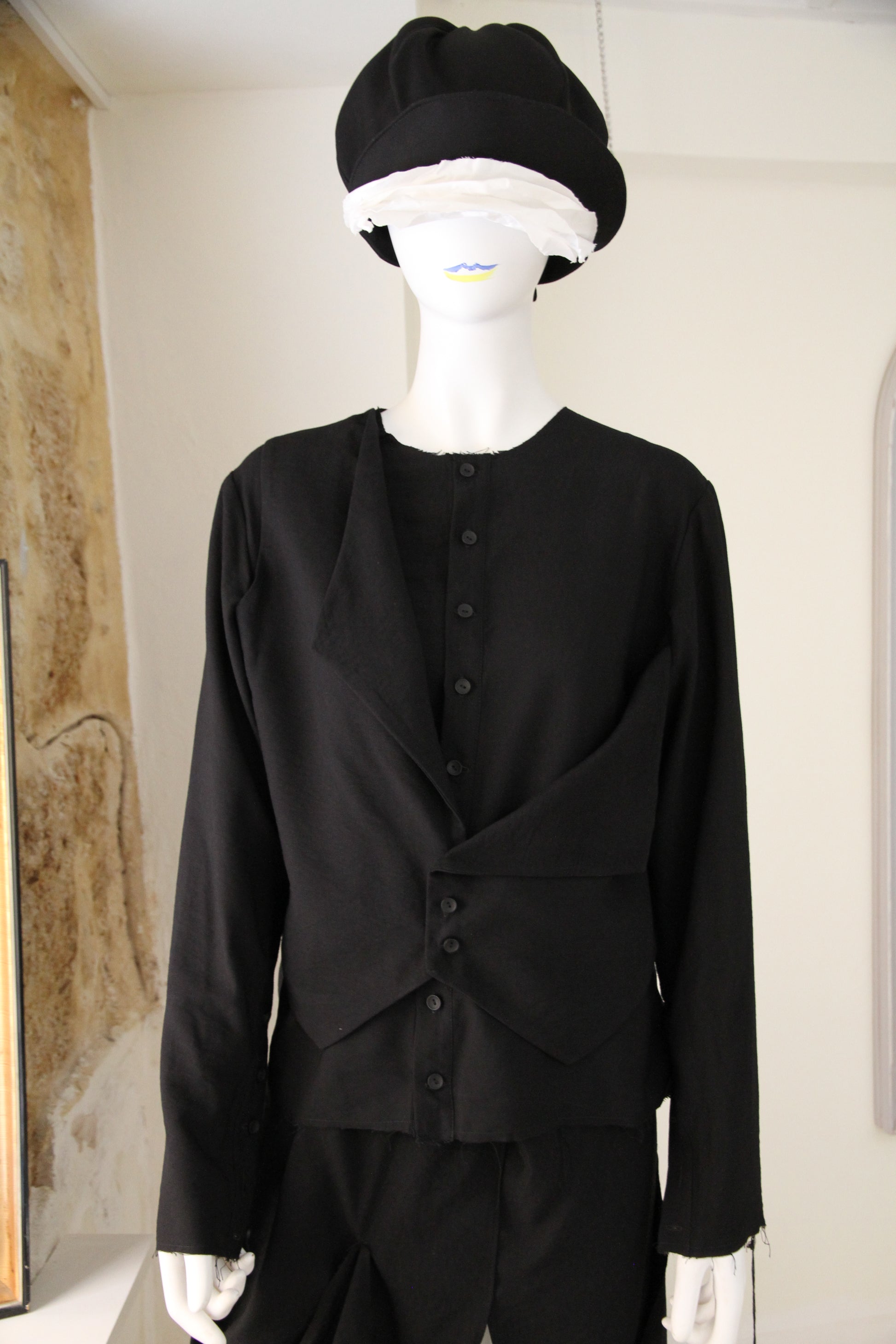 Camisa unisex oversize con chaleco asimétrico cosido y numerosos botones delante y en las mangas. Tiene drapeado en la espalda.