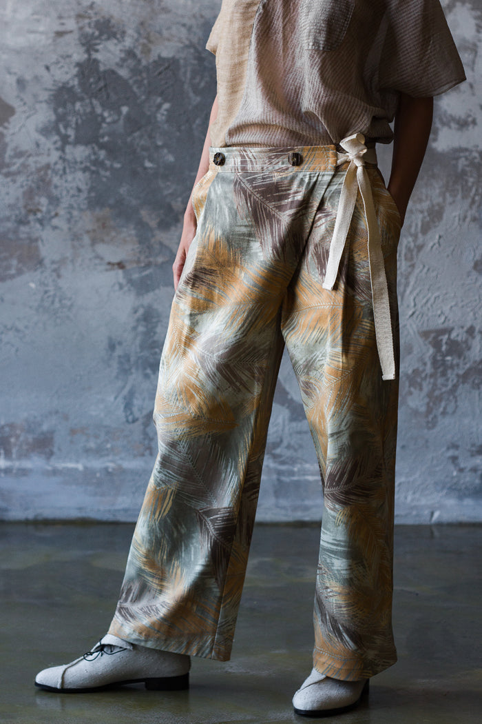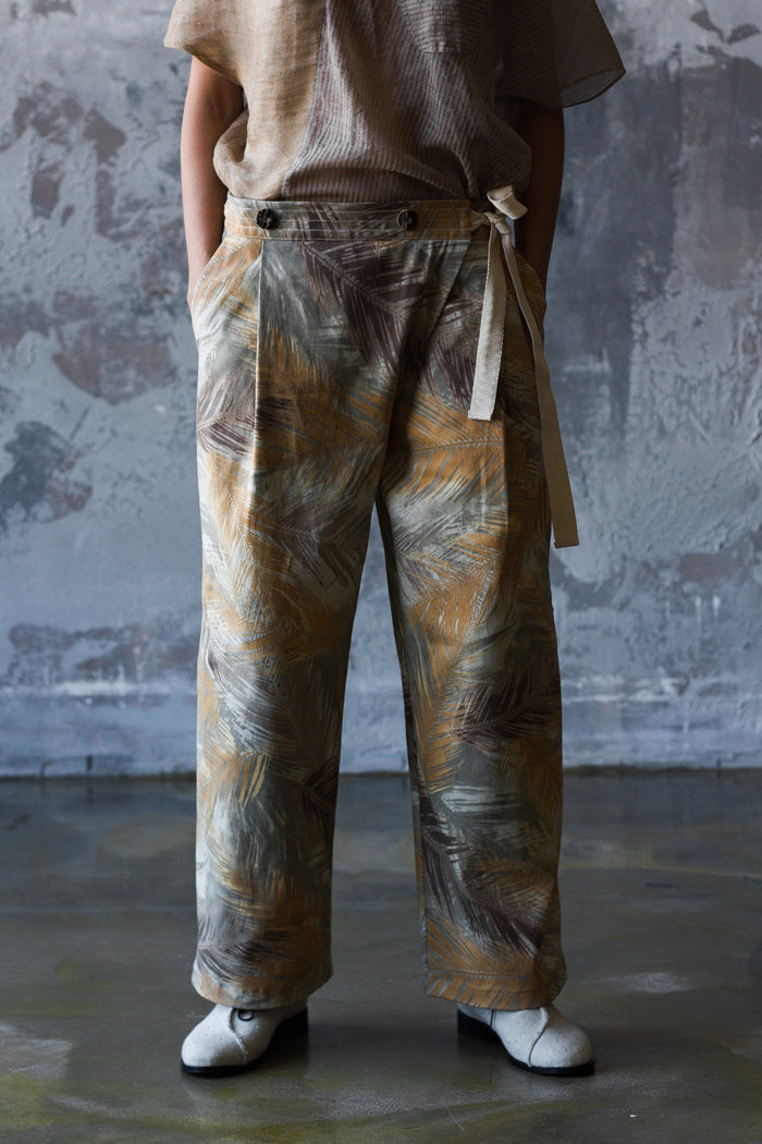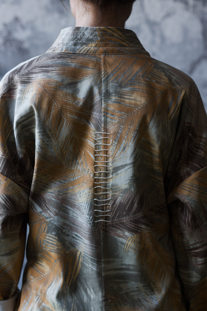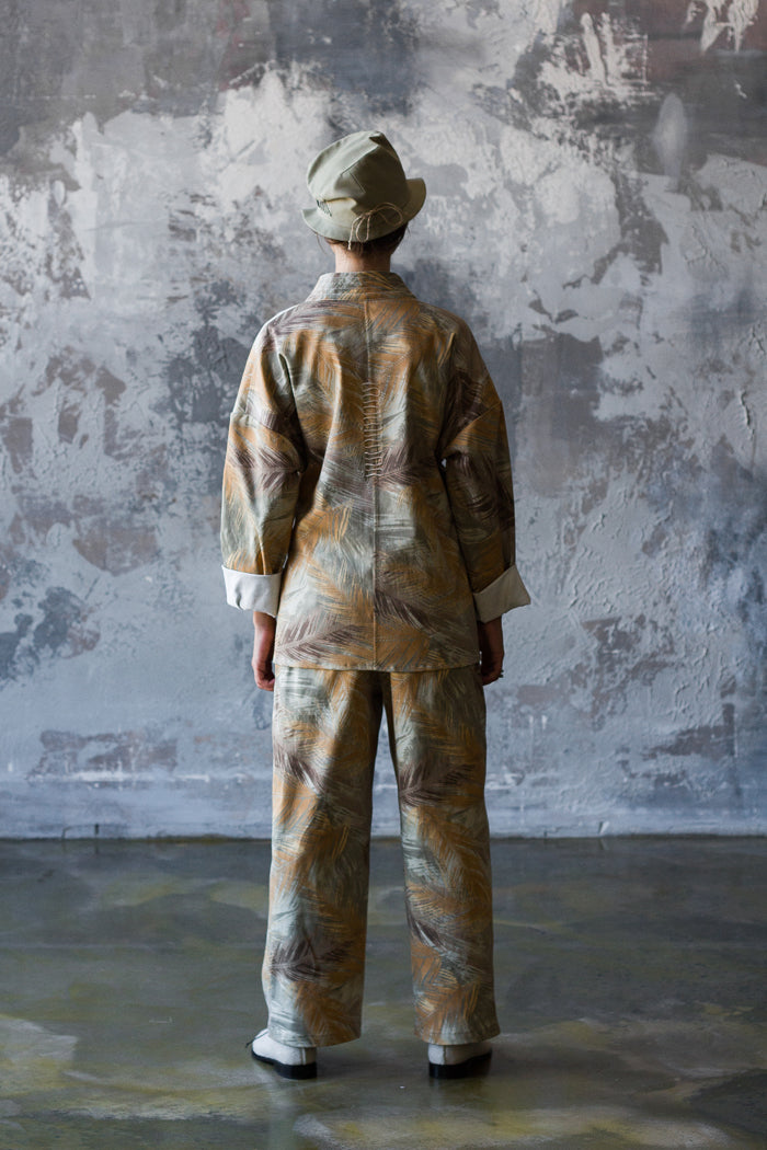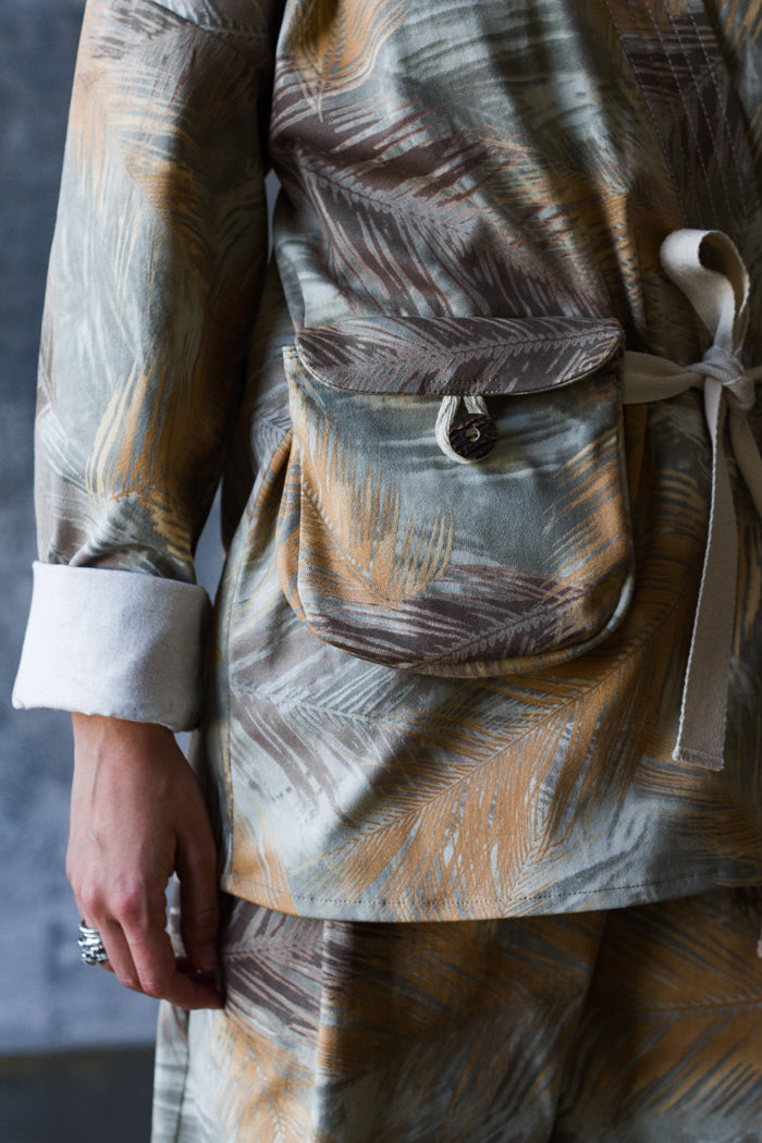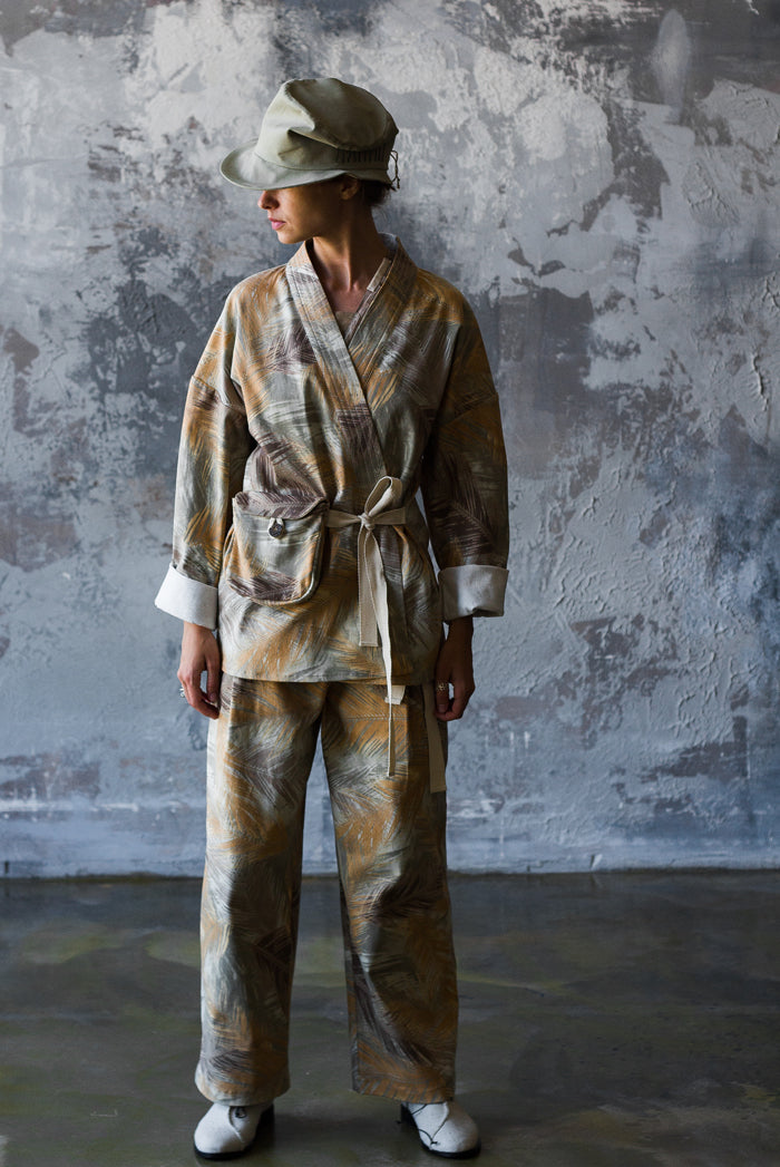 El traje de algodón es ideal para el día a día. La chaqueta se asemeja a un kimono, con cuello y tirantes atados a los lados. En un lateral, tiene un bolsillo con botón, similar a un pequeño bolso. La espalda está cosida con un cordón.
