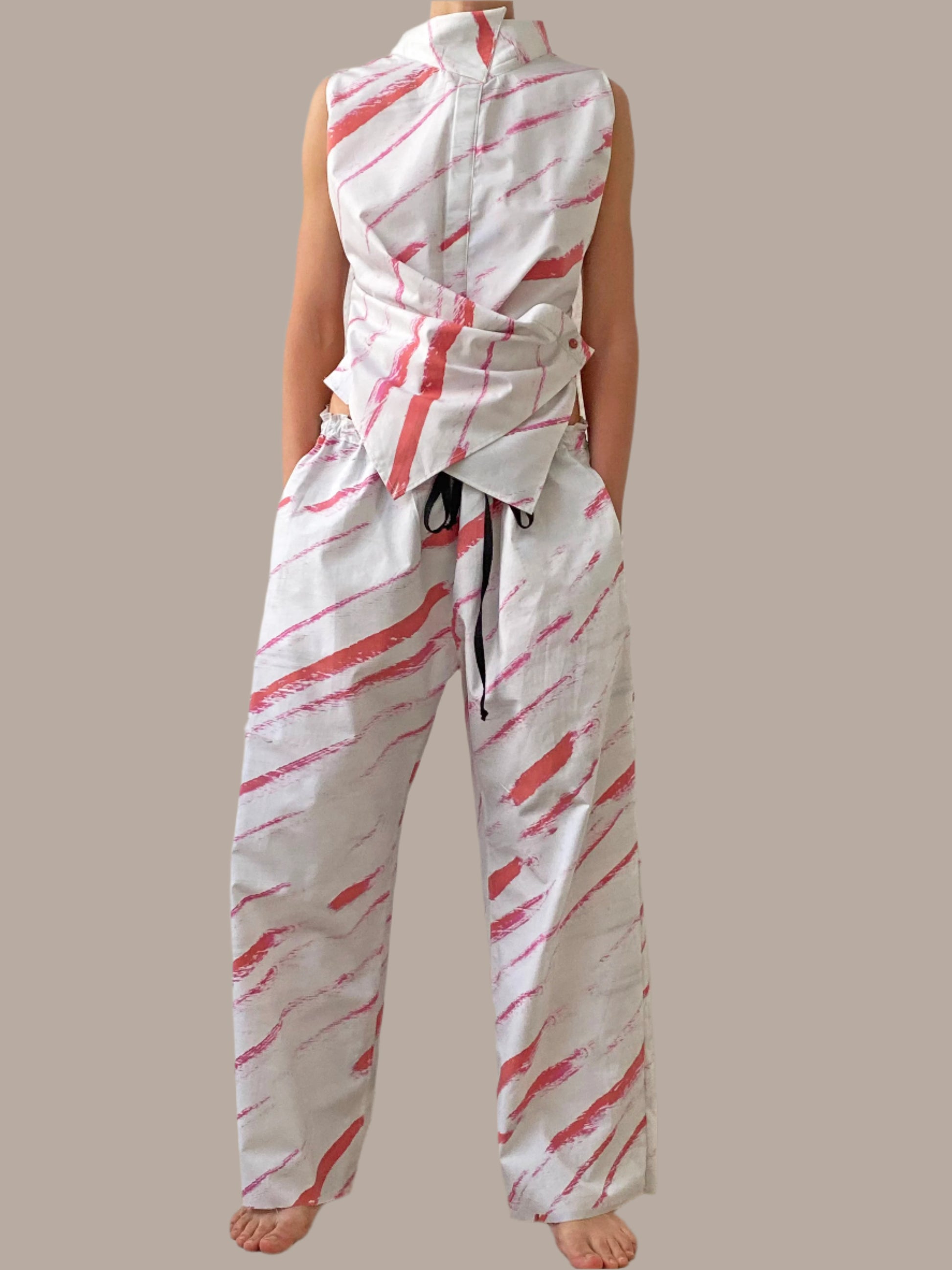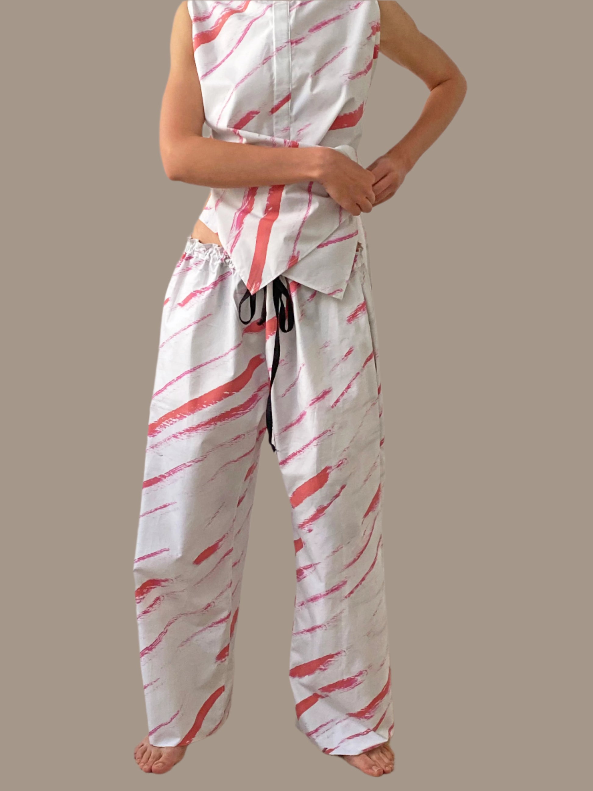 Culotte ancho extragrande con dos bolsillos y estampado, diseñado por el diseñador. La talla se ajusta en el cinturón mediante un cordón negro. Ancho máximo del cinturón: 110 cm, cadera: 120 cm.