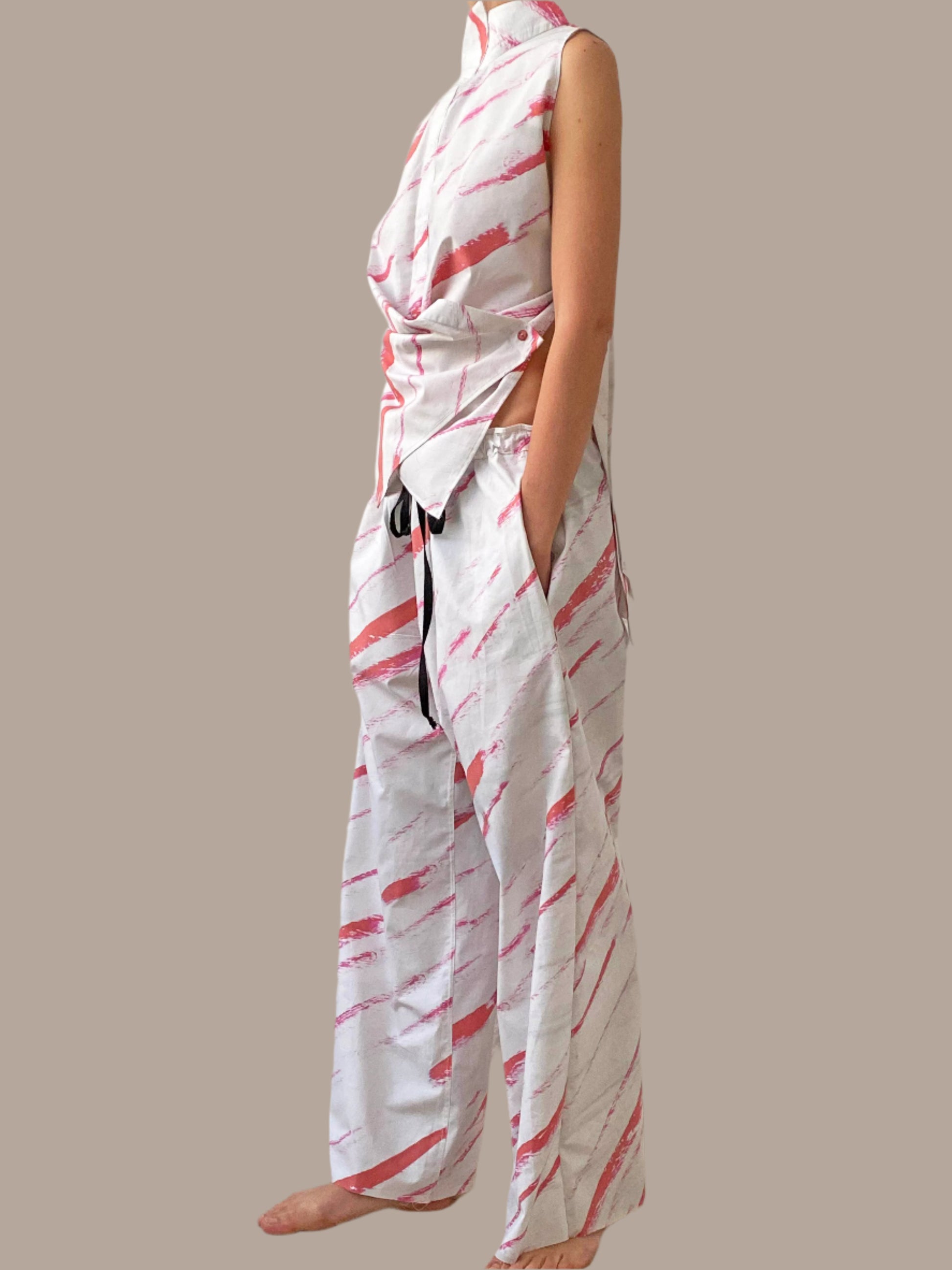 Camisa de verano con cuello alto, espalda cruzada y estampado especial, confeccionada por el diseñador. Tiene un drapeado frontal y se abrocha con pequeños botones. Busto máximo: 100 cm.
