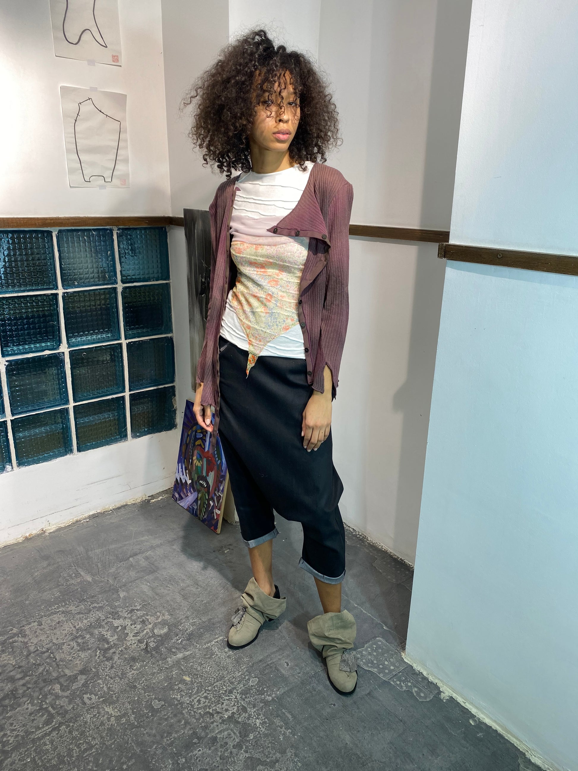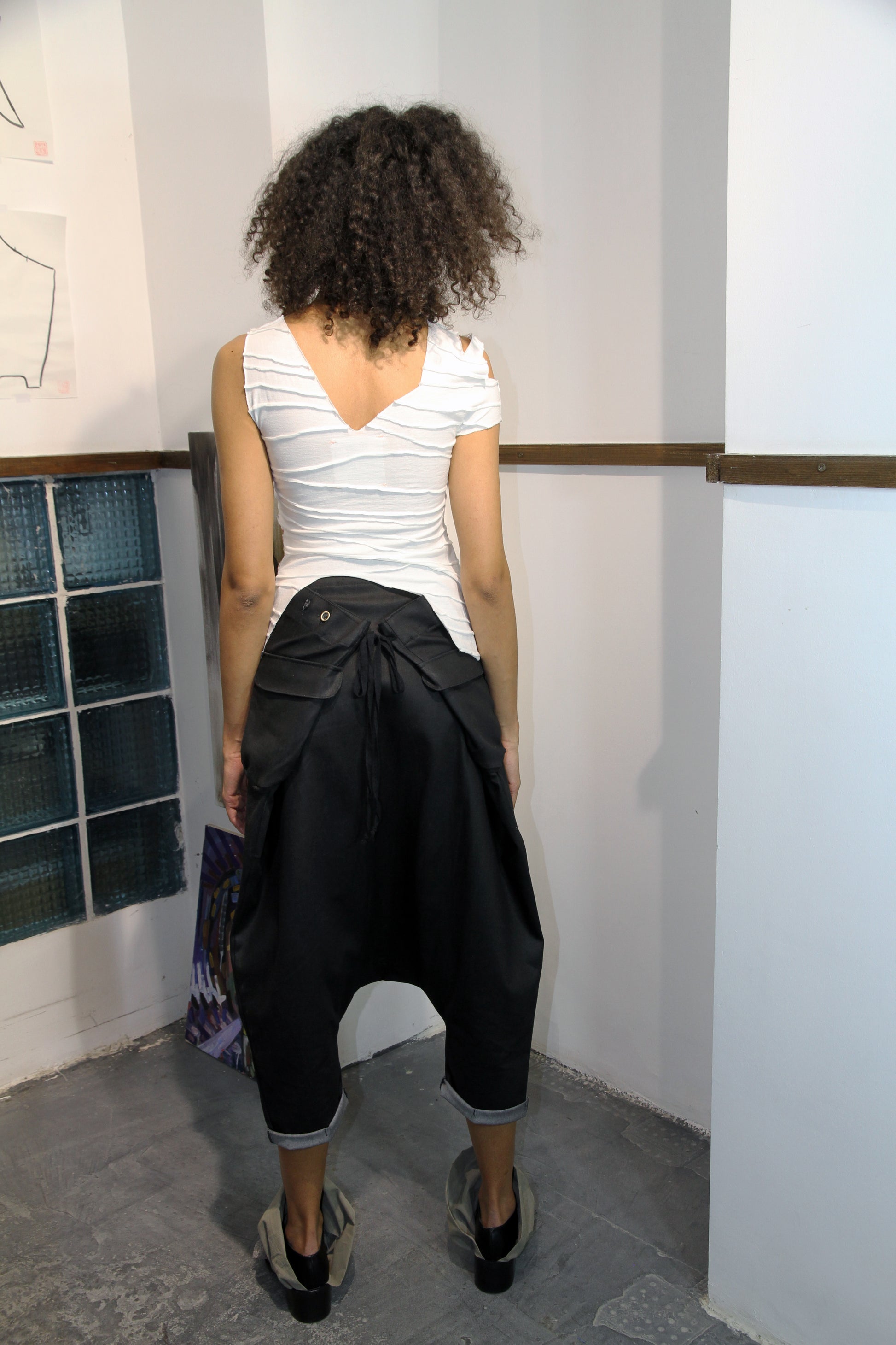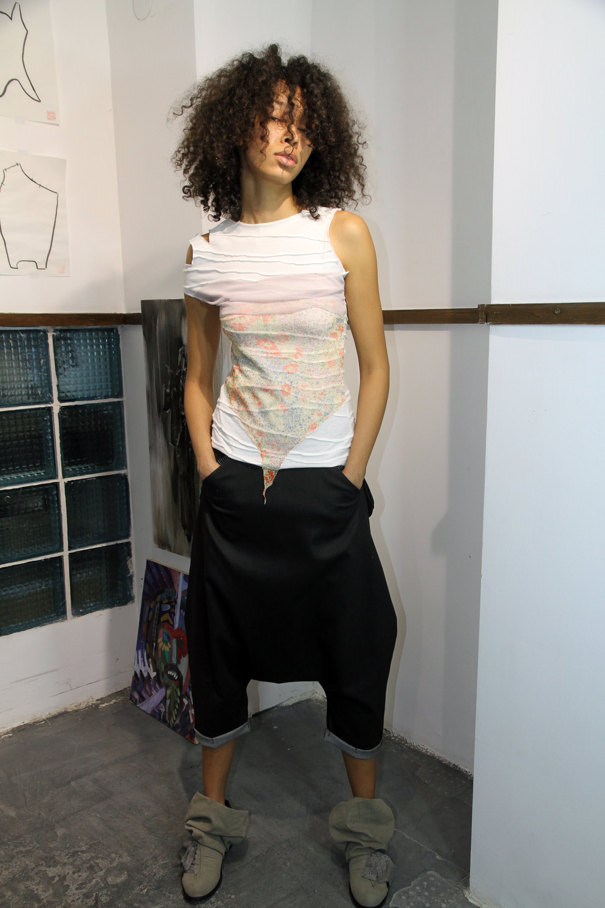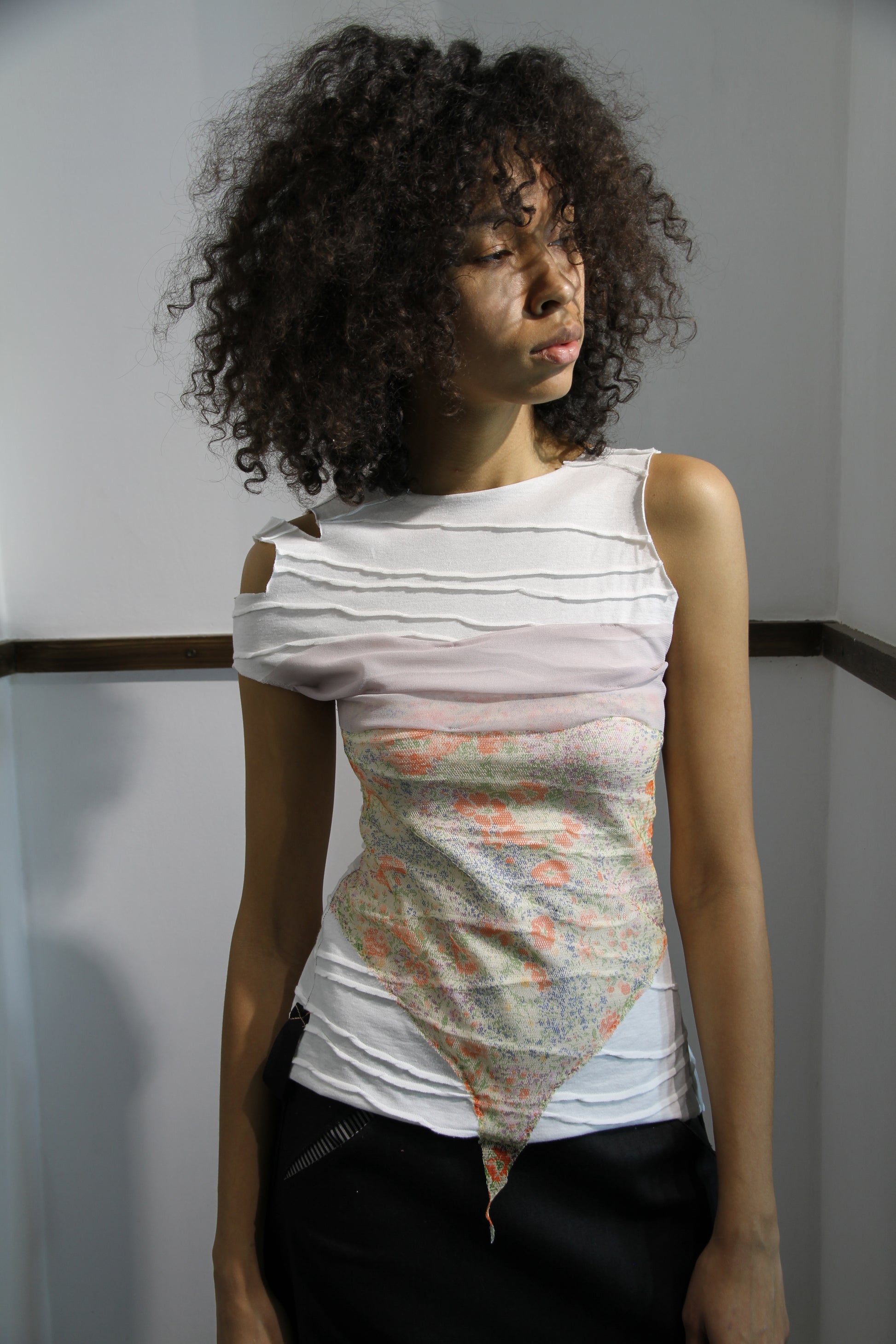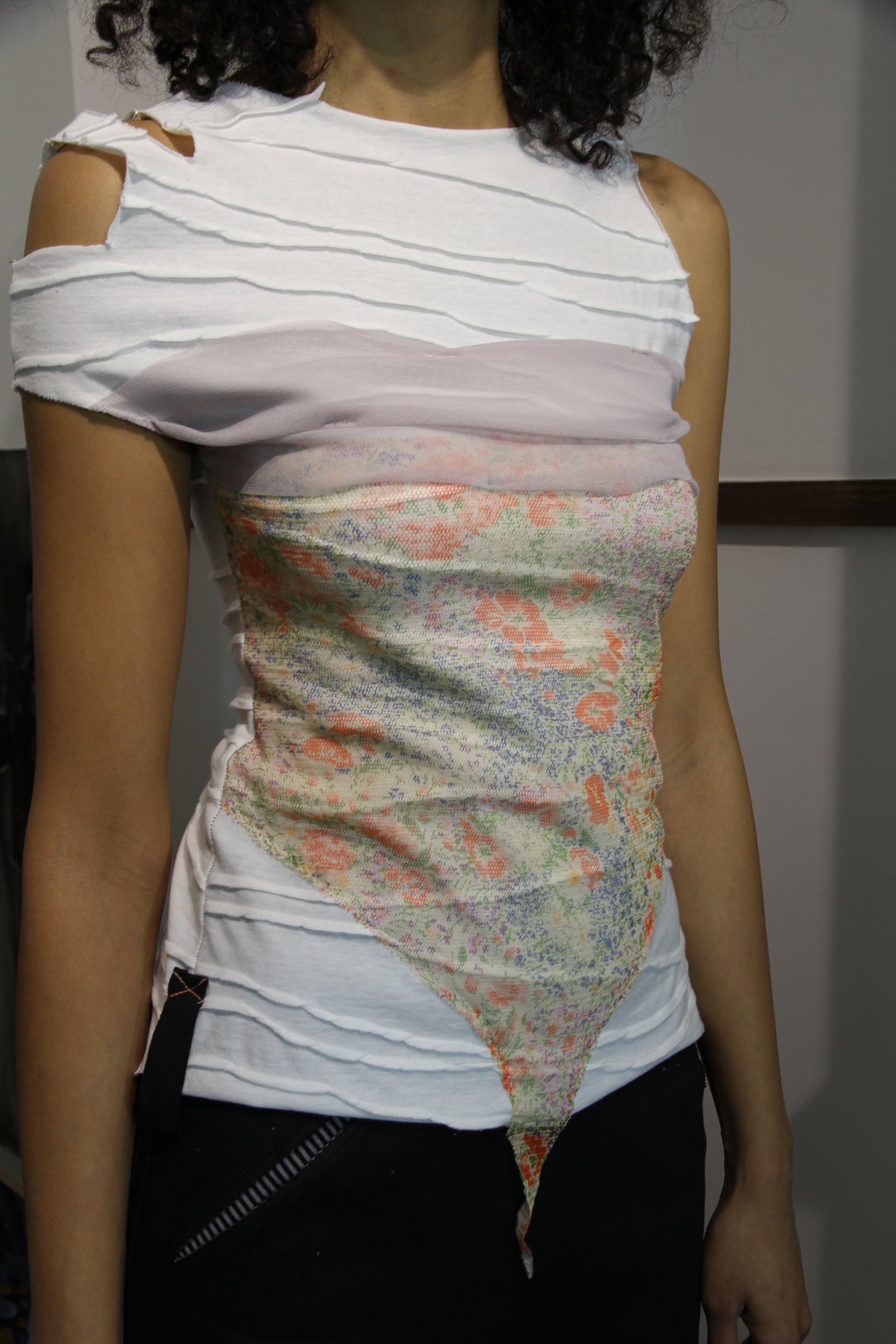 Top de jersey de tejido estructural. Hombros y espalda asimétricos. Parte delantera con detalles de malla.