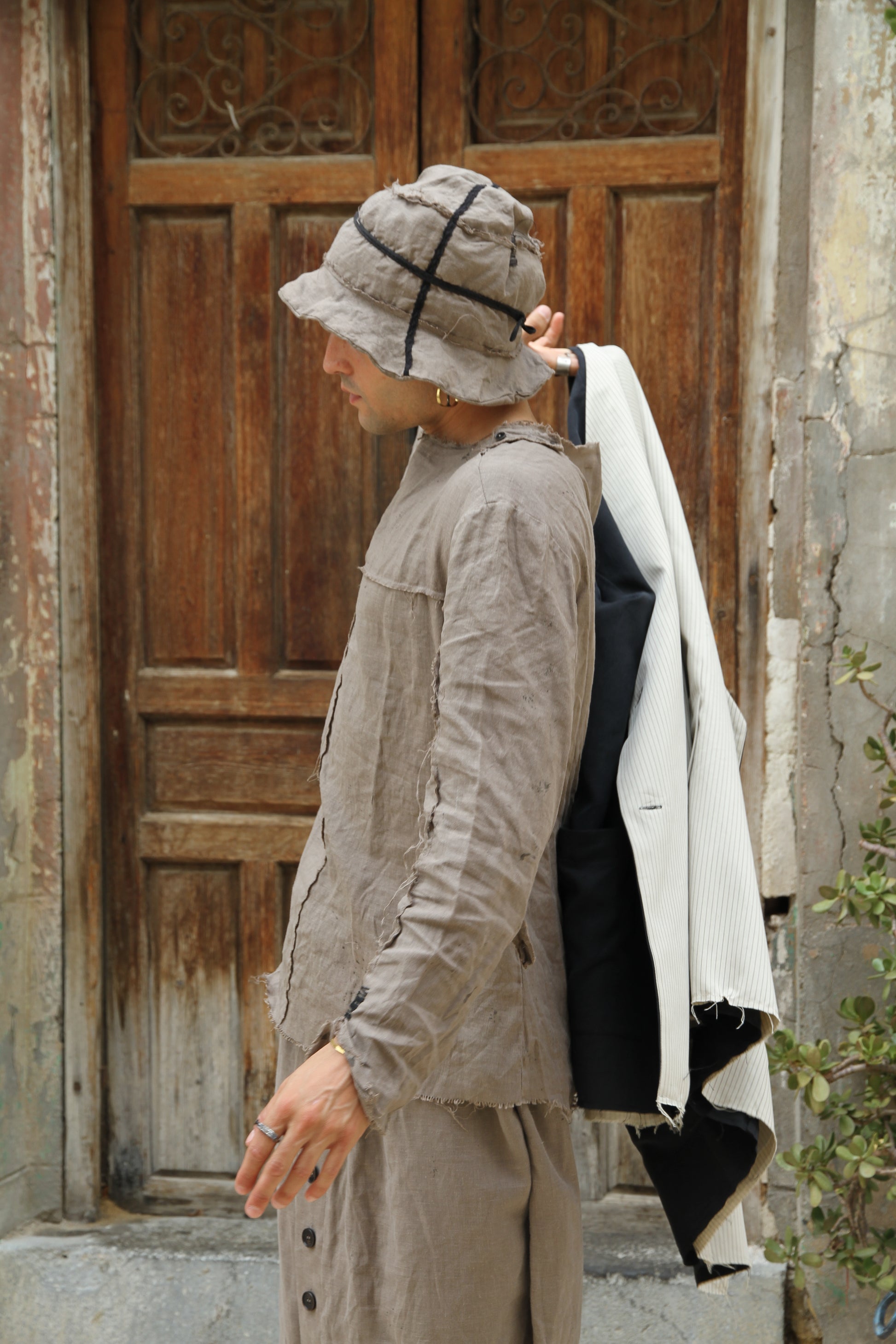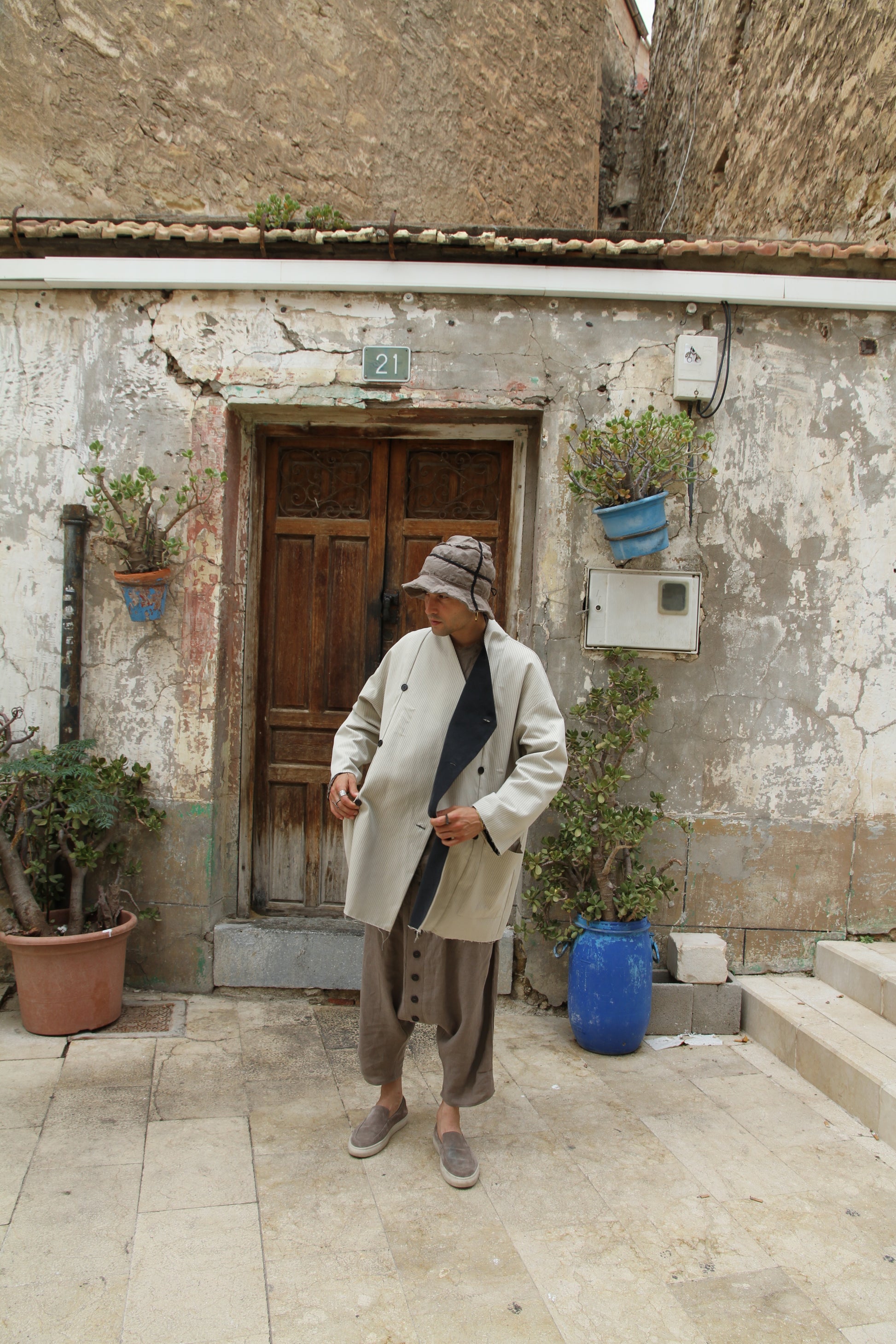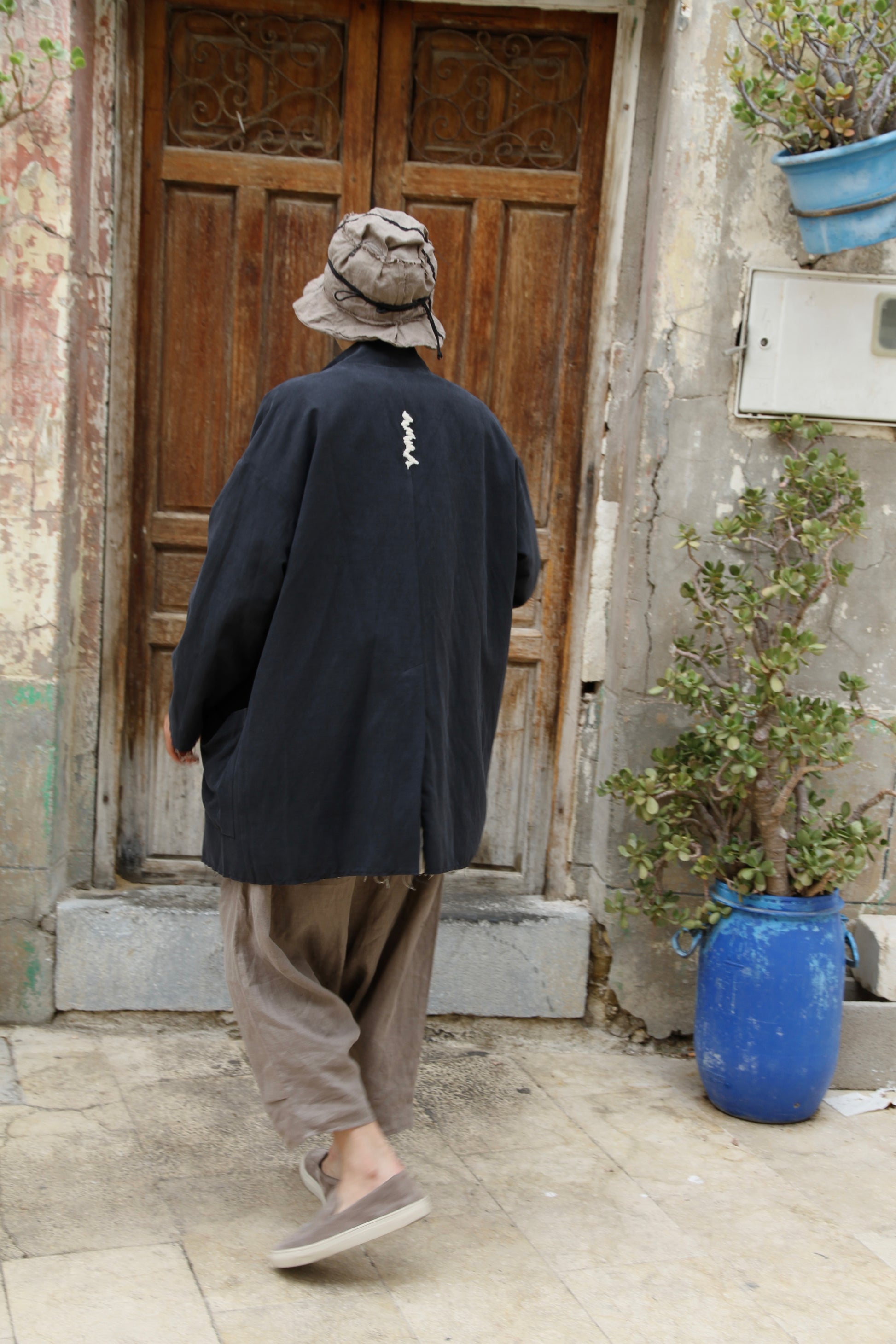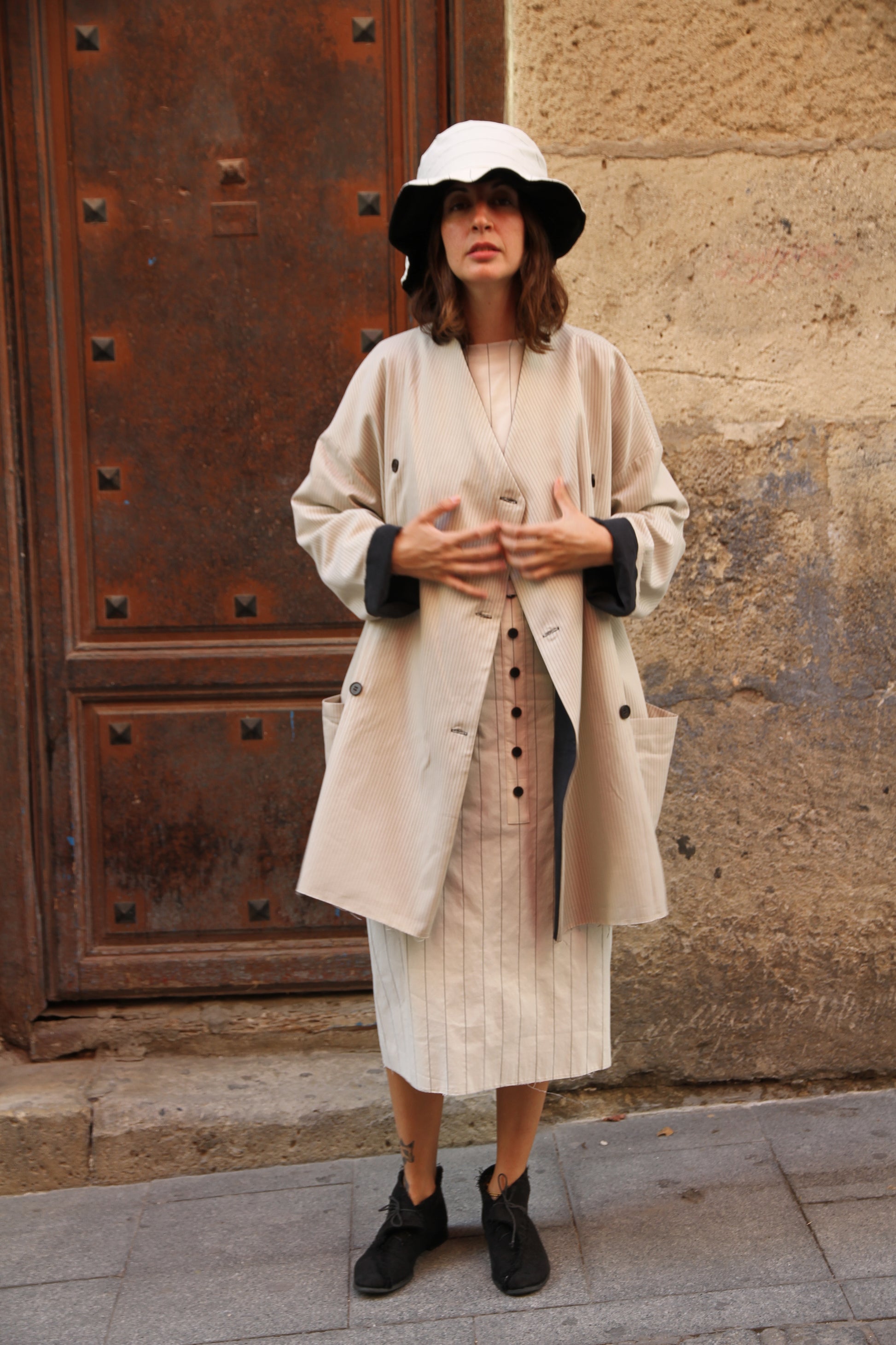 Abrigo reversible con dos bolsillos. Talla extragrande. Contorno máximo de pecho/cintura/cadera: 128 cm, largo de la gabardina: 83 cm y largo de manga: 63 cm. Algodón.
