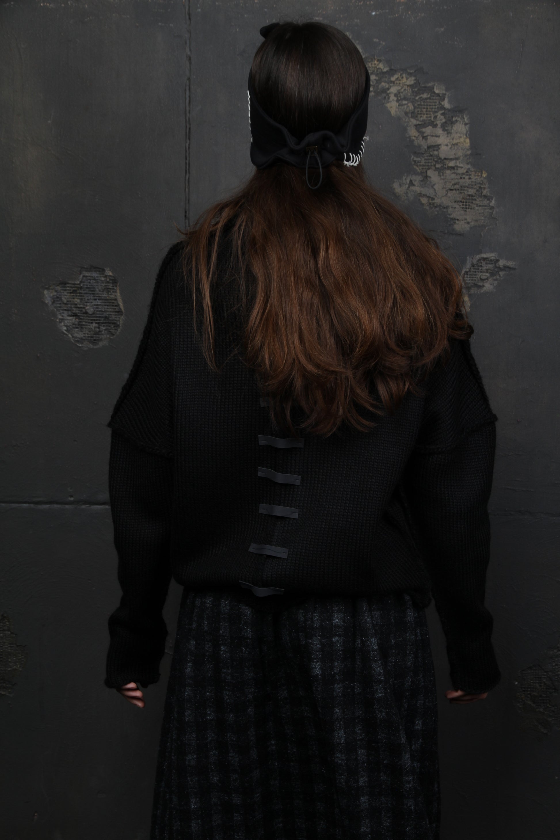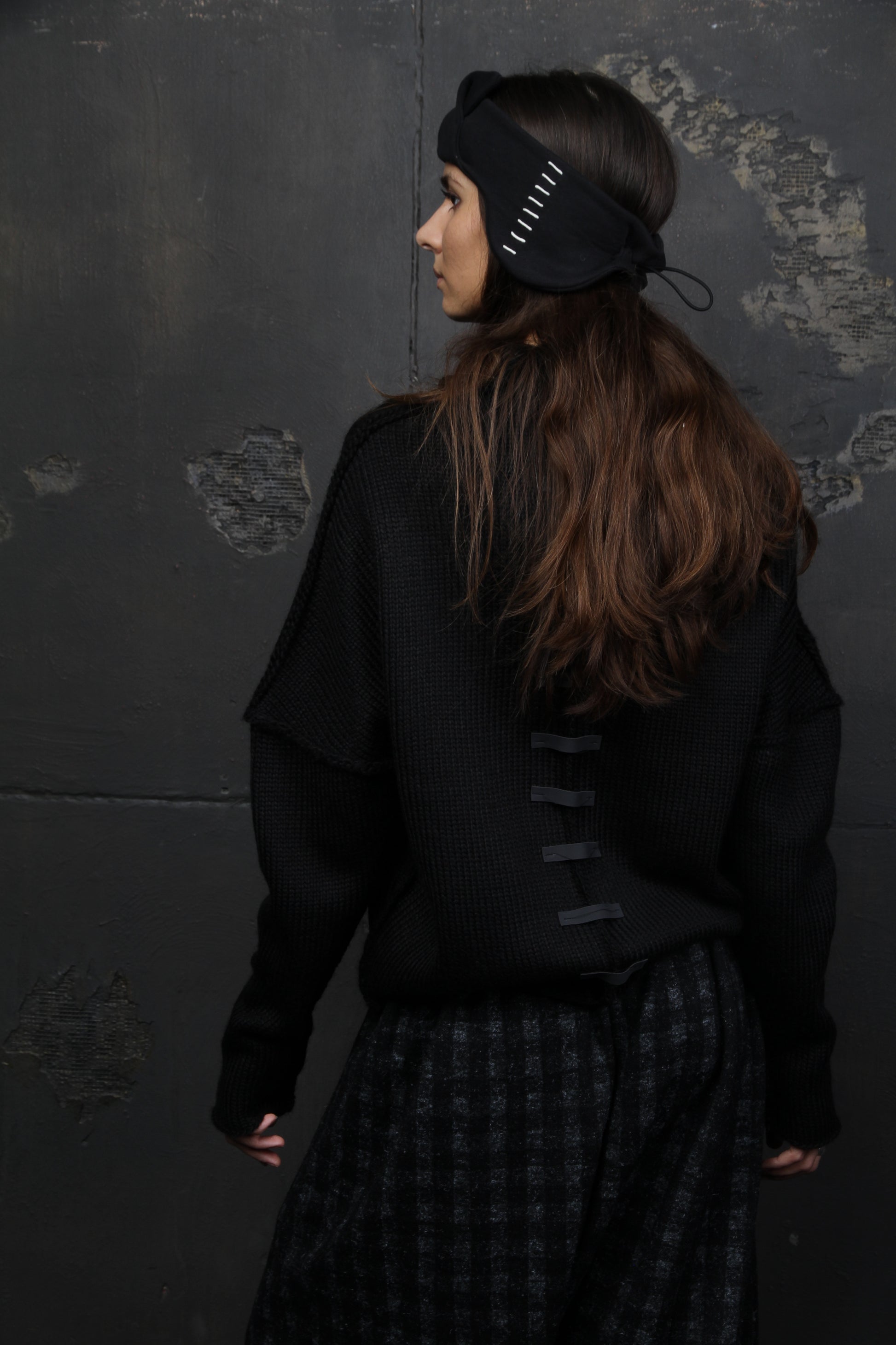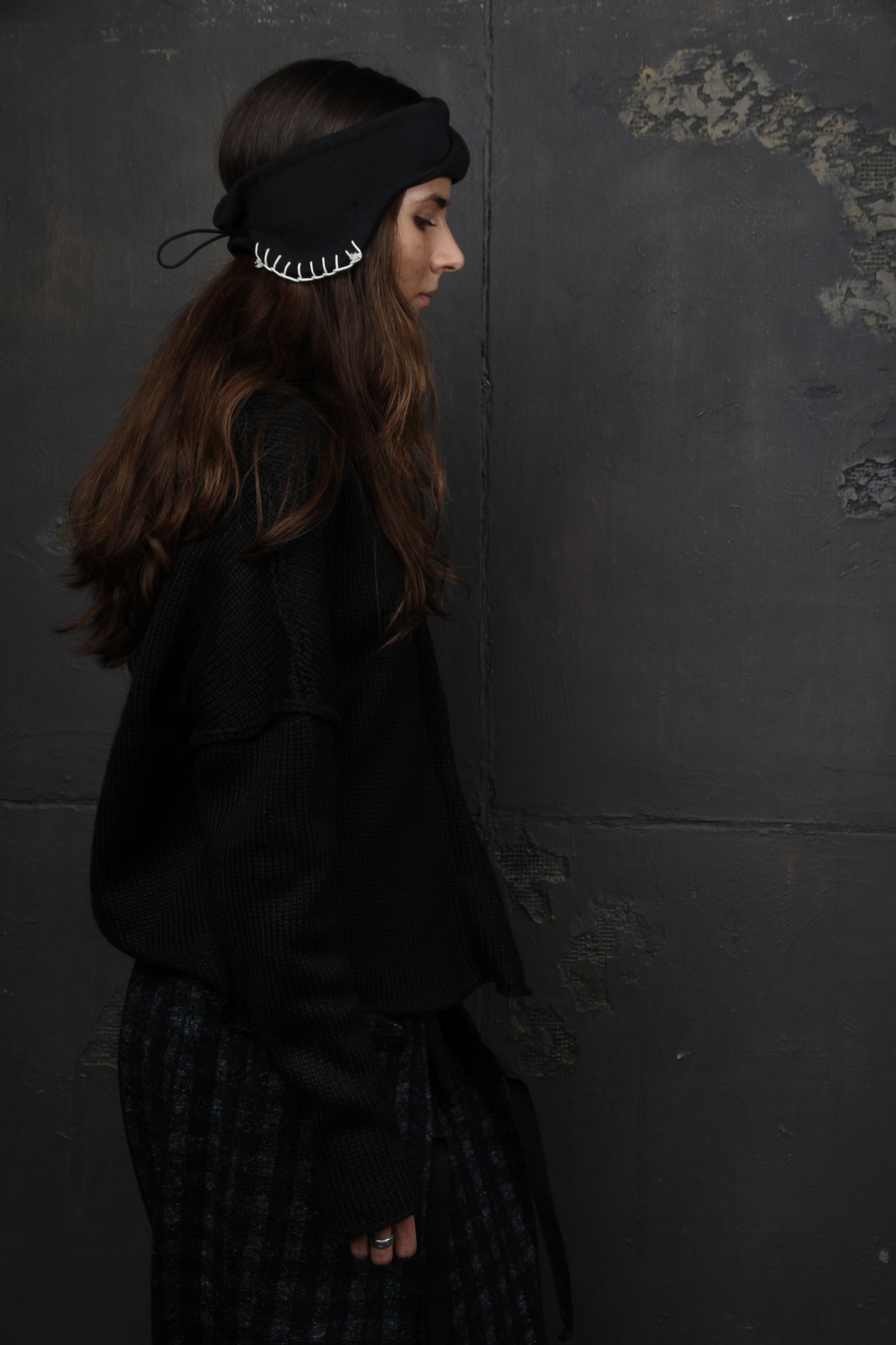 Turbante con drapeado al frente. La circunferencia se ajusta por detrás con un cordón con abrazadera. Los laterales del turbante están decorados con un cordón blanco.