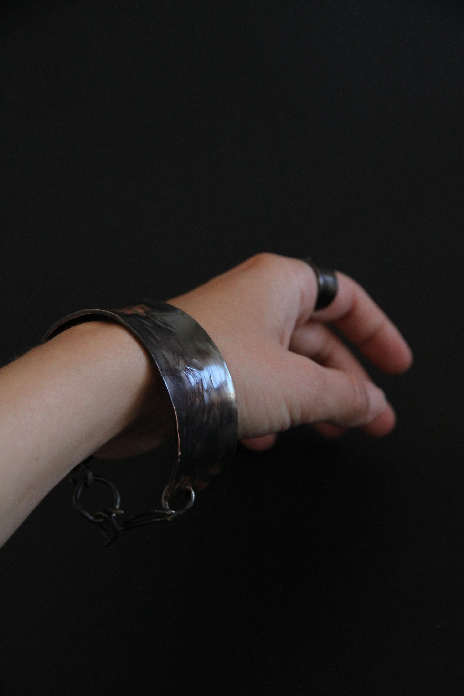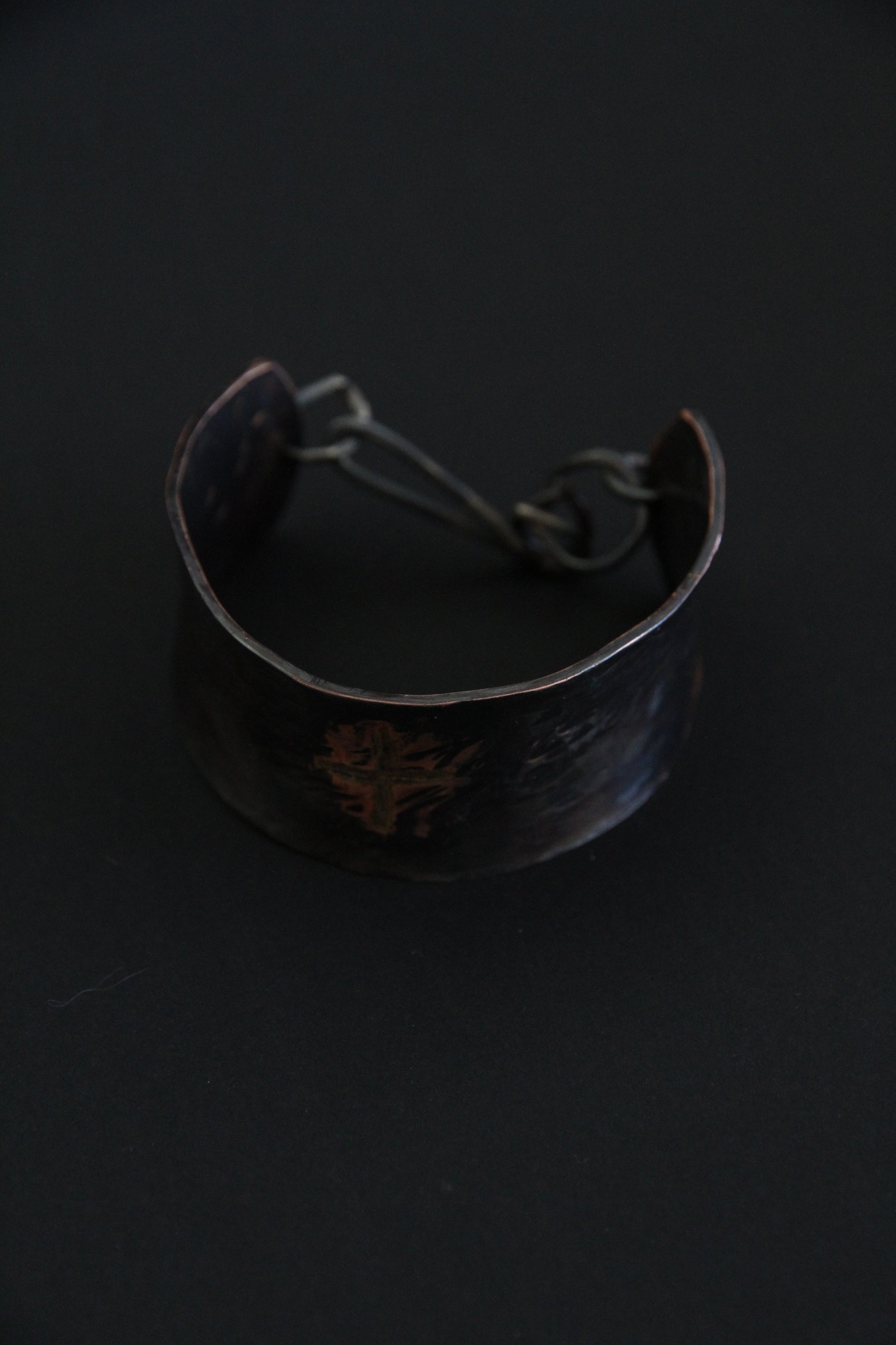 Handcrafted from copper, brass, silver, and alpaca metal, the bracelet combines a wide, open cuff with a raw chain element that physically binds the structure.