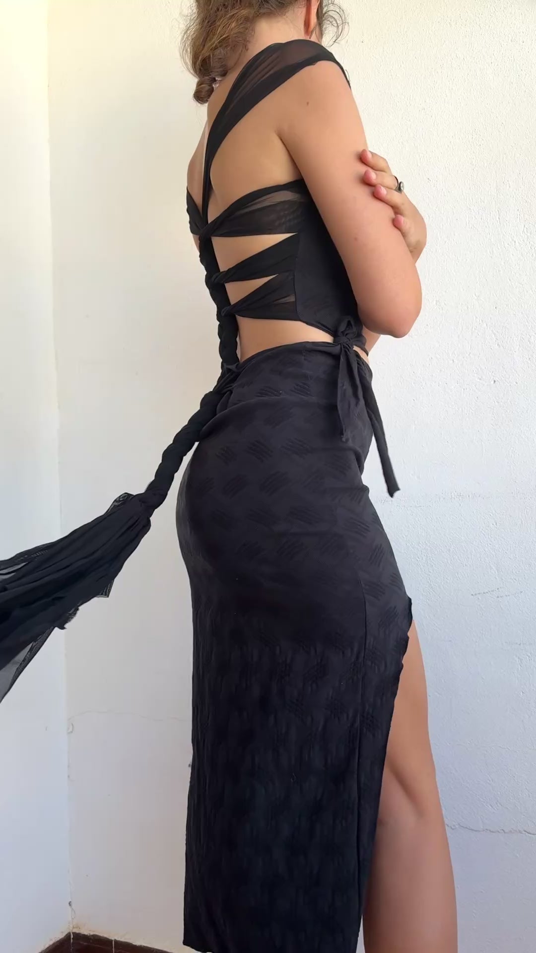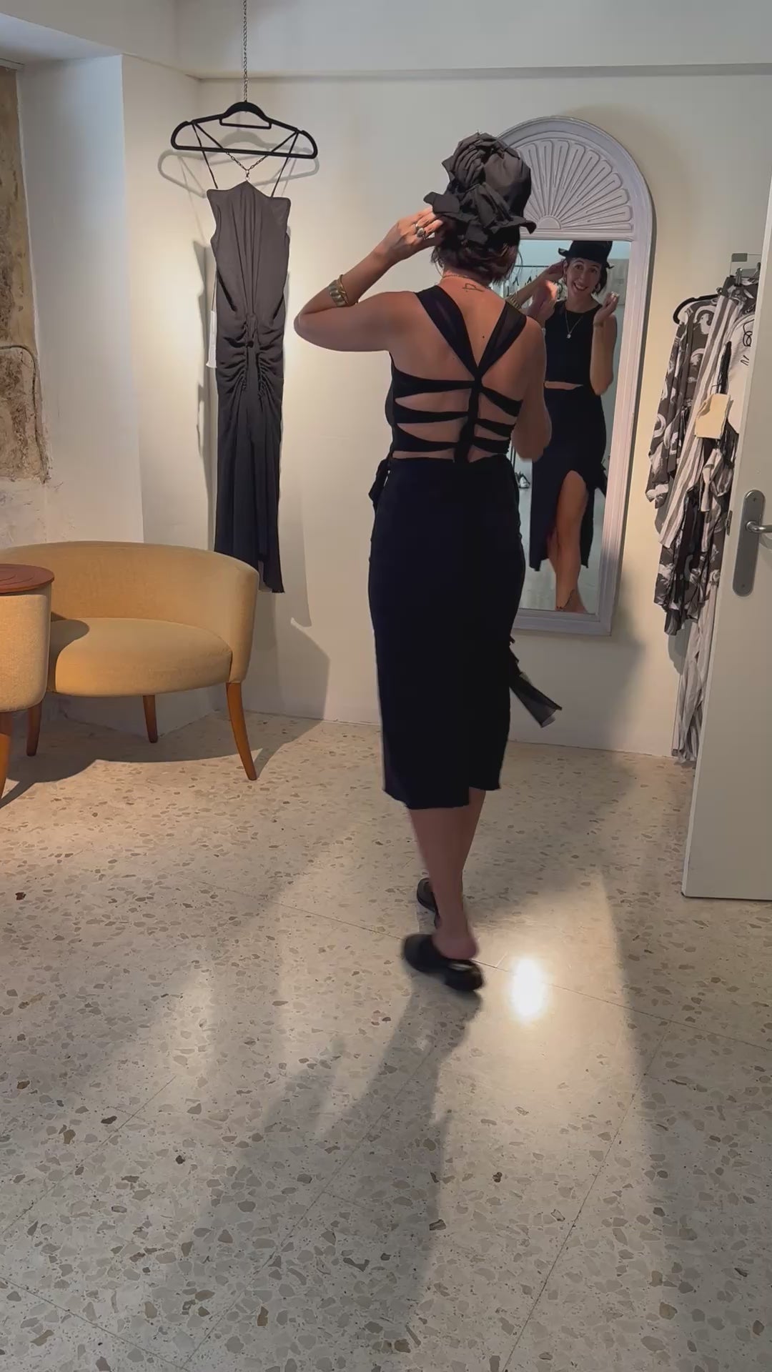 Jersey dress from two part. Open back with braid. Dark blue color.
