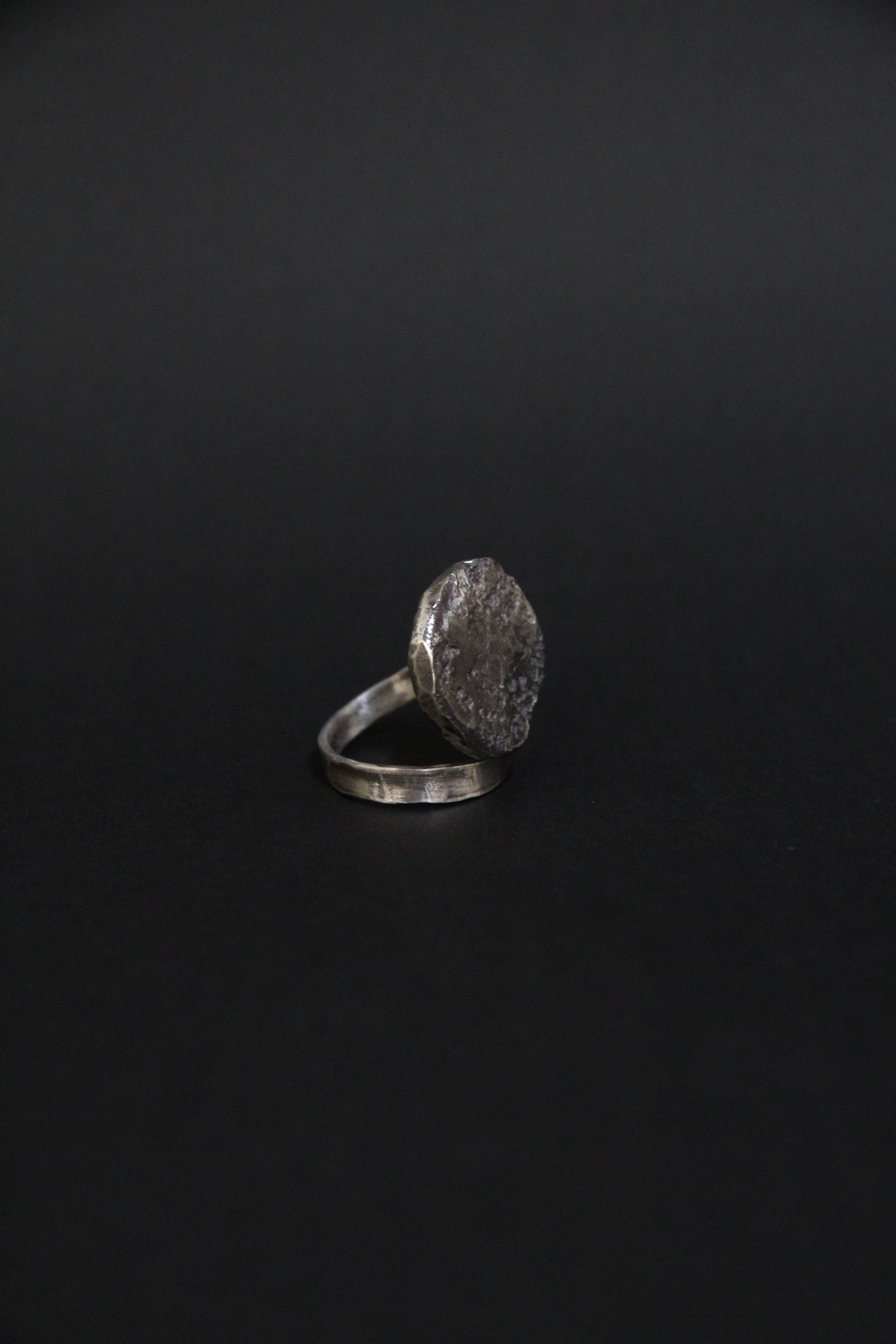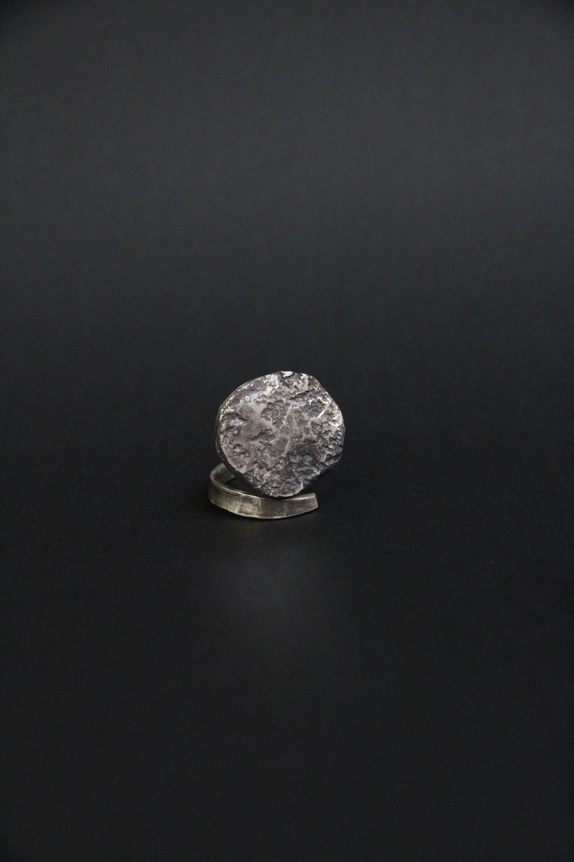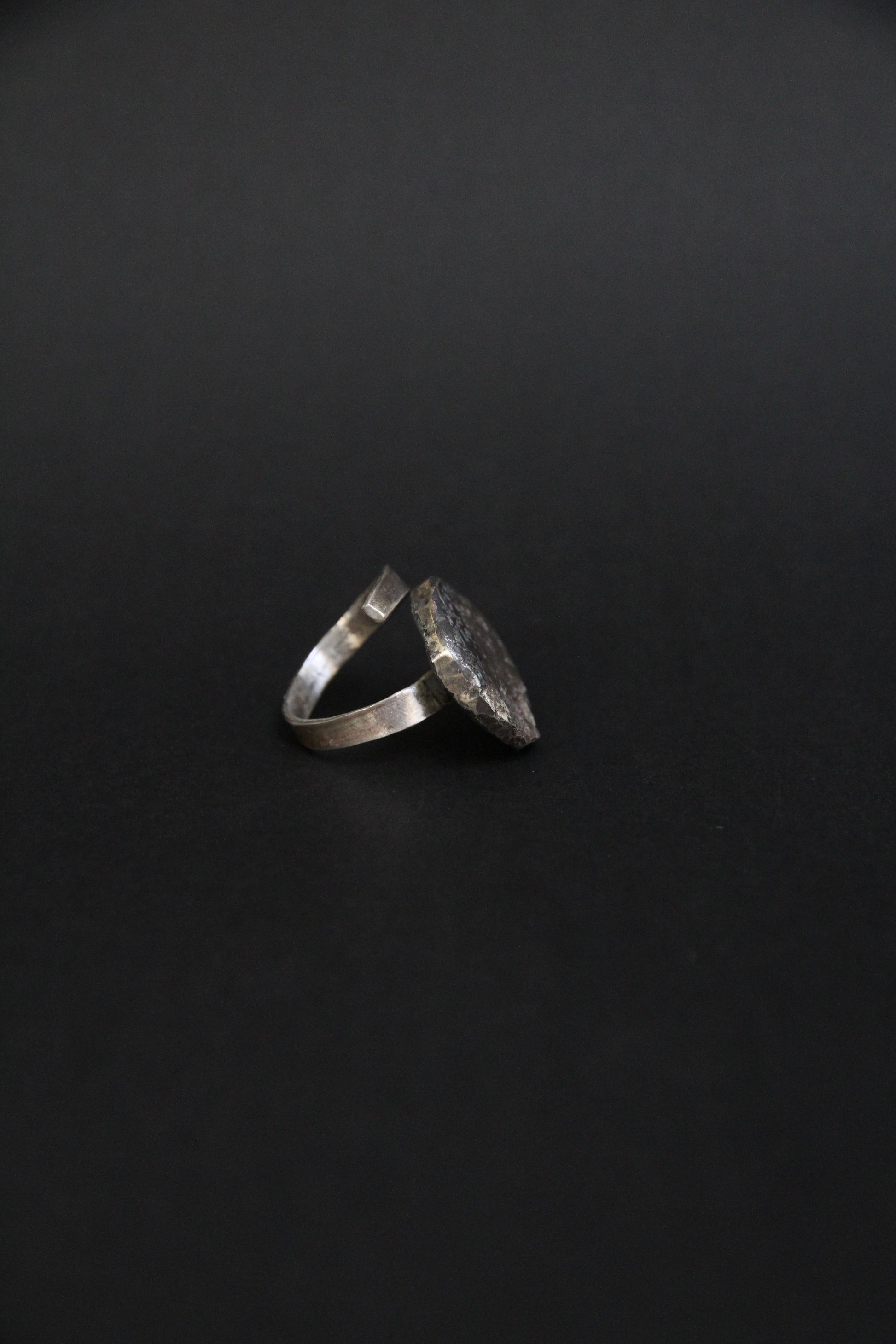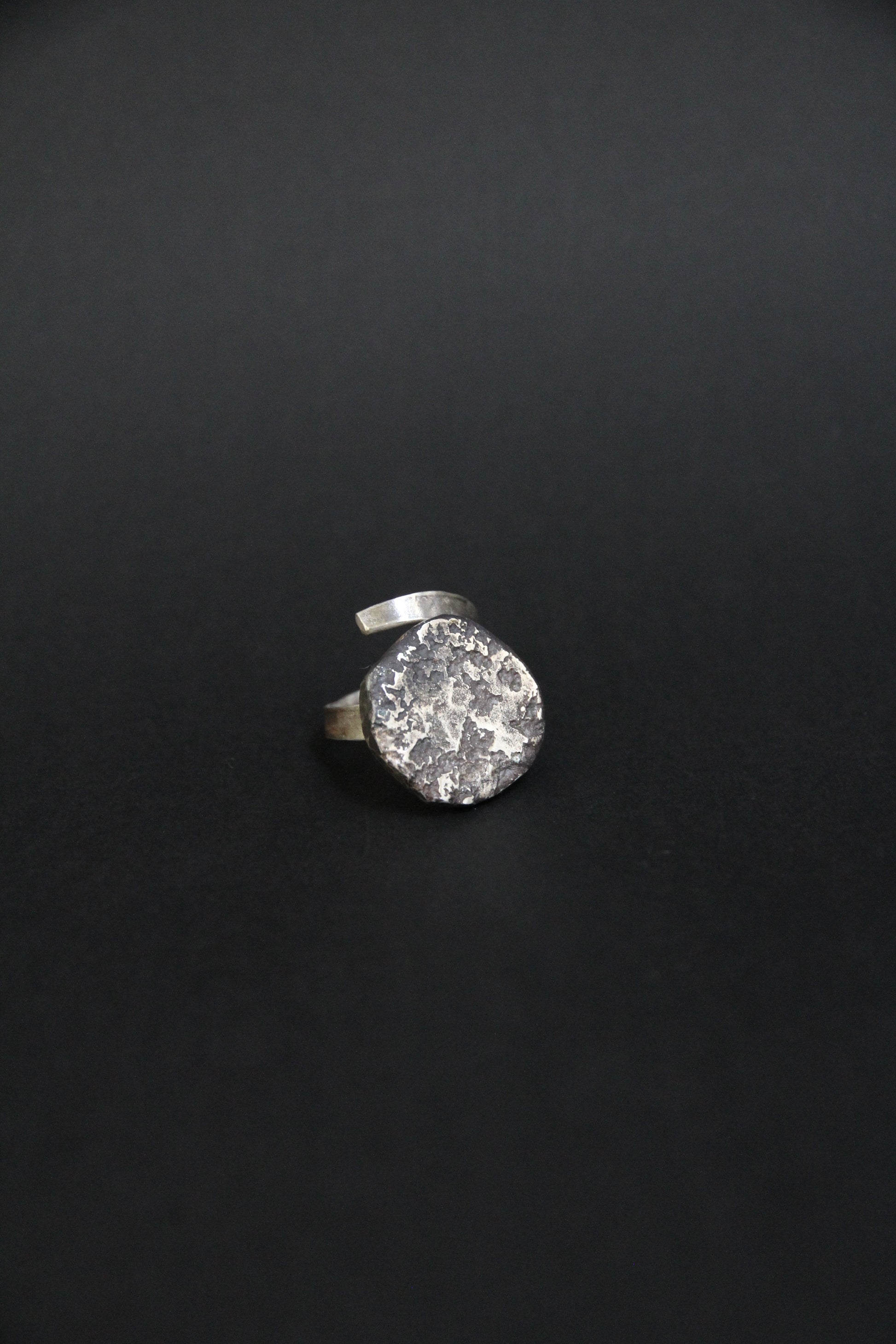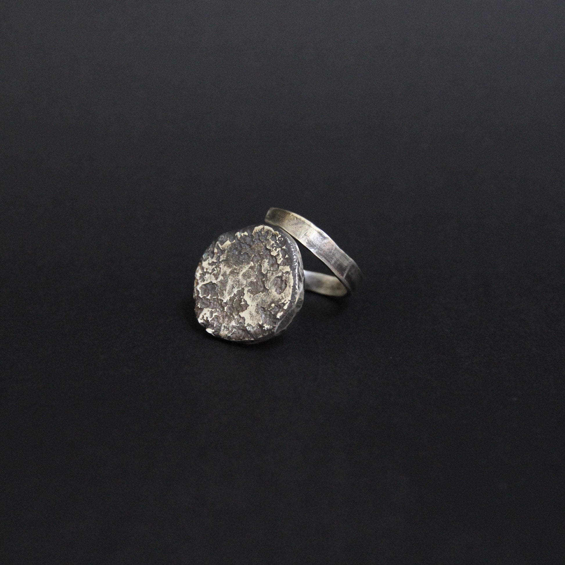 The top element resembles a fragment of molten metal with natural irregularities and a unique meteor-like texture. The open spiral band gently wraps around the finger, adding movement and an artisanal touch.