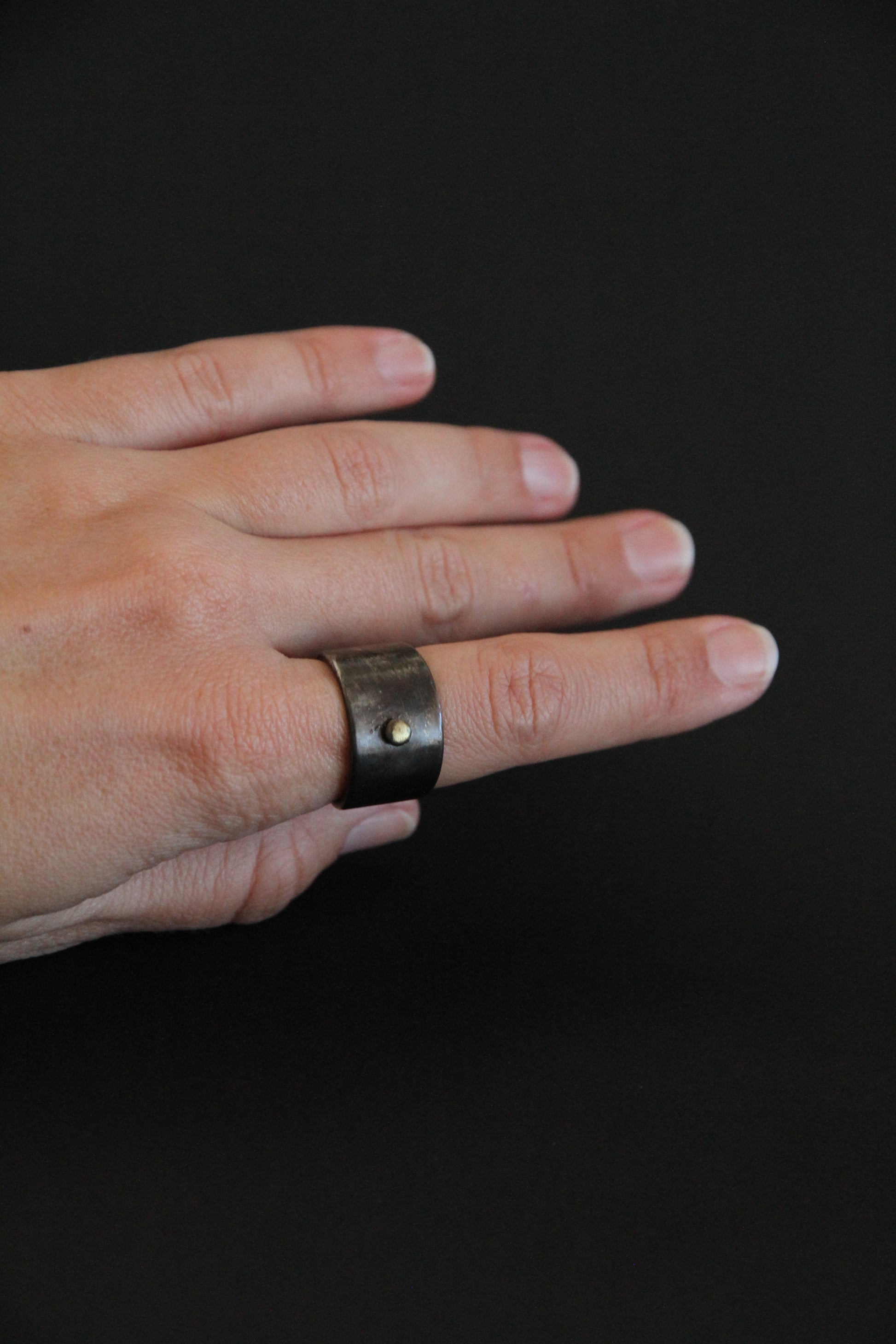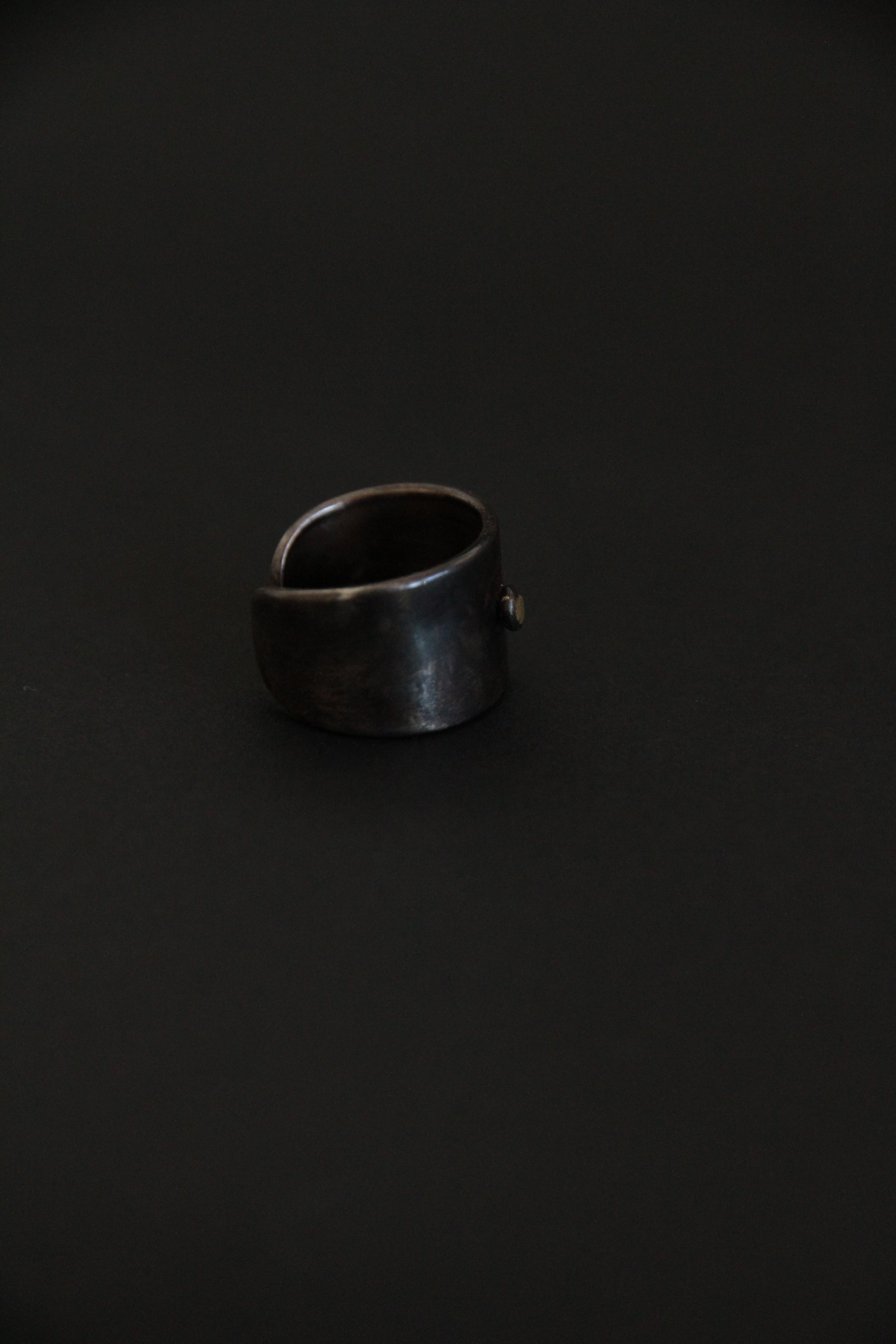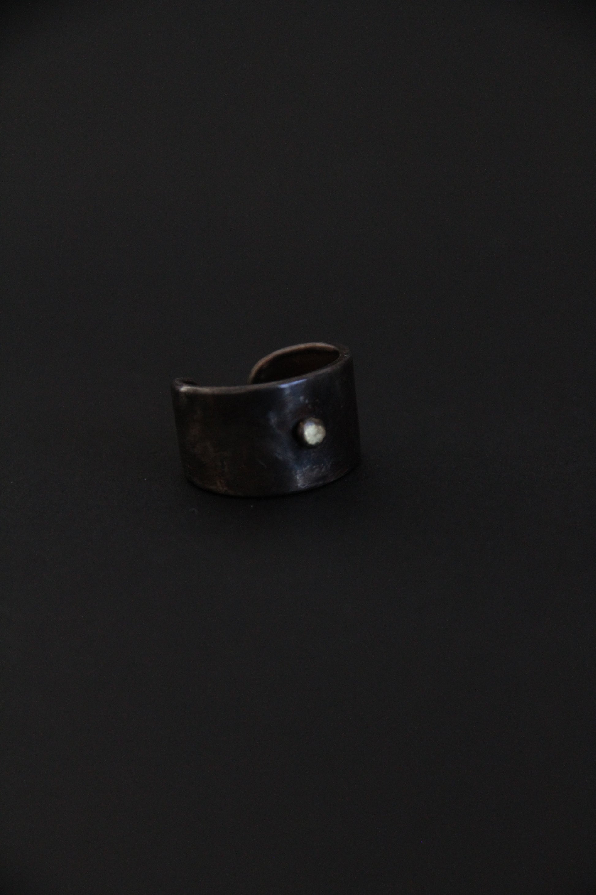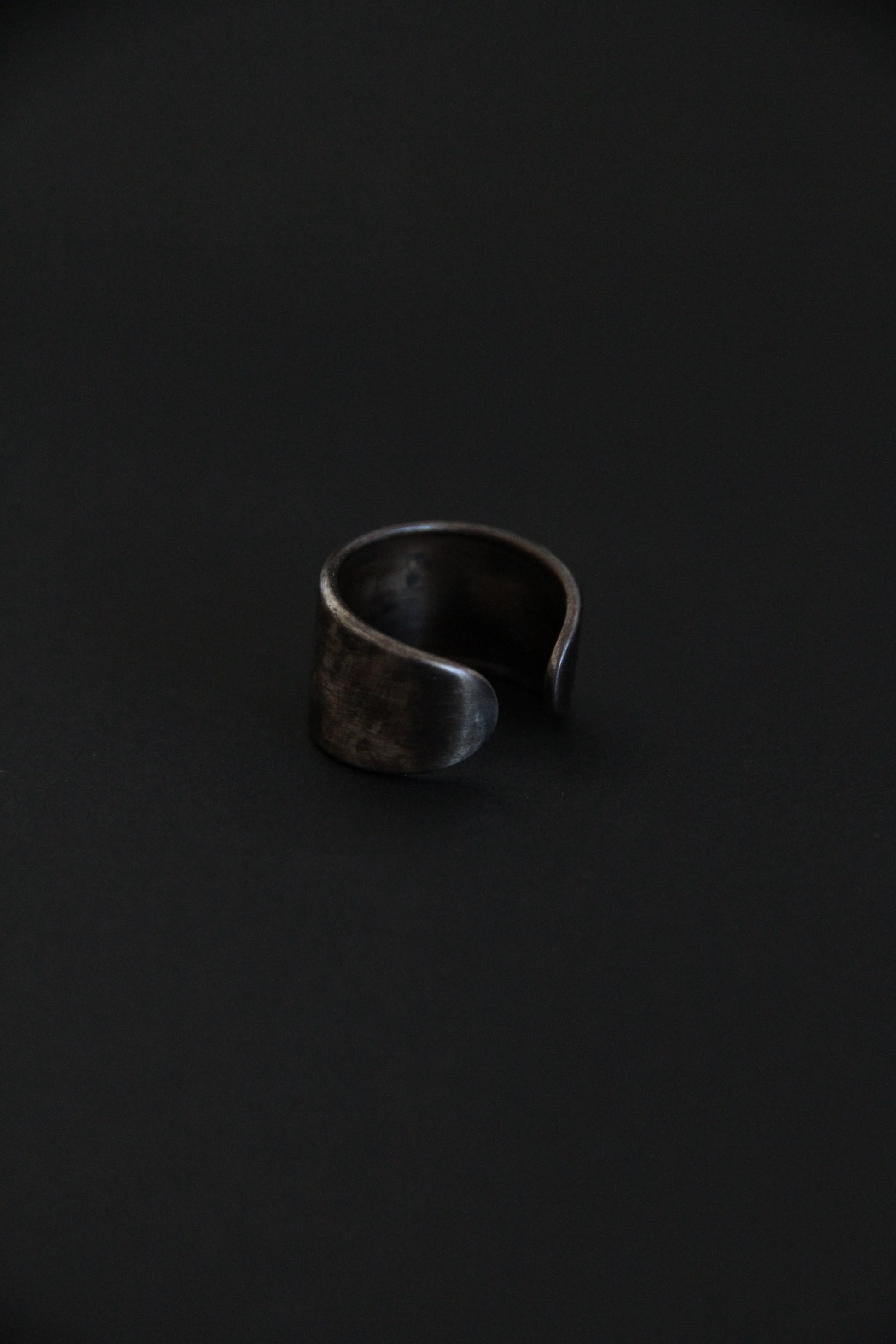 Handcrafted from a raw metal composition of brass, copper, and silver, the ring features an intentionally oxidized, darkened surface with subtle natural irregularities.