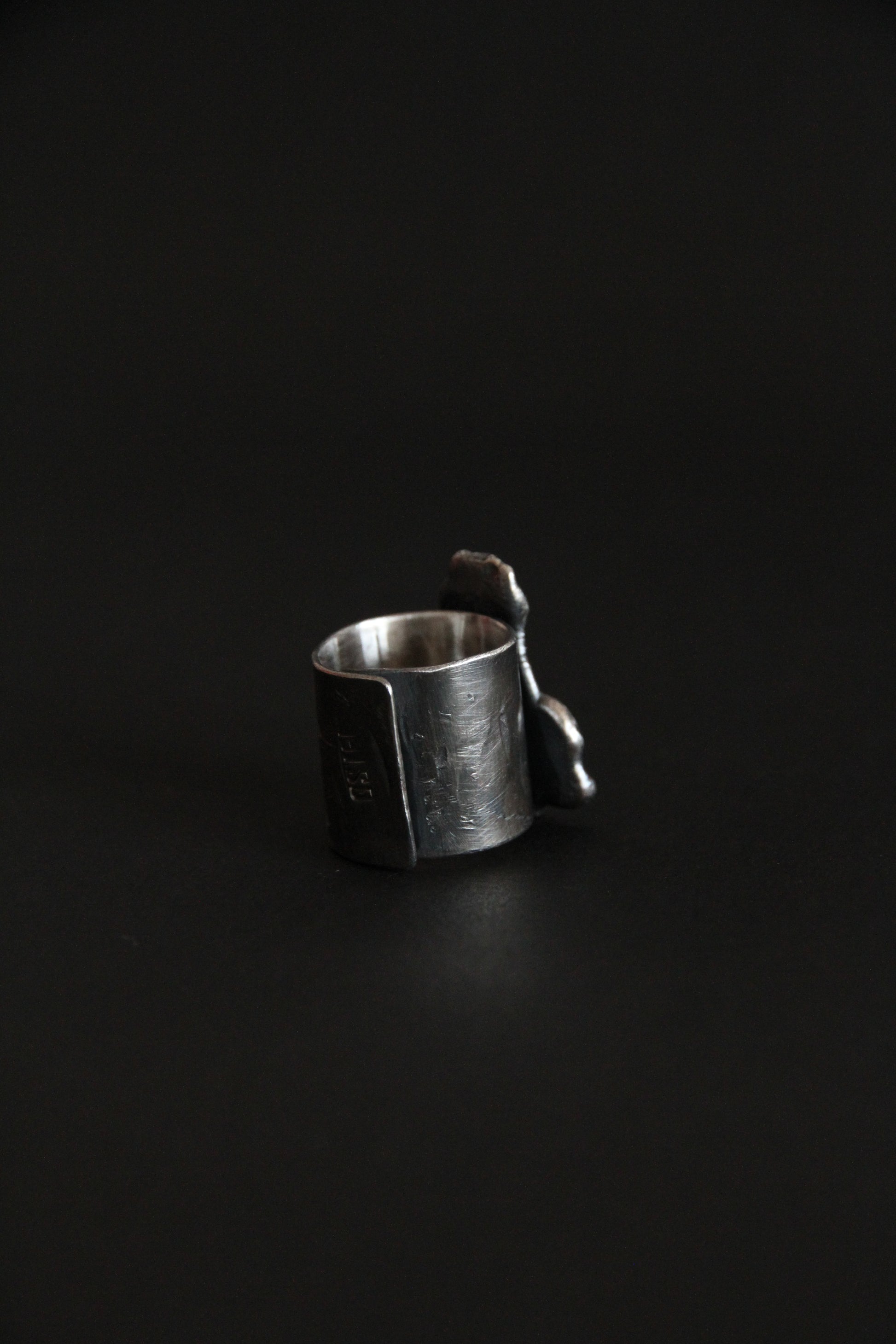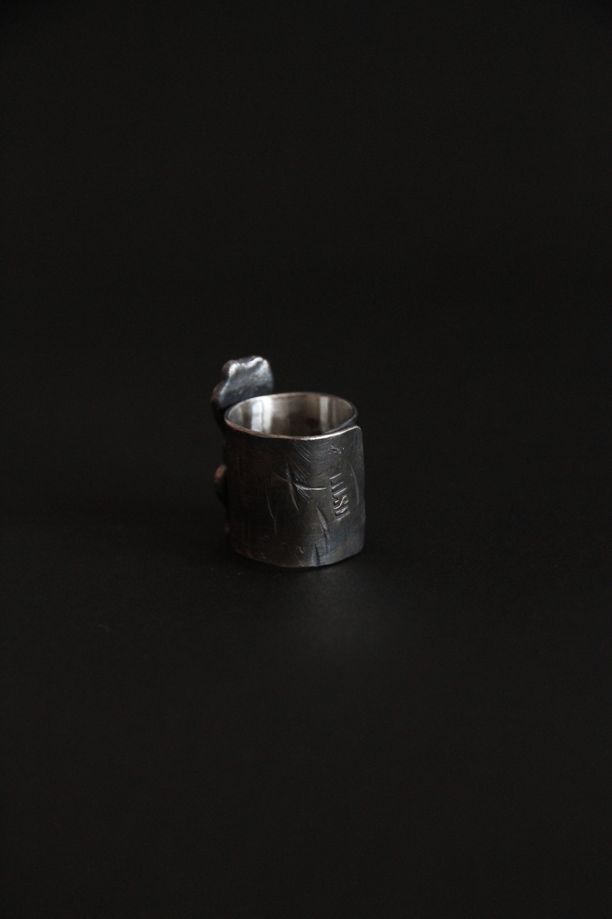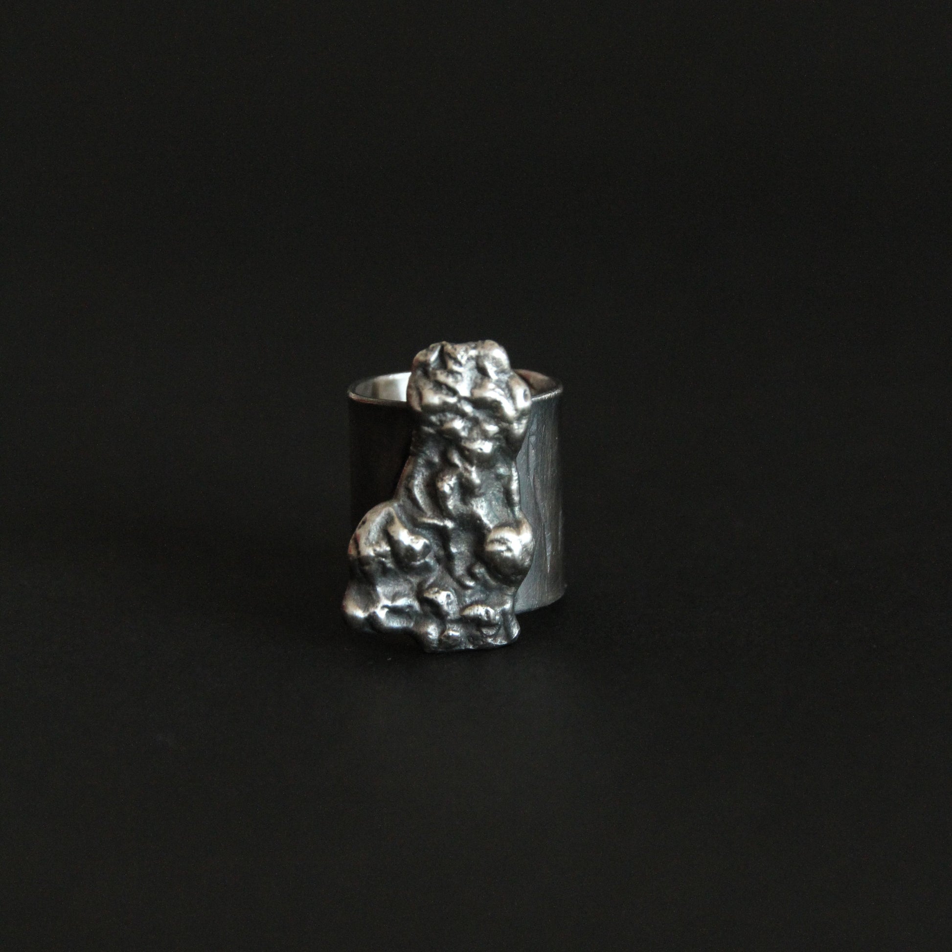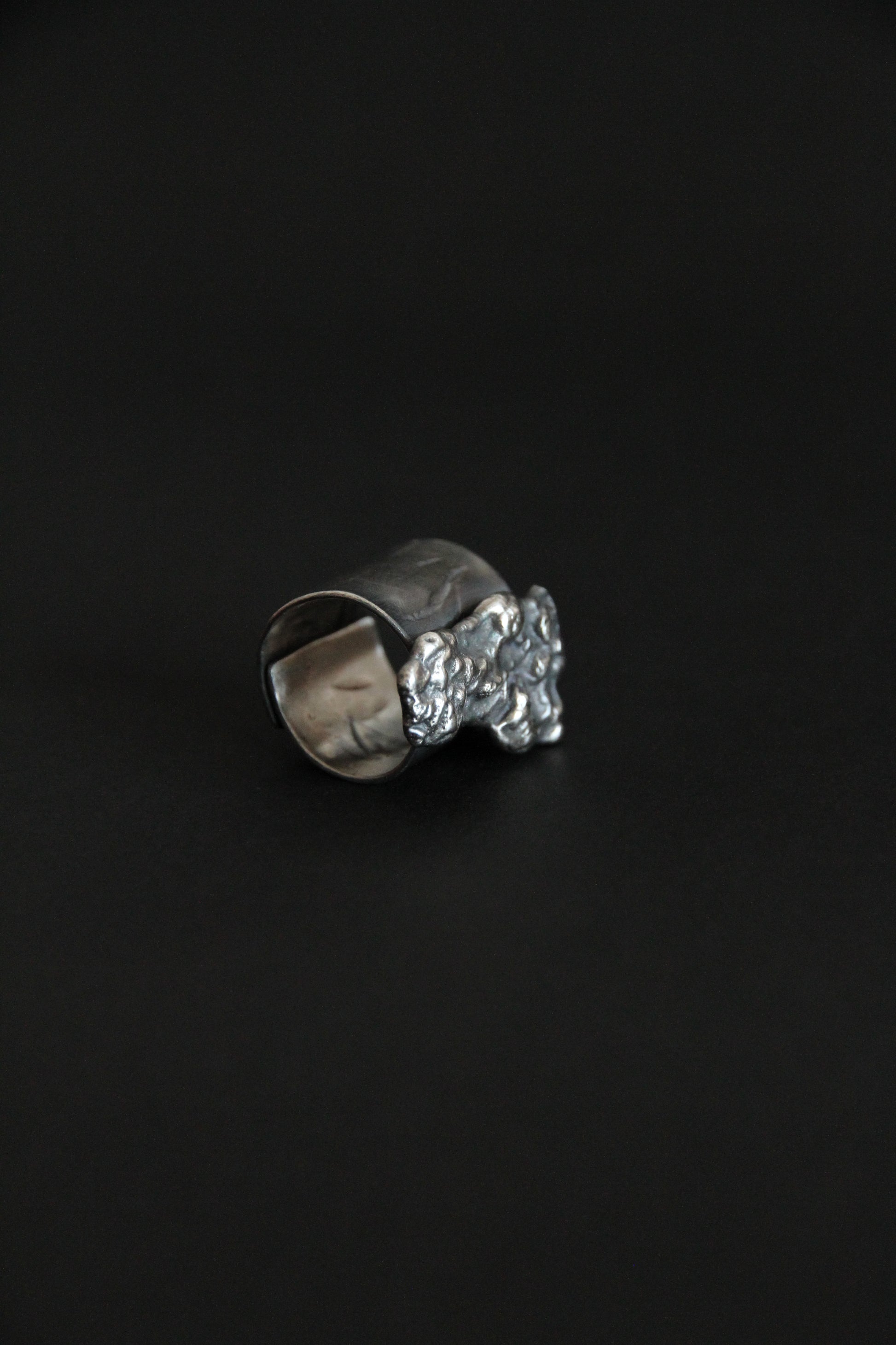 An oversized silver ring shaped by raw texture and organic flow. The sculptural surface rises from the band like a natural formation, marked by irregular folds, softened edges, and traces of handwork. Darkened recesses contrast with polished highlights, emphasizing depth and movement.