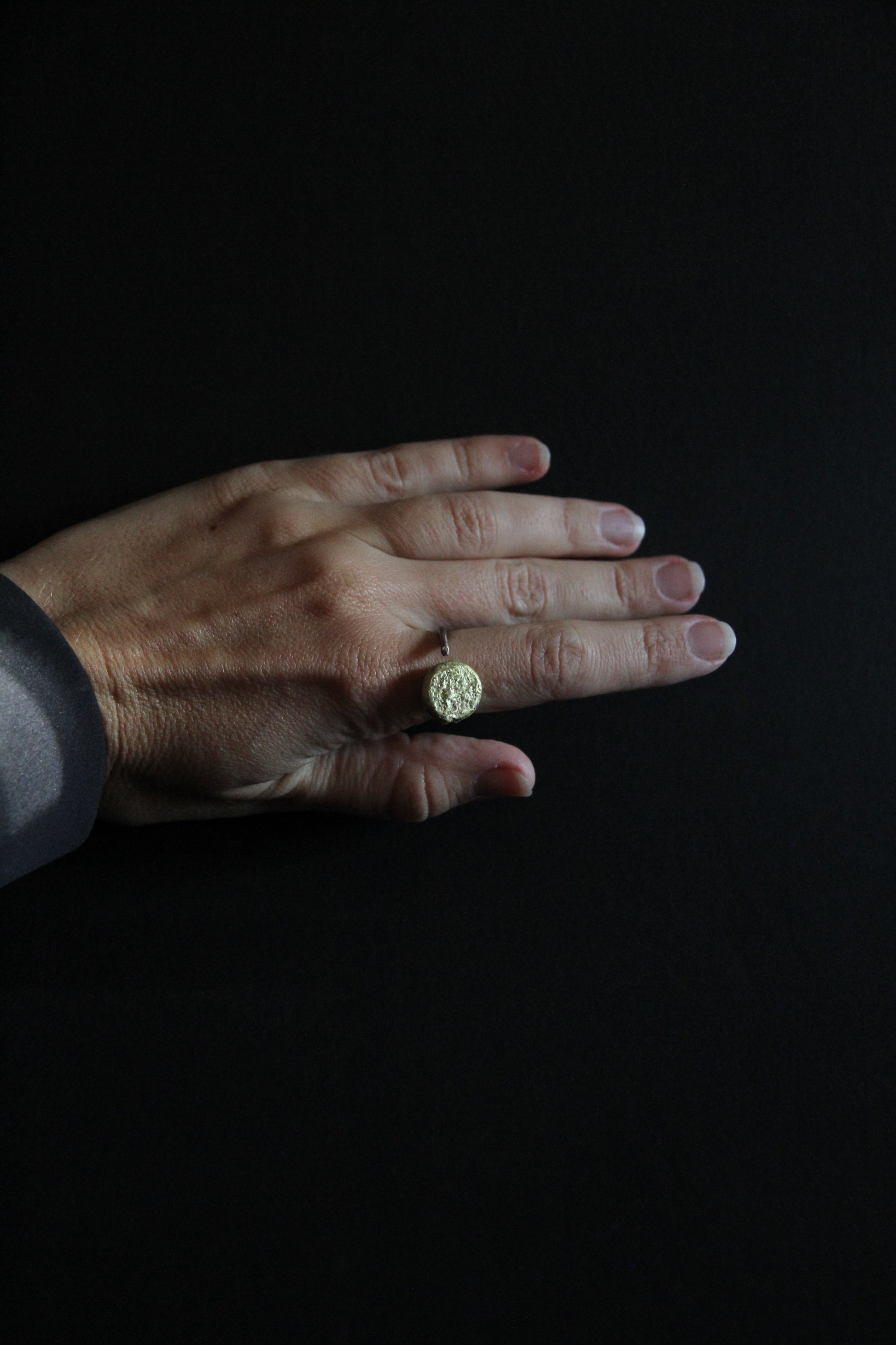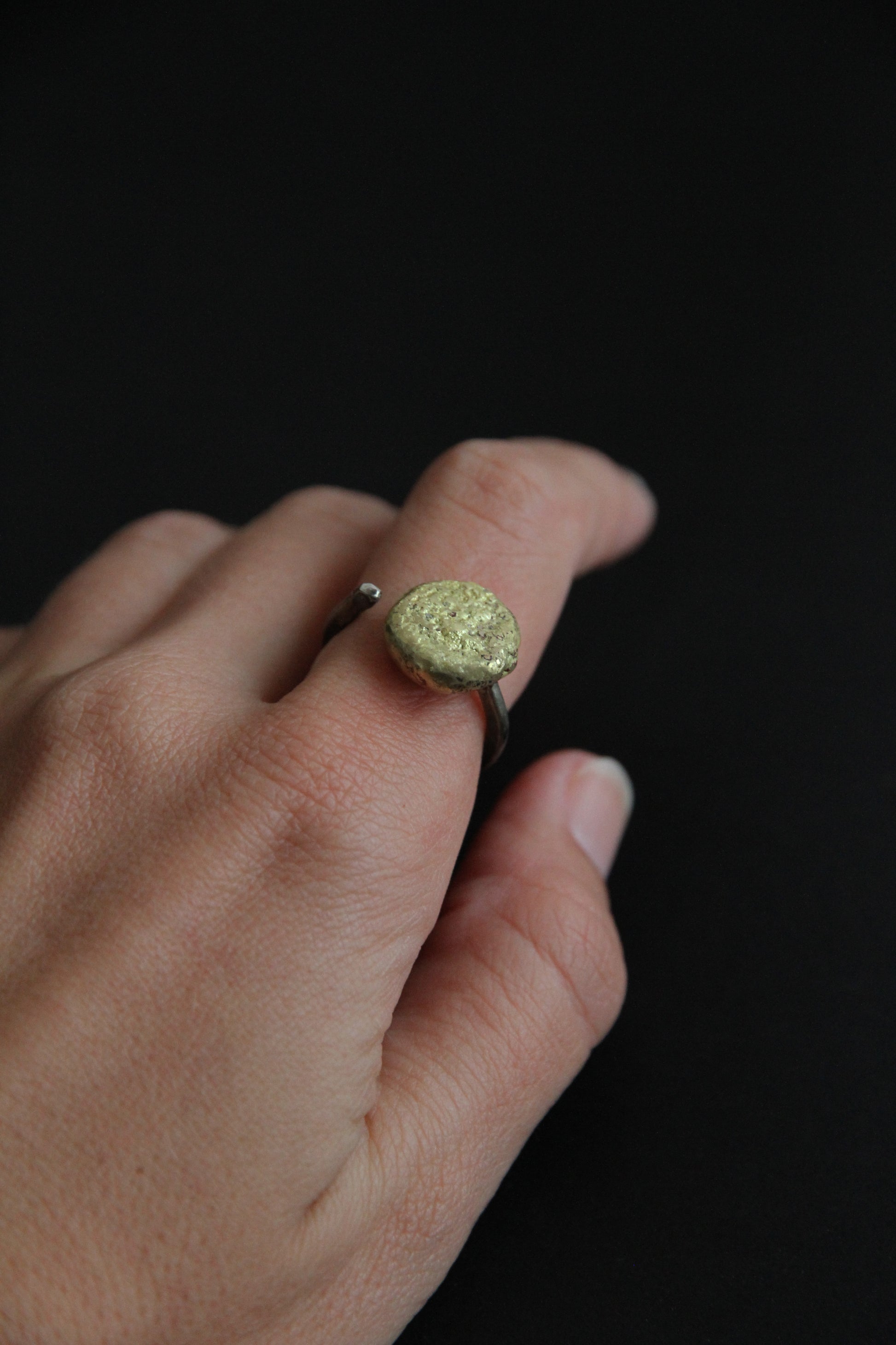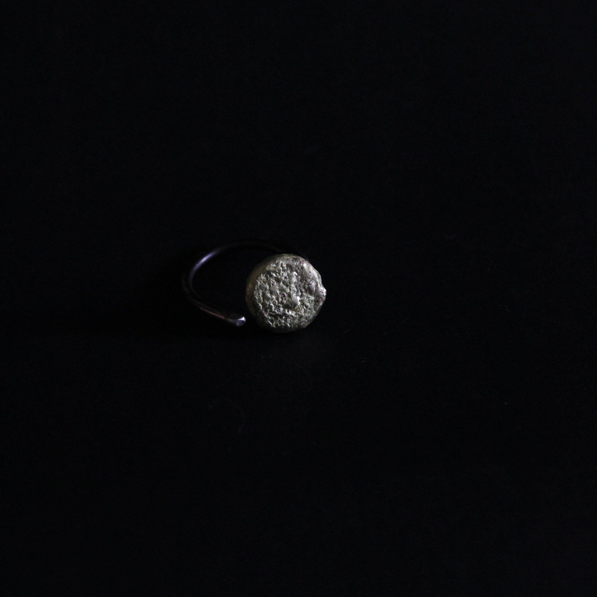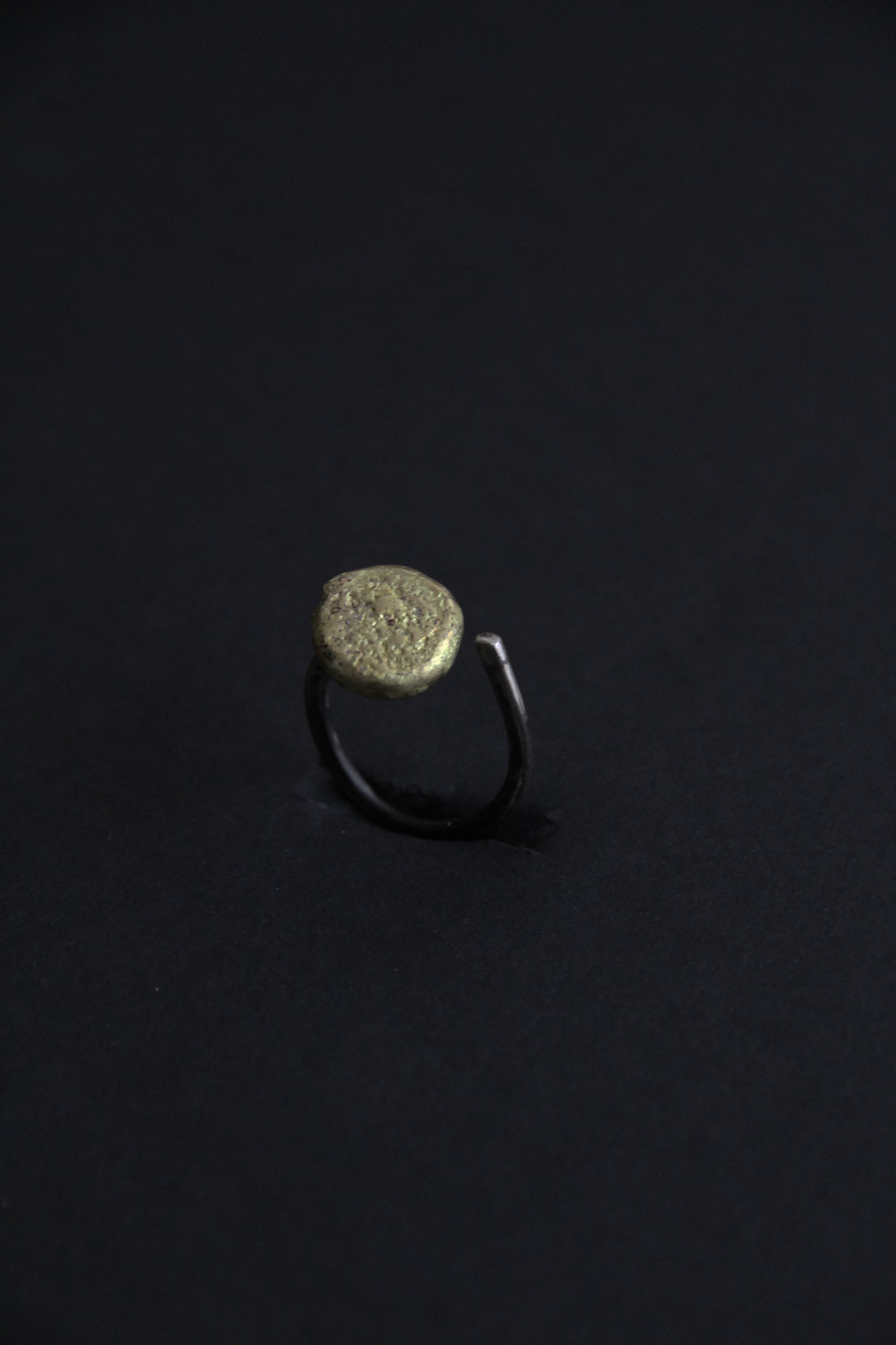 A minimalist open ring crafted from oxidized alpaca silver and crowned with a raw brass “coin” element. The textured molten surface gives it an ancient, solar-like character — understated, sculptural, and effortlessly organic.