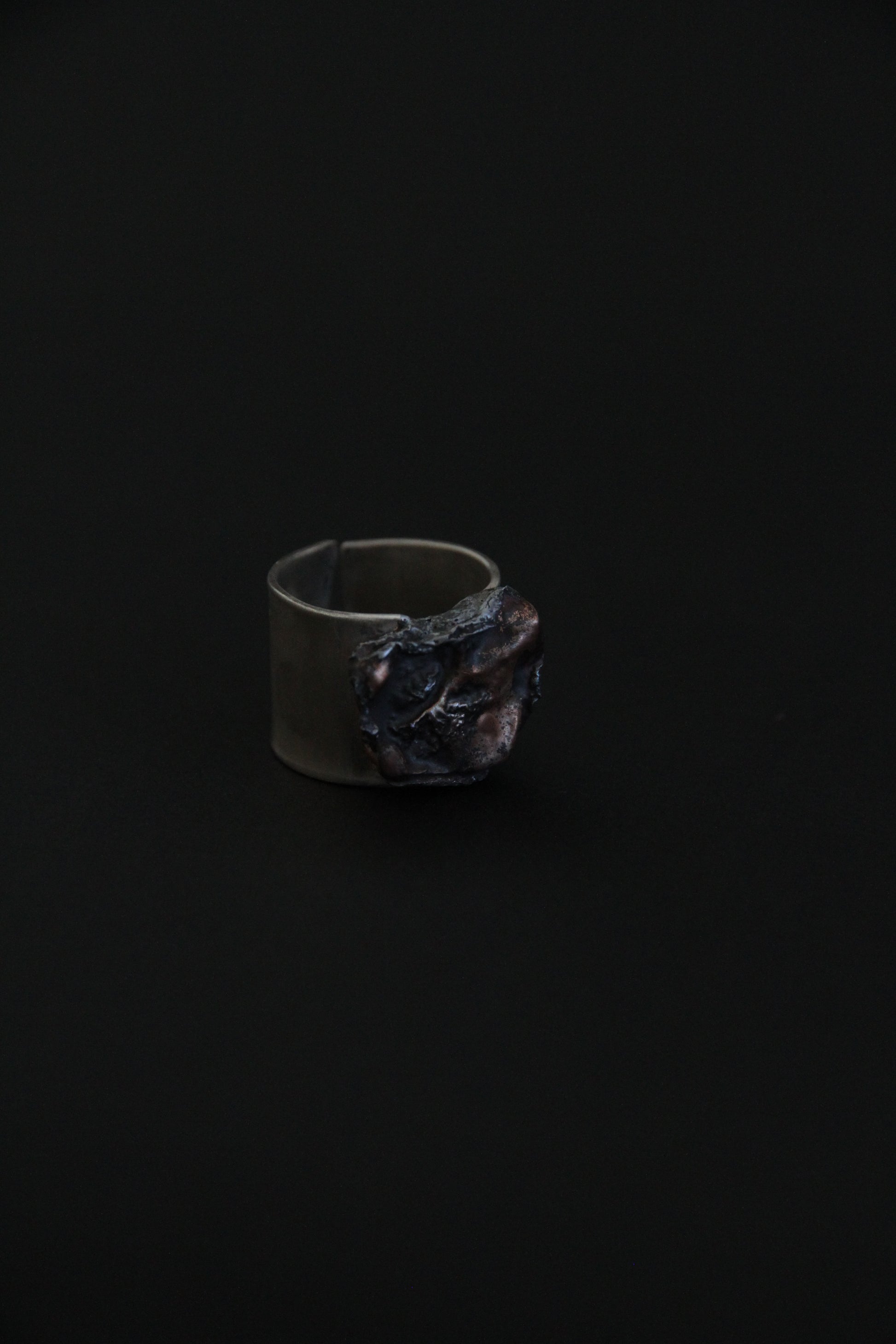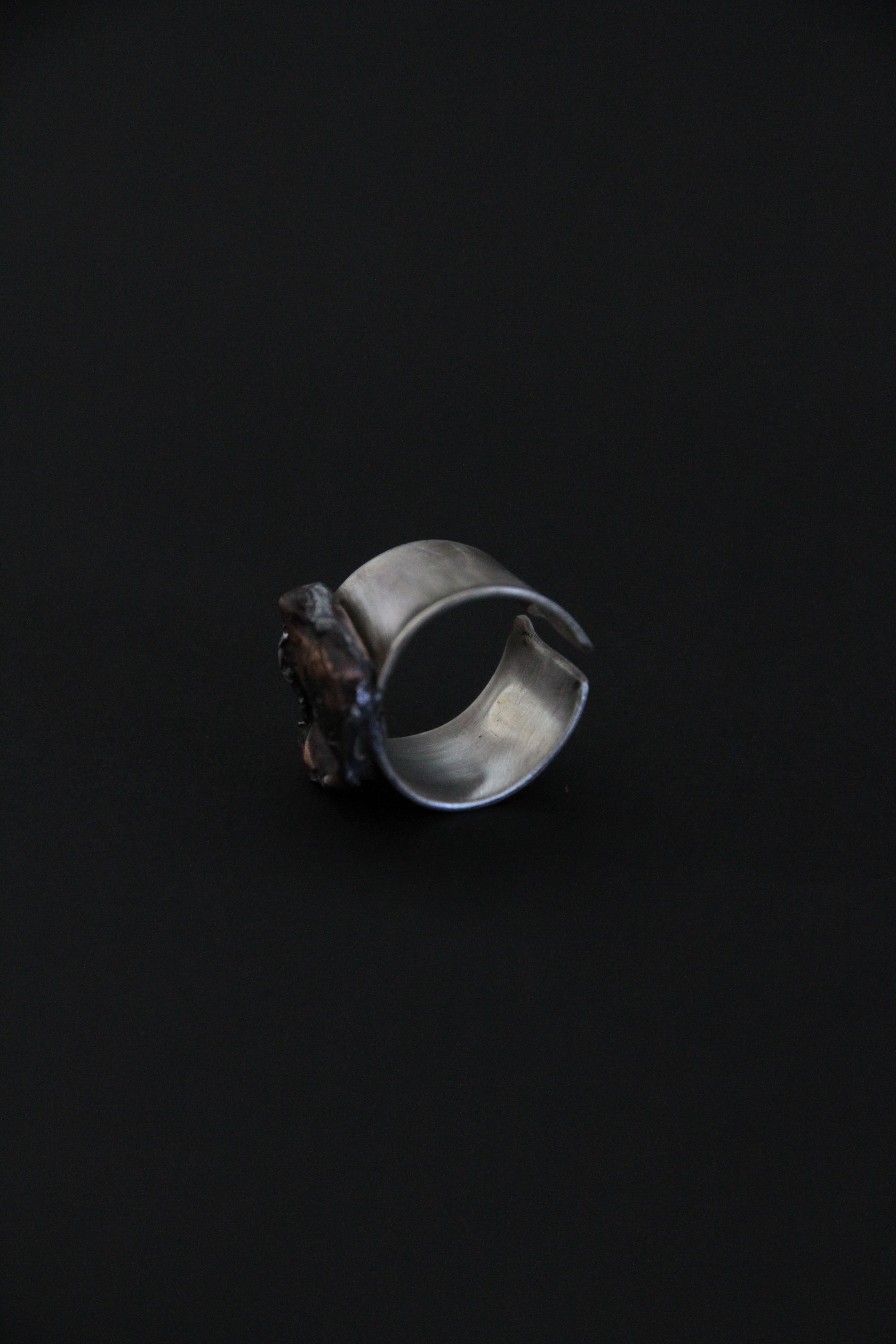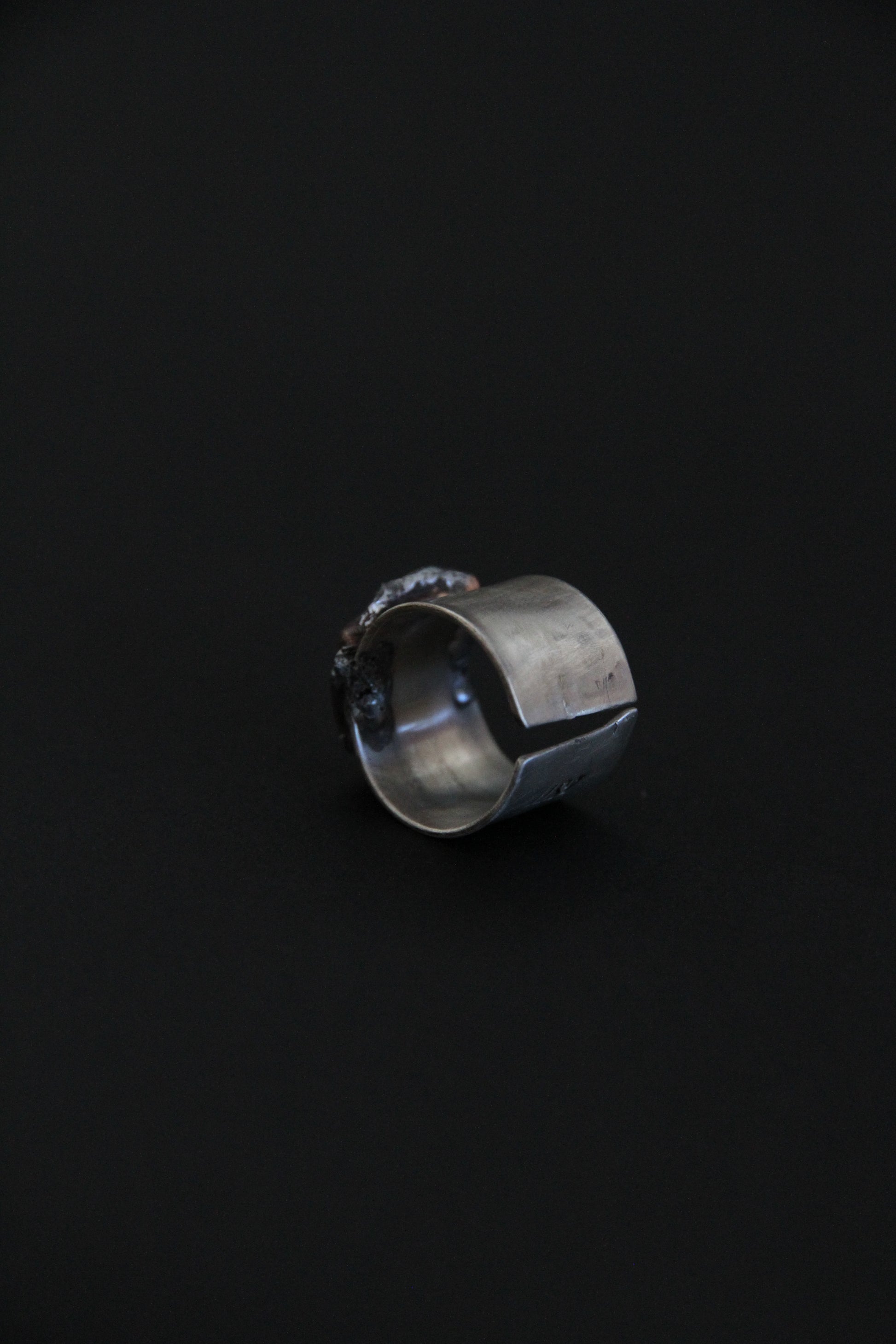 Handcrafted from silver, copper, and brass, the ring combines a smooth, wide band with an organically formed metal fragment, preserved in its imperfect state.