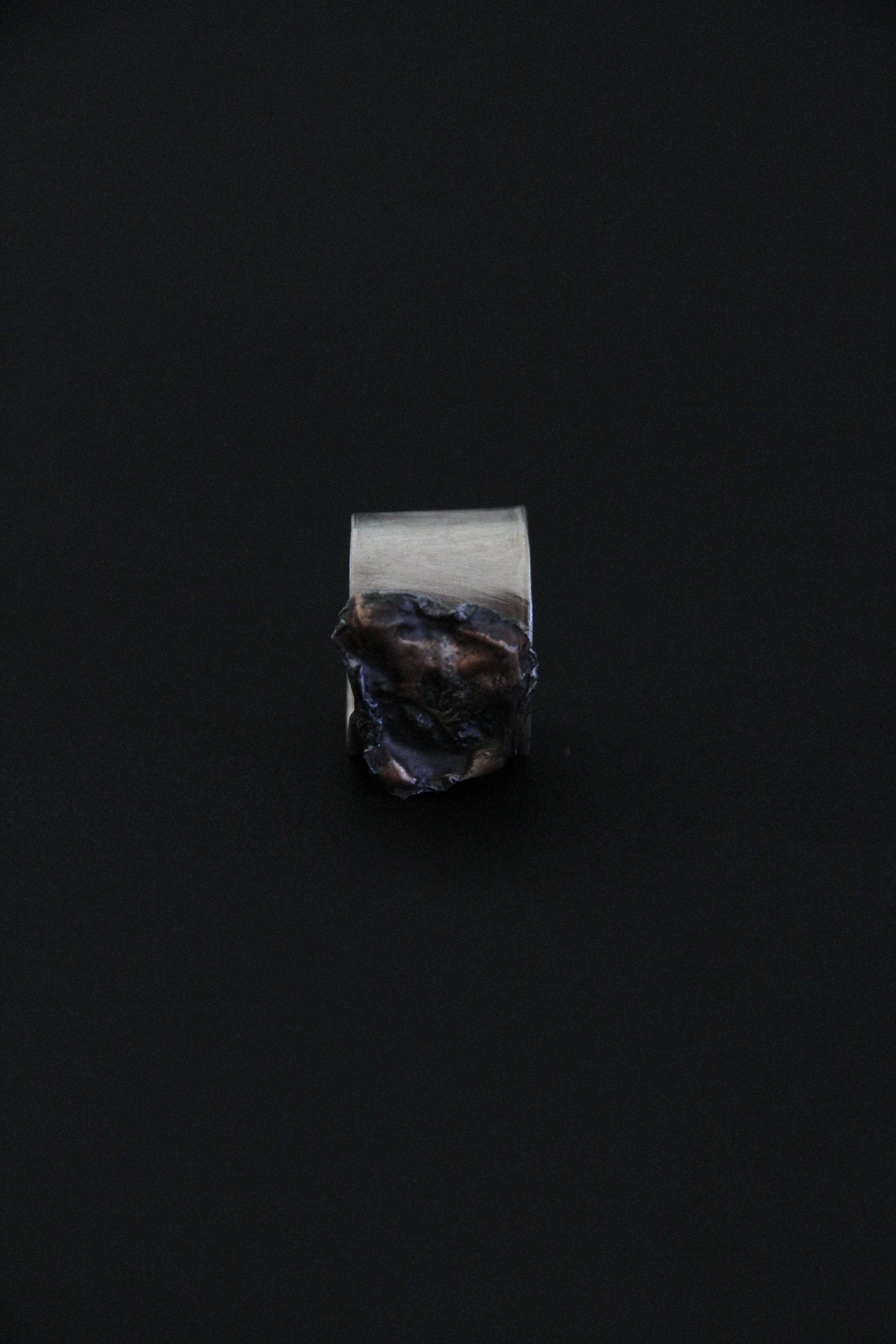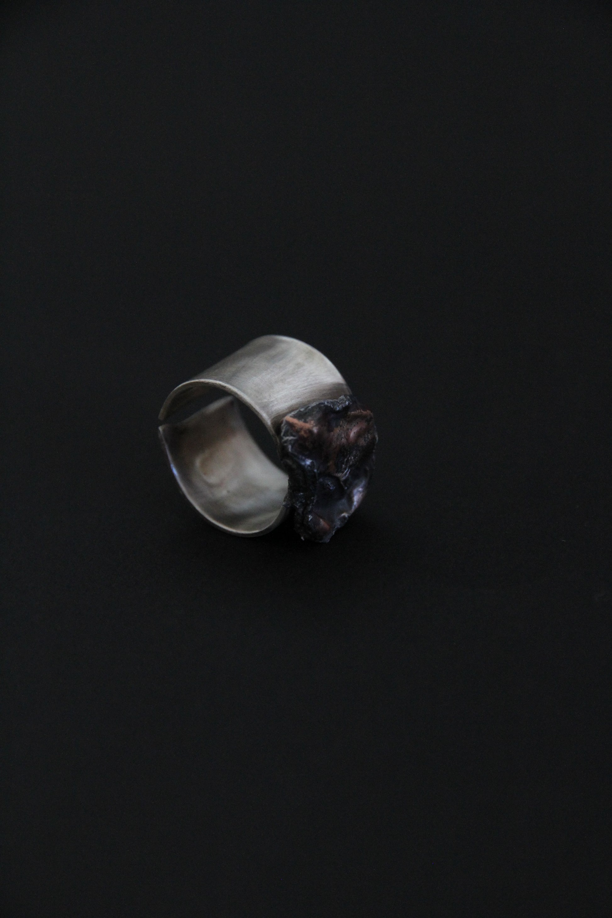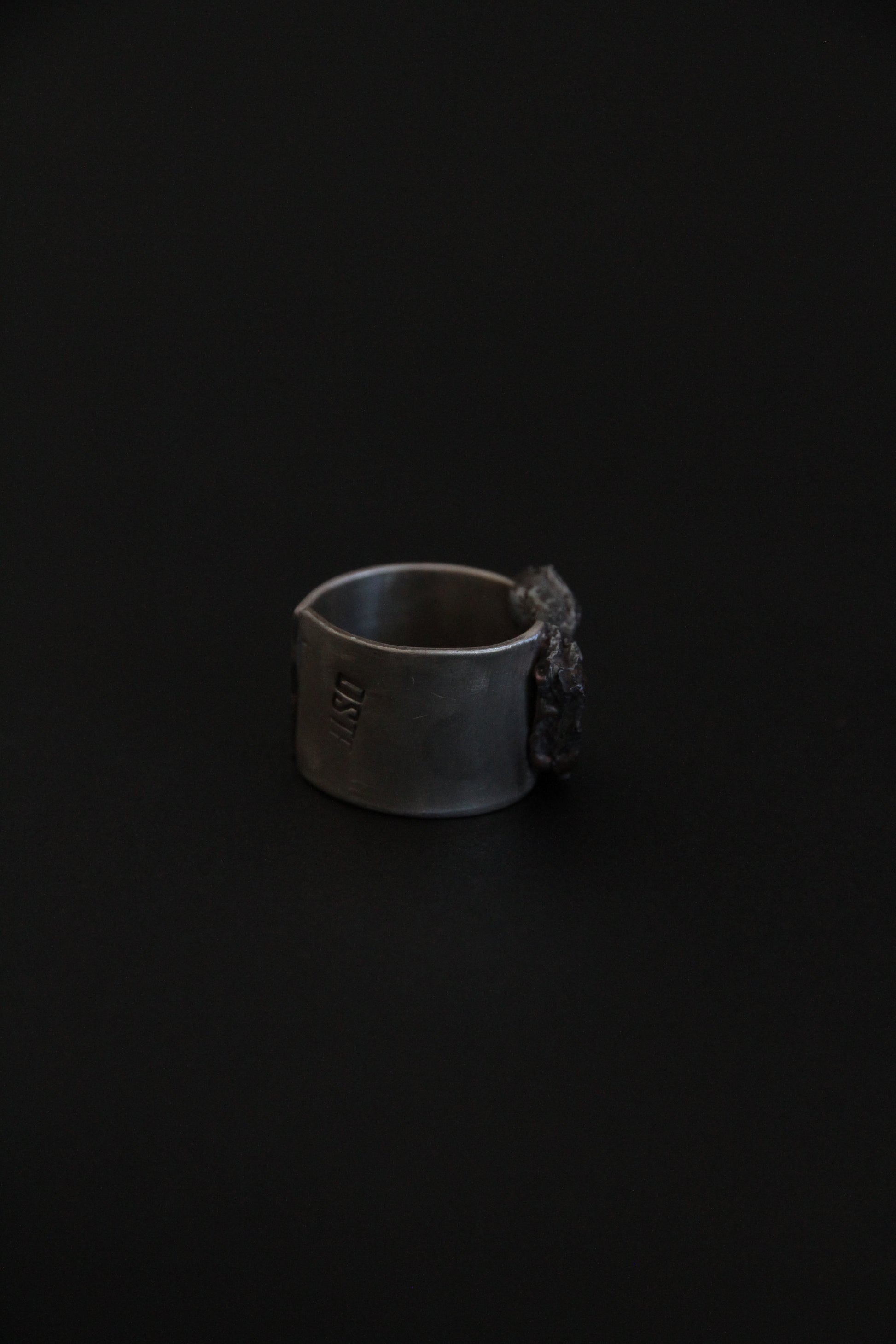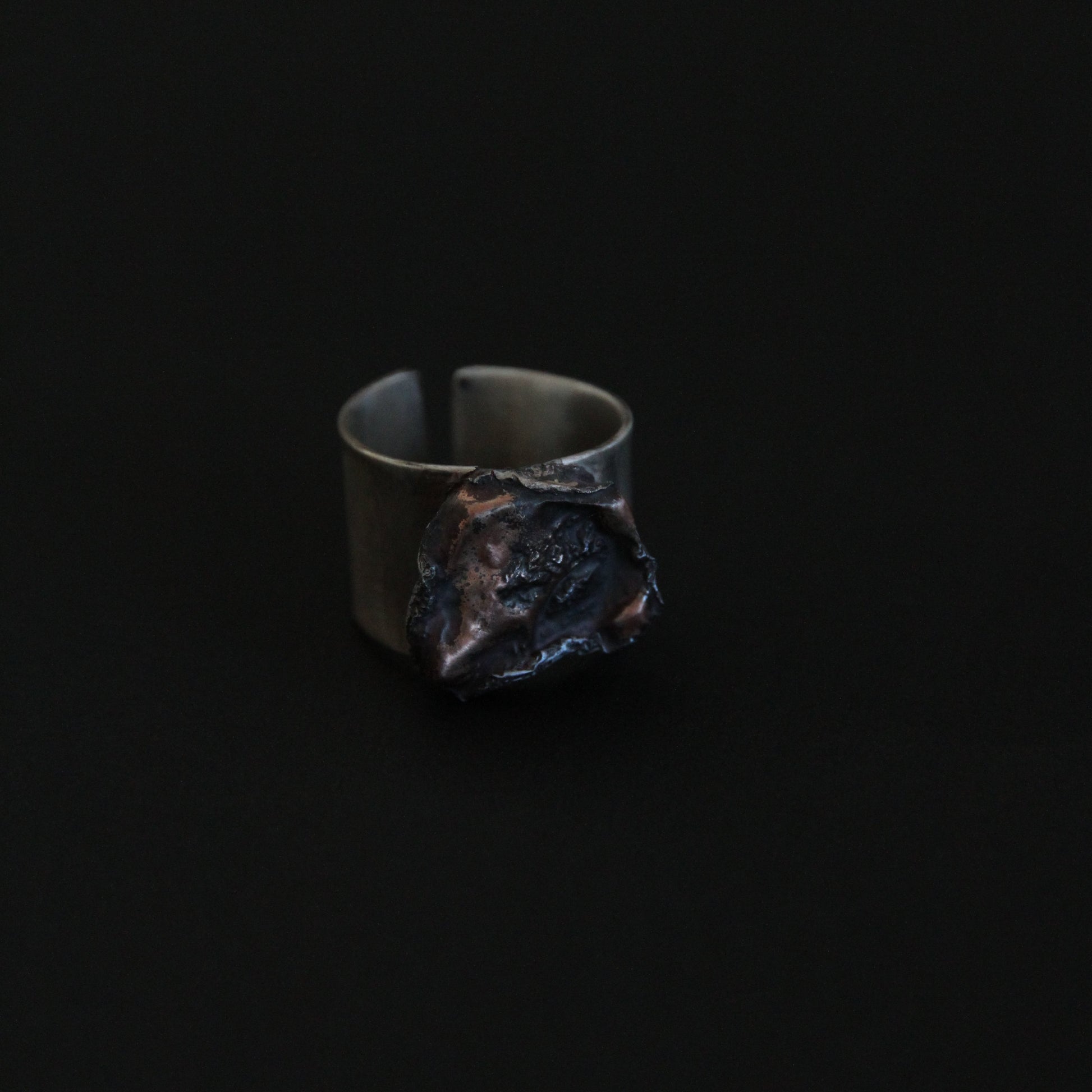 Handcrafted from silver, copper, and brass, the ring combines a smooth, wide band with an organically formed metal fragment, preserved in its imperfect state.