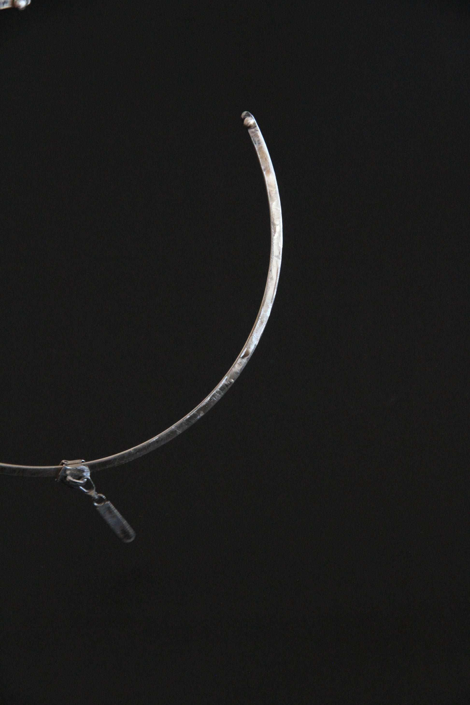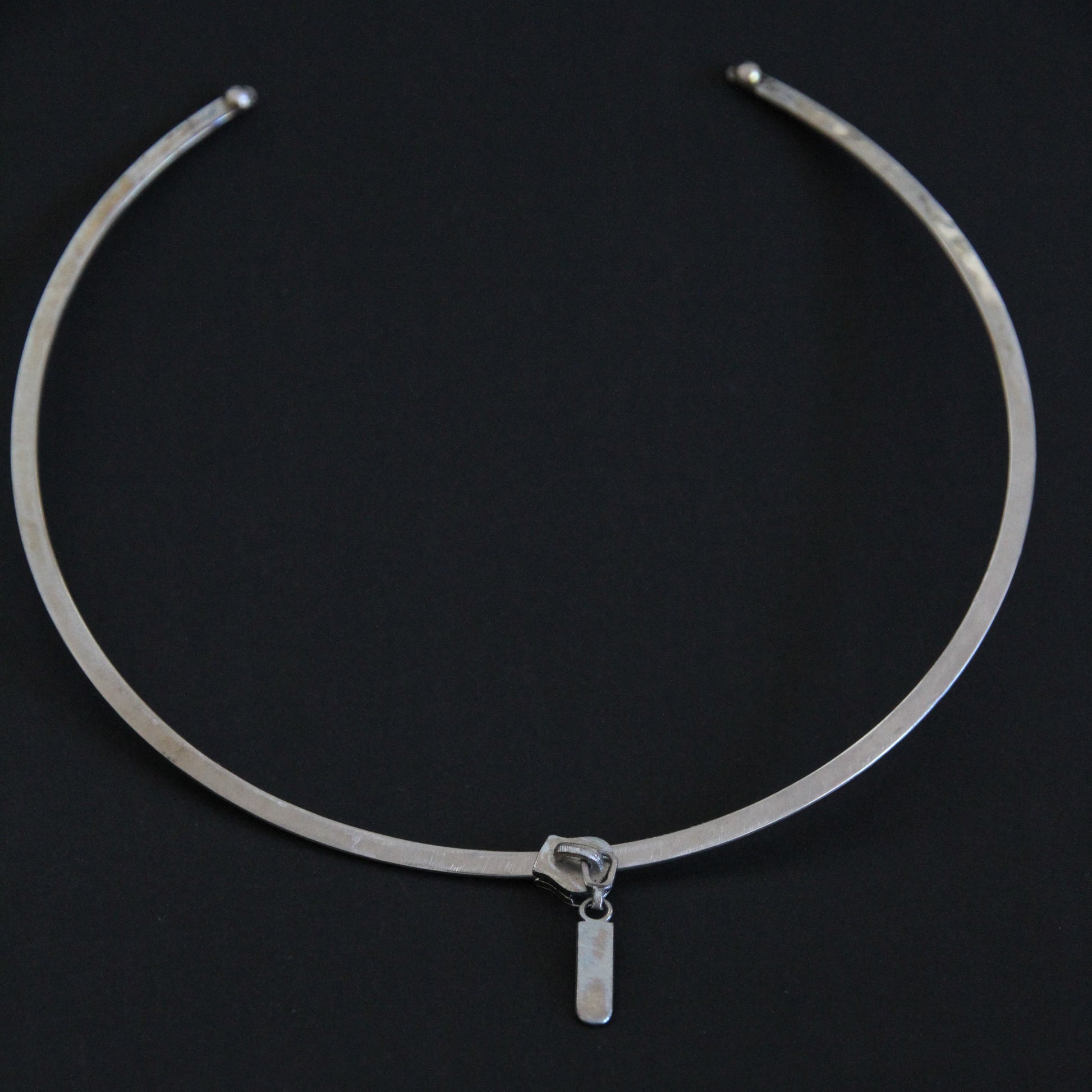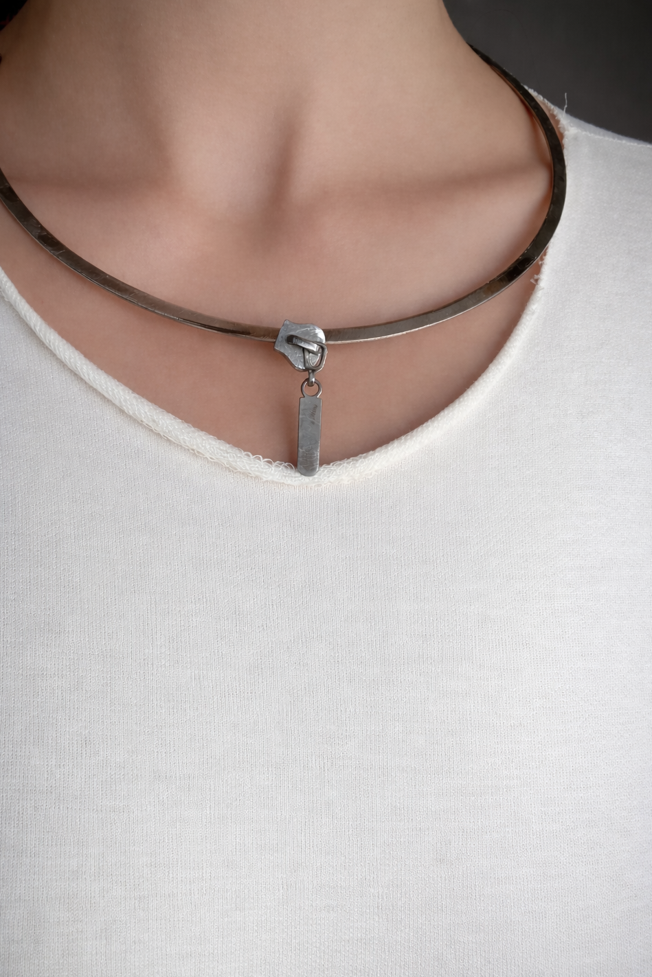 Handcrafted from steel, the piece sits close to the neck, maintaining a clear, architectural line.