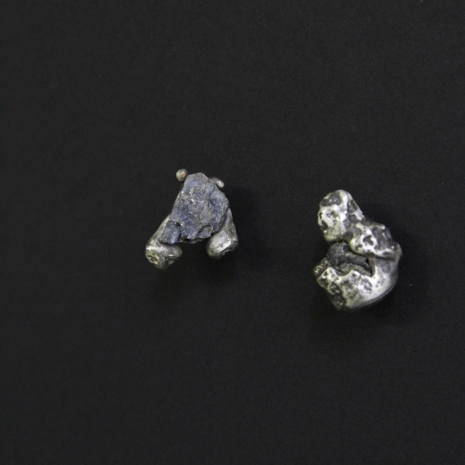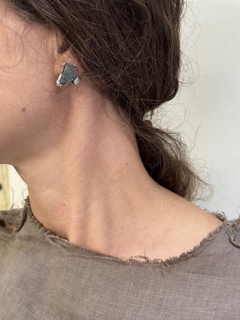 Органічна лита форма поєднується з необробленим мінералом, створюючи ефект маленьких скульптур на вухах. Кожна сережка має унікальний рельєф і характер завдяки природній текстурі каменю та брутальній срібній оправі.